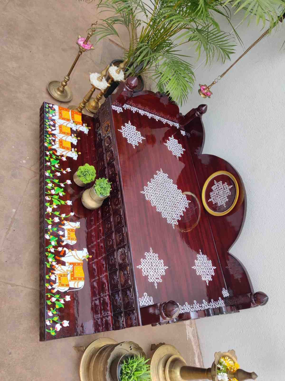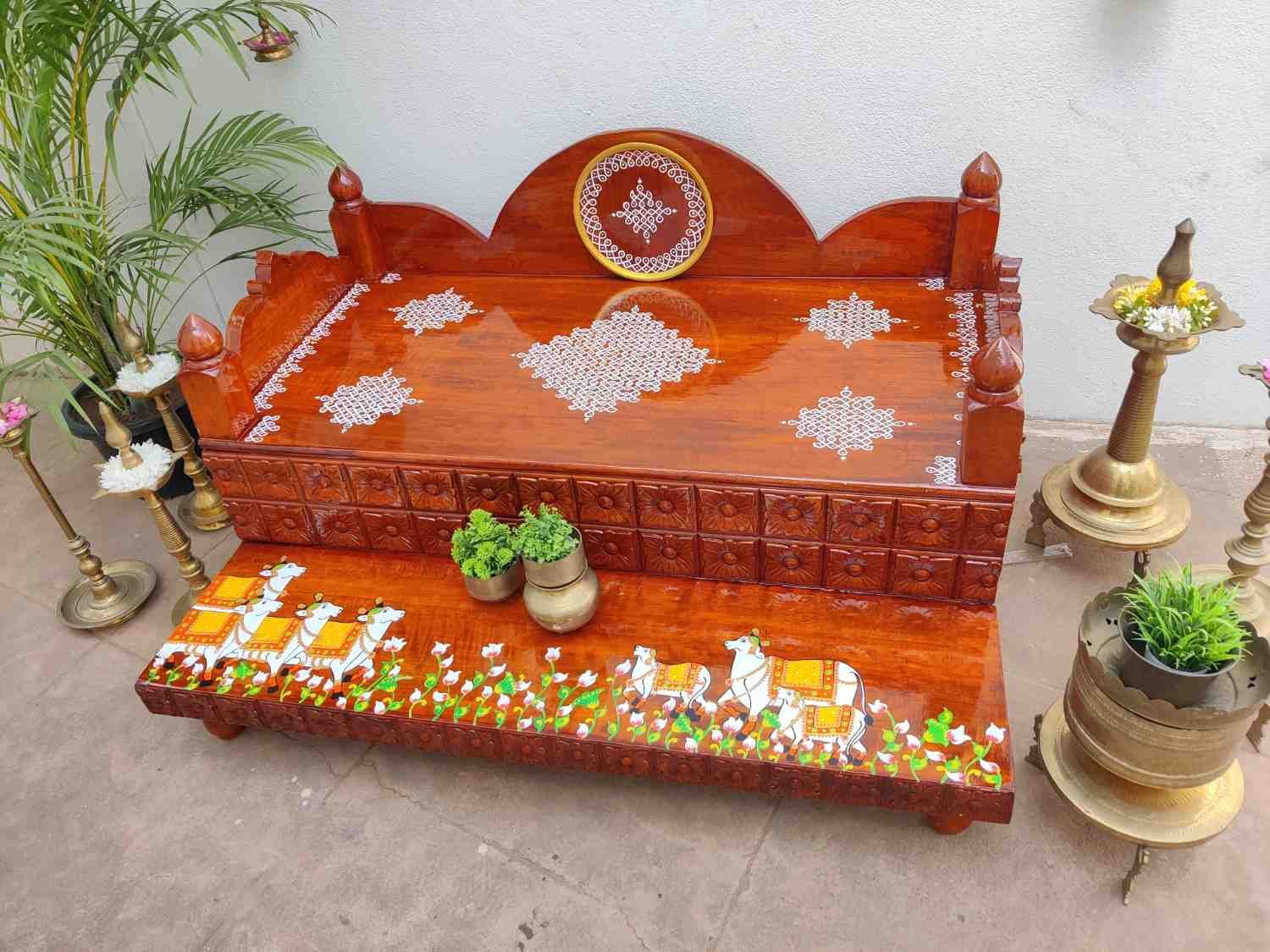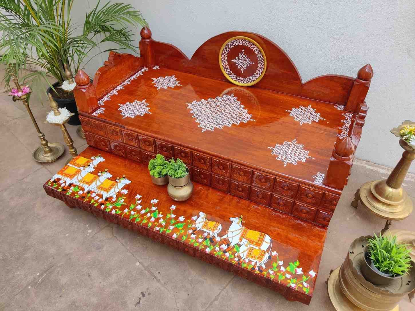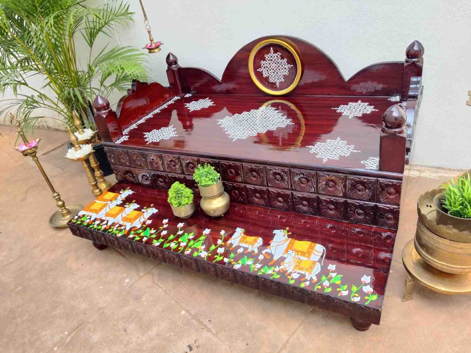 This an antique wooden step stool, which gives aesthetic look to the space. It can perfect piece for you Pooja space. It can also be a perfect piece to create niche corner. It can also be used as for God Display during Varamahalakshi Pooja , Ganesh Chathurthi or any other Pooja space at home, It can be finished in desired wood finish. Paintings can be customized.