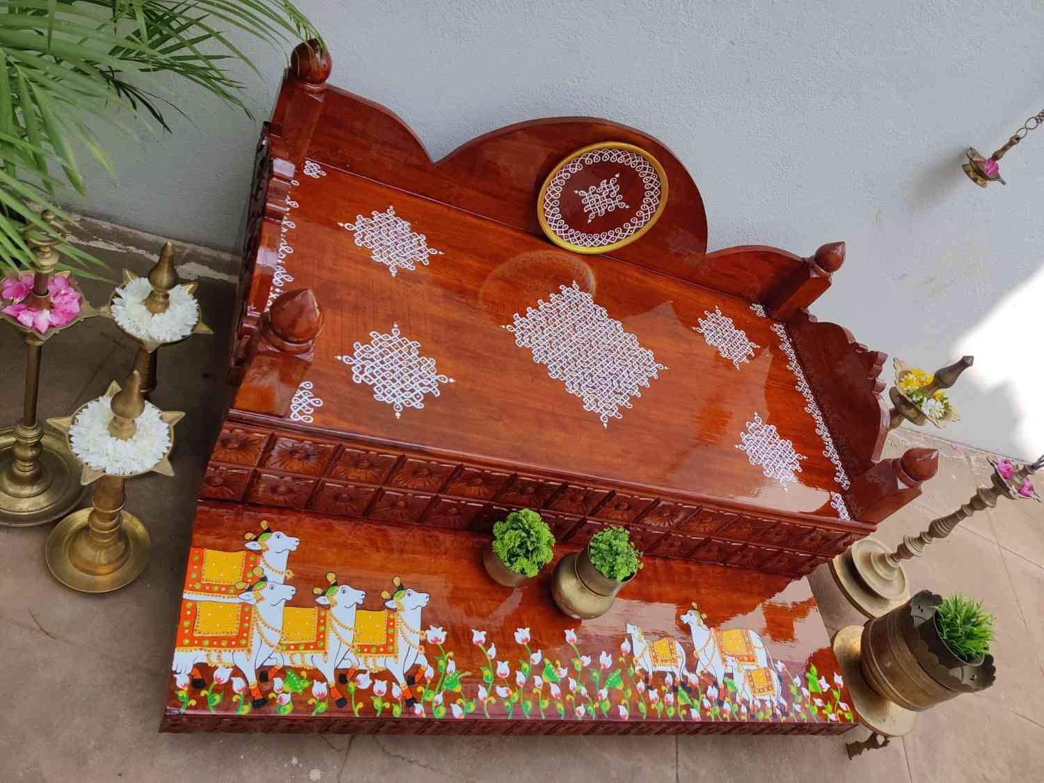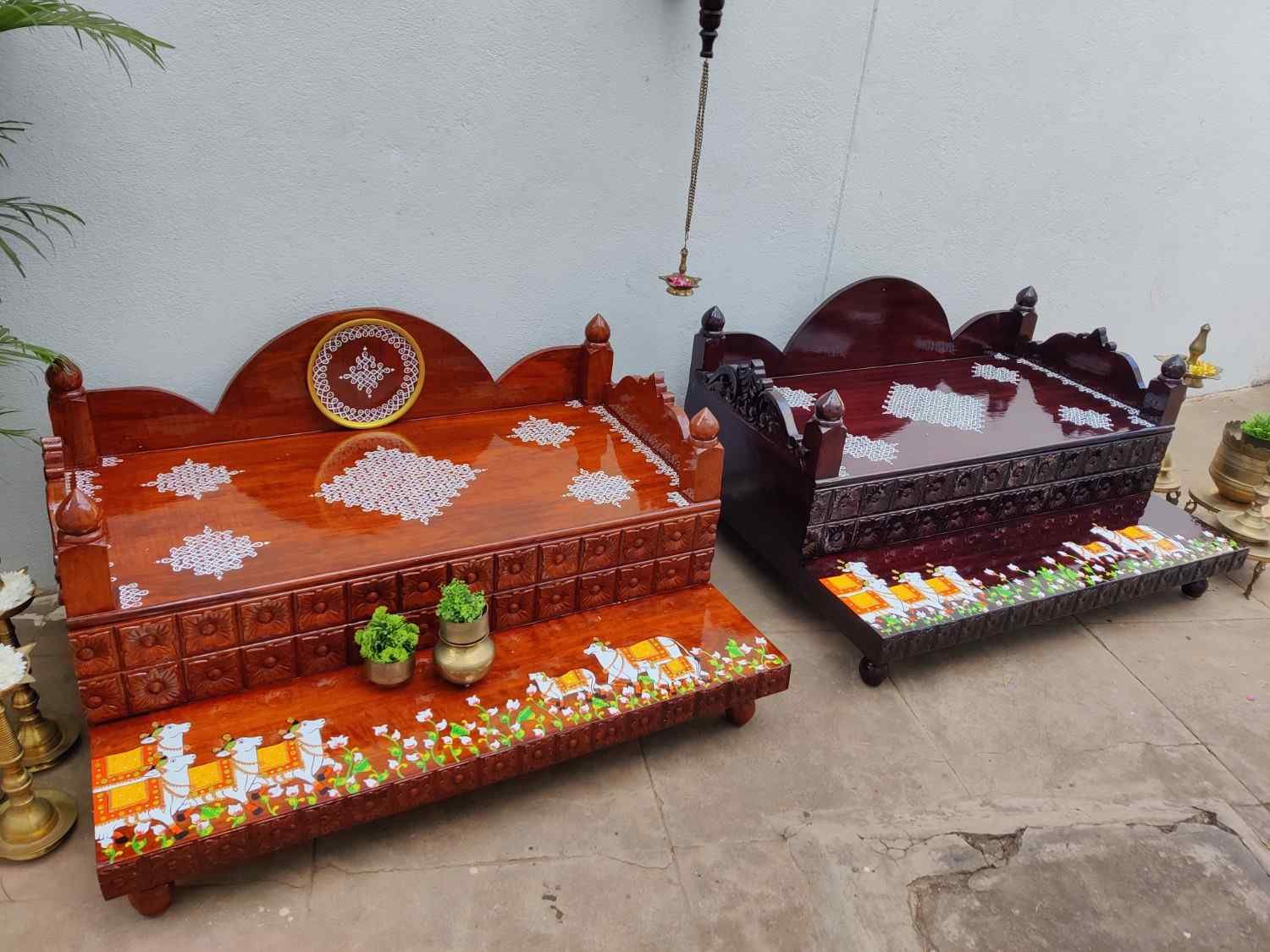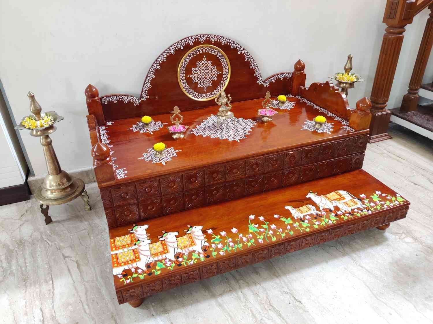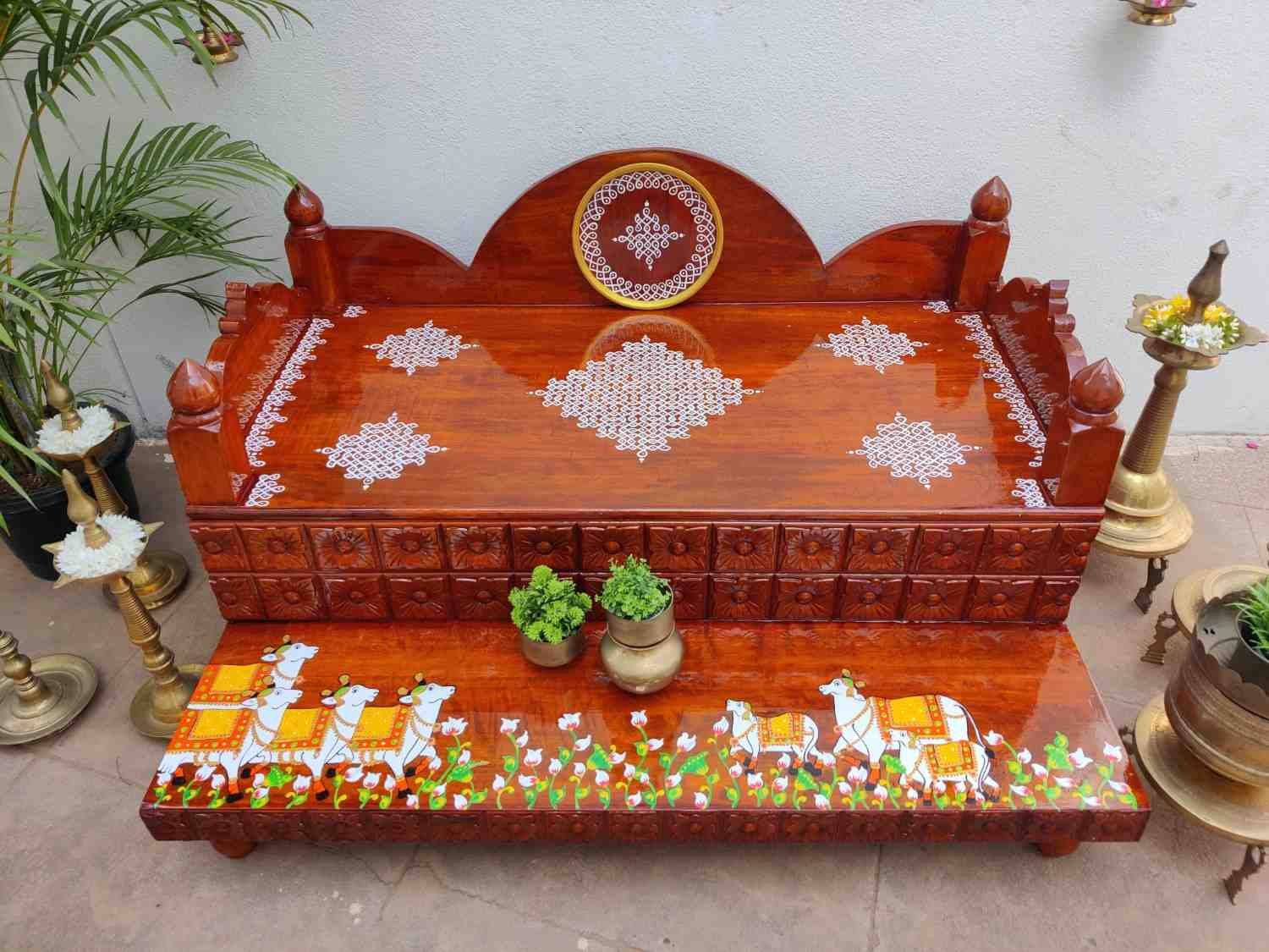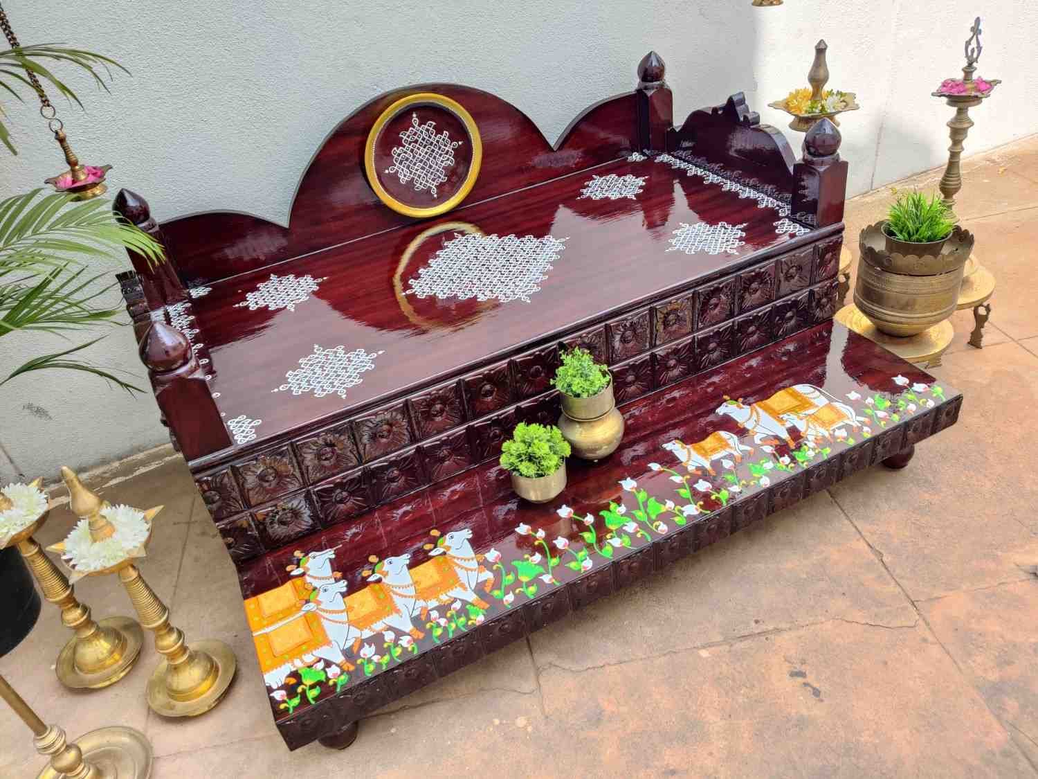 This an antique wooden step stool, which gives aesthetic look to the space. It can perfect piece for you Pooja space. It can also be a perfect piece to create niche corner. It can also be used as for God Display during Varamahalakshi Pooja , Ganesh Chathurthi or any other Pooja space at home, It can be finished in desired wood finish. Paintings can be customized.