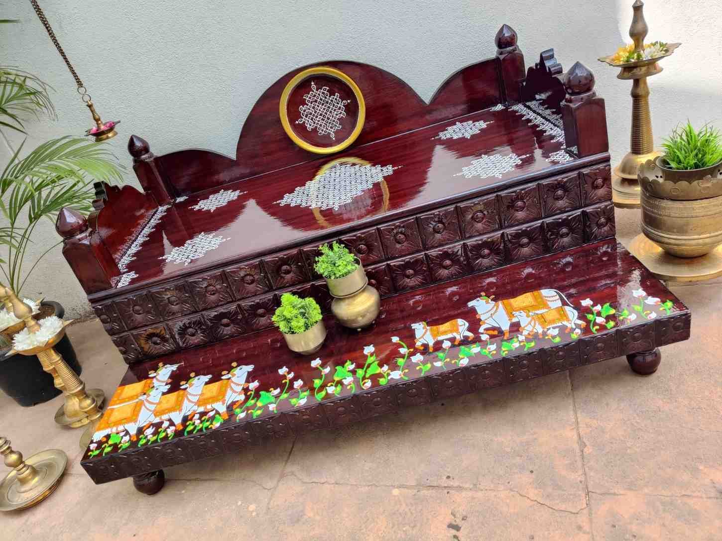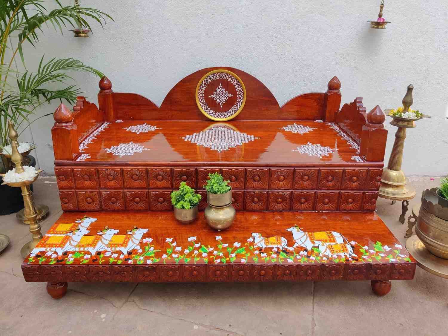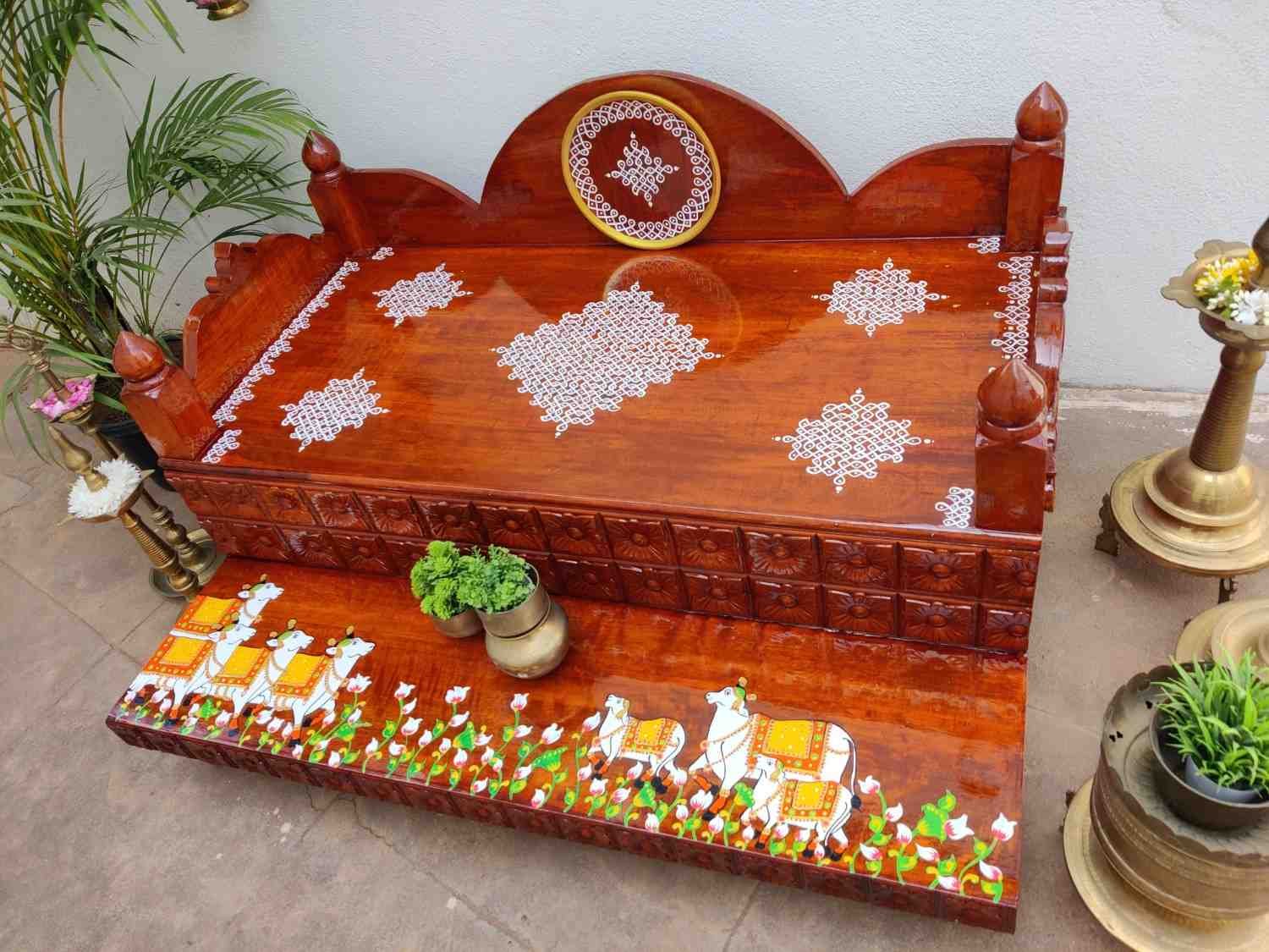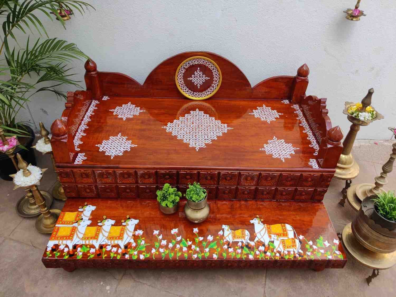 This an antique wooden step stool, which gives aesthetic look to the space. It can perfect piece for you Pooja space. It can also be a perfect piece to create niche corner. It can also be used as for God Display during Varamahalakshi Pooja , Ganesh Chathurthi or any other Pooja space at home, It can be finished in desired wood finish. Paintings can be customized.