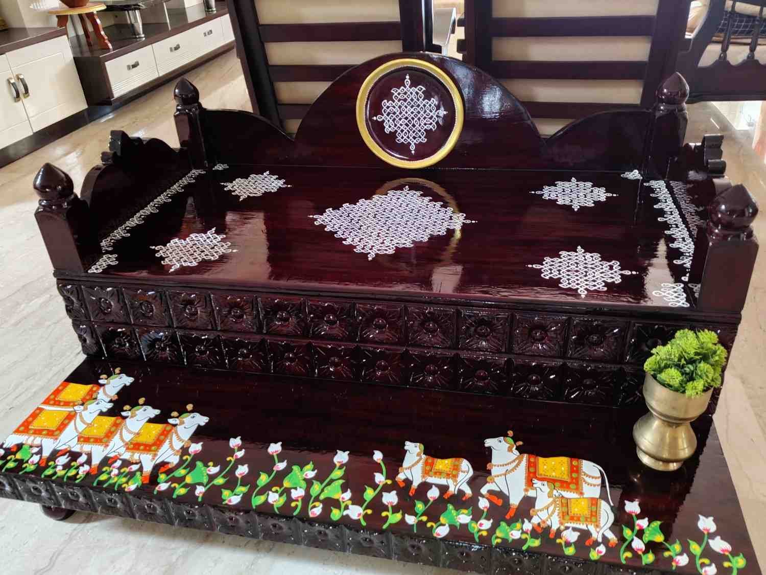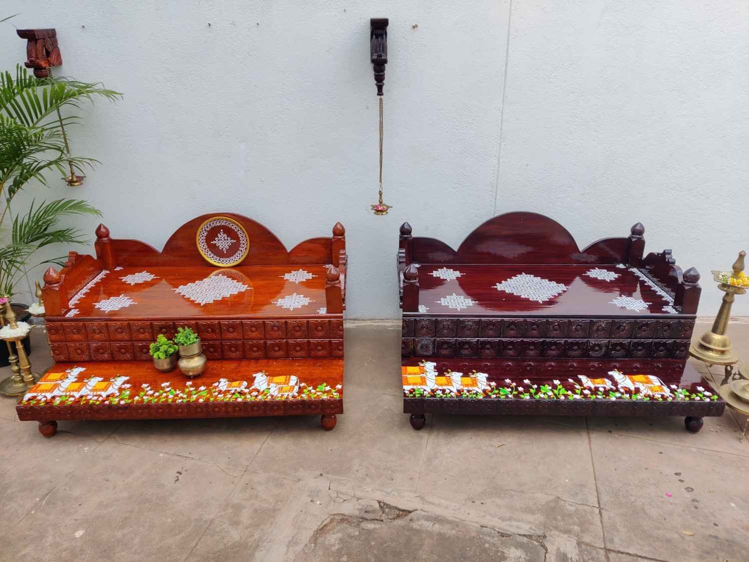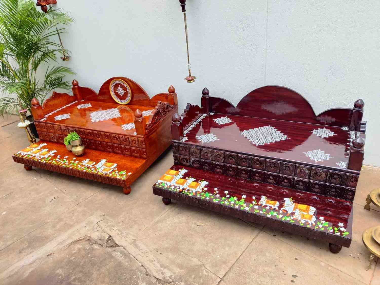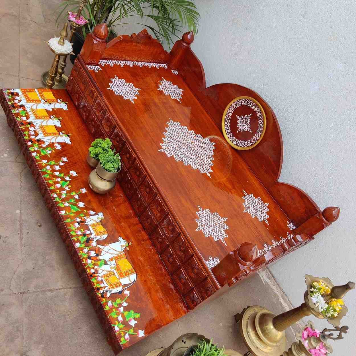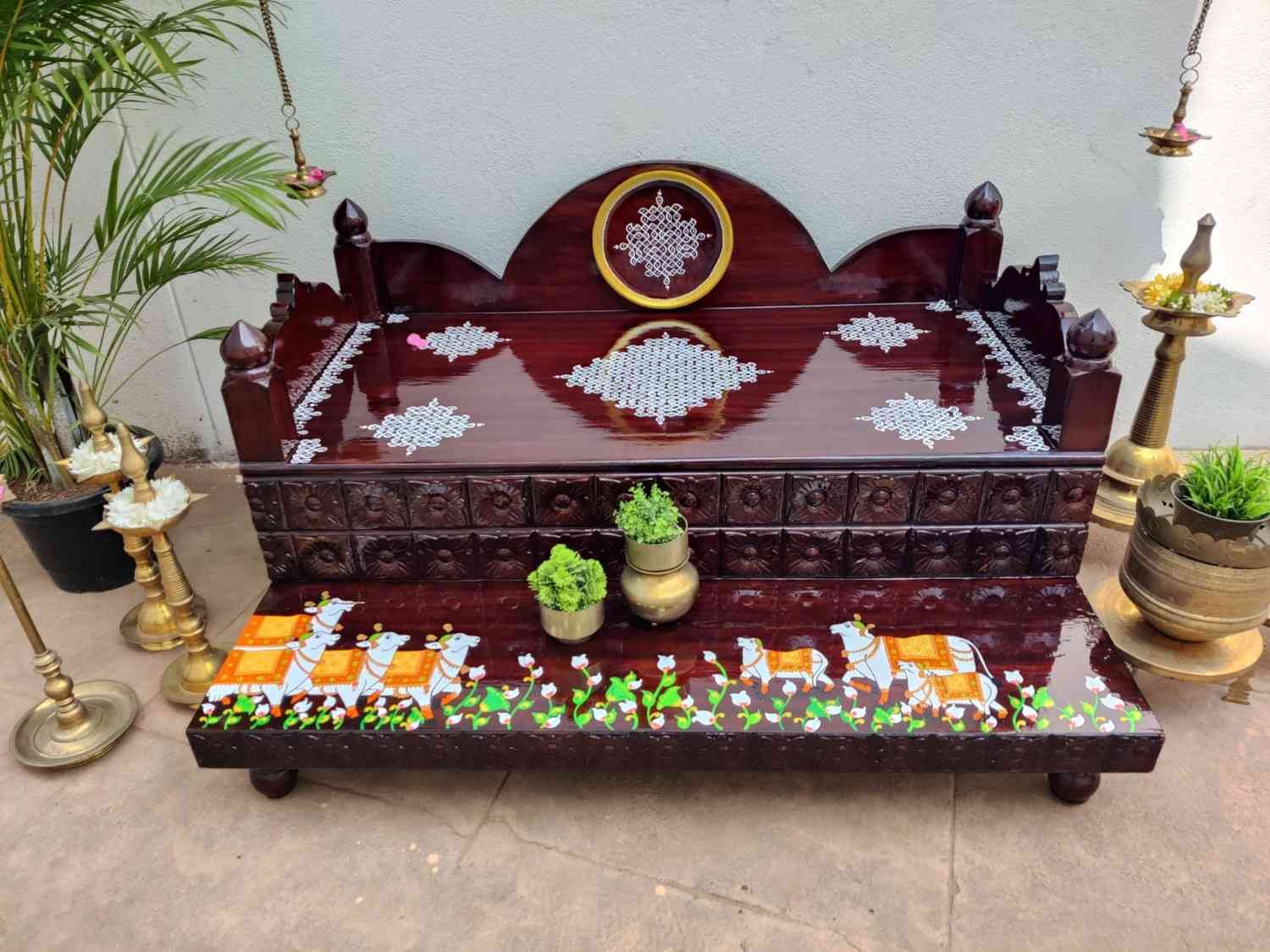 This an antique wooden step stool, which gives aesthetic look to the space. It can perfect piece for you Pooja space. It can also be a perfect piece to create niche corner. It can also be used as for God Display during Varamahalakshi Pooja , Ganesh Chathurthi or any other Pooja space at home, It can be finished in desired wood finish. Paintings can be customized.