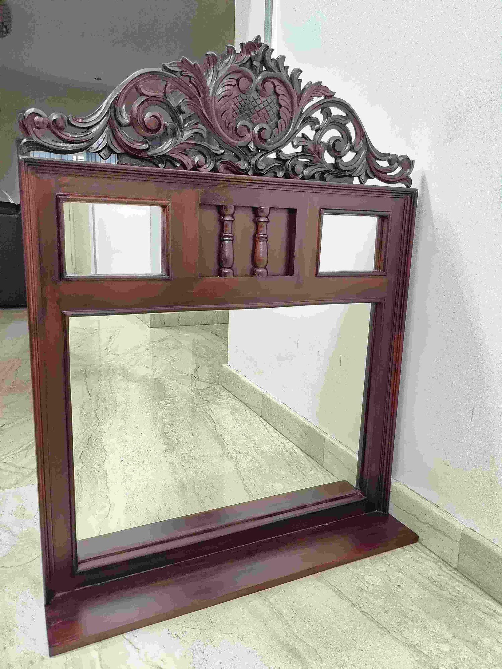 This an antique wall mirror frame, which gives aesthetic look to the space. It has a small wall shelf attached to it , which helps in display of small artifacts. It can be finished in desired wood finish. Paintings can be customized.