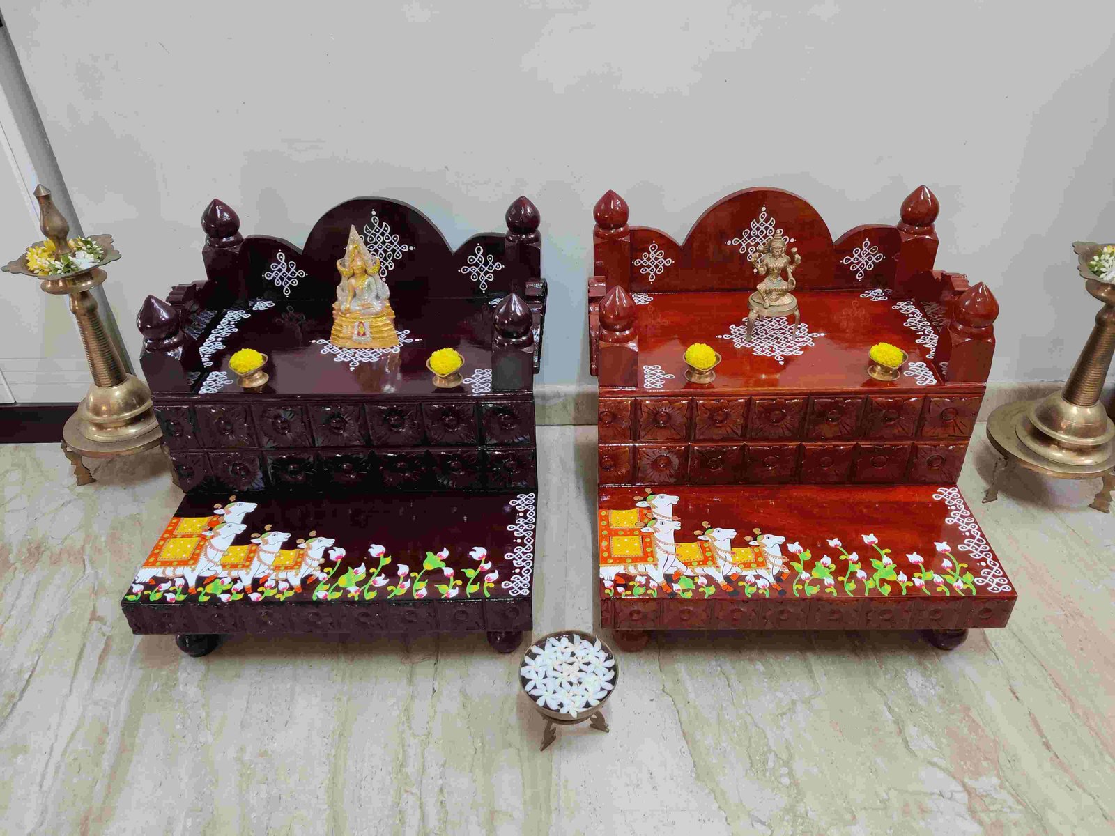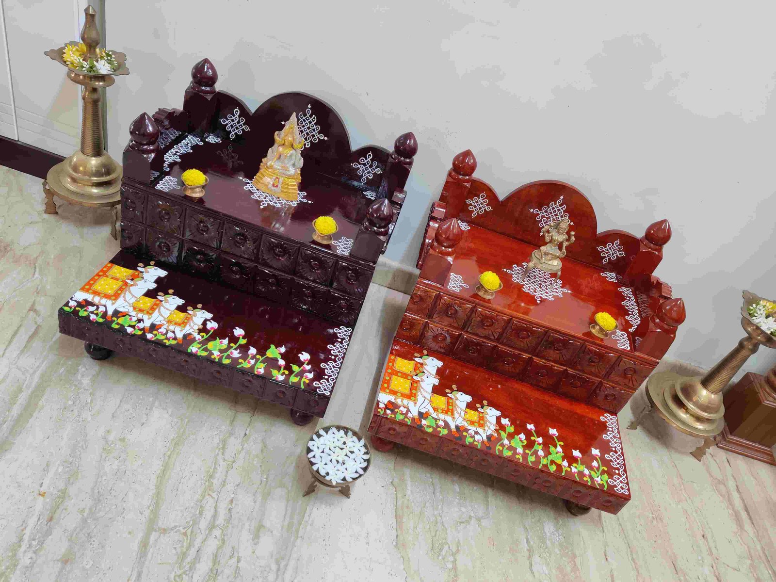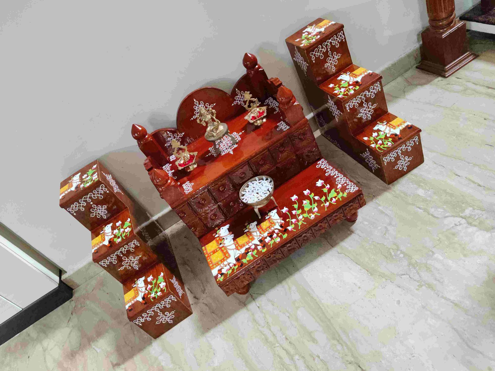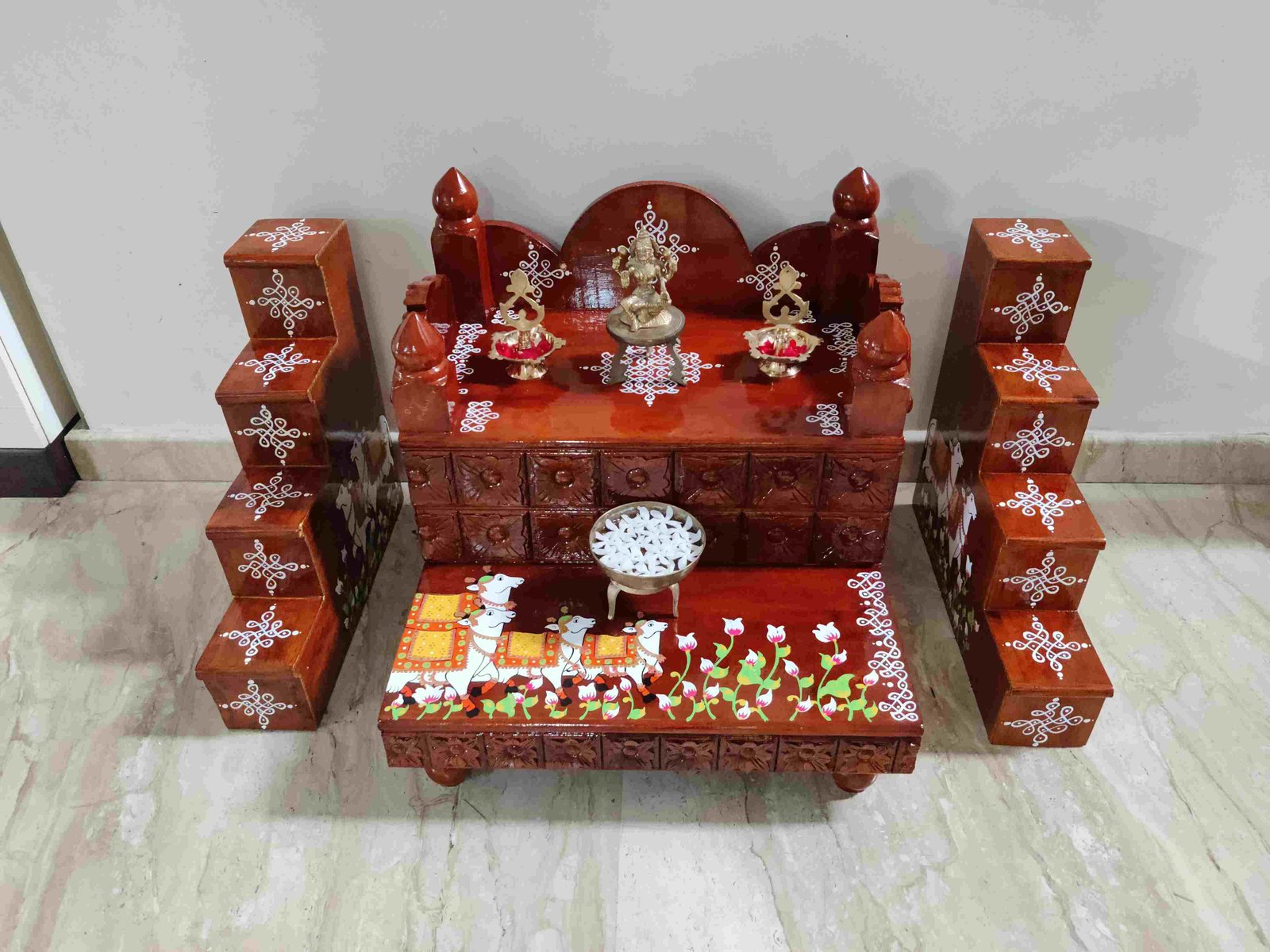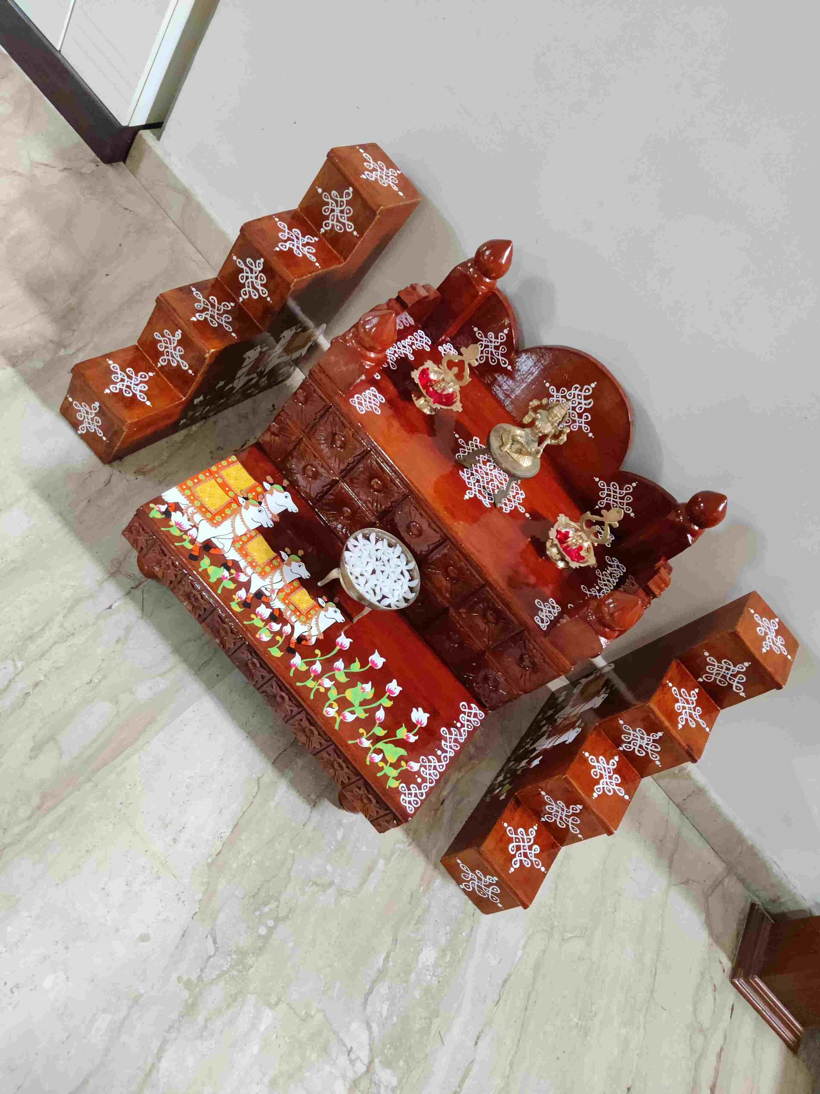 This an antique wooden step stool, which gives aesthetic look to the space. It can perfect piece for your Pooja space. It can also be a perfect piece to create niche corner. It can also be used as for God Display during Varamahalakshi Pooja , Ganesh Chathurthi or any other Pooja space at home, It can be finished in desired wood finish. Paintings can be customized.