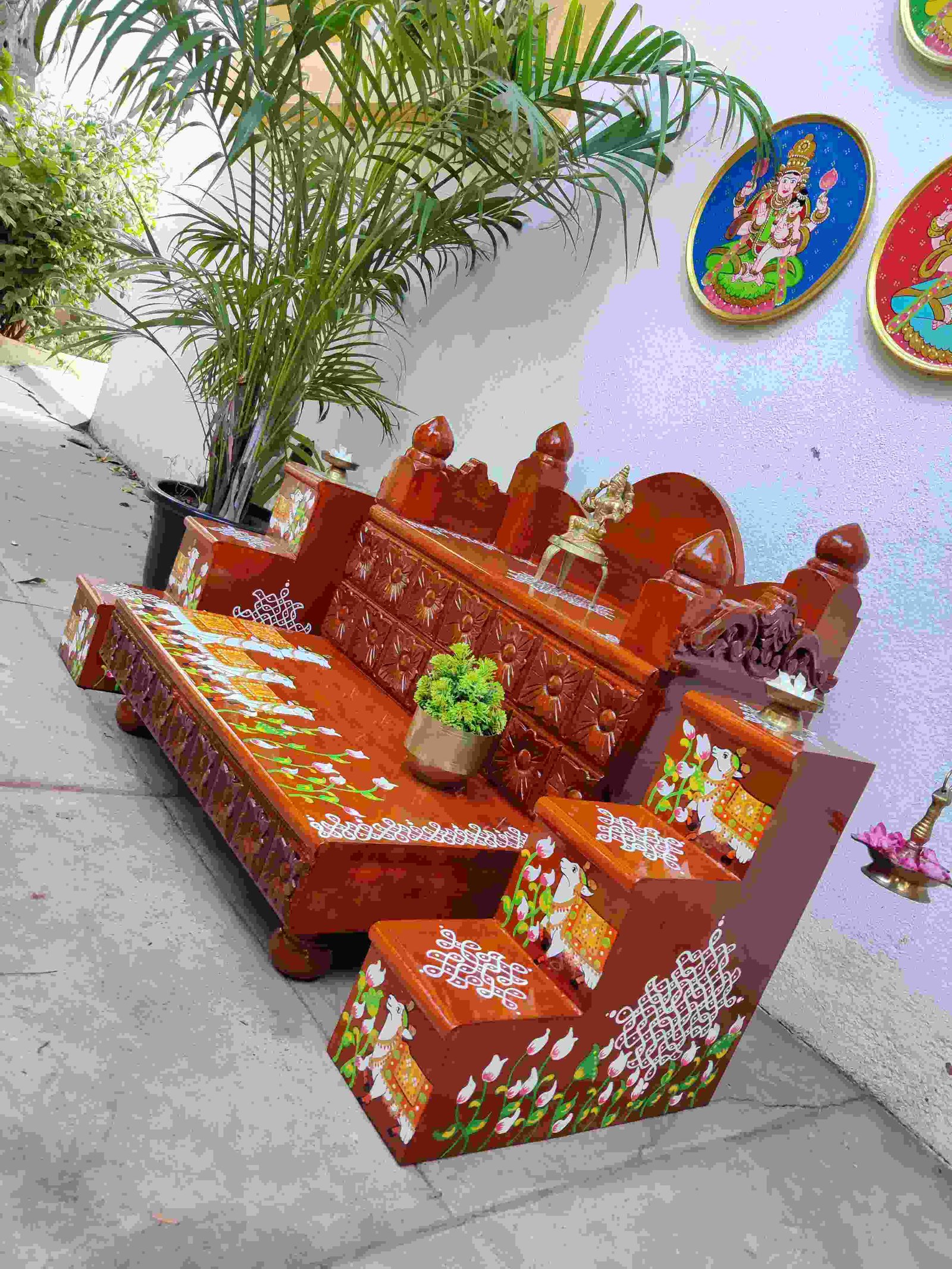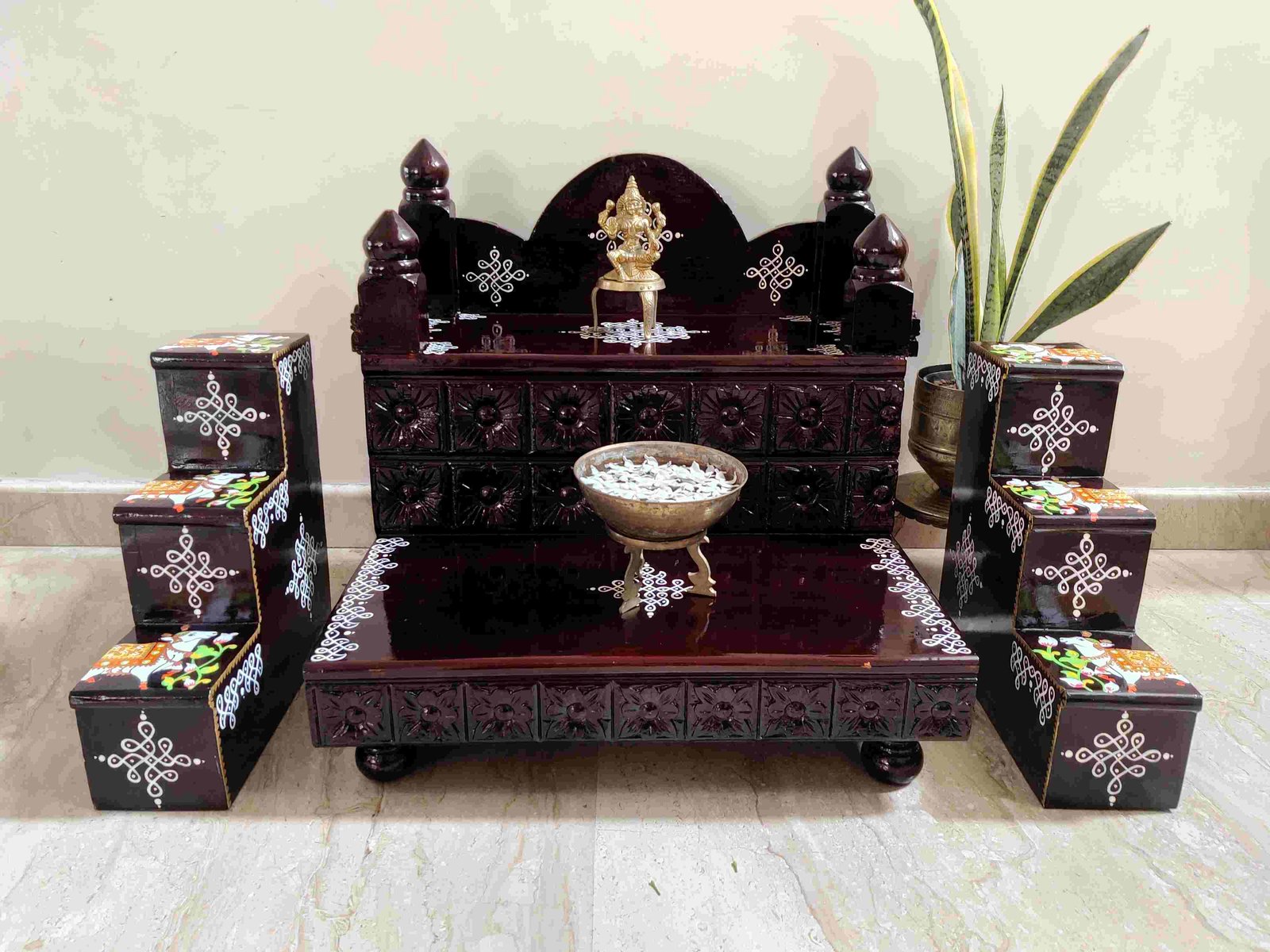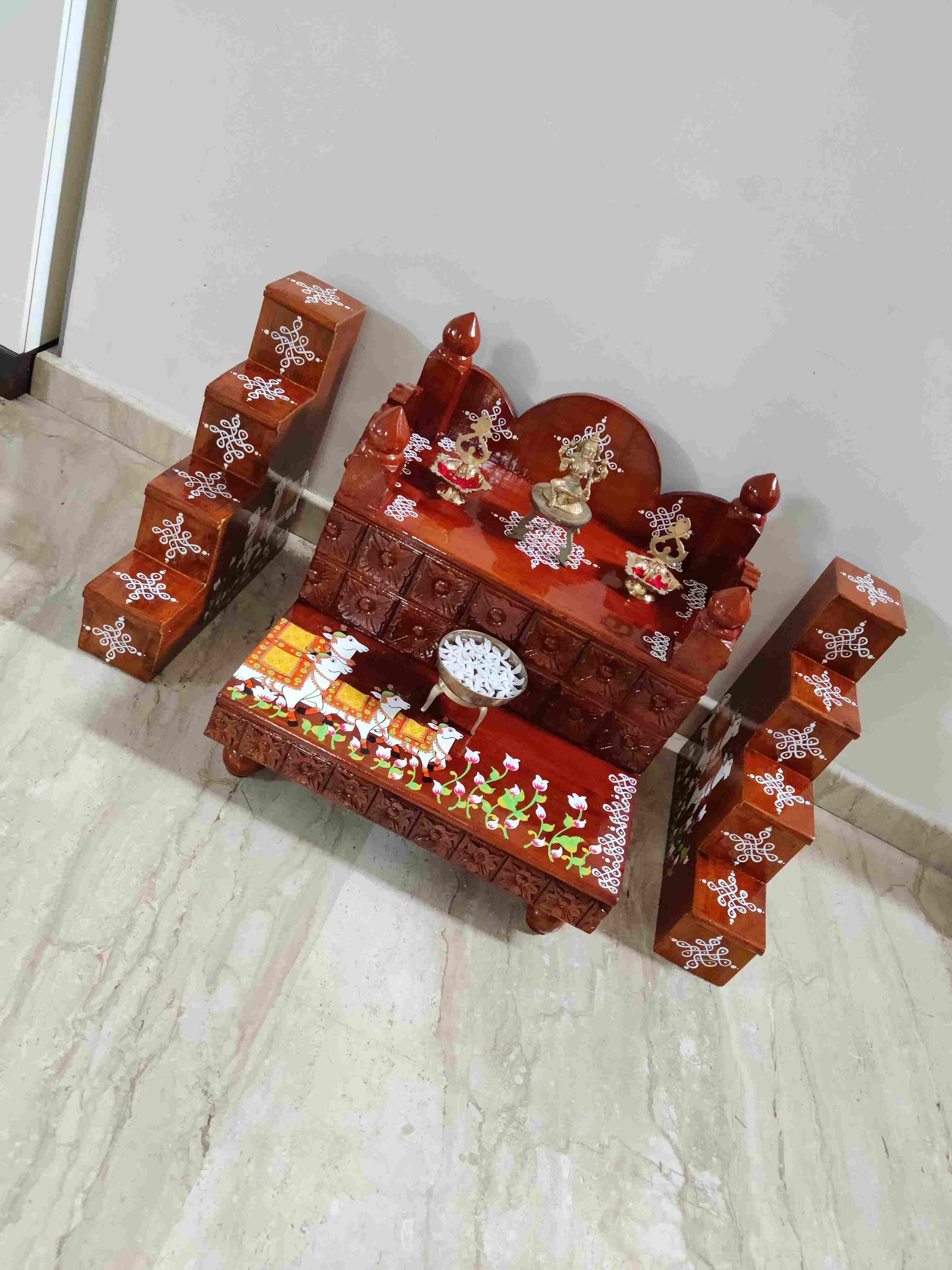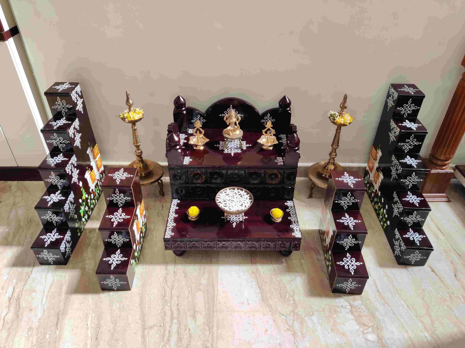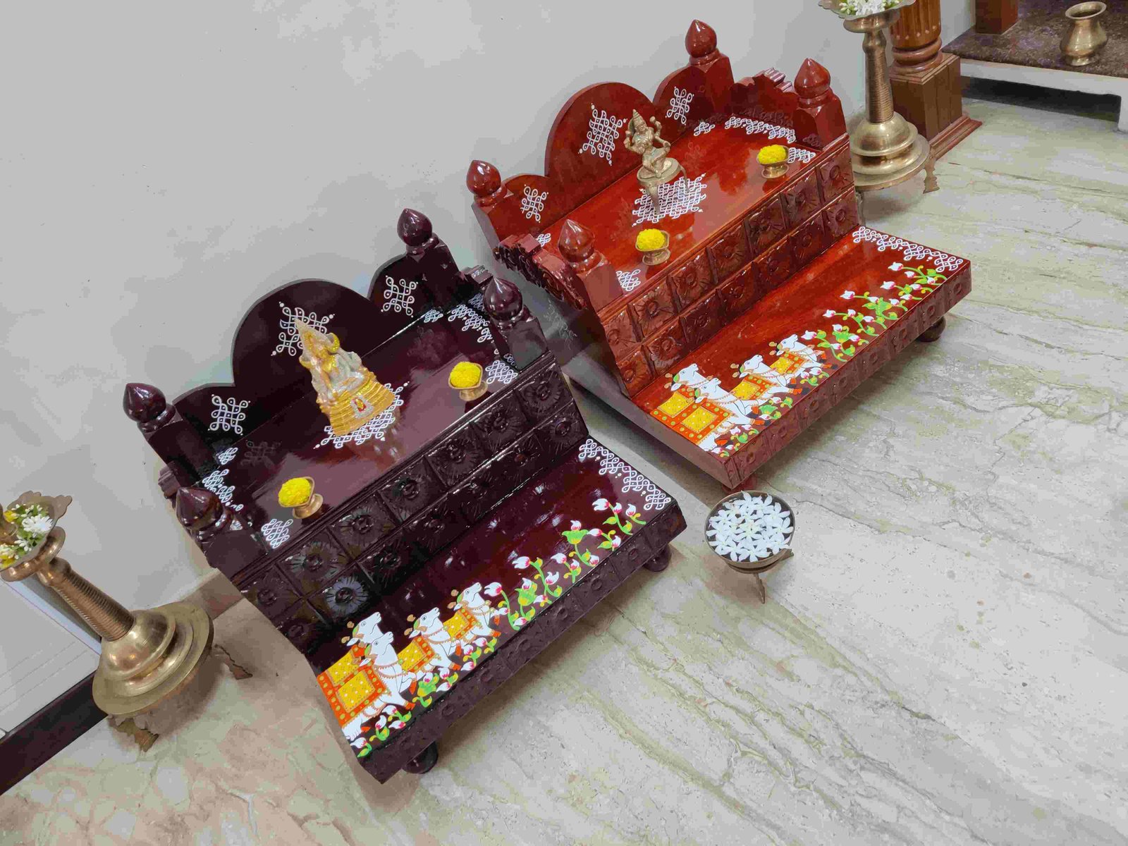 This an antique wooden step stool, which gives aesthetic look to the space. It can perfect piece for your Pooja space. It can also be a perfect piece to create niche corner. It can also be used as for God Display during Varamahalakshi Pooja , Ganesh Chathurthi or any other Pooja space at home, It can be finished in desired wood finish. Paintings can be customized.