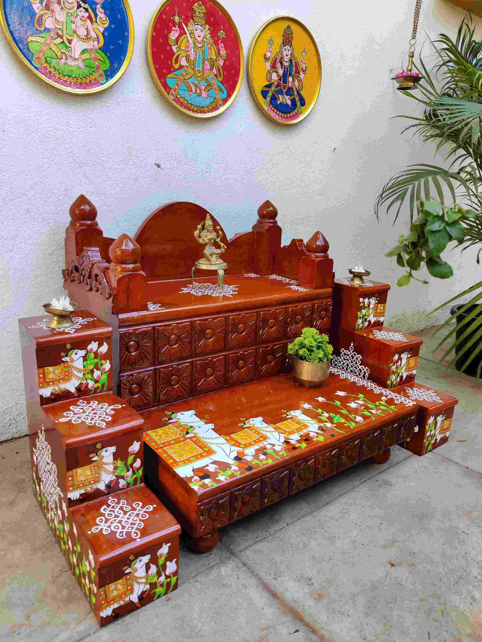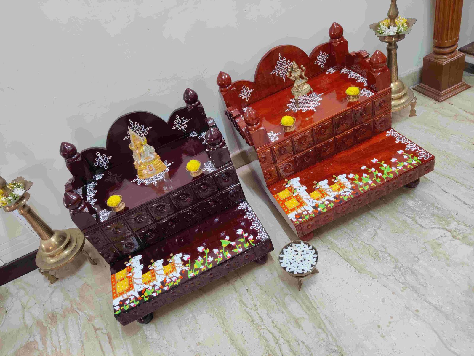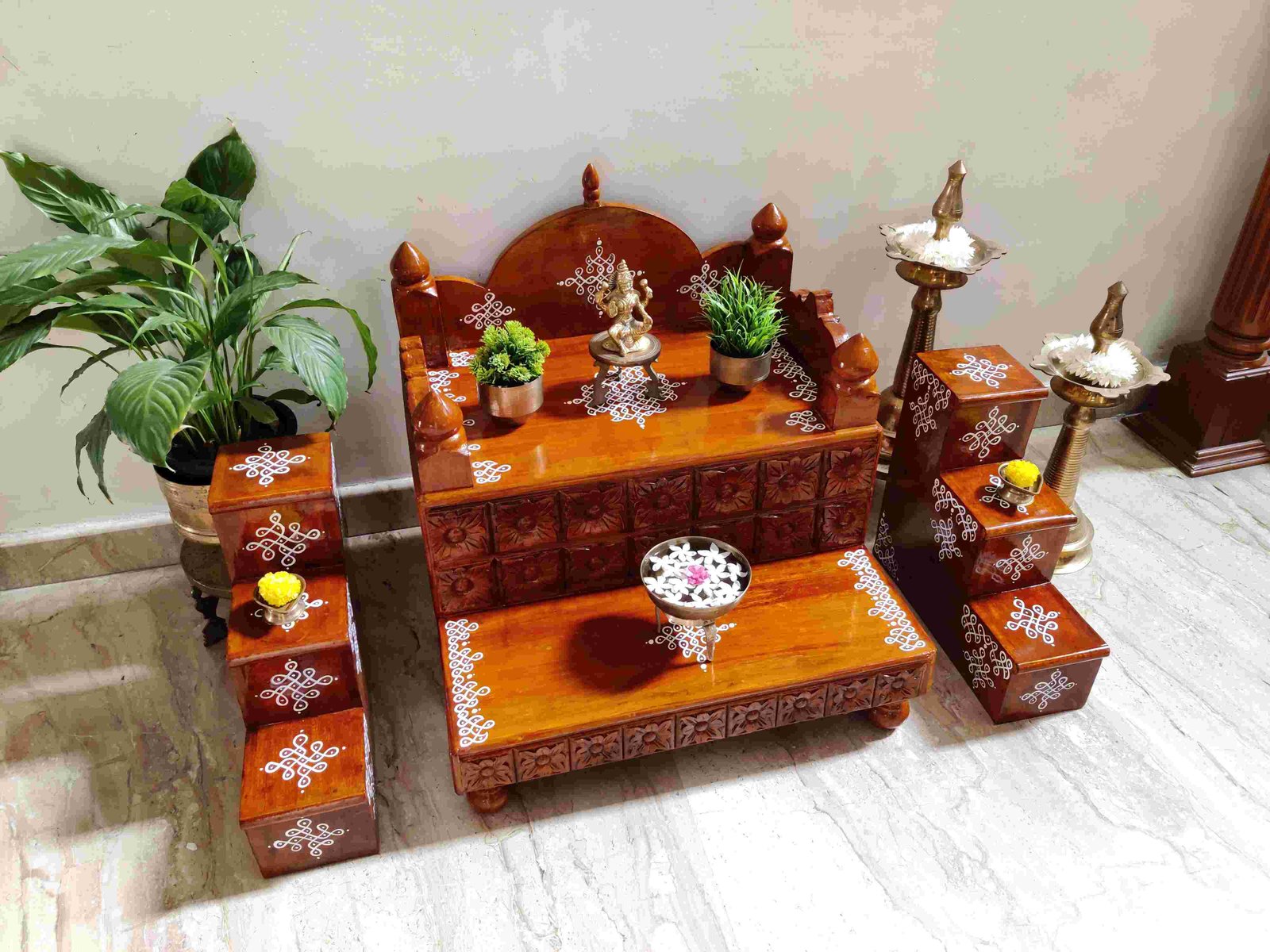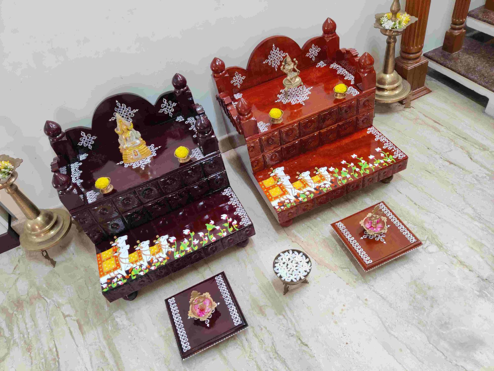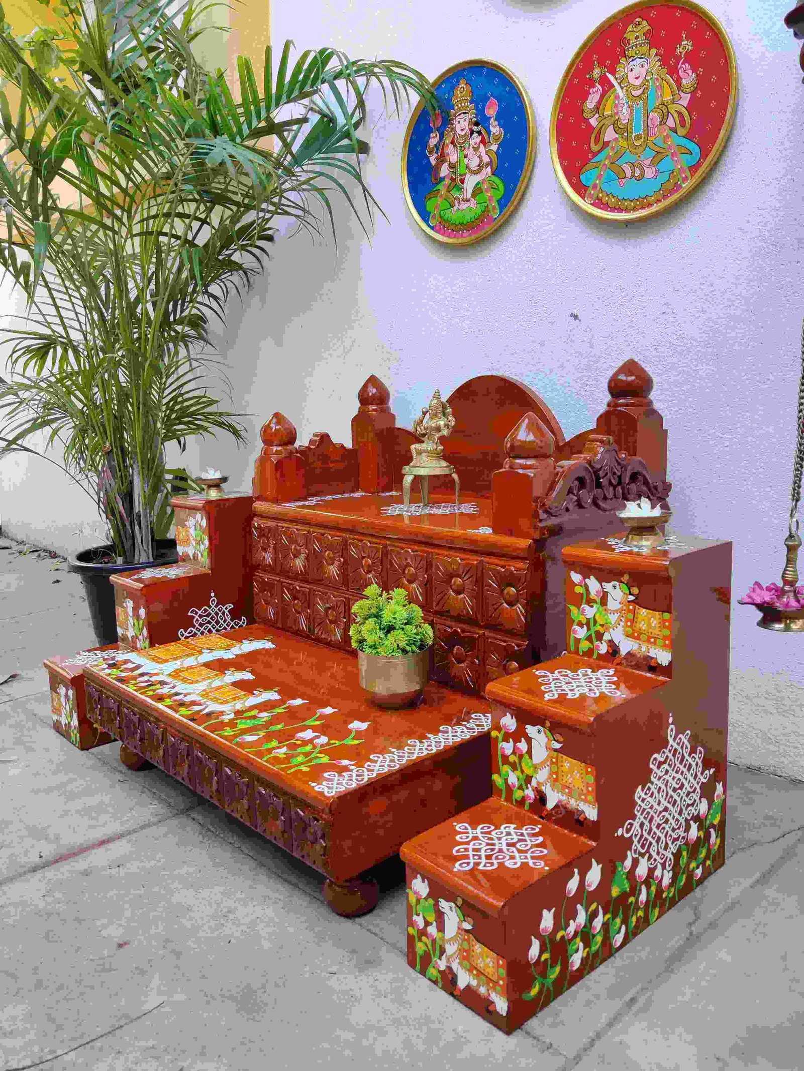 This an antique wooden step stool, which gives aesthetic look to the space. It can perfect piece for your Pooja space. It can also be a perfect piece to create niche corner. It can also be used as for God Display during Varamahalakshi Pooja , Ganesh Chathurthi or any other Pooja space at home, It can be finished in desired wood finish. Paintings can be customized.