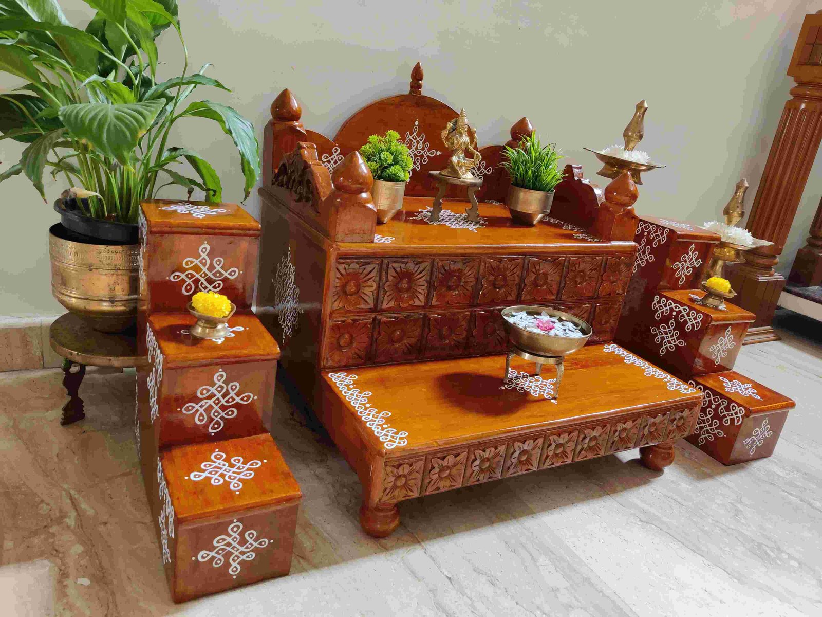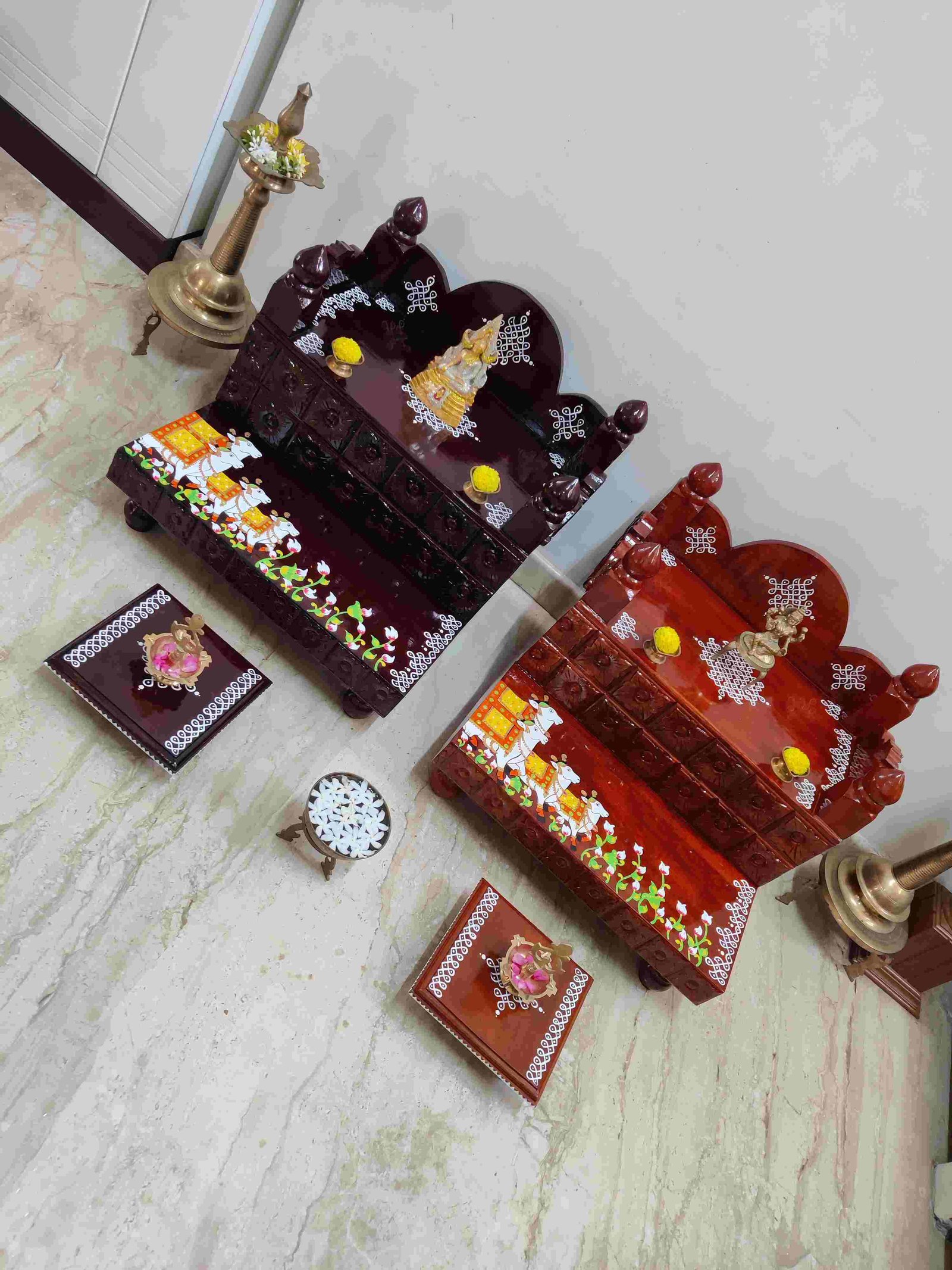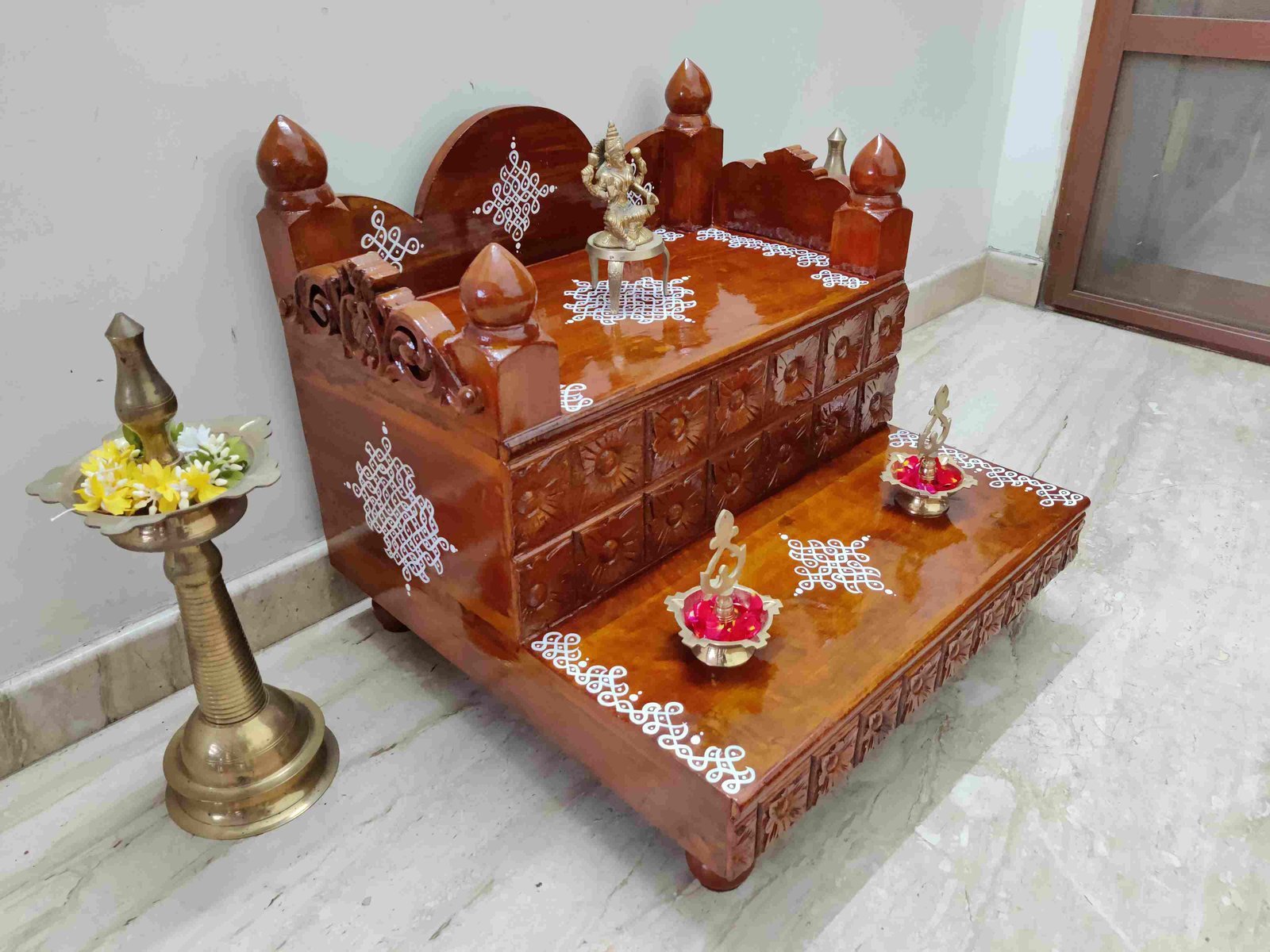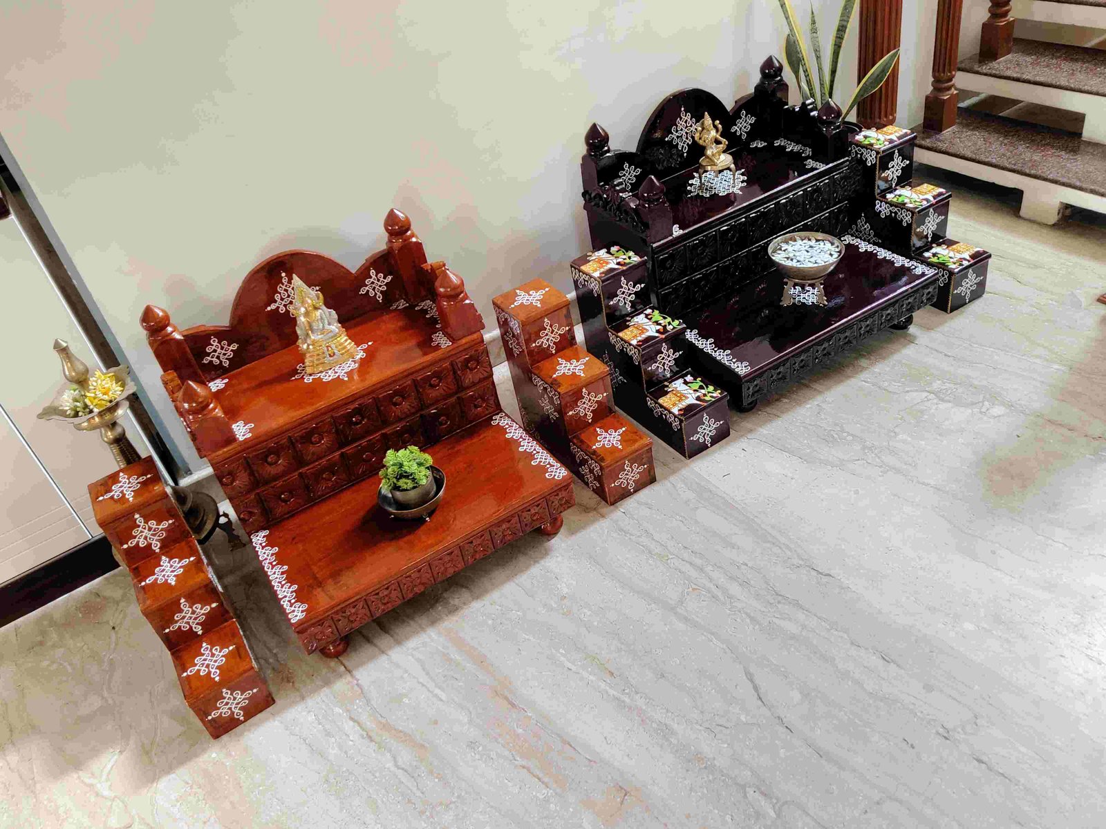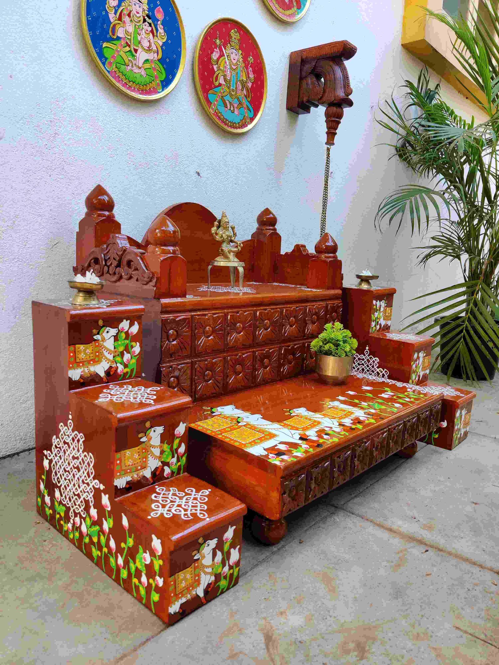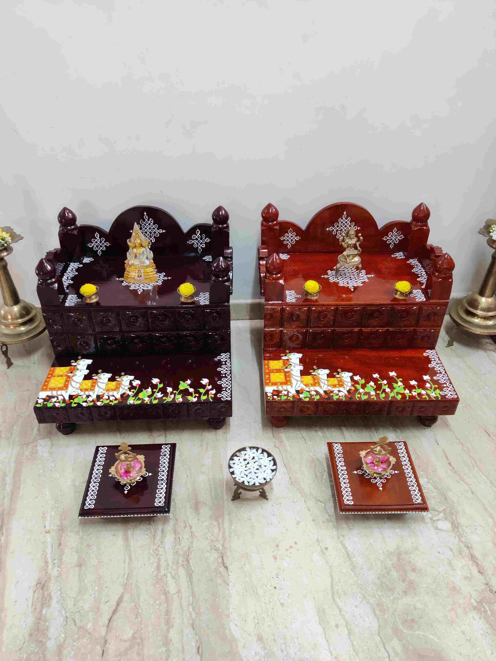 This an antique wooden step stool, which gives aesthetic look to the space. It can perfect piece for your Pooja space. It can also be a perfect piece to create niche corner. It can also be used as for God Display during Varamahalakshi Pooja , Ganesh Chathurthi or any other Pooja space at home, It can be finished in desired wood finish. Paintings can be customized.