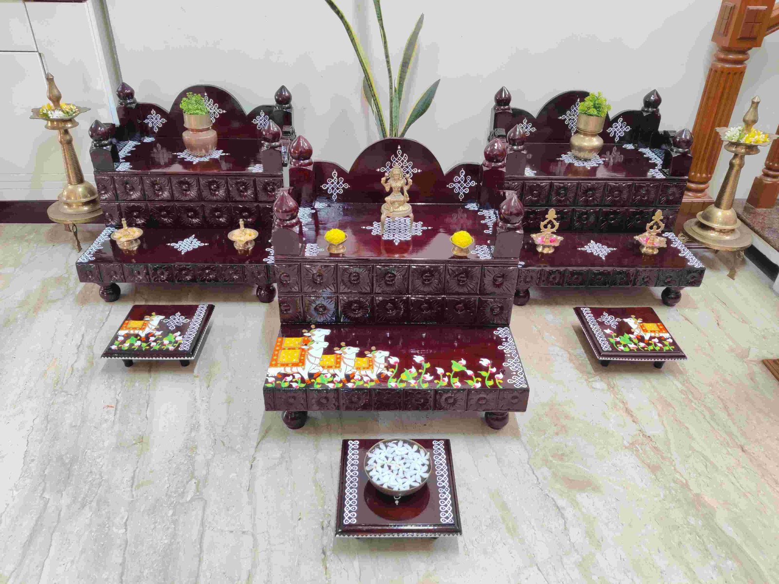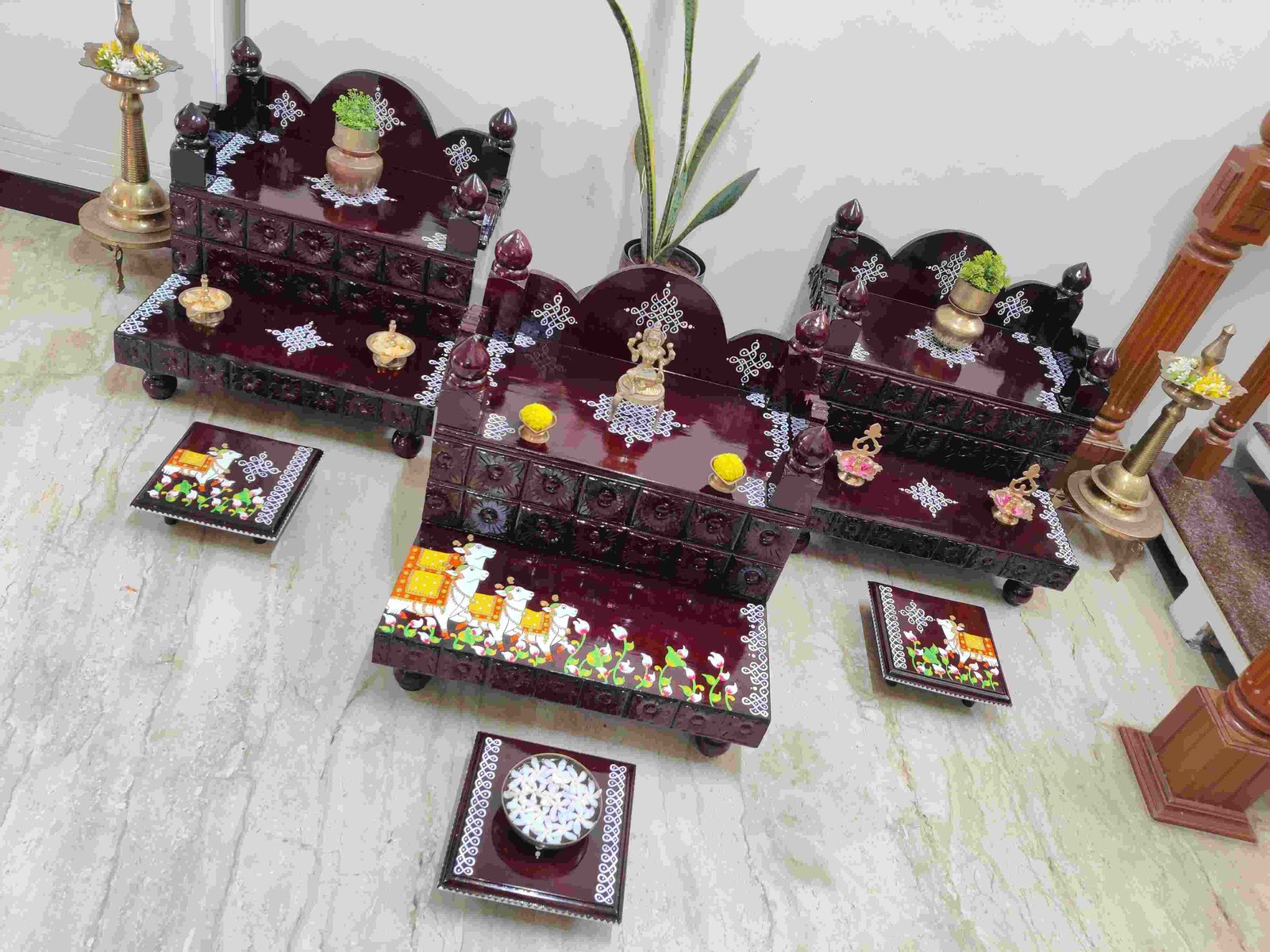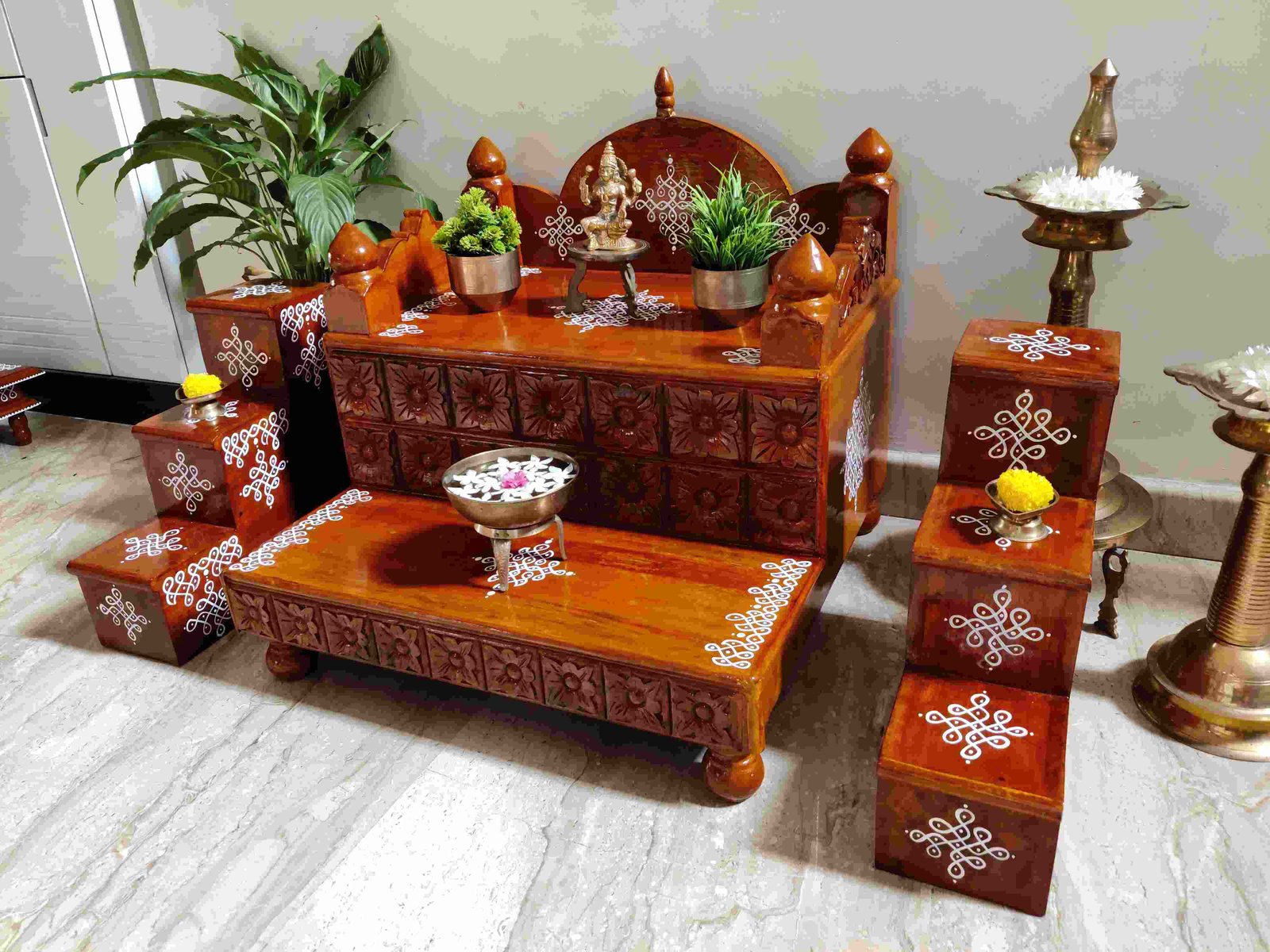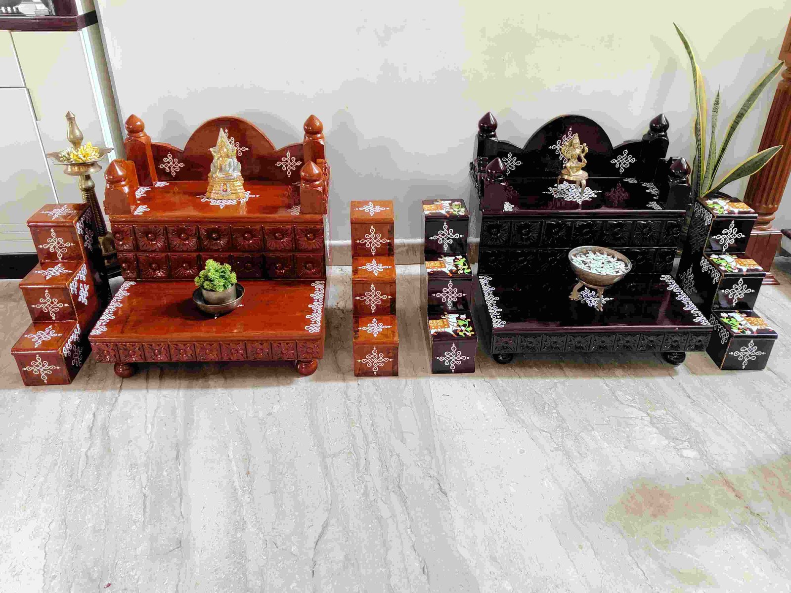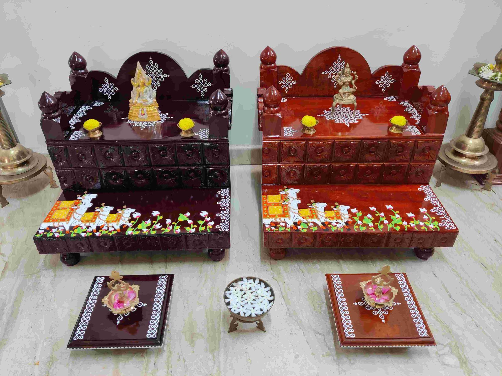 This an antique wooden step stool, which gives aesthetic look to the space. It can perfect piece for your Pooja space. It can also be a perfect piece to create niche corner. It can also be used as for God Display during Varamahalakshi Pooja , Ganesh Chathurthi or any other Pooja space at home, It can be finished in desired wood finish. Paintings can be customized.