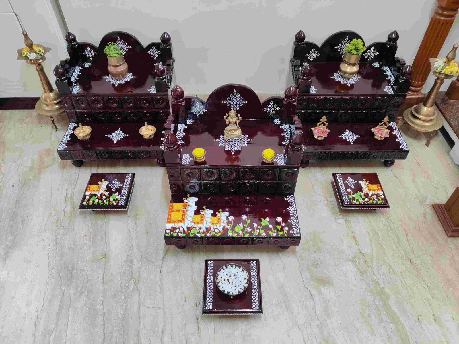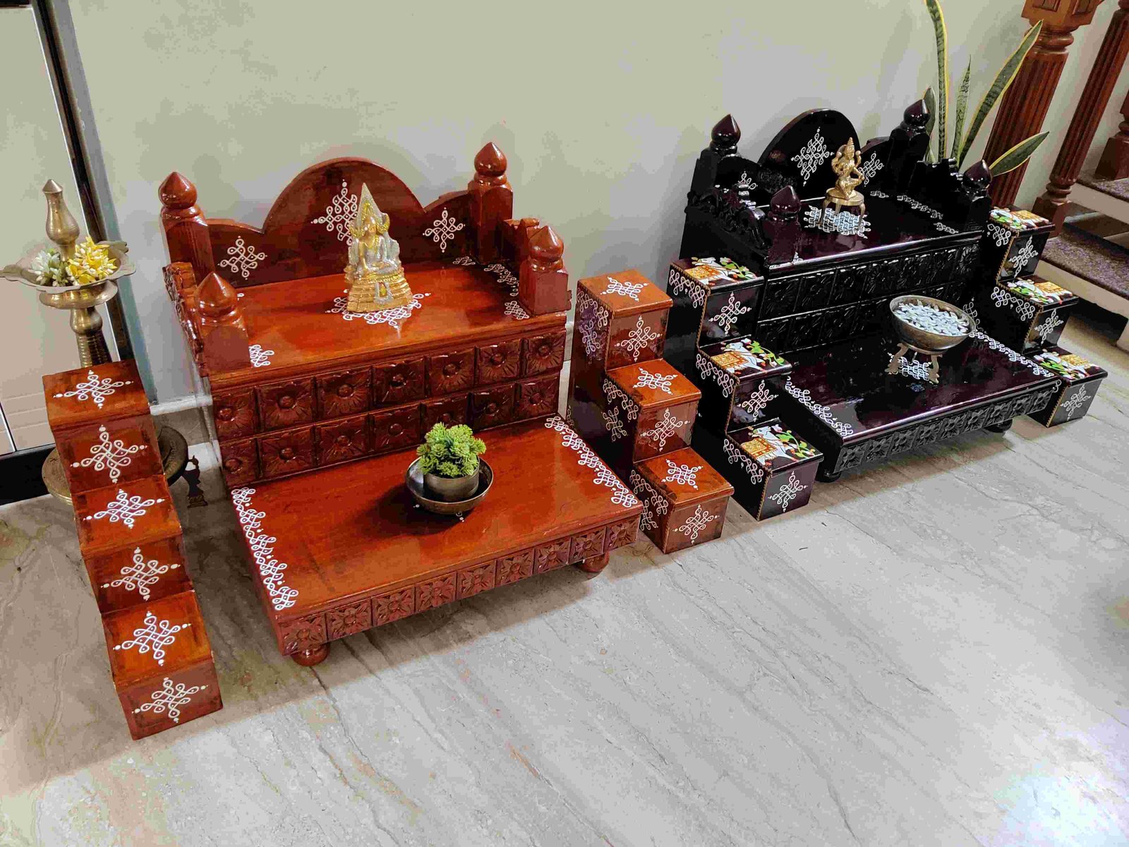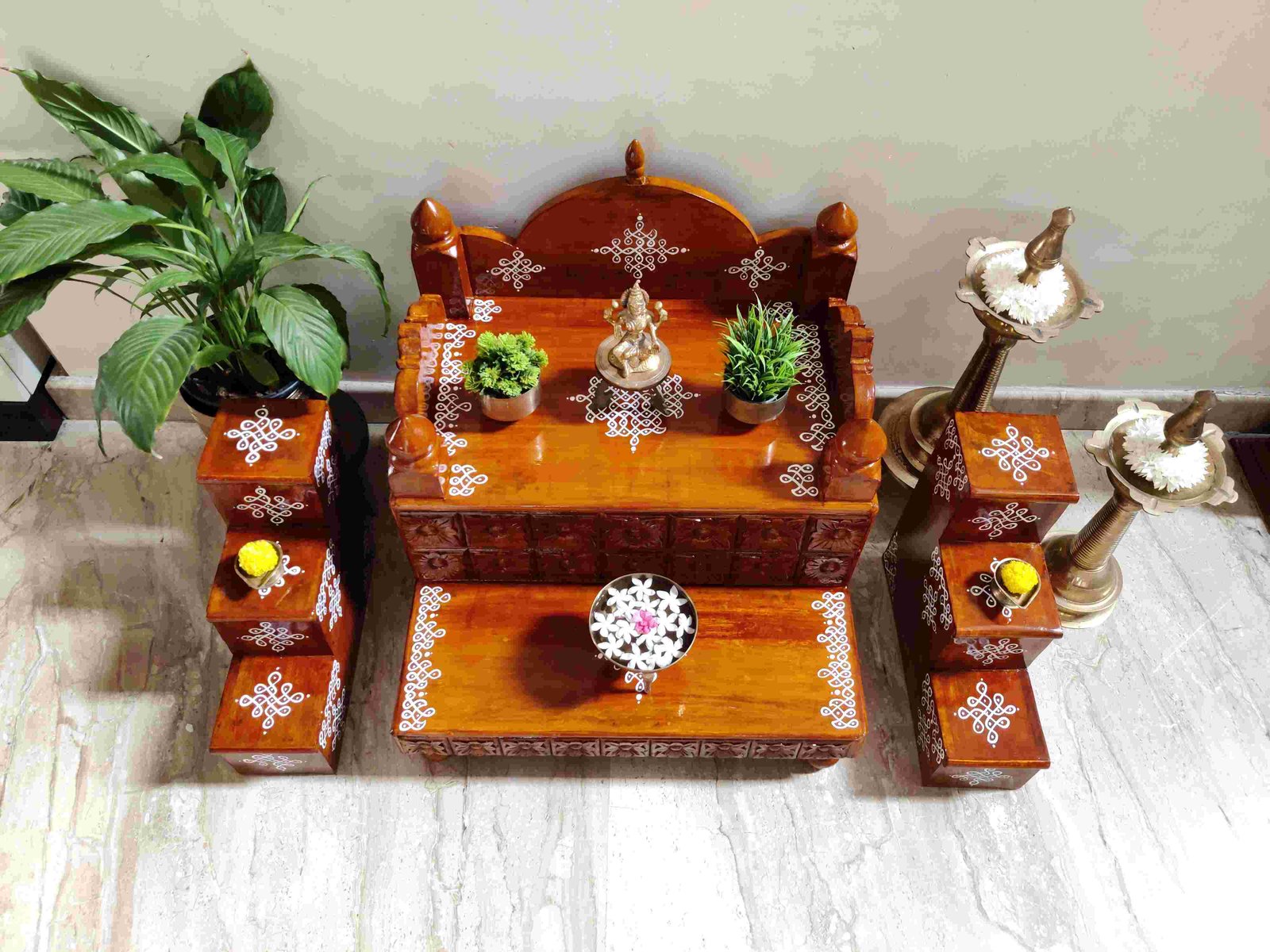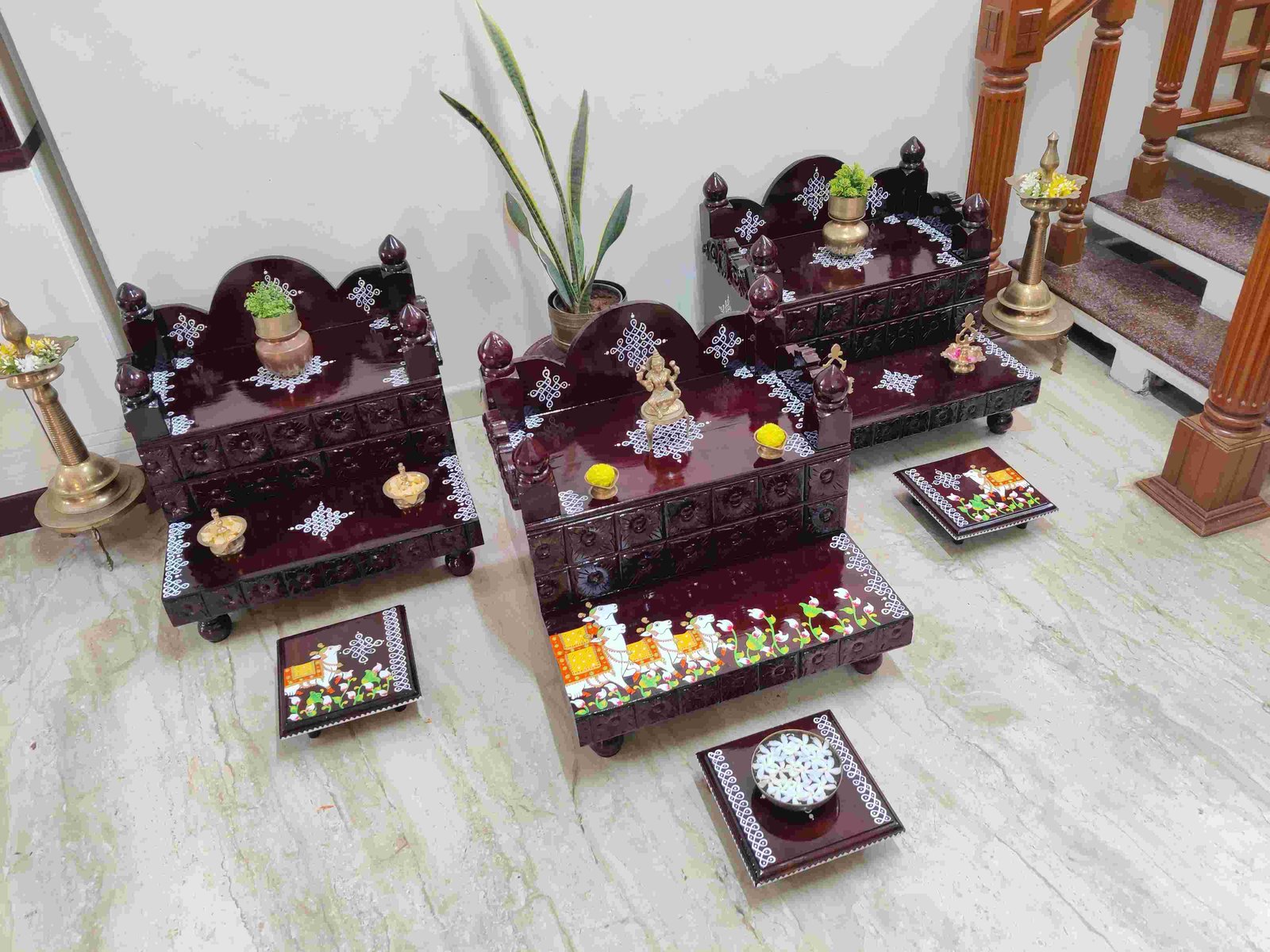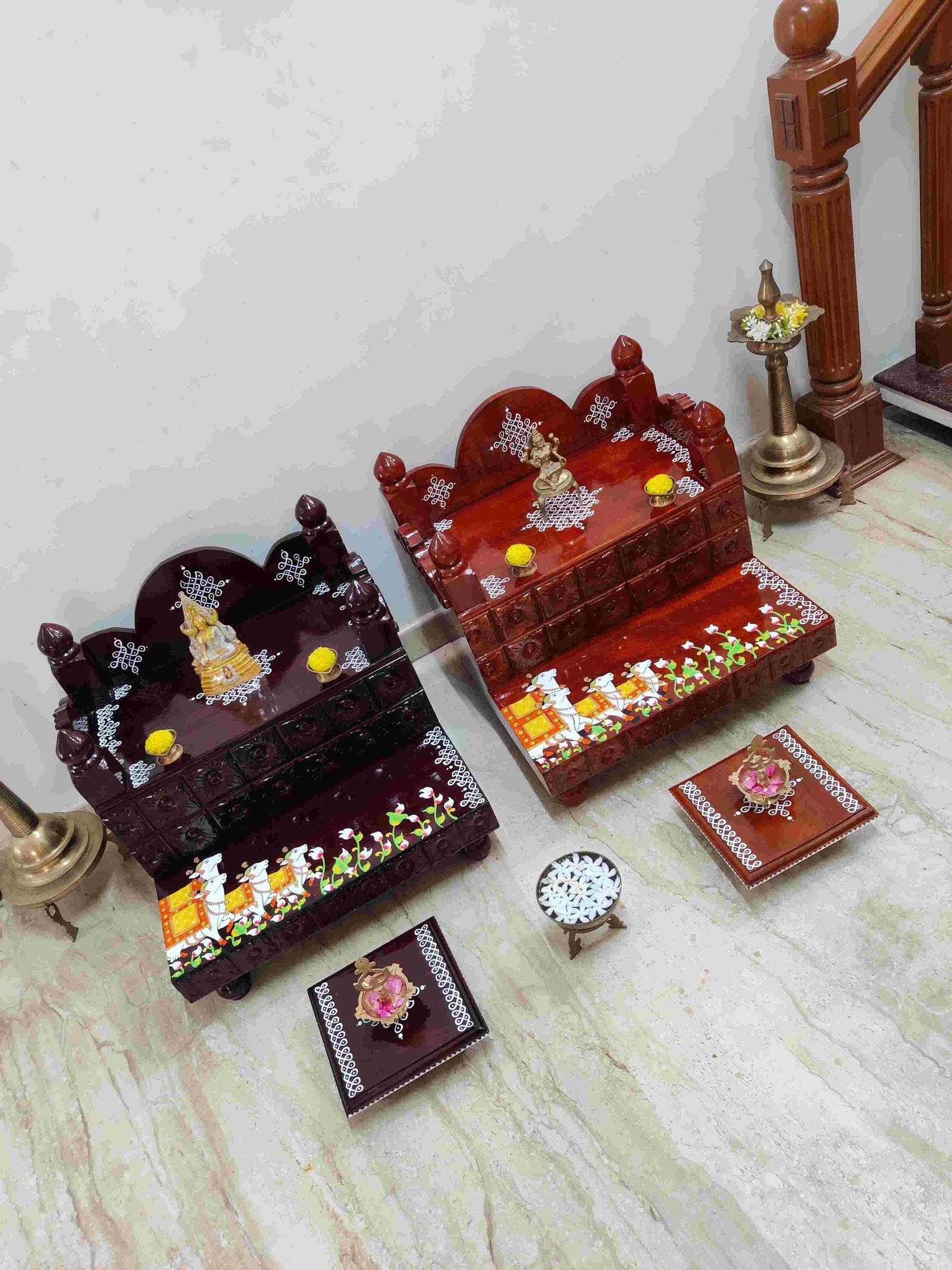 This an antique wooden step stool, which gives aesthetic look to the space. It can perfect piece for your Pooja space. It can also be a perfect piece to create niche corner. It can also be used as for God Display during Varamahalakshi Pooja , Ganesh Chathurthi or any other Pooja space at home, It can be finished in desired wood finish. Paintings can be customized.