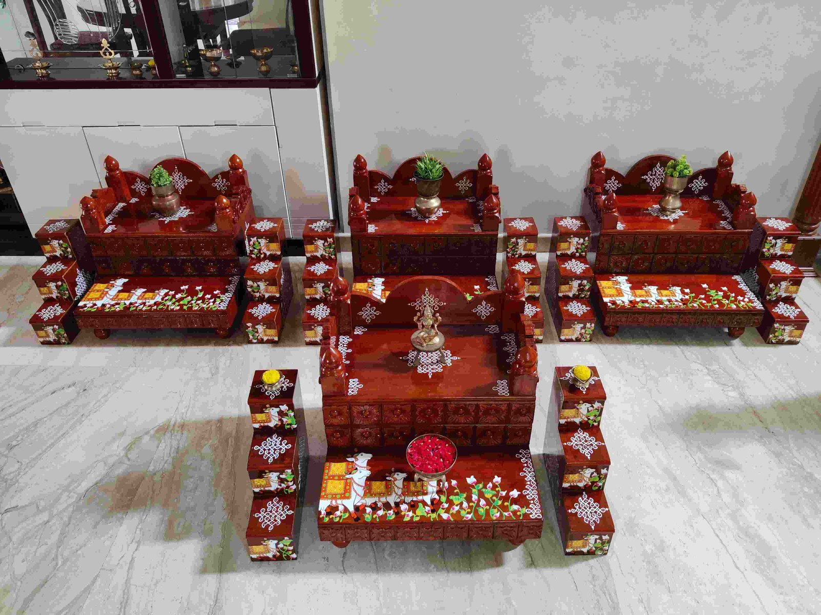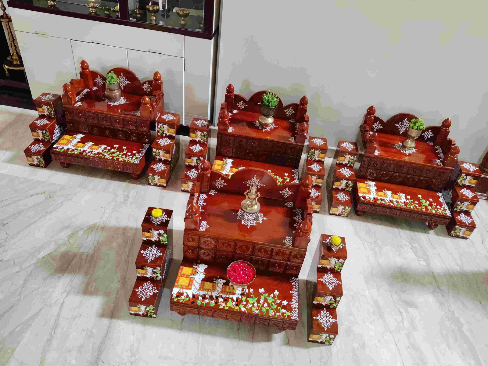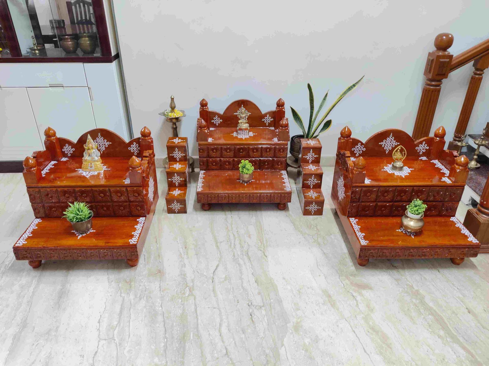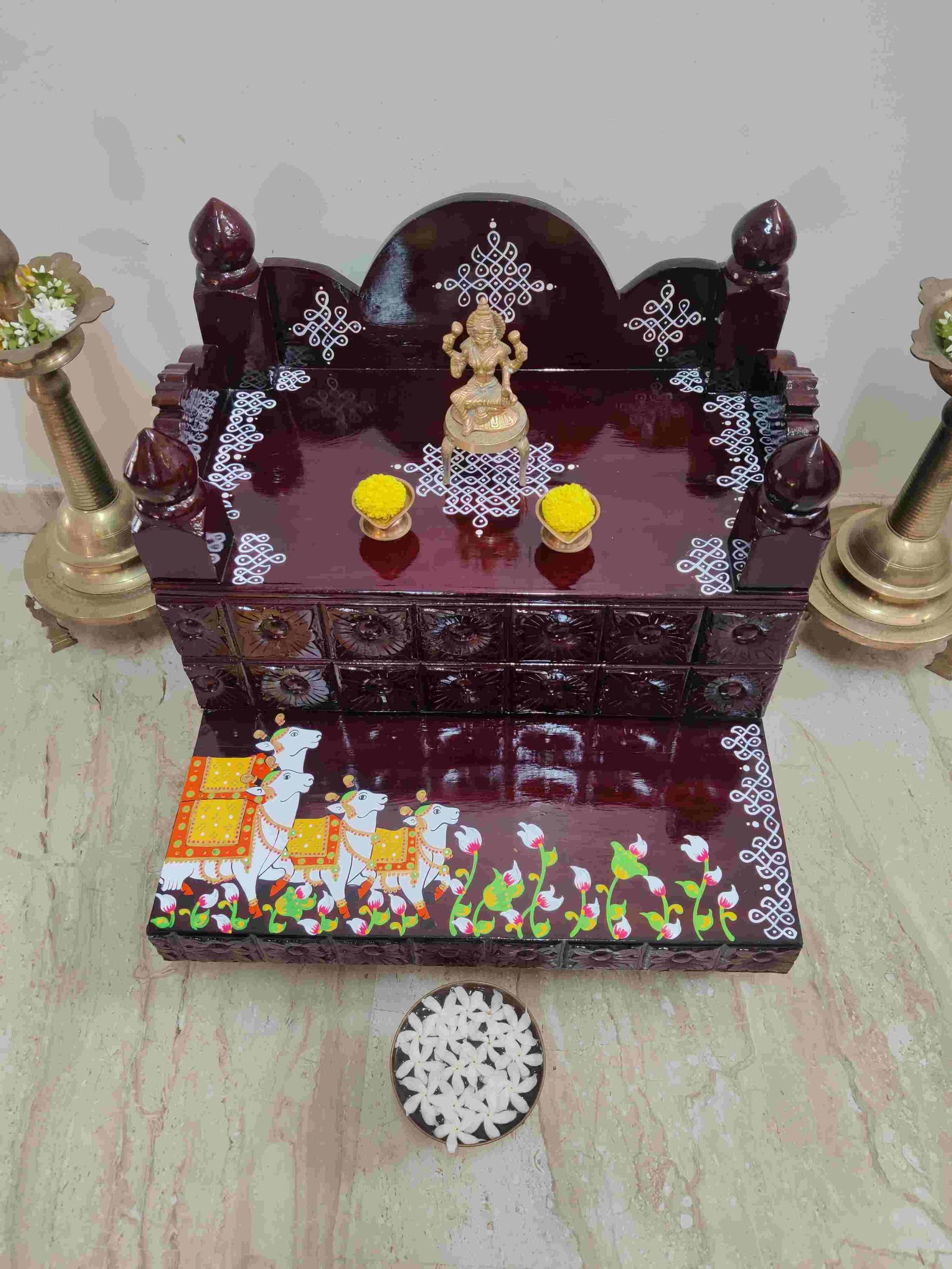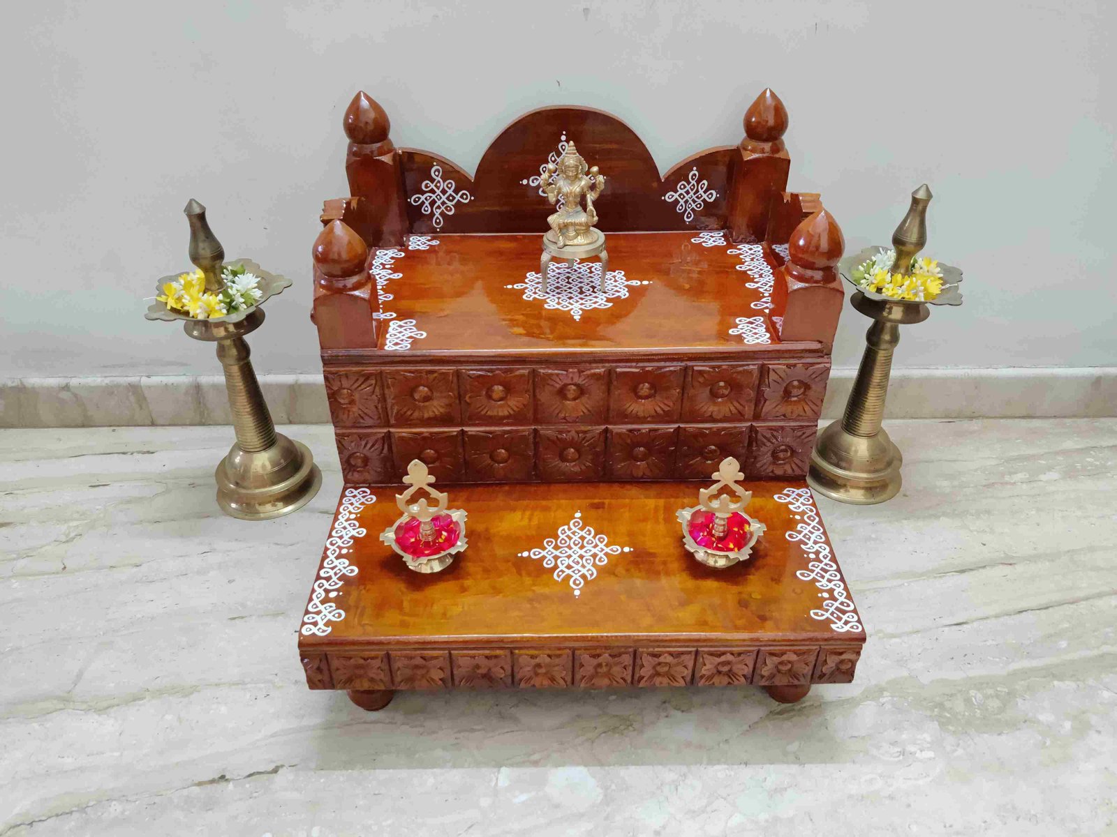 This an antique wooden step stool, which gives aesthetic look to the space. It can perfect piece for your Pooja space. It can also be a perfect piece to create niche corner. It can also be used as for God Display during Varamahalakshi Pooja , Ganesh Chathurthi or any other Pooja space at home, It can be finished in desired wood finish. Paintings can be customized.