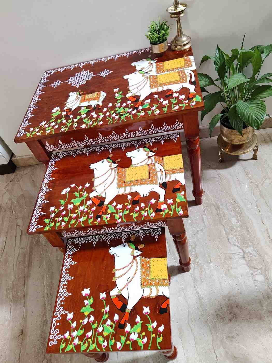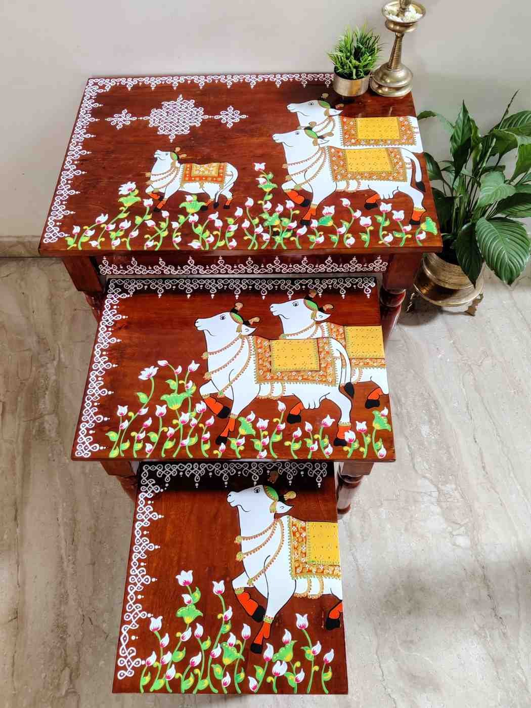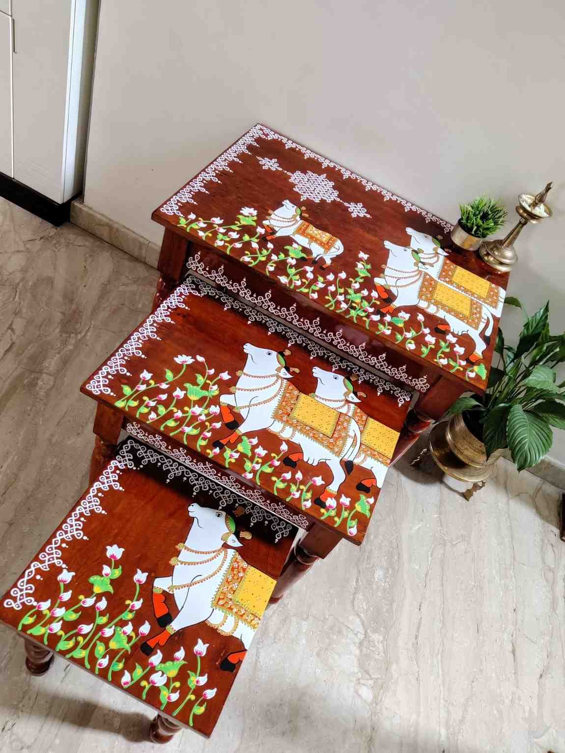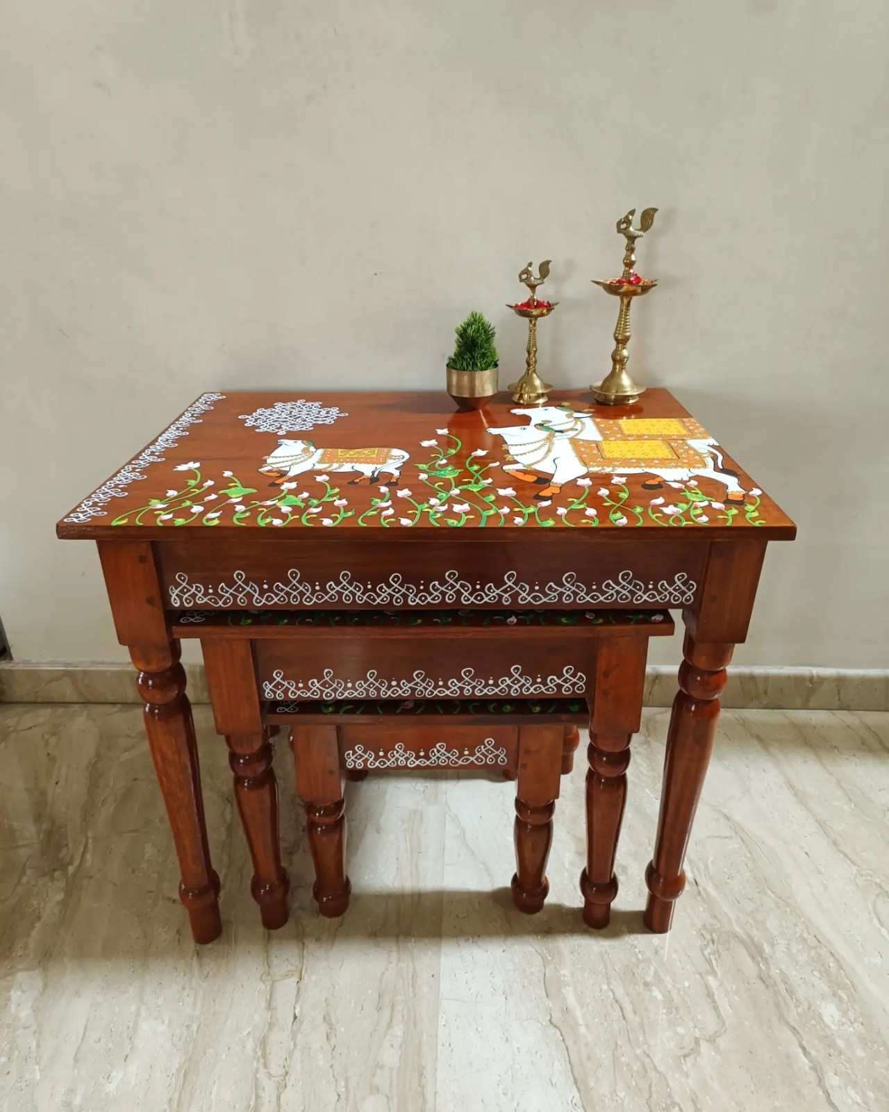 This an antique wooden Table Set, which gives aesthetic look to the space. It can also be a perfect piece to create niche corner. It can be finished in desired wood finish. Paintings can be customized.