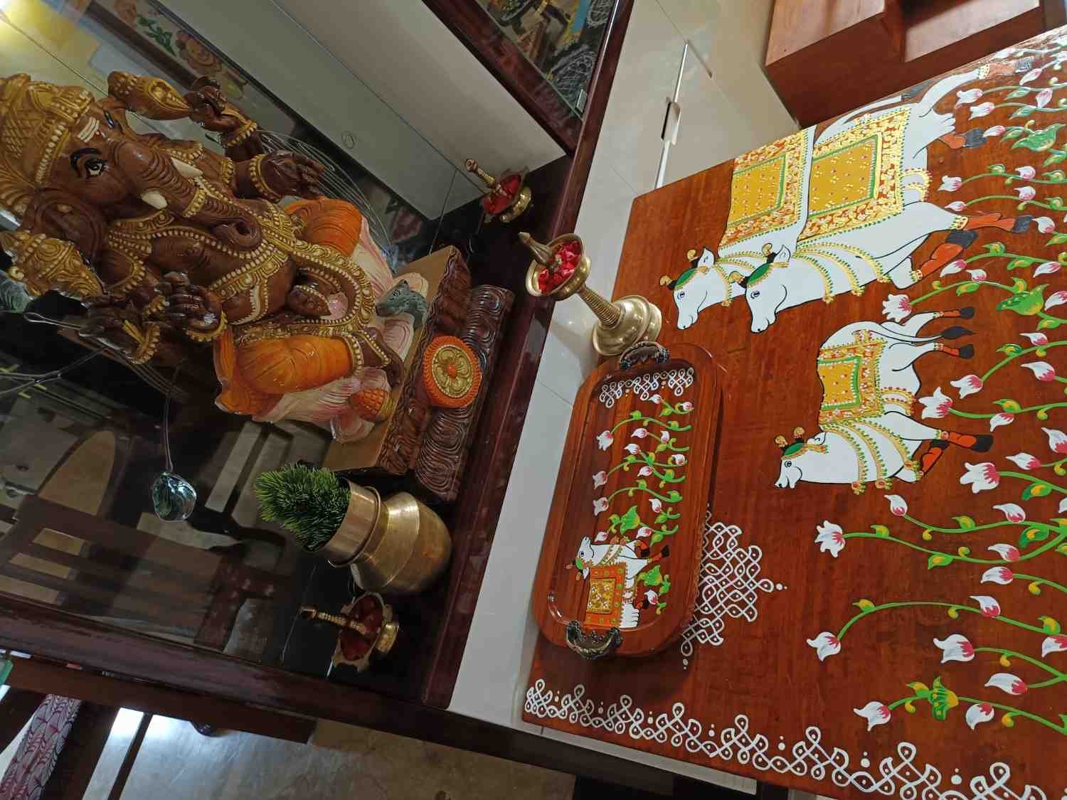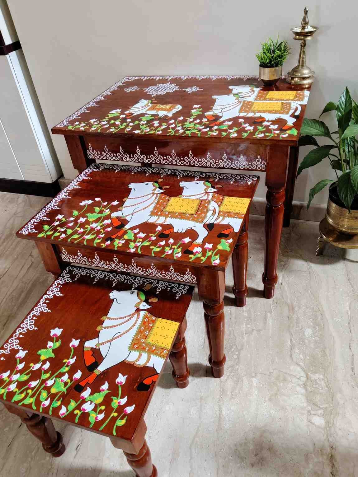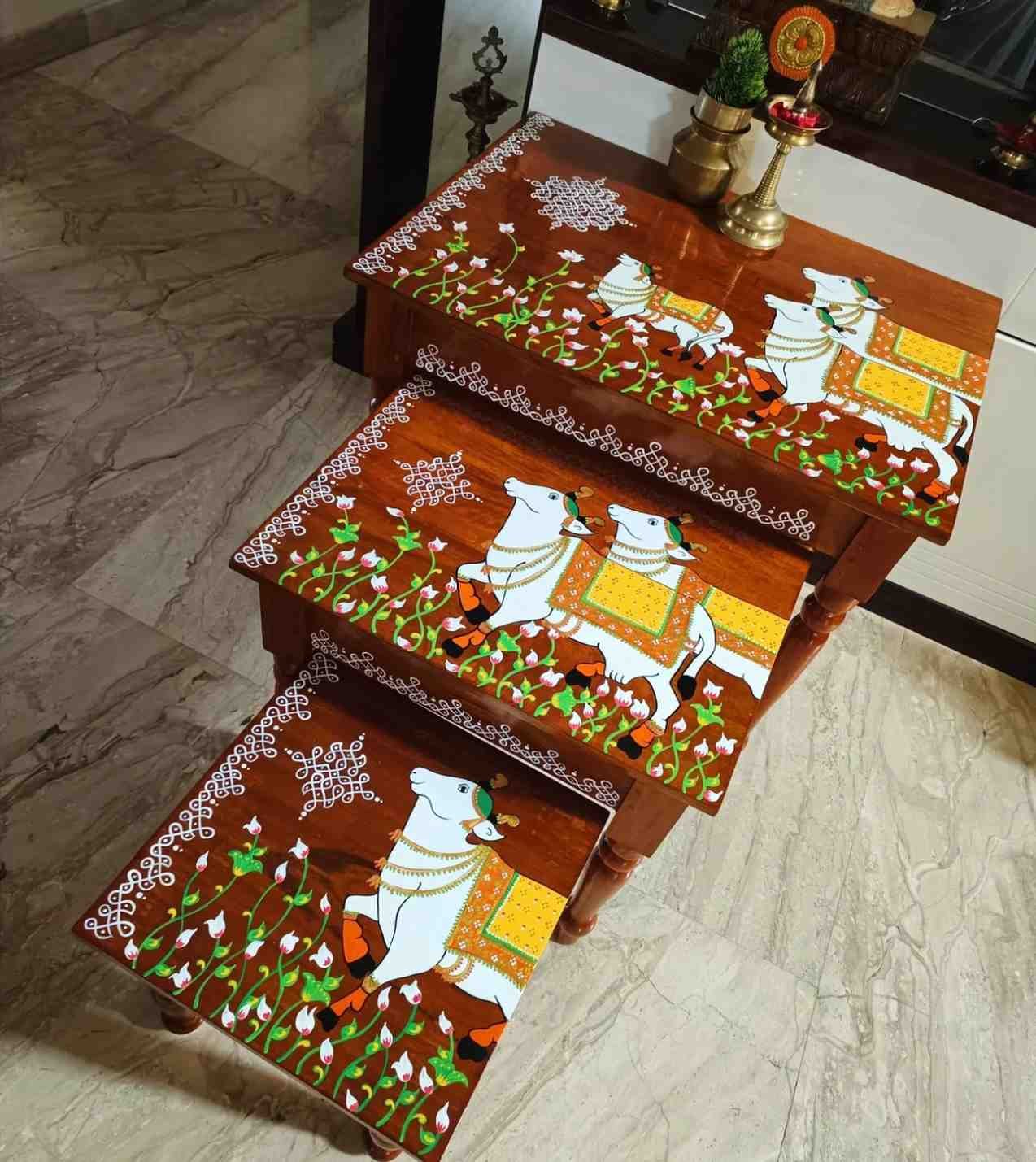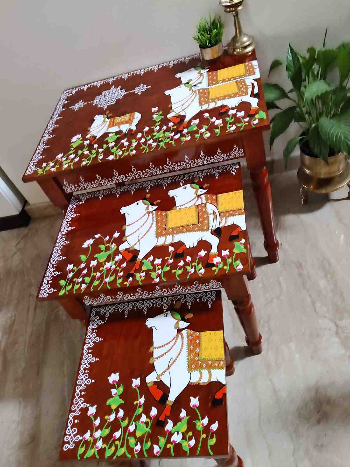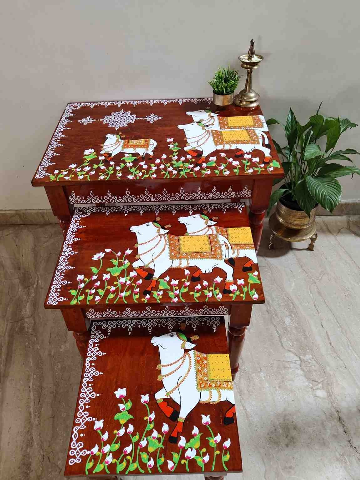 This an antique wooden Table Set, which gives aesthetic look to the space. It can also be a perfect piece to create niche corner. It can be finished in desired wood finish. Paintings can be customized.