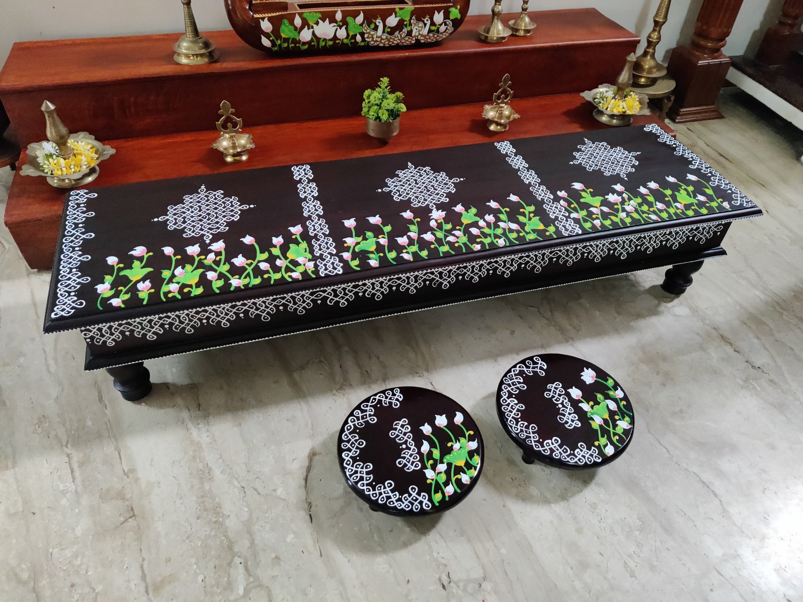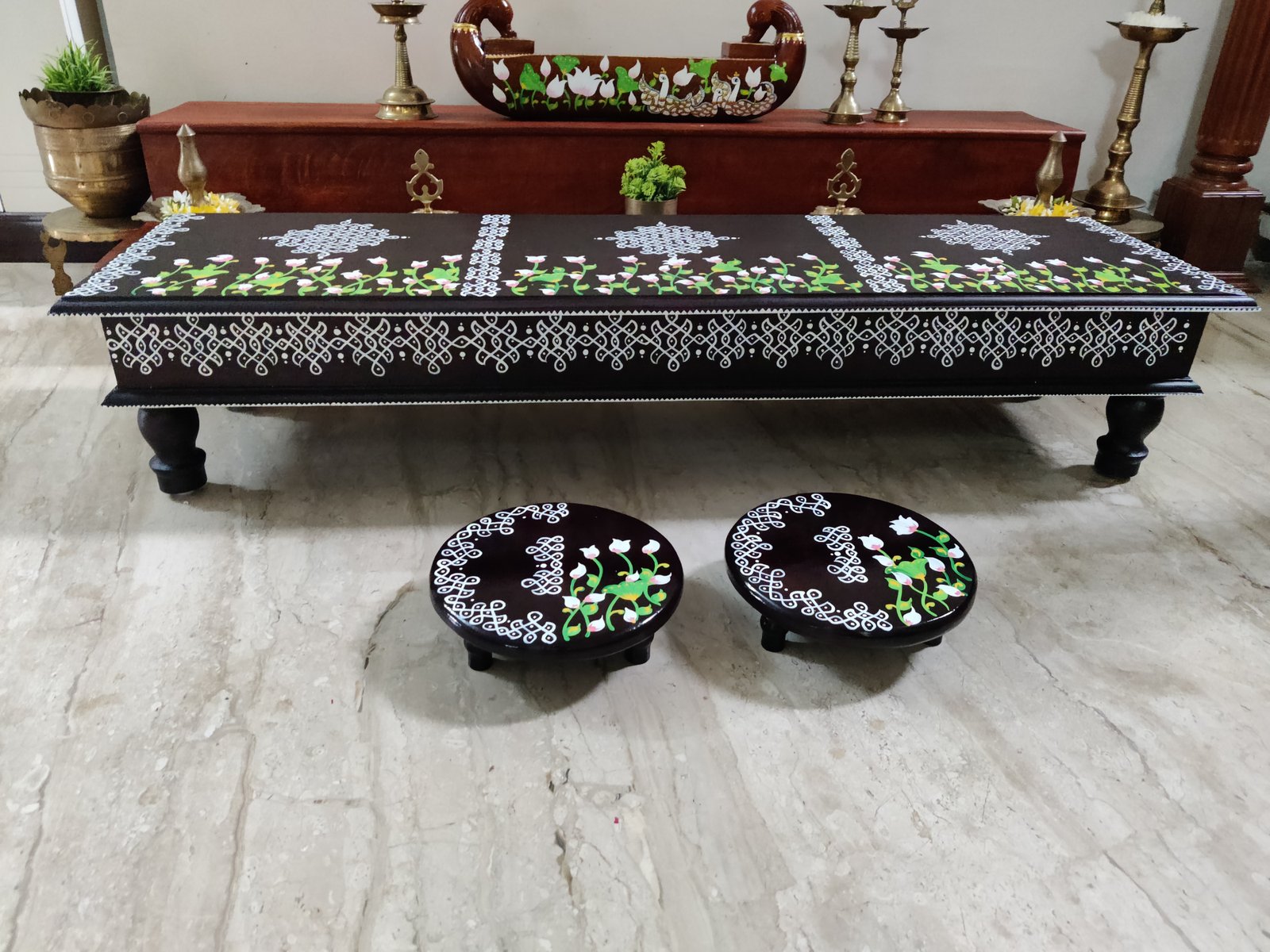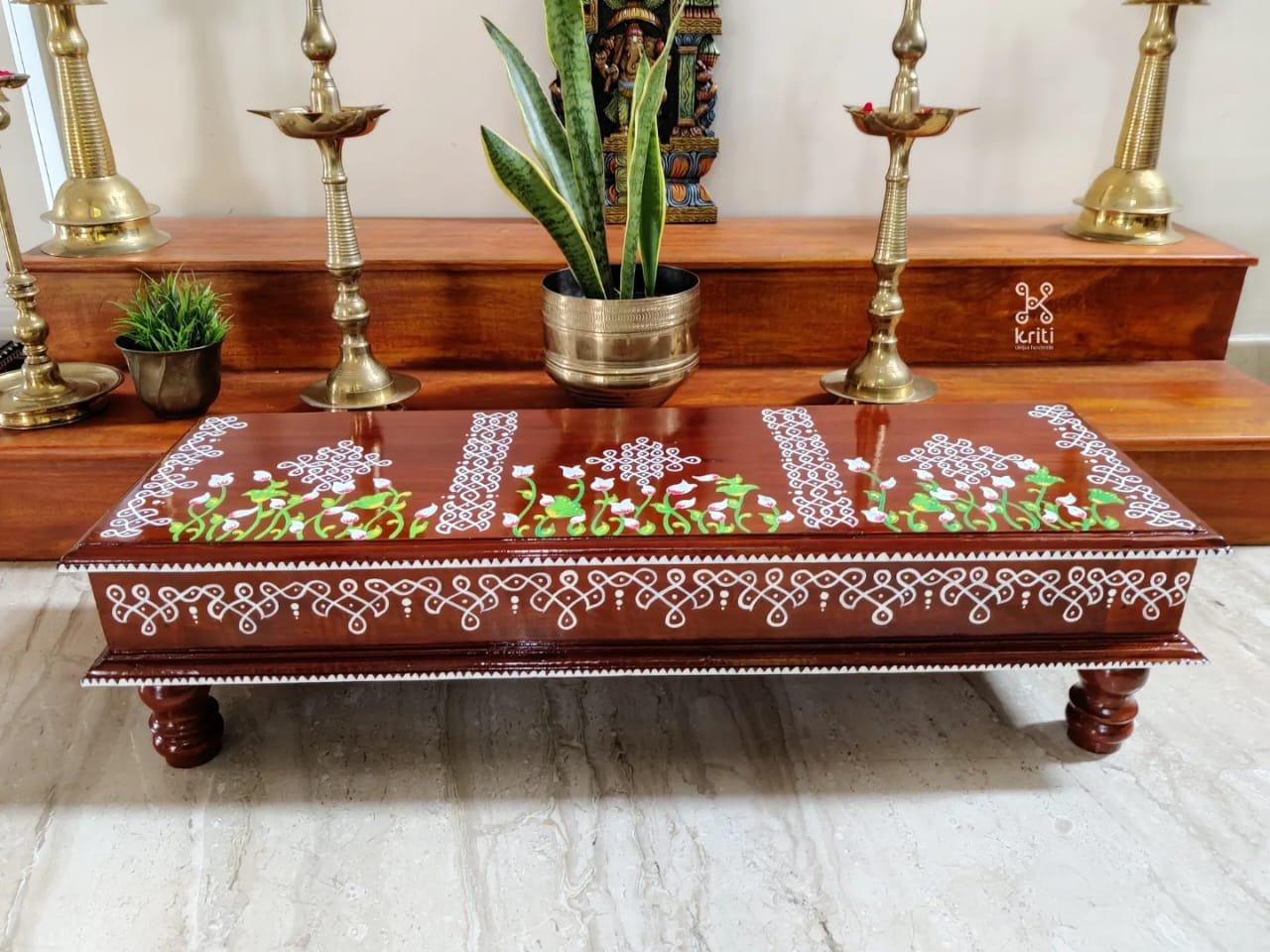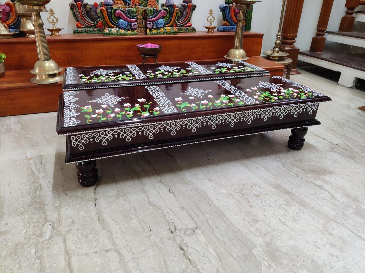 This is a traditional wooden stool or manai where an adult can be seated for any Pooja or function. It can also be used as a traditional décor, display of heavy statues and other display purposes. Can be done in wood finish only. Paintings can be customized.