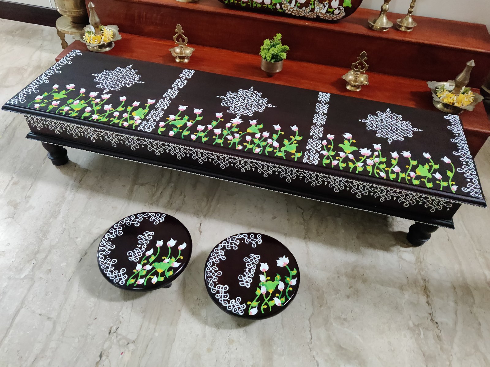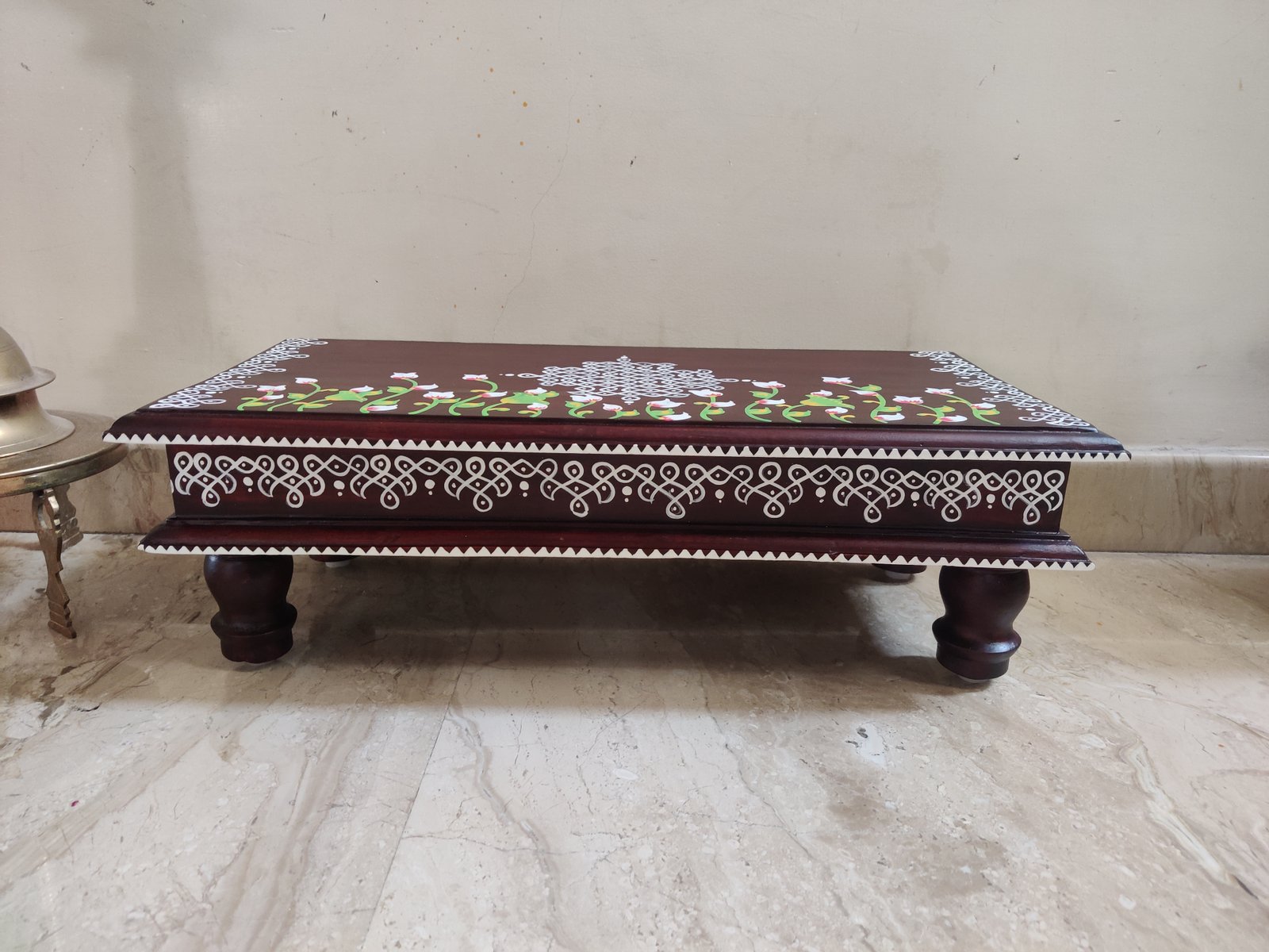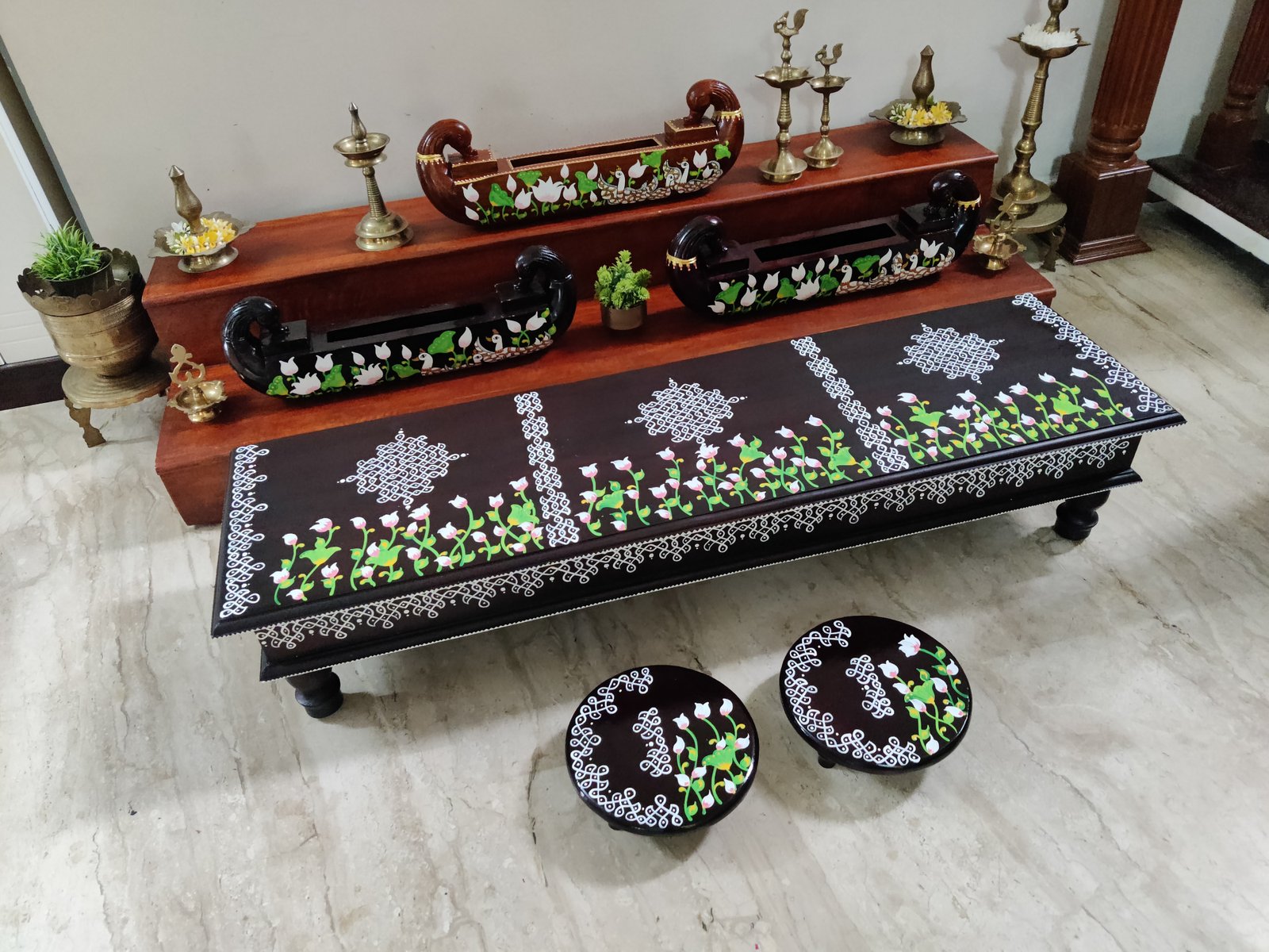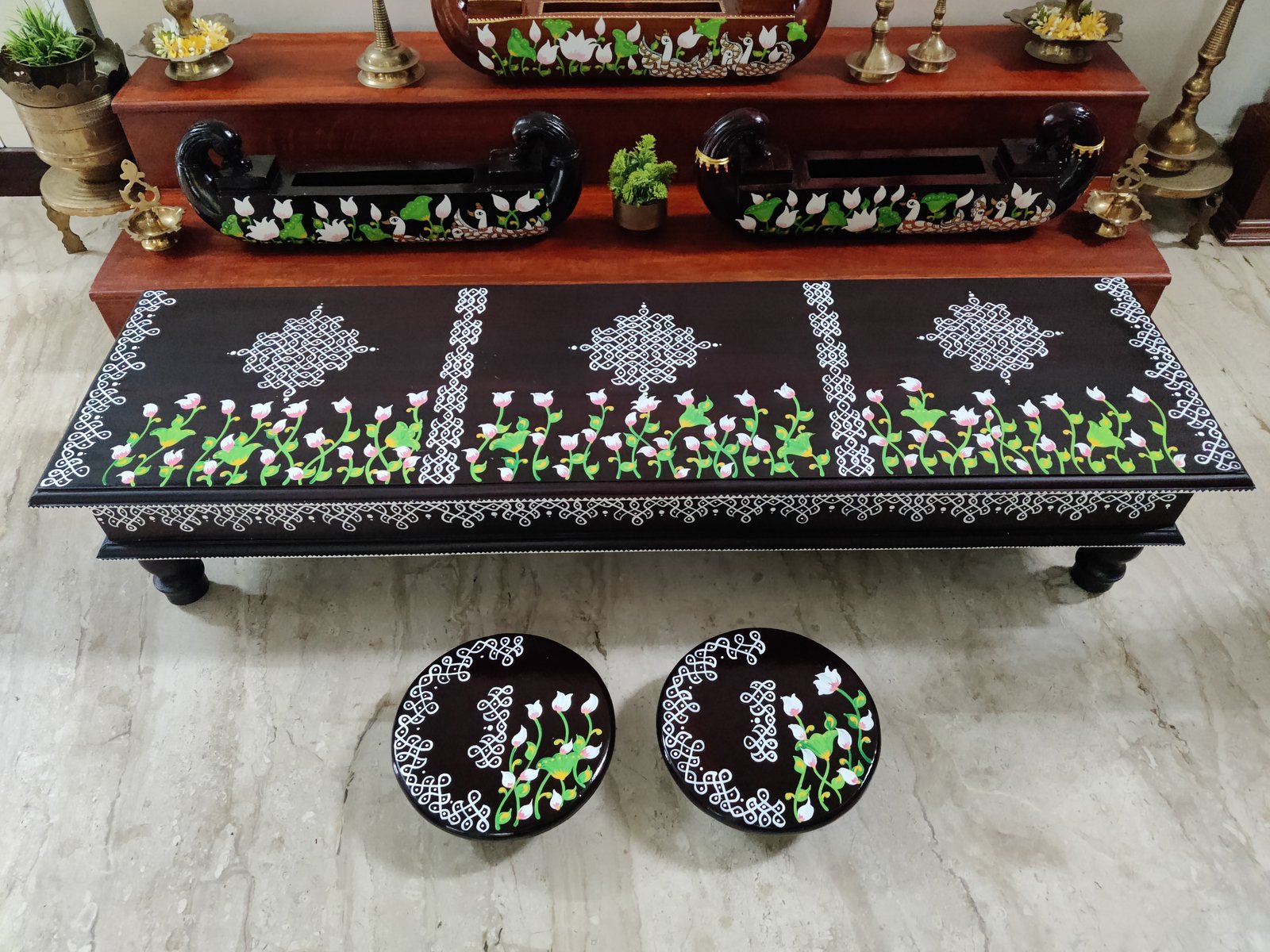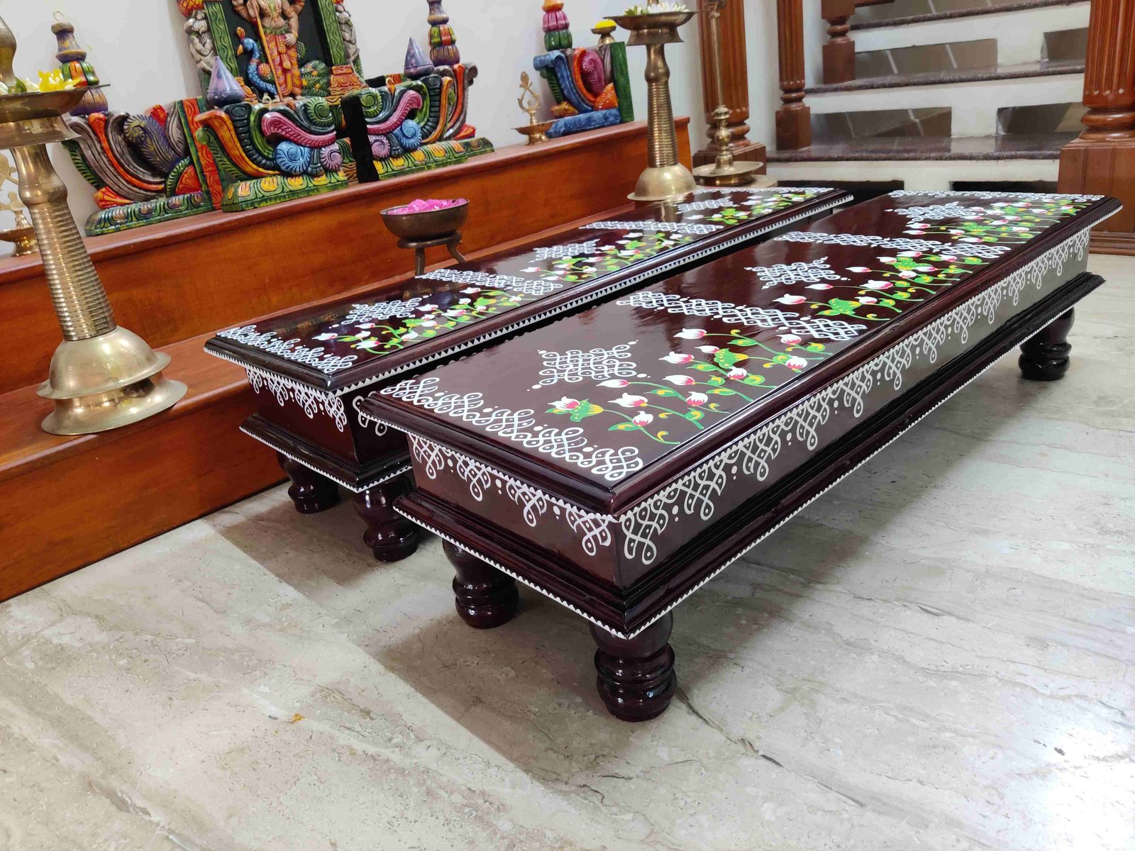 This is a traditional wooden stool or manai where an adult can be seated for any Pooja or function. It can also be used as a traditional décor, display of heavy statues and other display purposes. Can be done in wood finish only. Paintings can be customized.