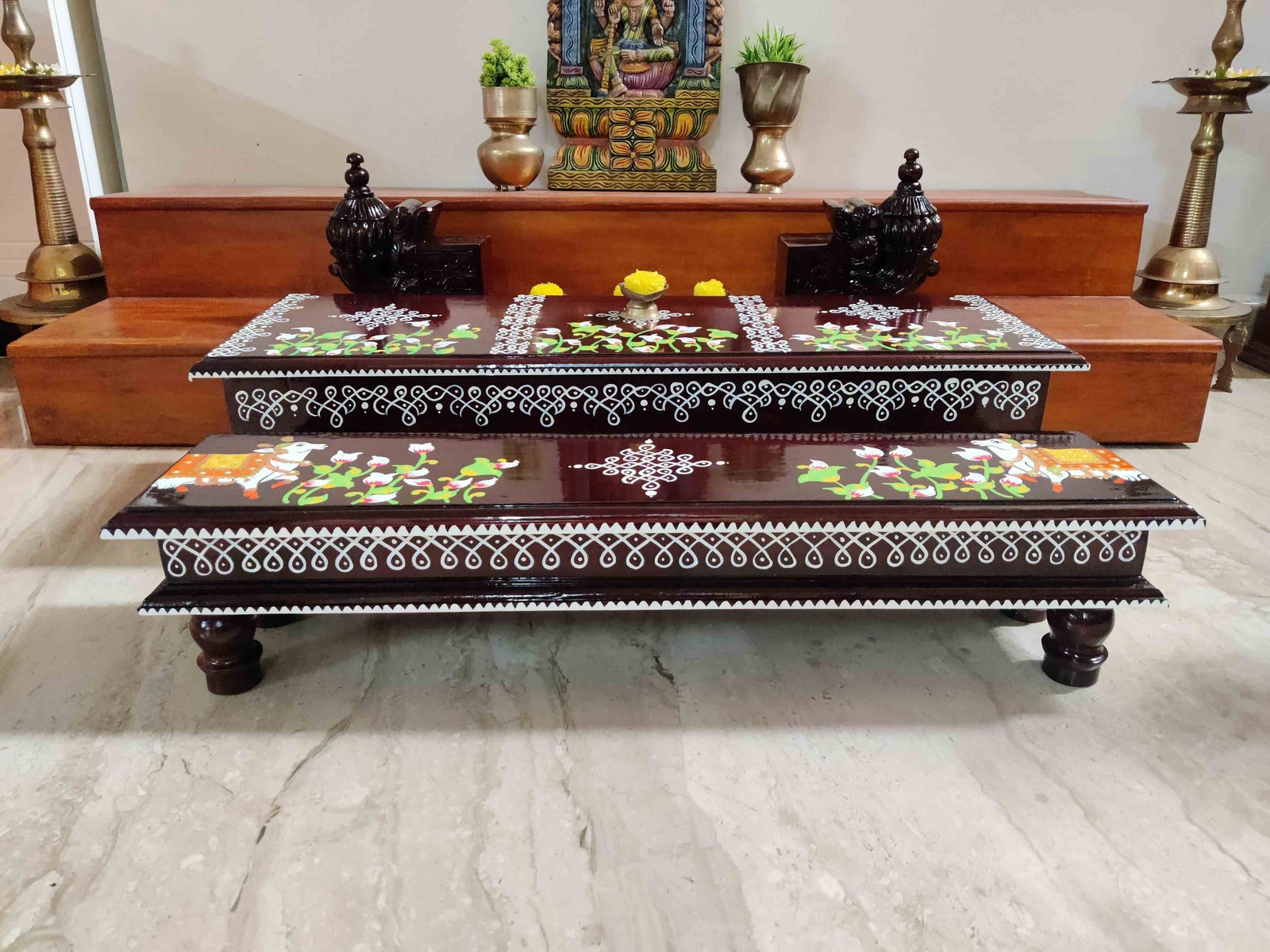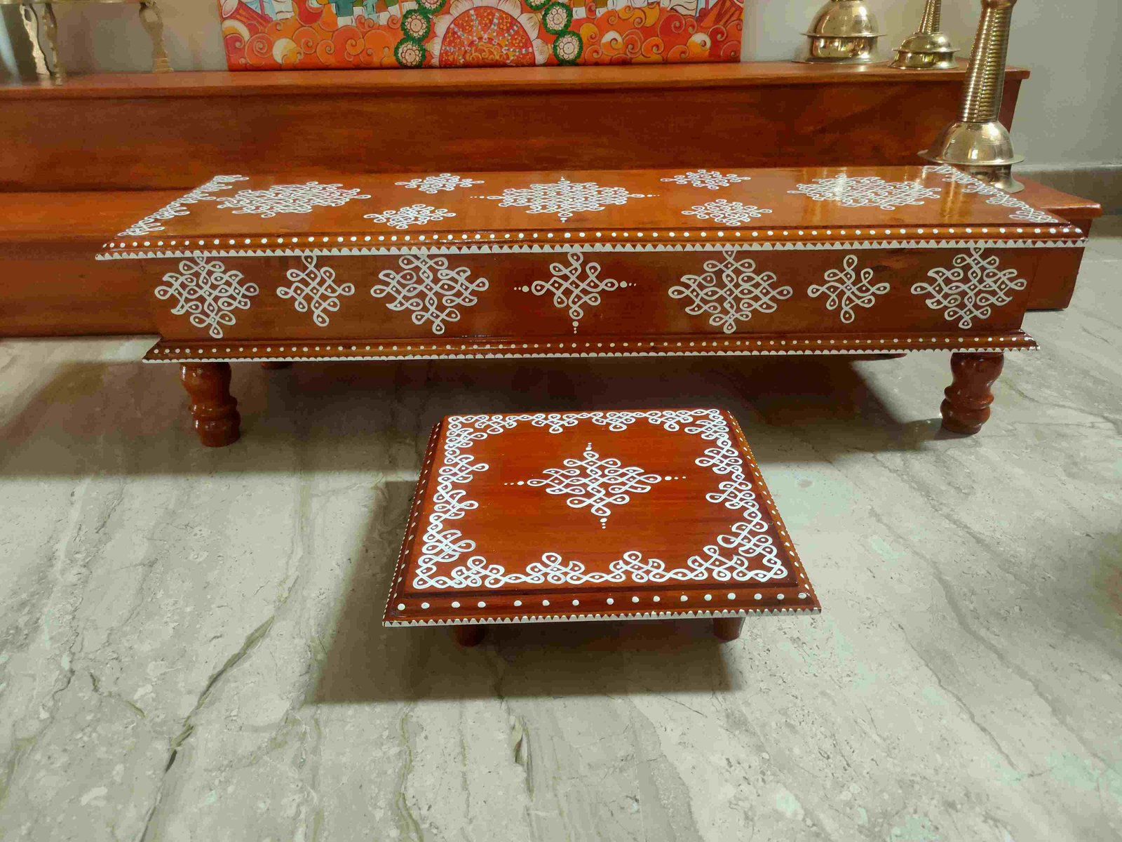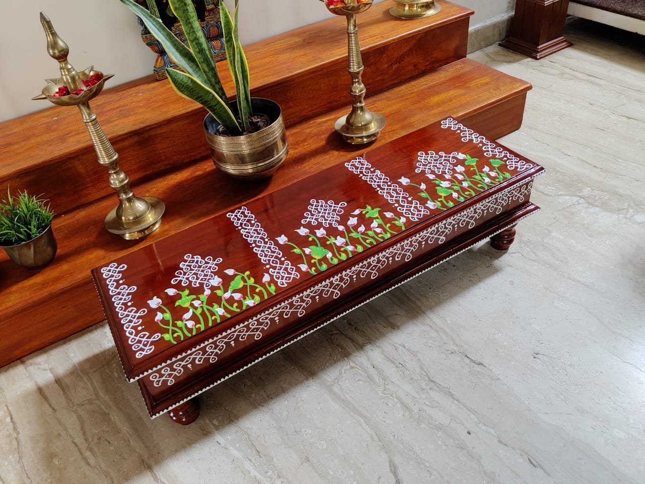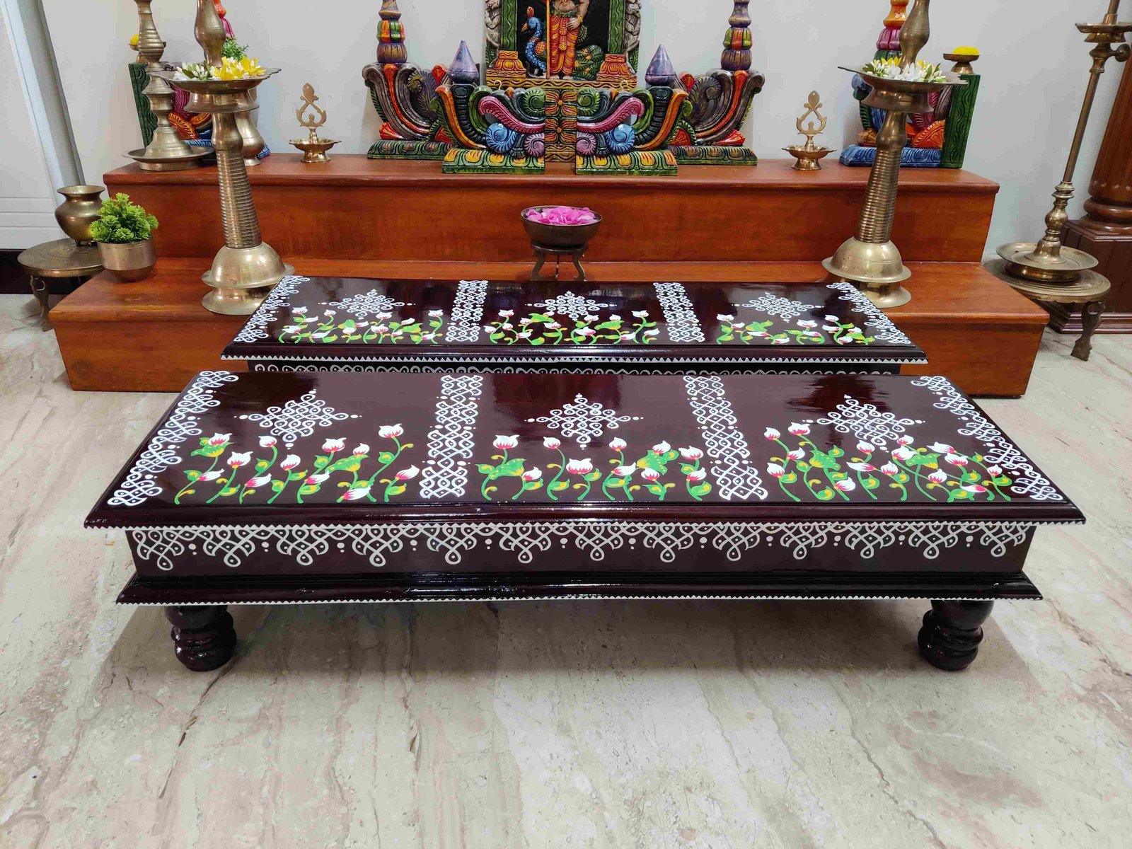 This is a traditional wooden stool or manai where an adult can be seated for any Pooja or function. It can also be used as a traditional décor, display of heavy statues and other display purposes. Can be done in wood finish only. Paintings can be customized.