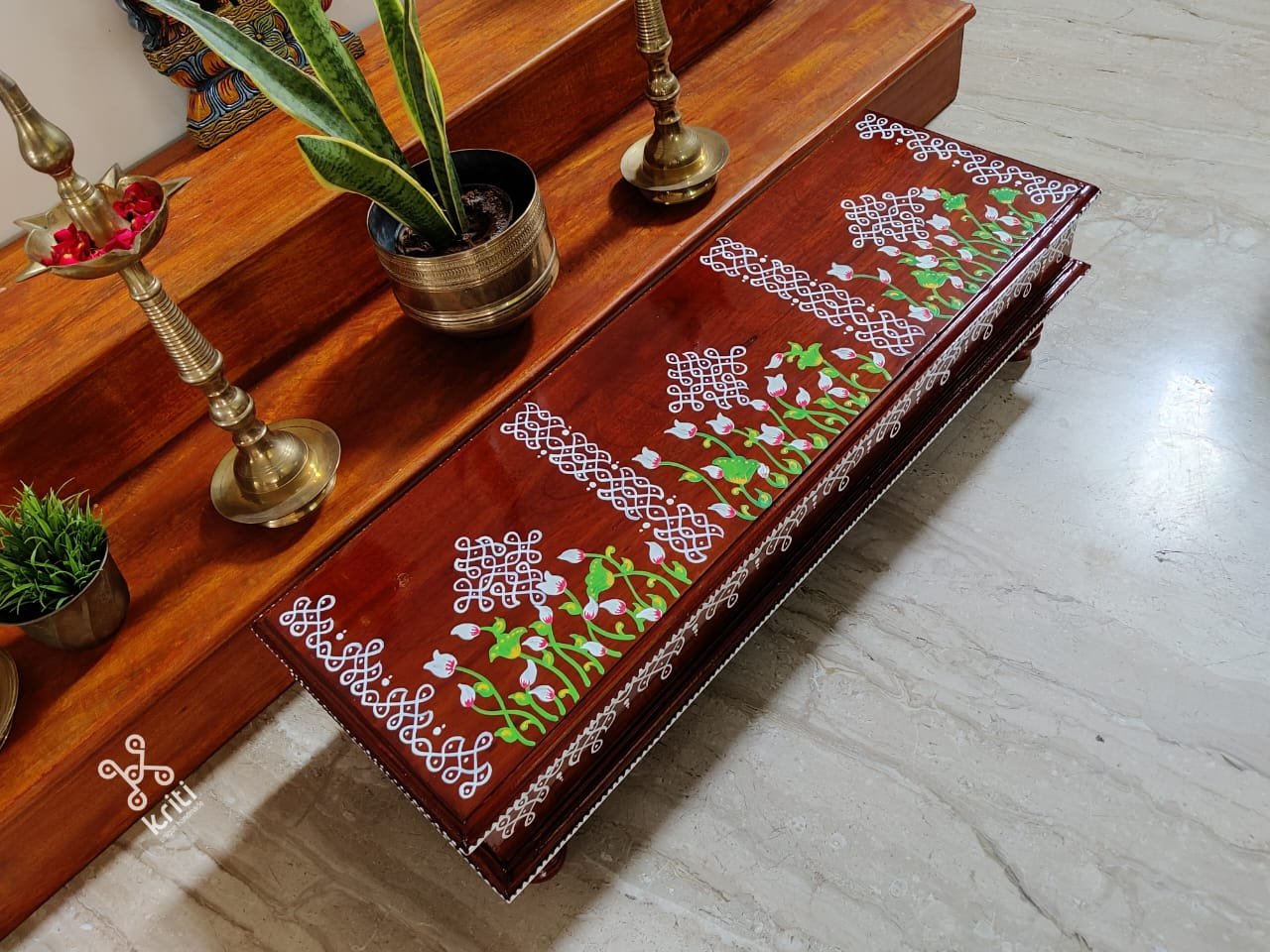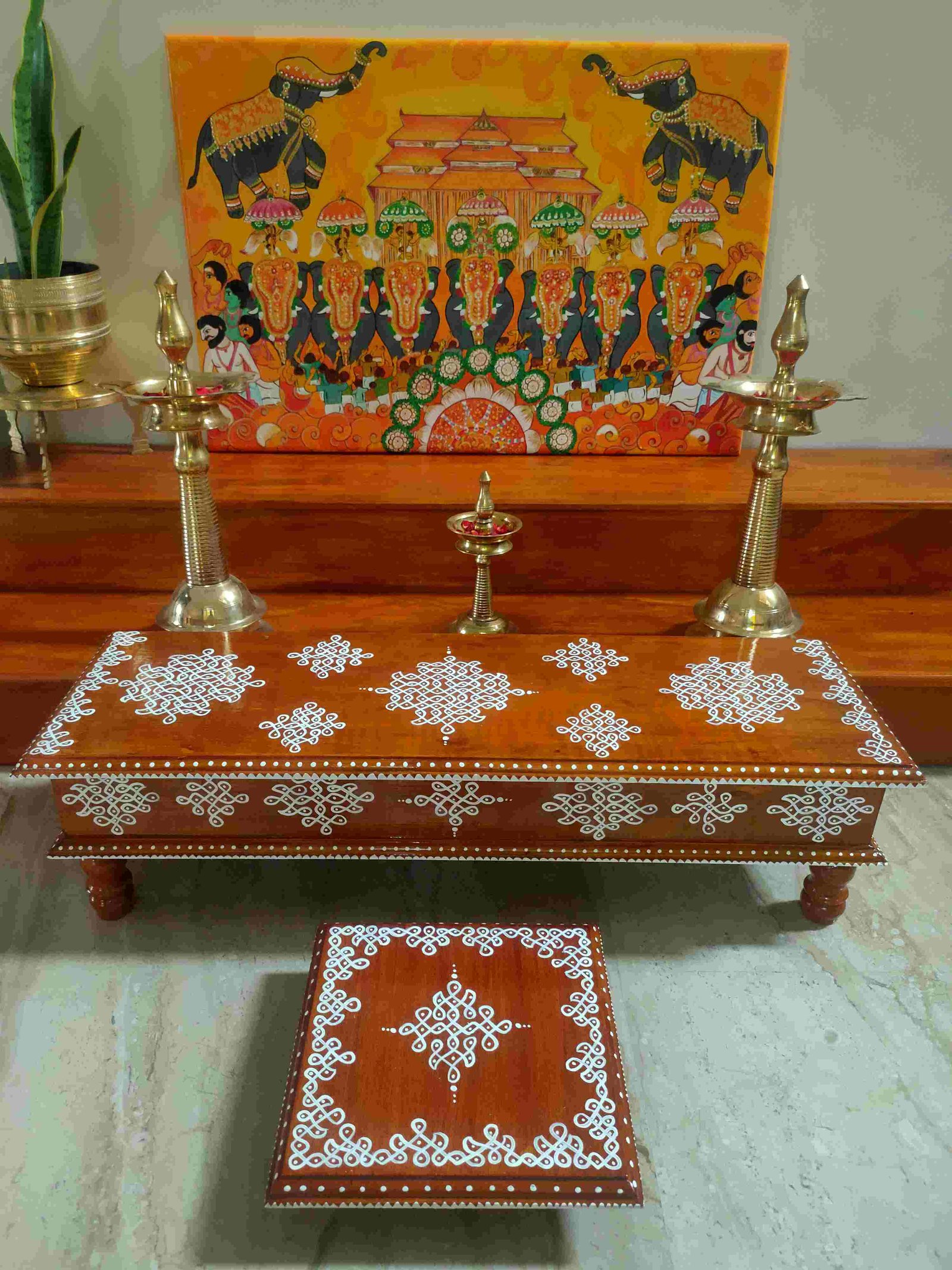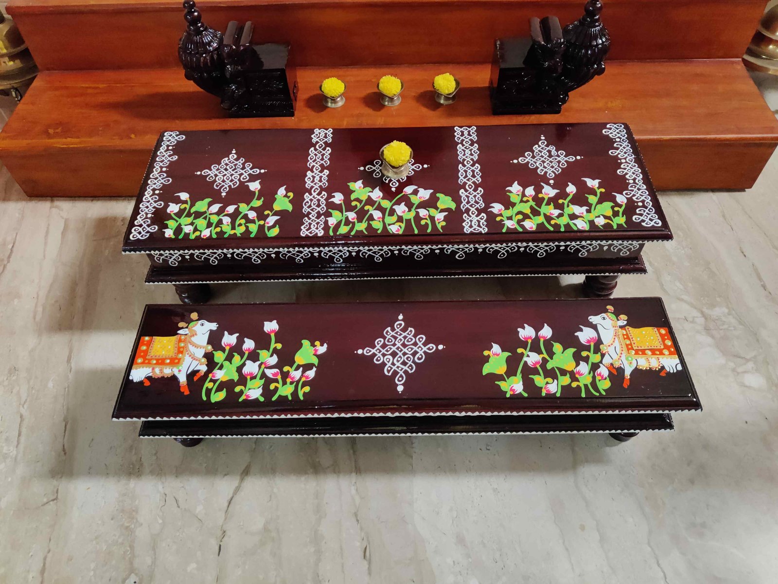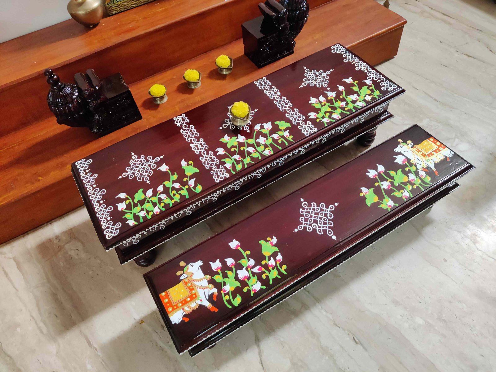 This is a traditional wooden stool or manai where an adult can be seated for any Pooja or function. It can also be used as a traditional décor, display of heavy statues and other display purposes. Can be done in wood finish only. Paintings can be customized.