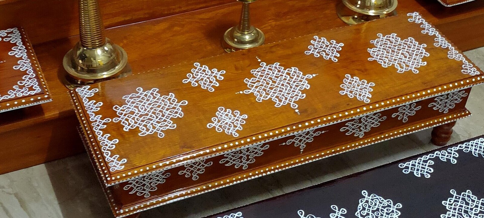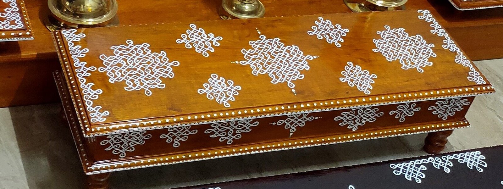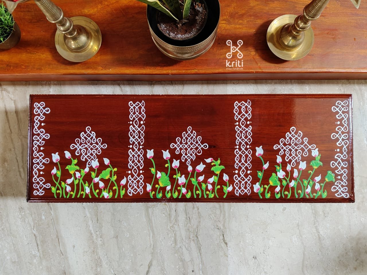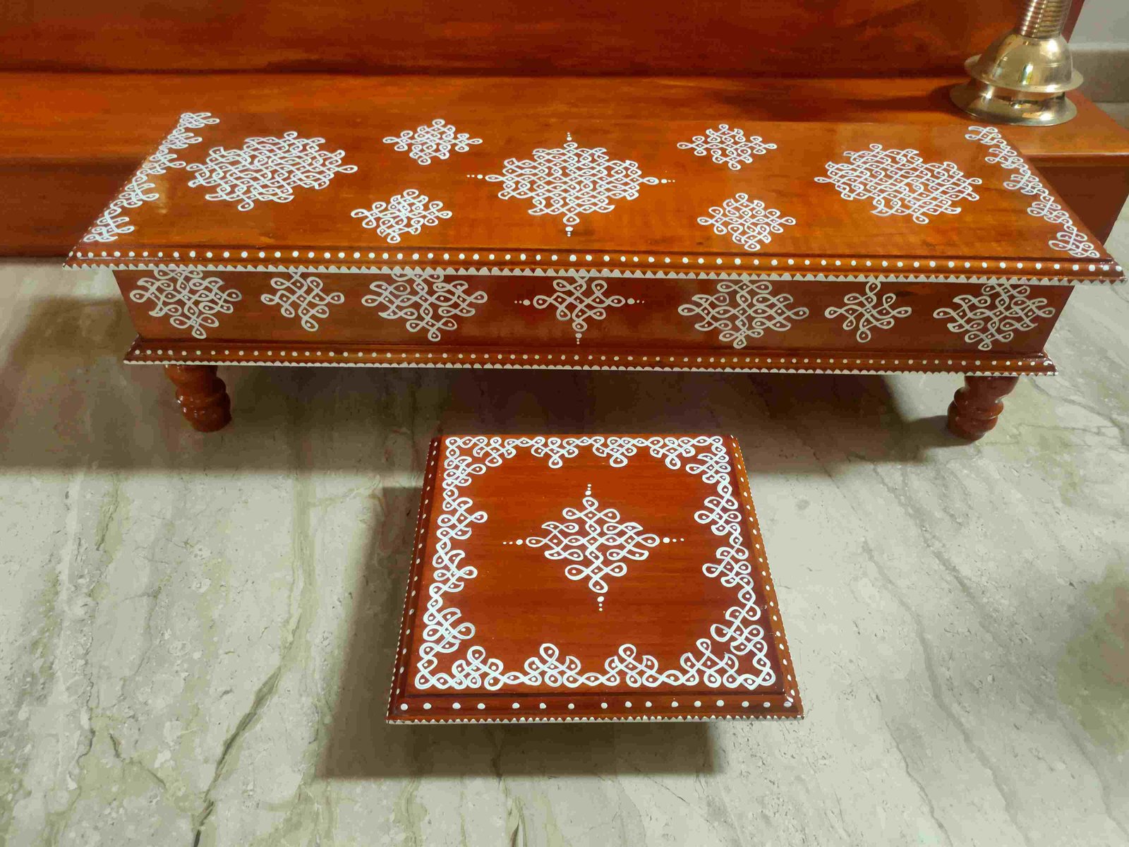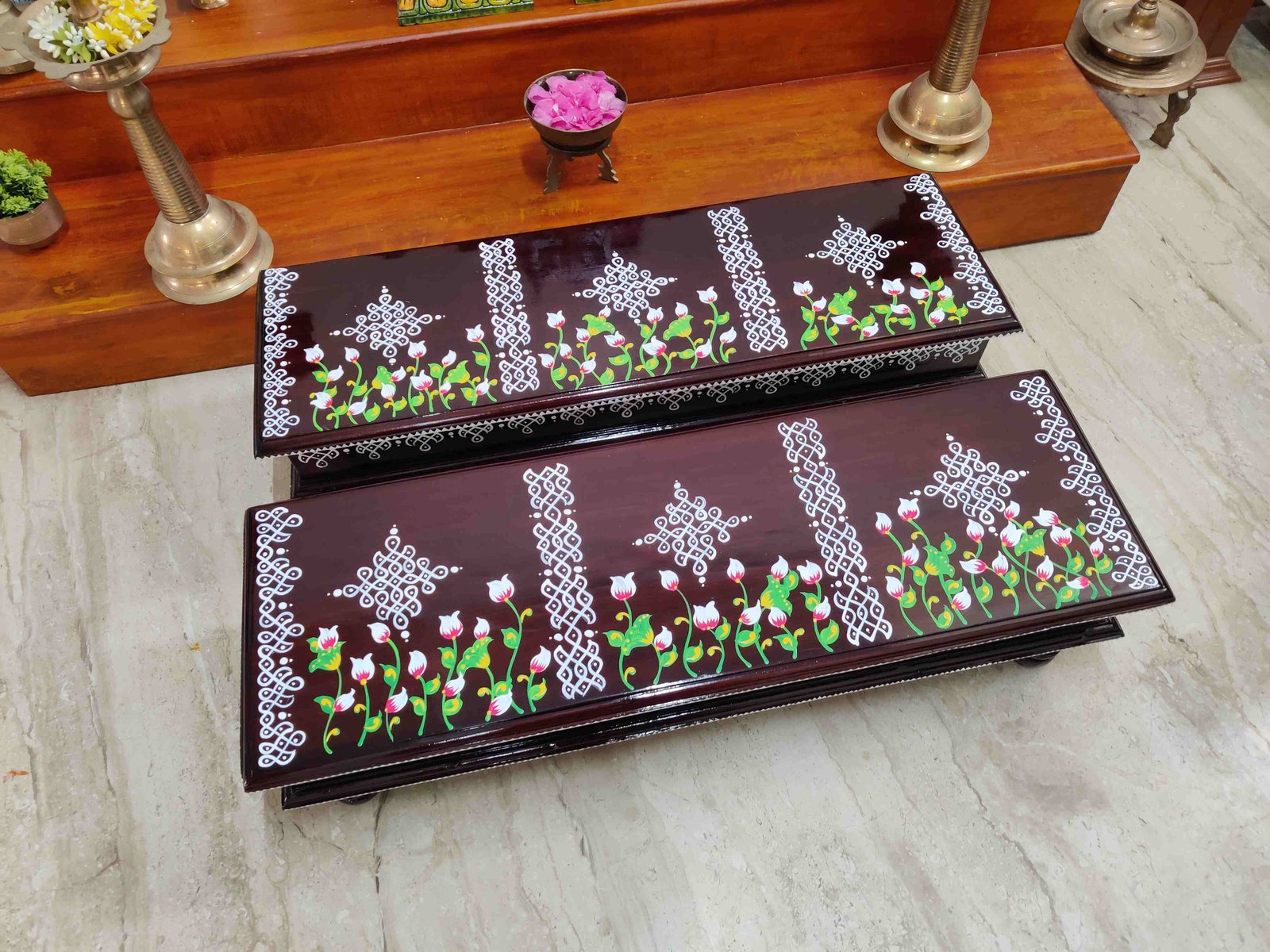 This is a traditional wooden stool or manai where an adult can be seated for any Pooja or function. It can also be used as a traditional décor, display of heavy statues and other display purposes. Can be done in wood finish only. Paintings can be customized.