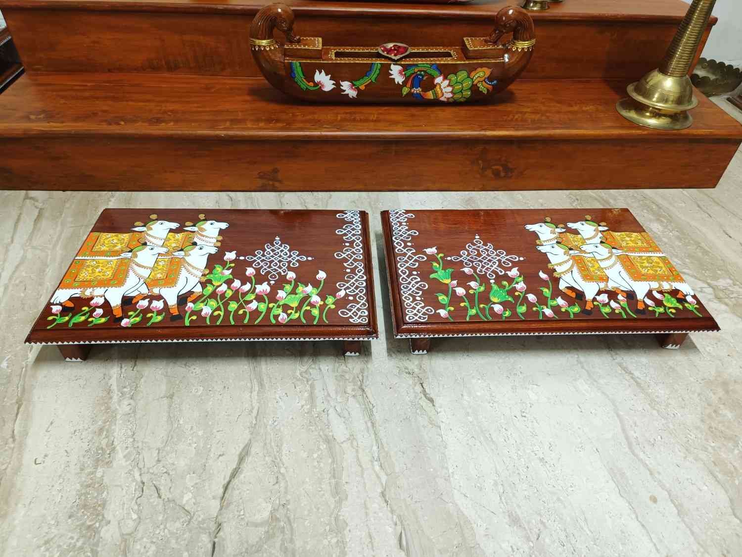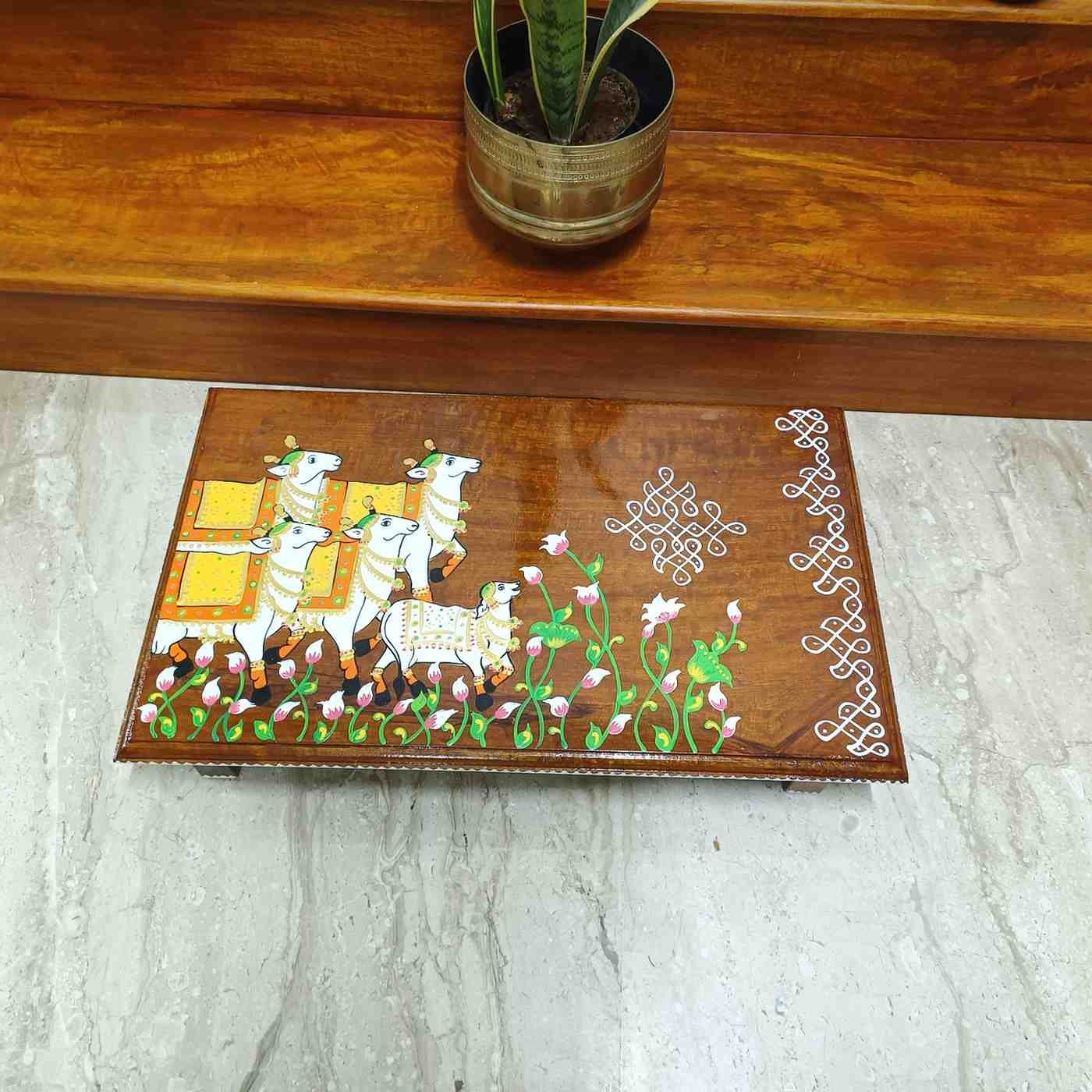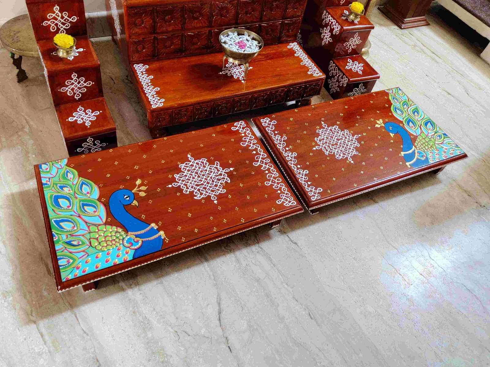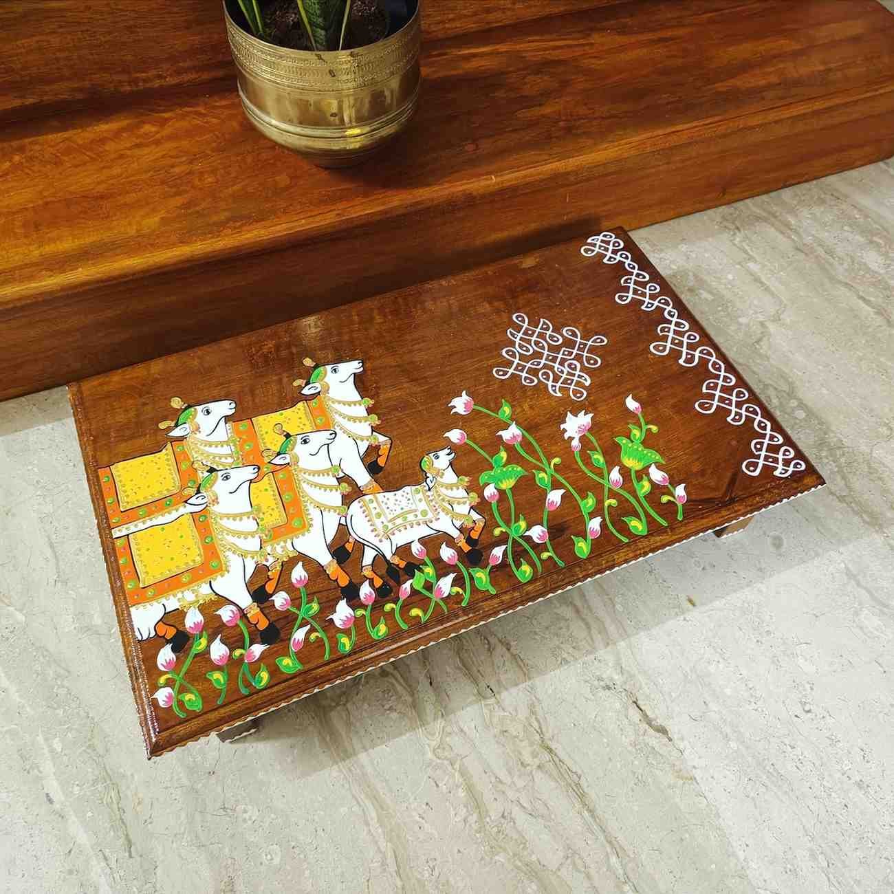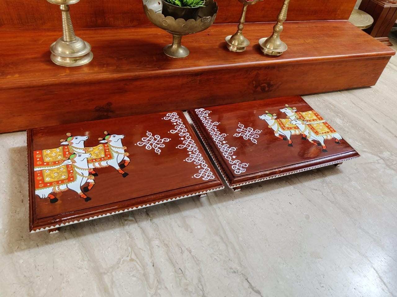 This is a traditional wooden stool or manai where an adult can be seated for any Pooja or function. It can also be used as a traditional décor, display of heavy statues and other storage purposes. Can be done in wood finish only. Paintings can be customised.