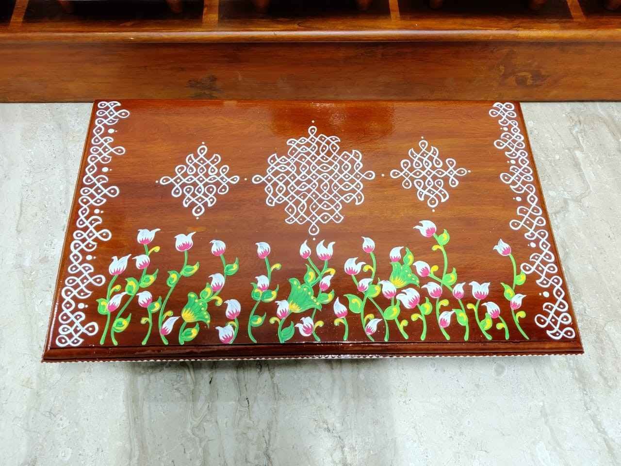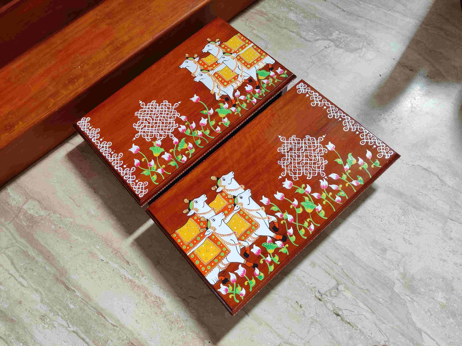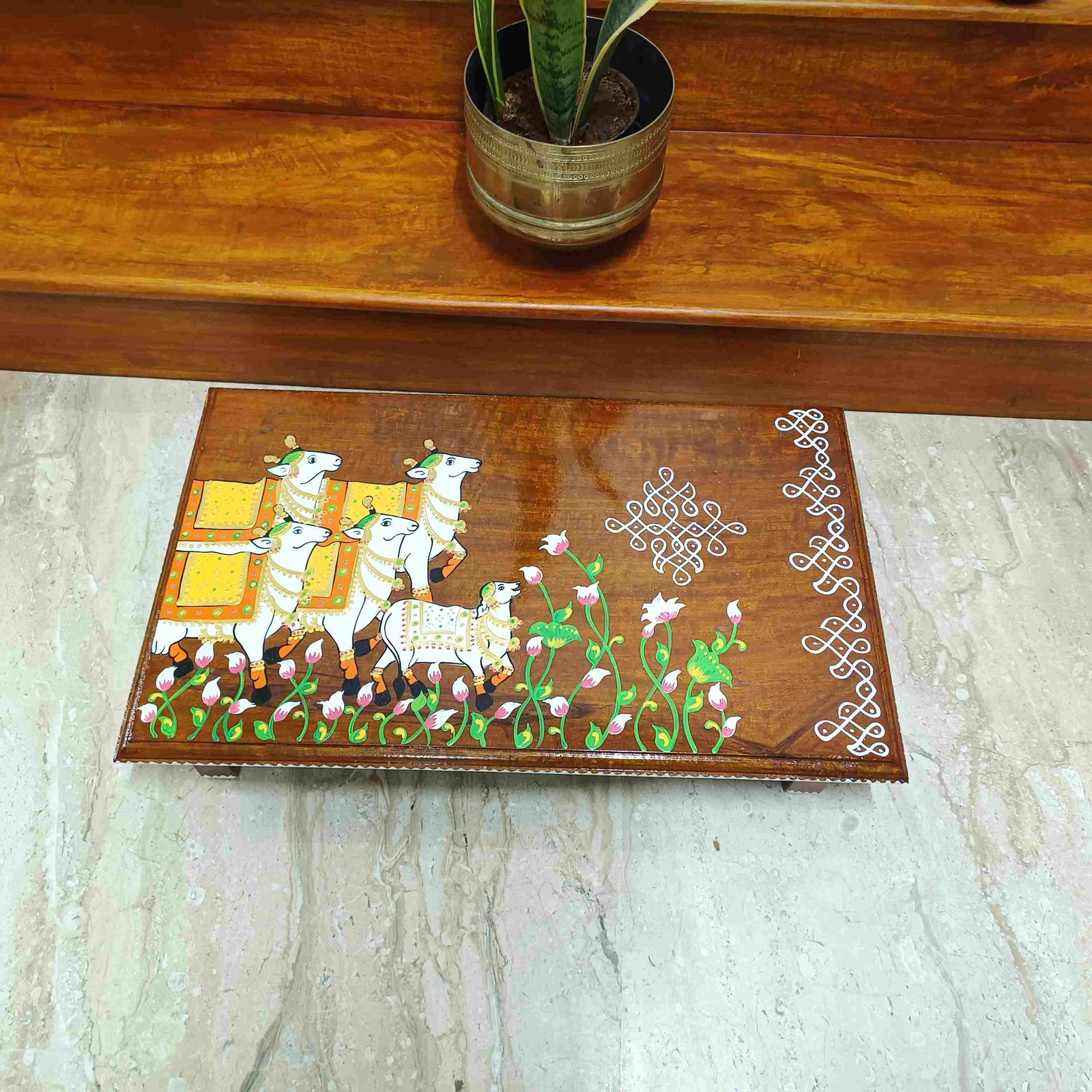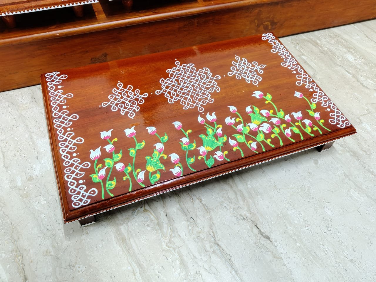 This is a traditional wooden stool or manai where an adult can be seated for any Pooja or function. It can also be used as a traditional décor, display of heavy statues and other storage purposes. Can be done in wood finish only. Paintings can be customised.