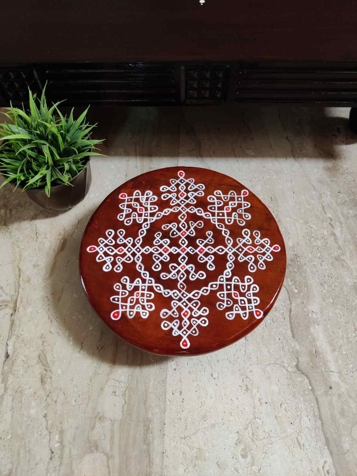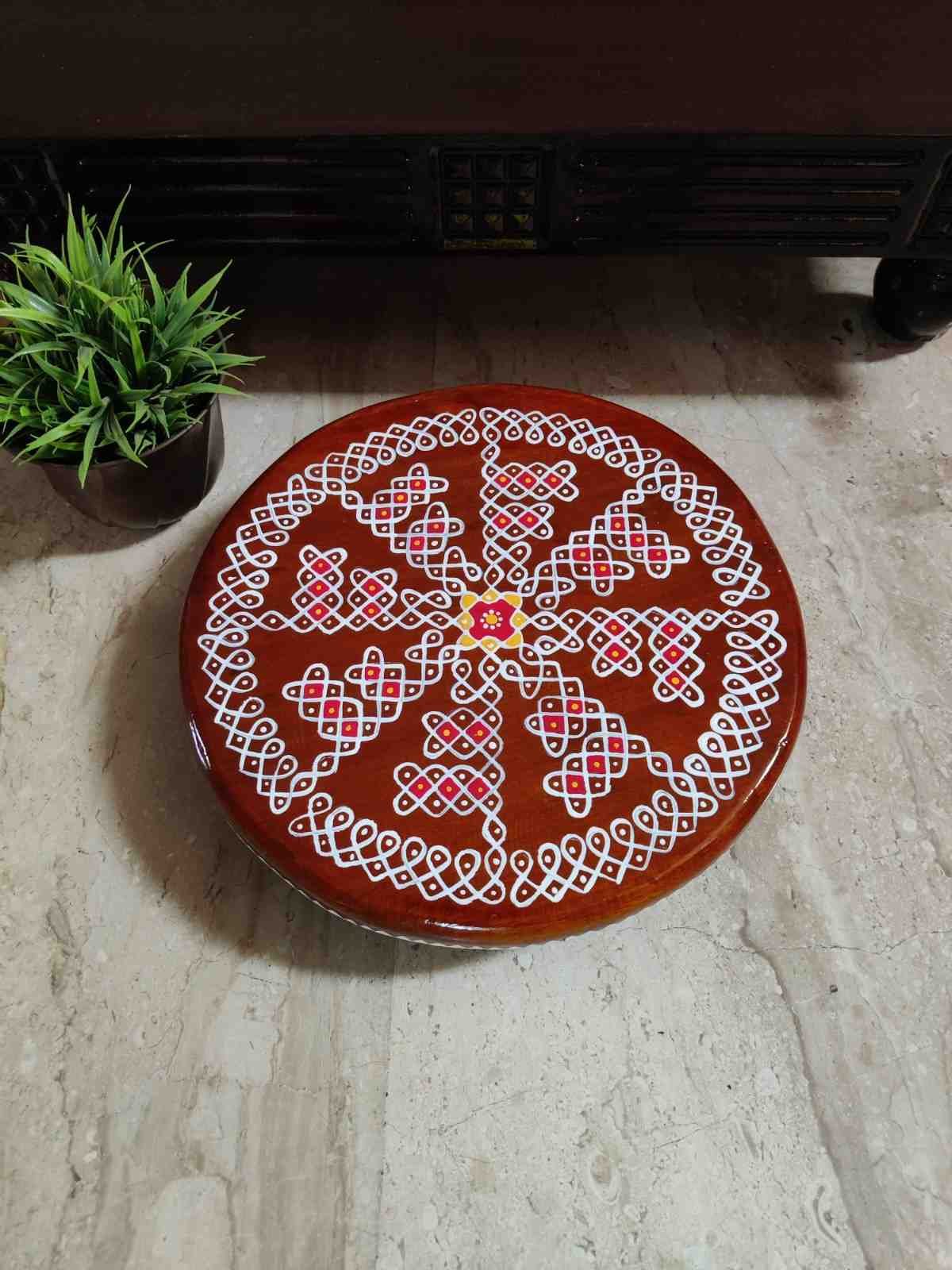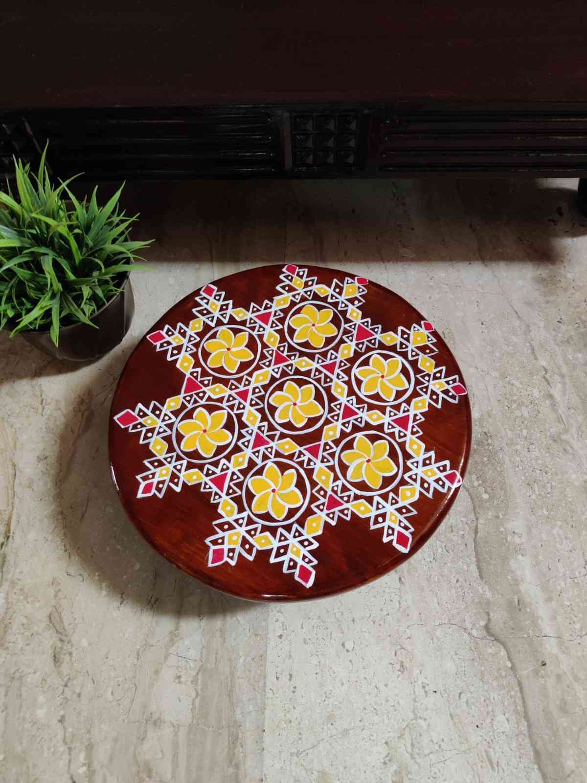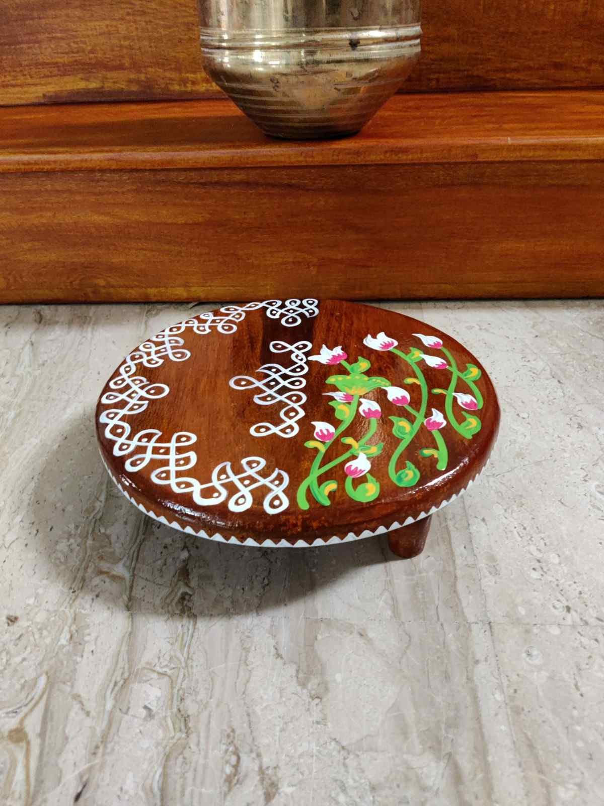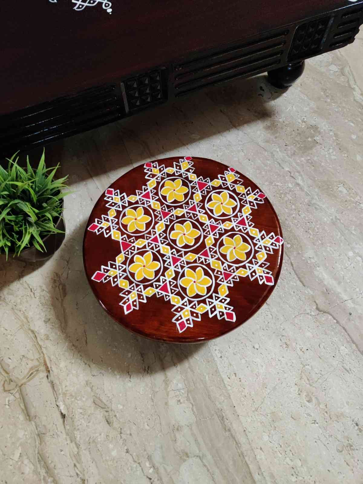 This is a solid round floor level stool.Can be used for placing small idols, diyas, small planters and decor pieces as itself .Can be done in both wood finish and painted ones. Only kolam or generic paintings can be done.