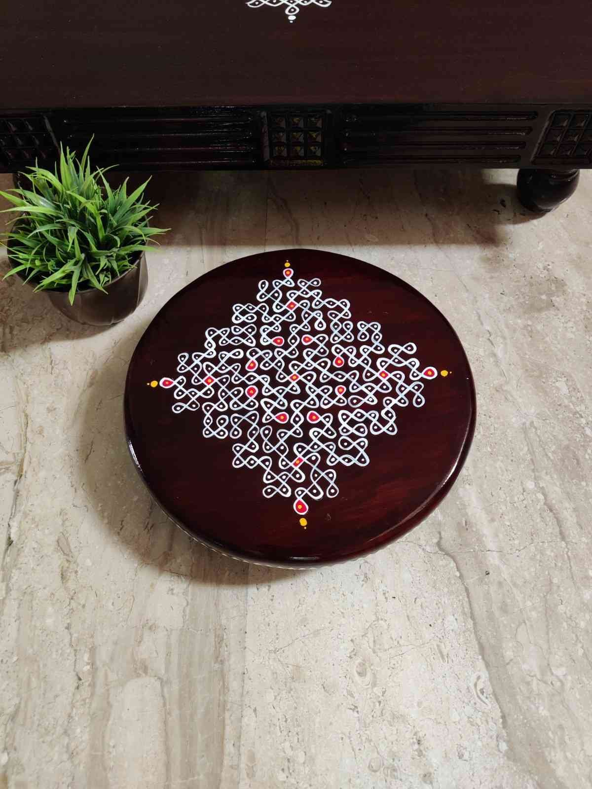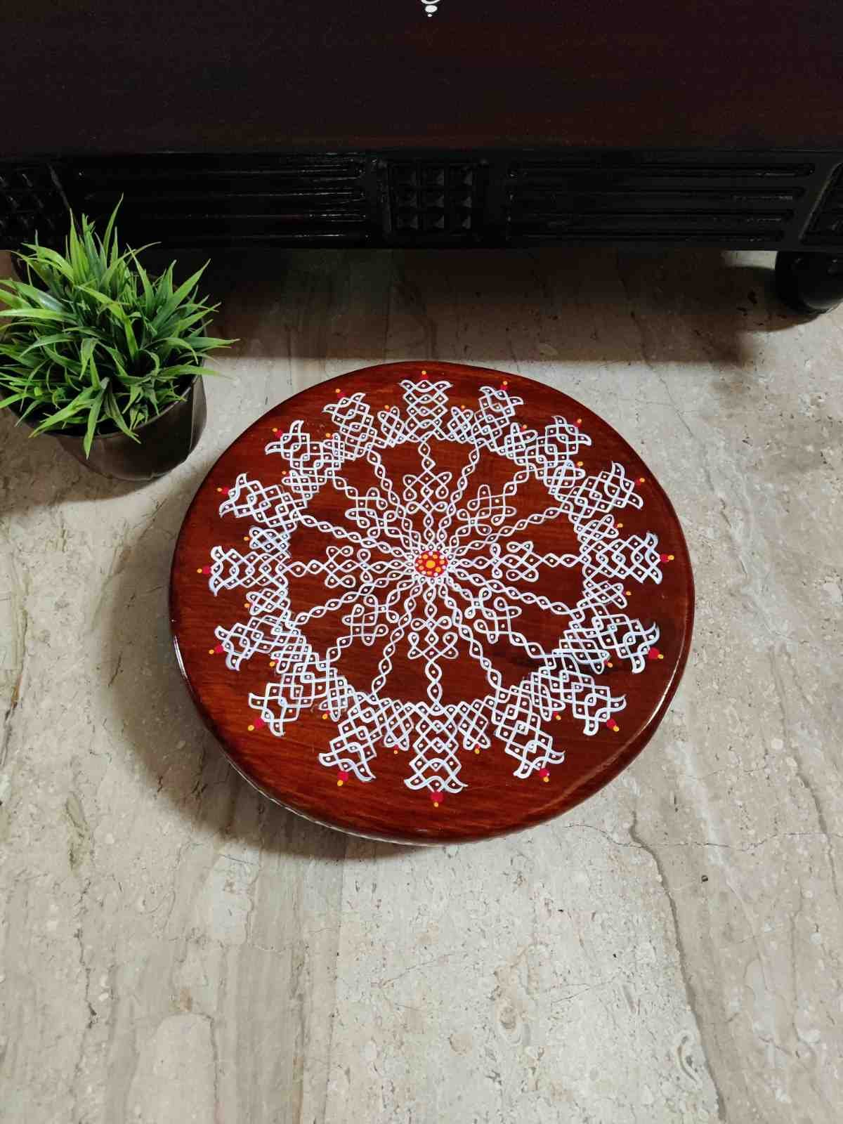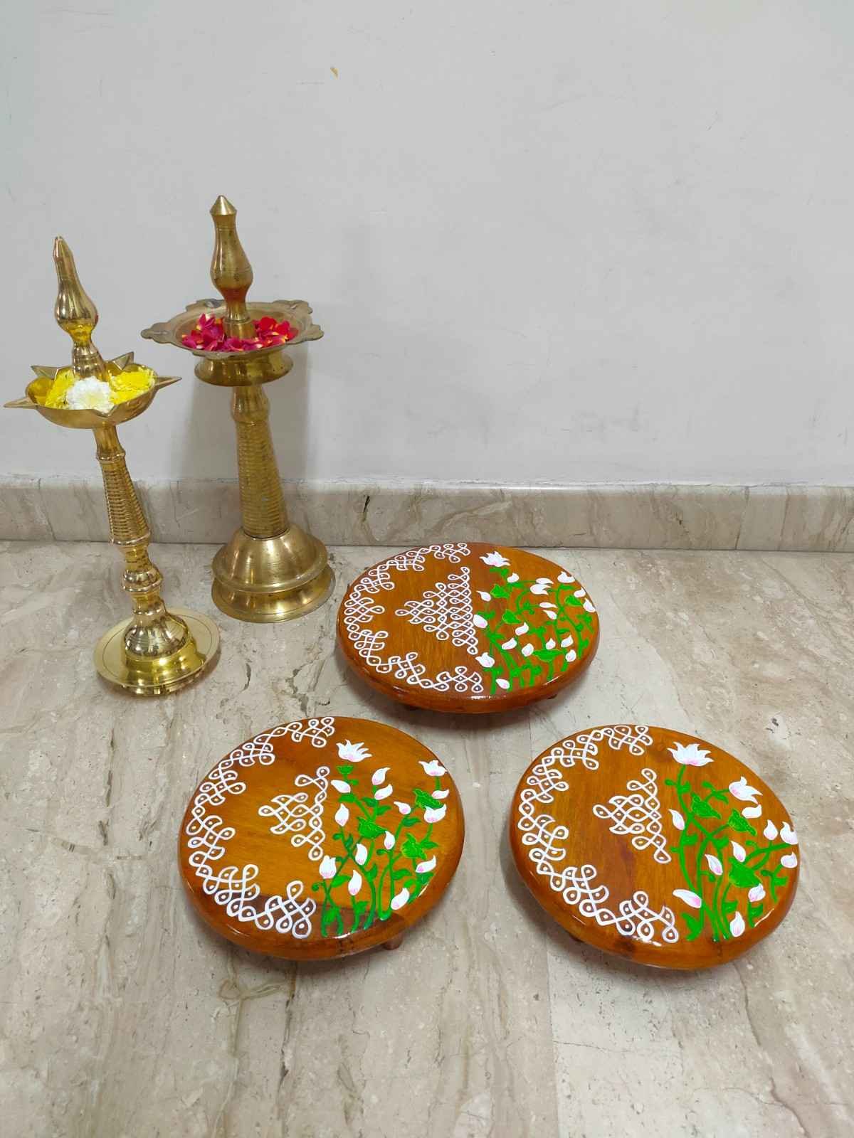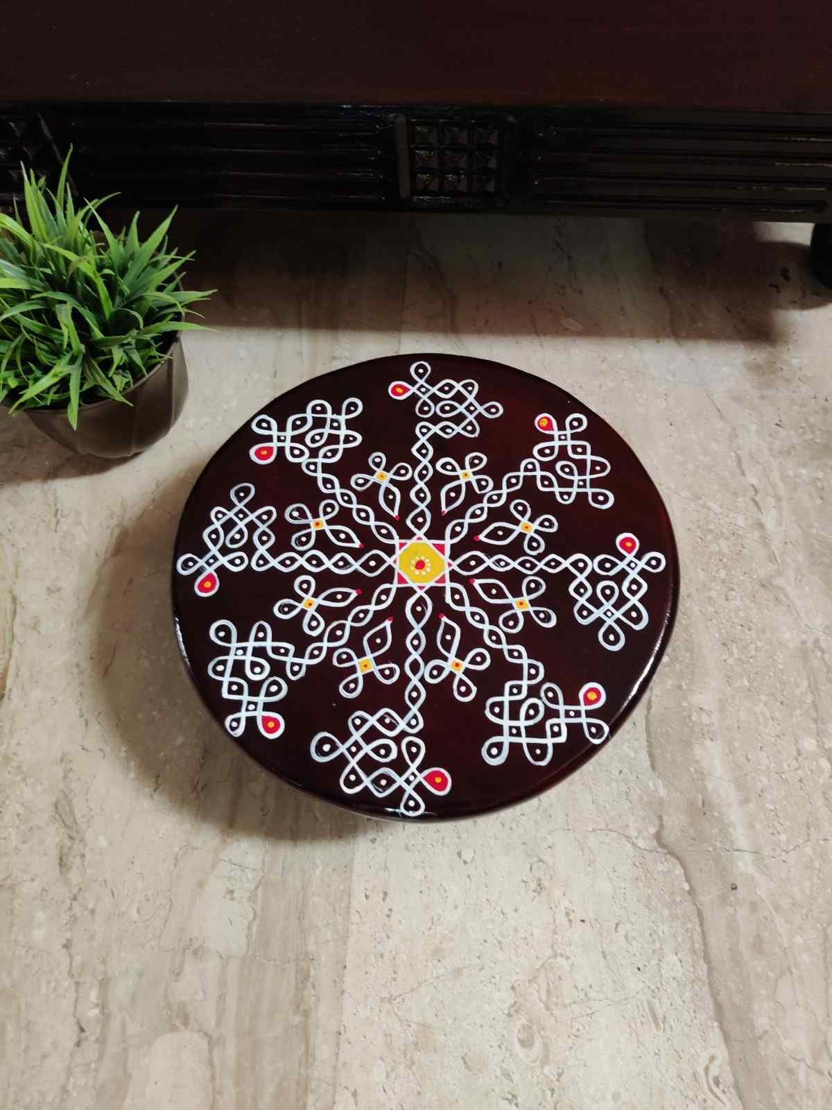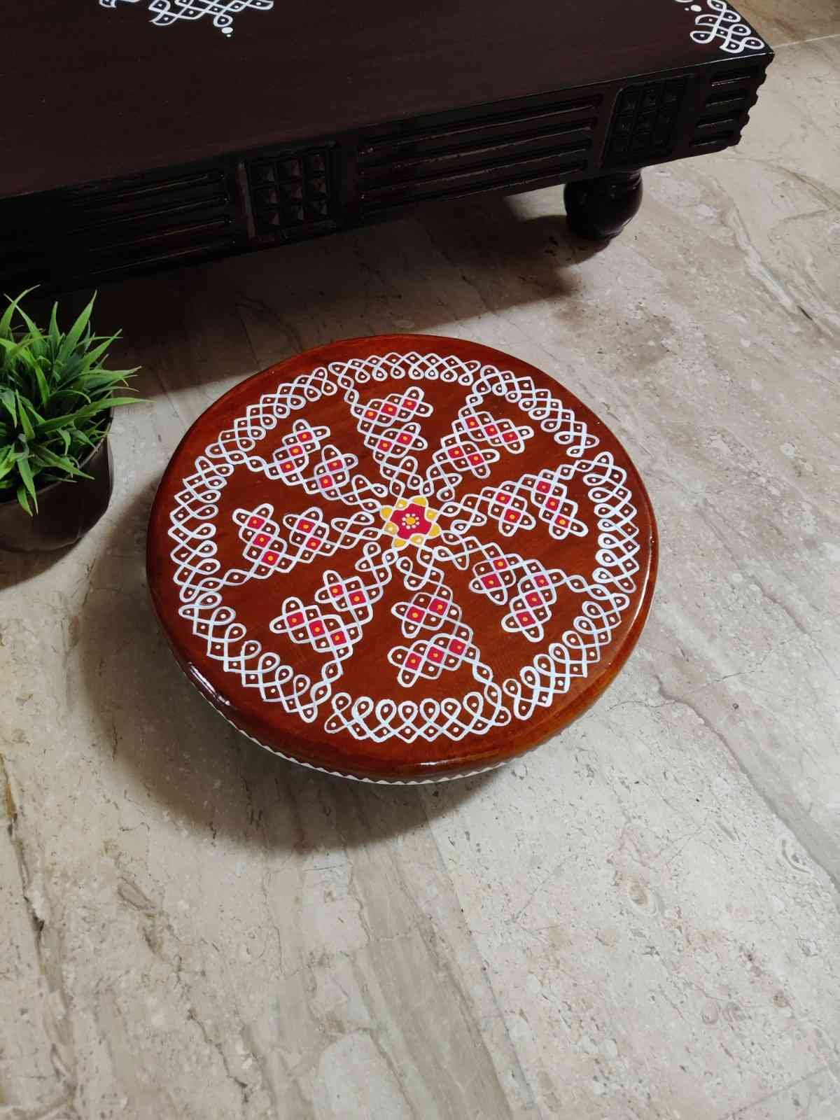 This is a solid round floor level stool.Can be used for placing small idols, diyas, small planters and decor pieces as itself .Can be done in both wood finish and painted ones. Only kolam or generic paintings can be done.