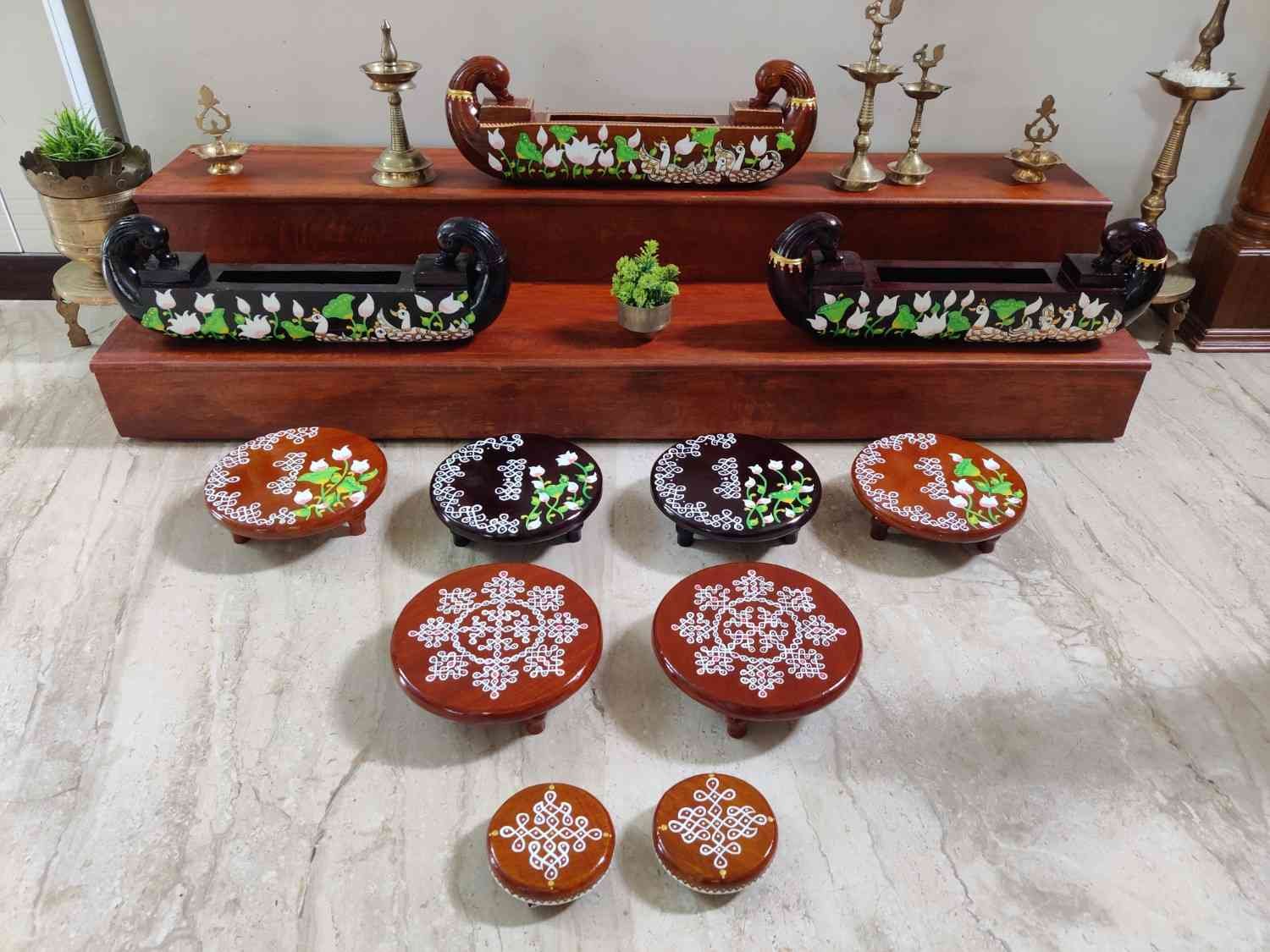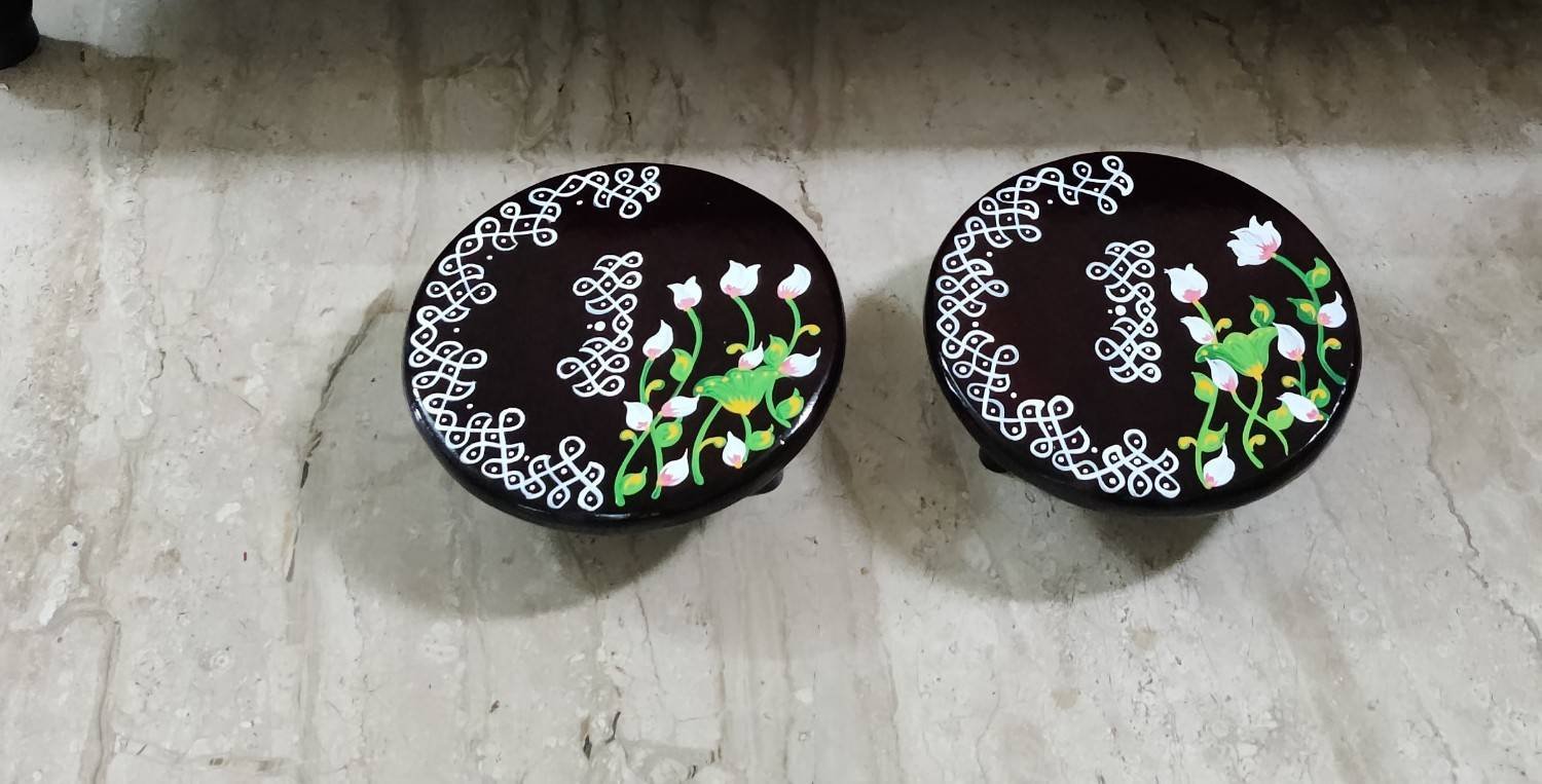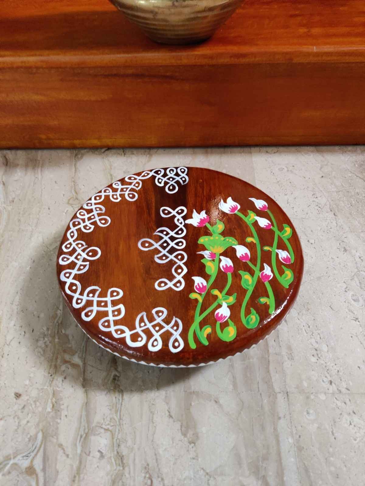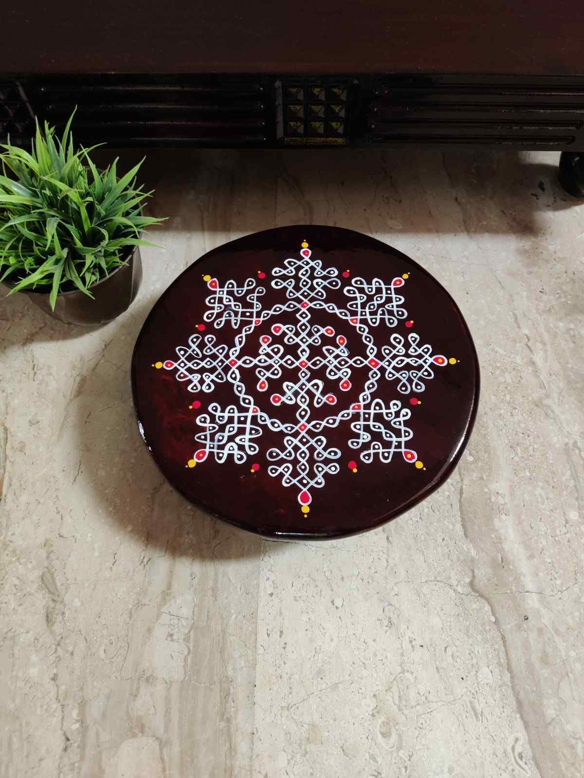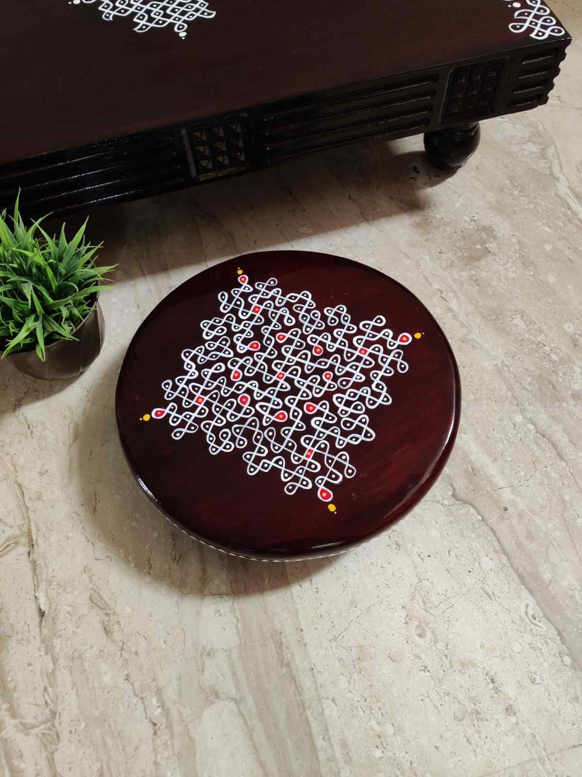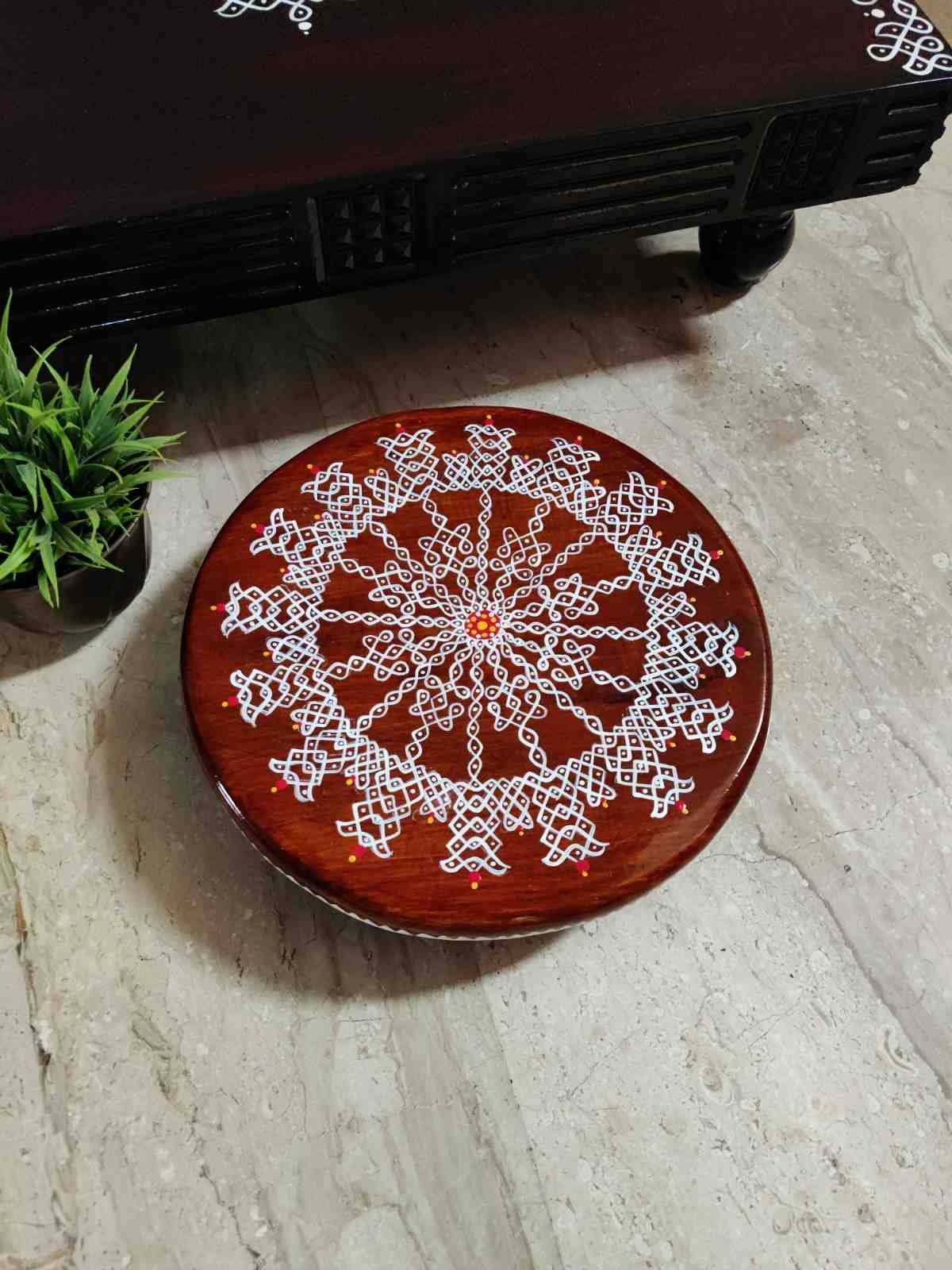 This is a solid round floor level stool.Can be used for placing small idols, diyas, small planters and decor pieces as itself .Can be done in both wood finish and painted ones. Only kolam or generic paintings can be done.