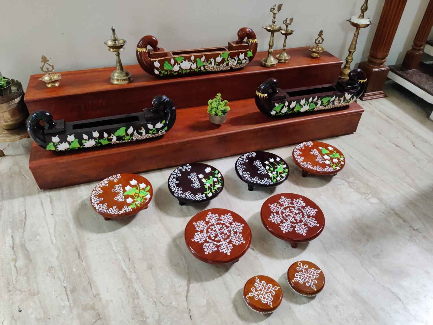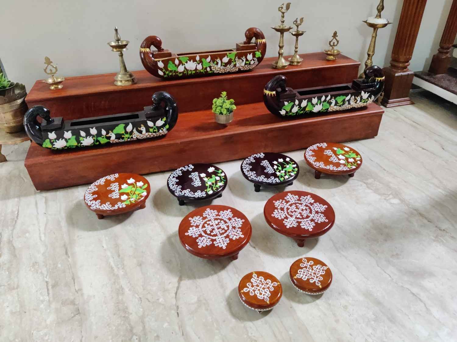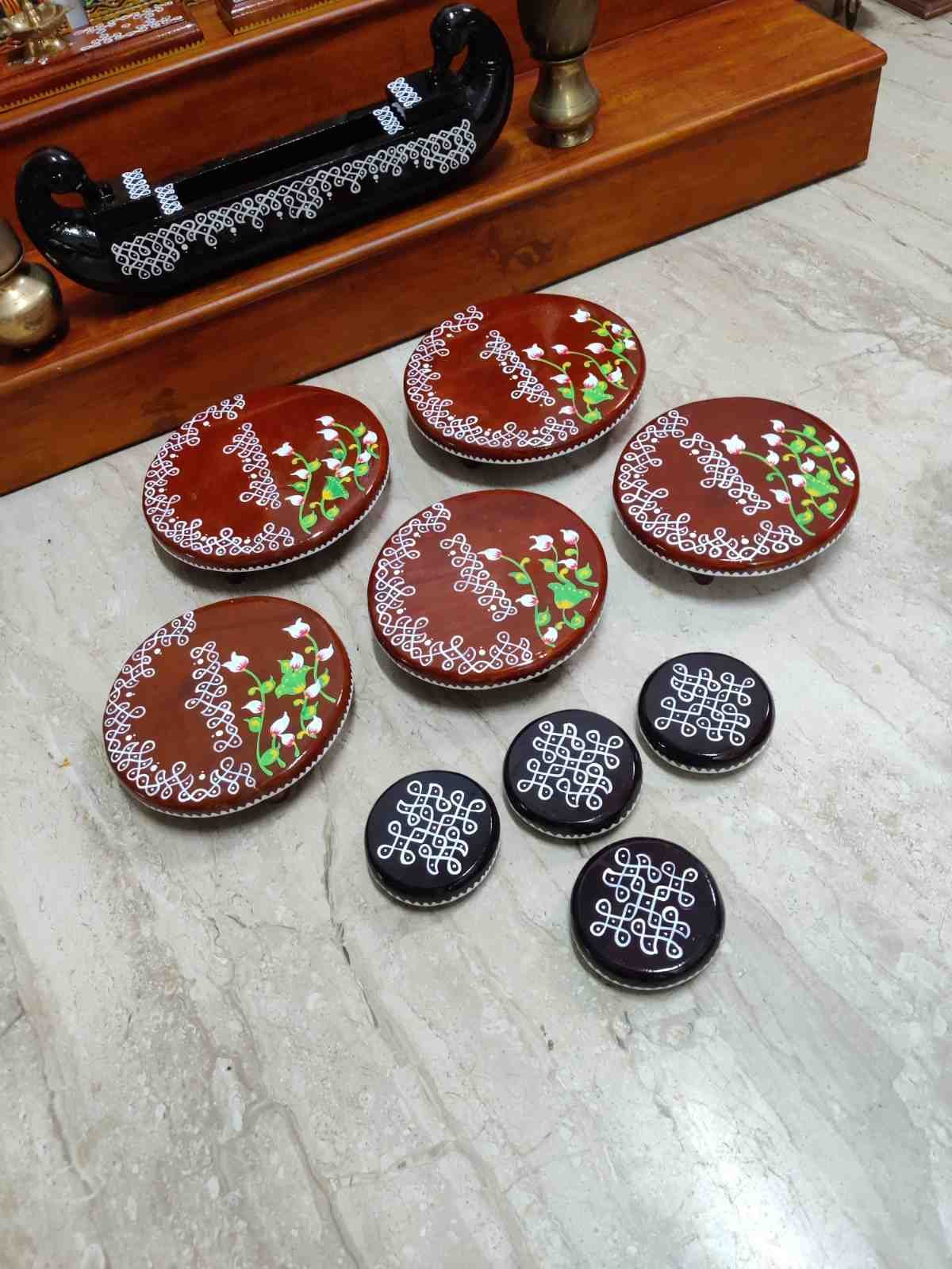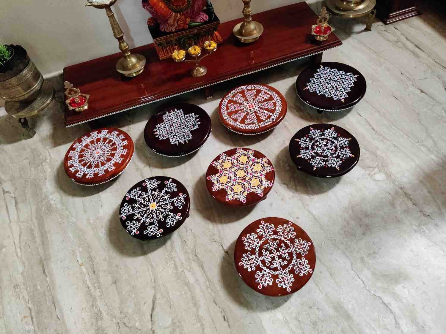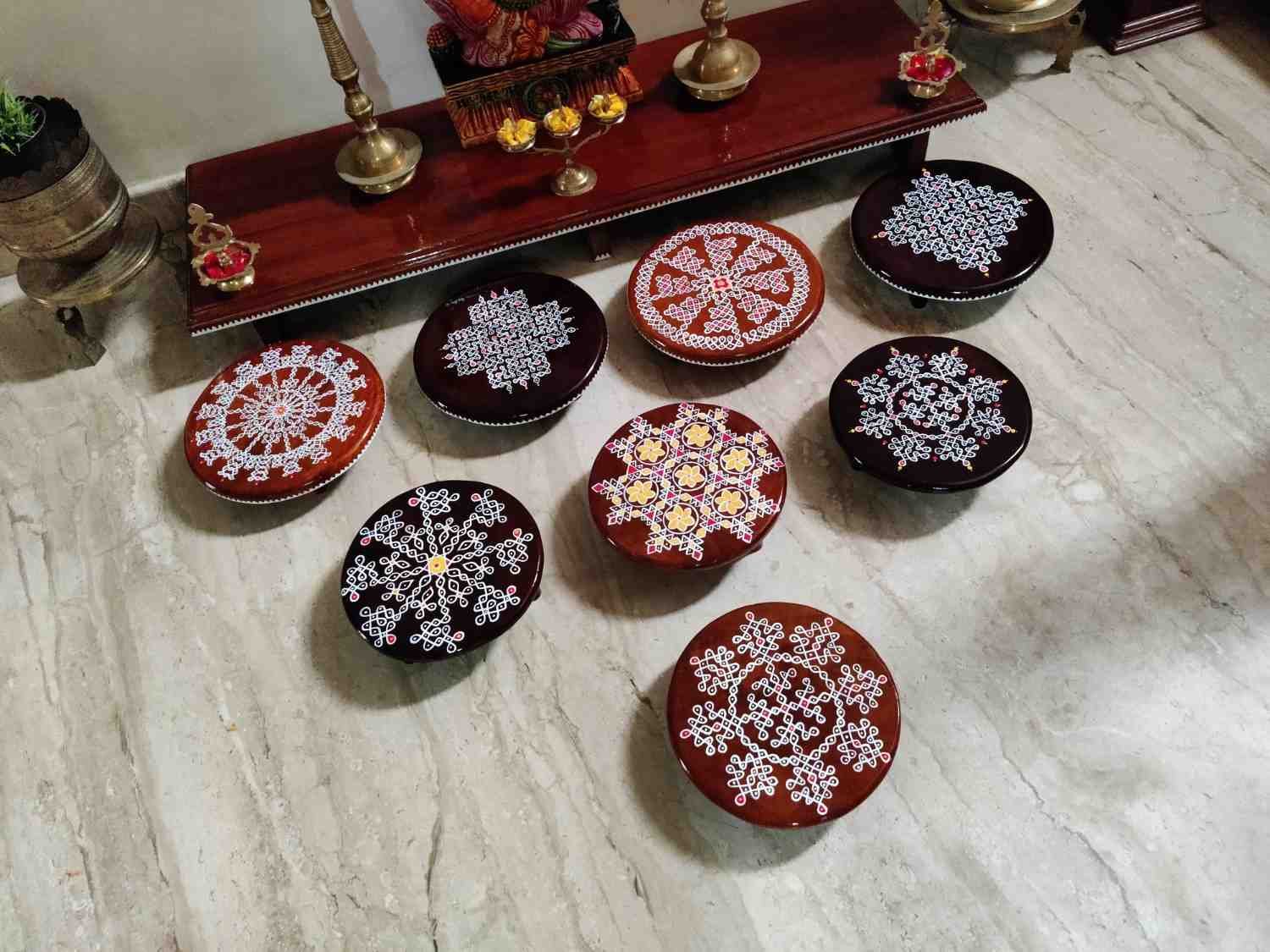 This is a solid round floor level stool.Can be used for placing small idols, diyas, small planters and decor pieces as itself .Can be done in both wood finish and painted ones. Only kolam or generic paintings can be done.