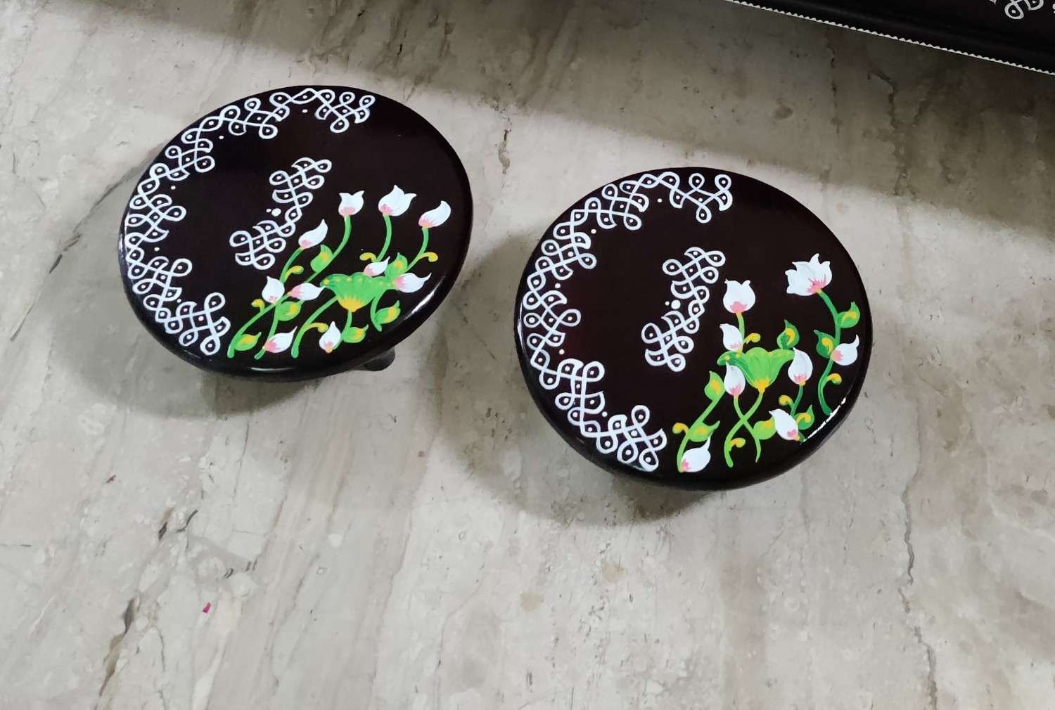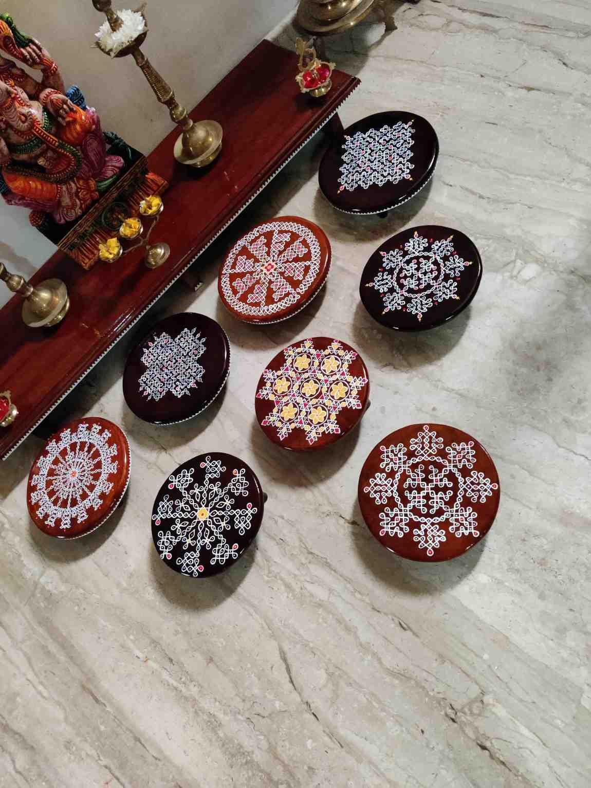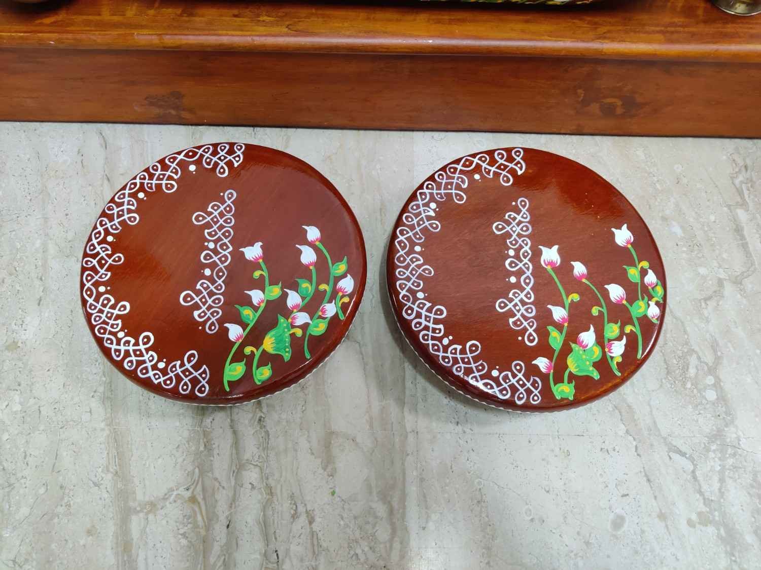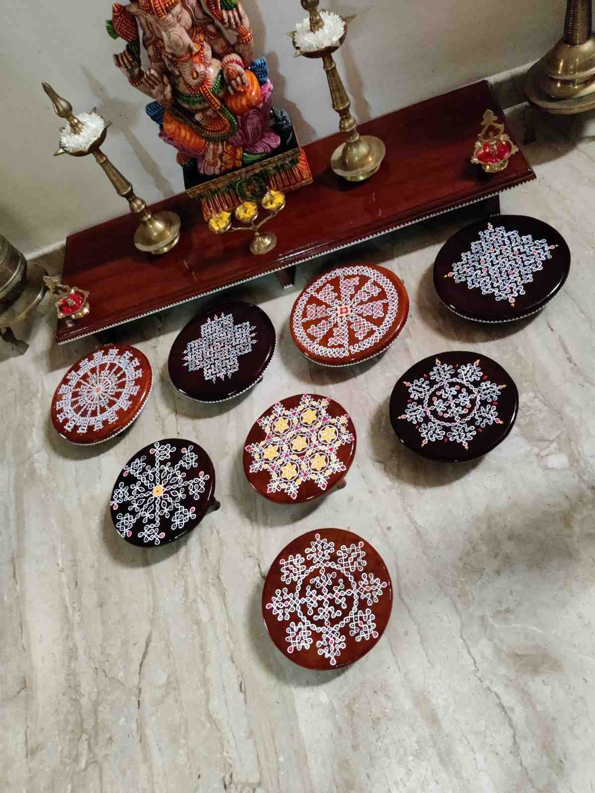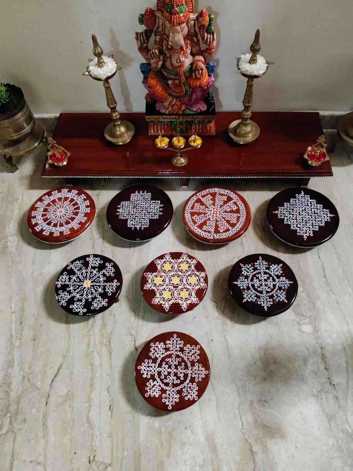 This is a solid round floor level stool.Can be used for placing small idols, diyas, small planters and decor pieces as itself .Can be done in both wood finish and painted ones. Only kolam or generic paintings can be done.