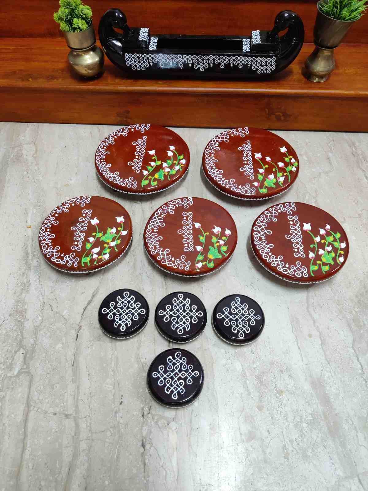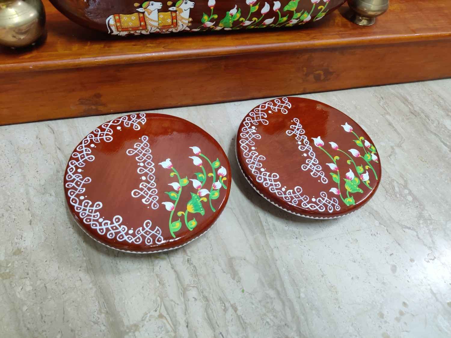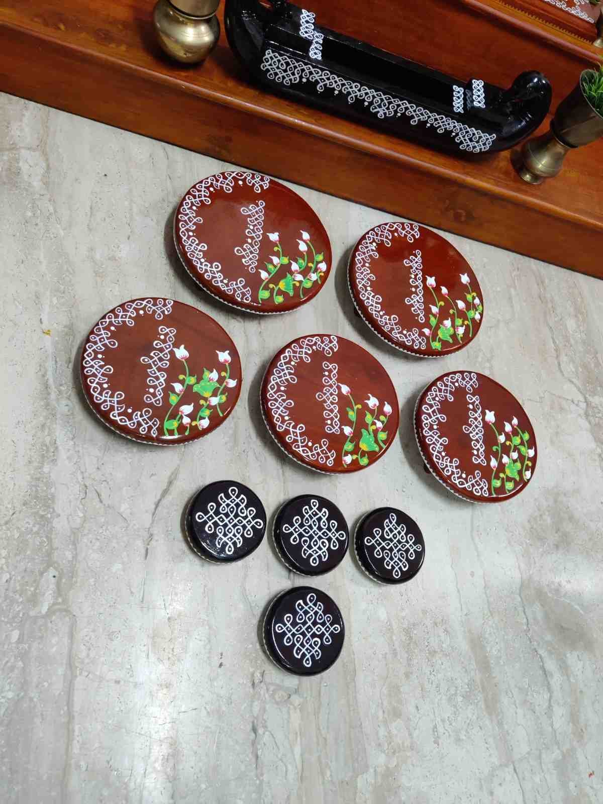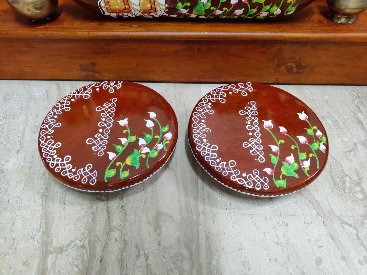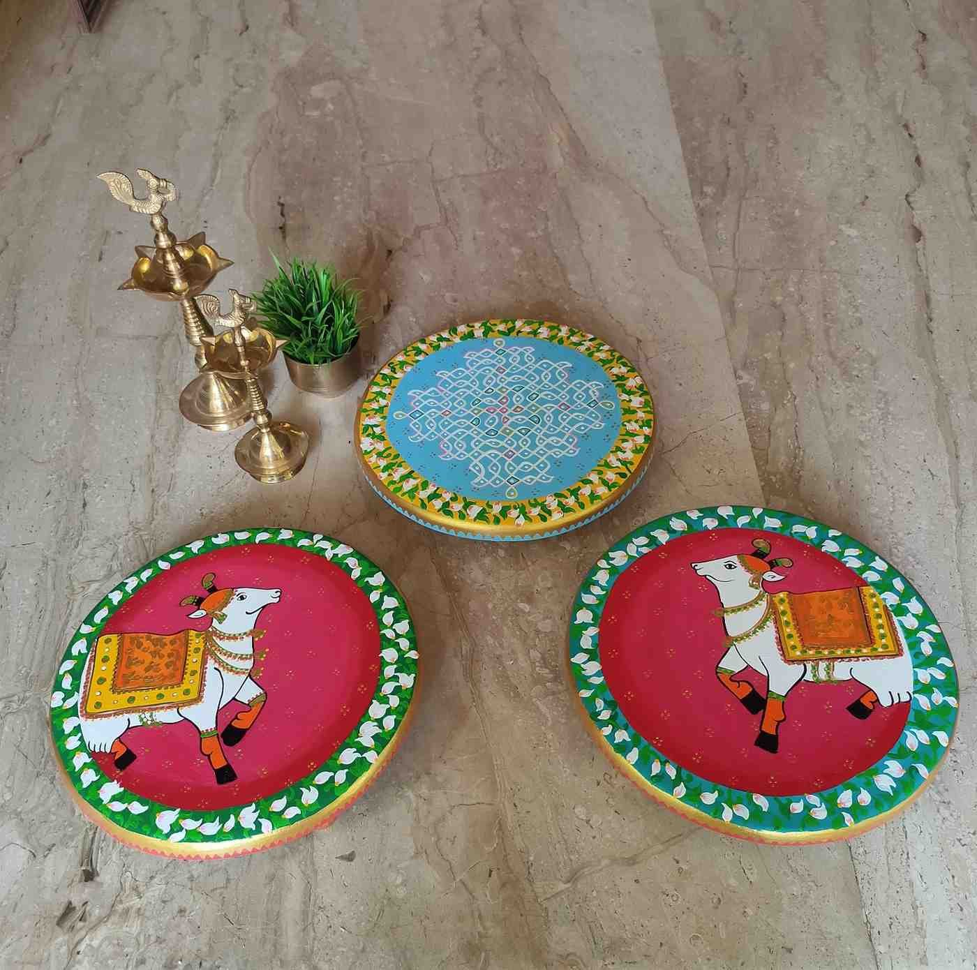 This is a solid round floor level stool.Can be used for placing small idols, diyas, small planters and decor pieces as itself .Can be done in both wood finish and painted ones. Only kolam or generic paintings can be done.