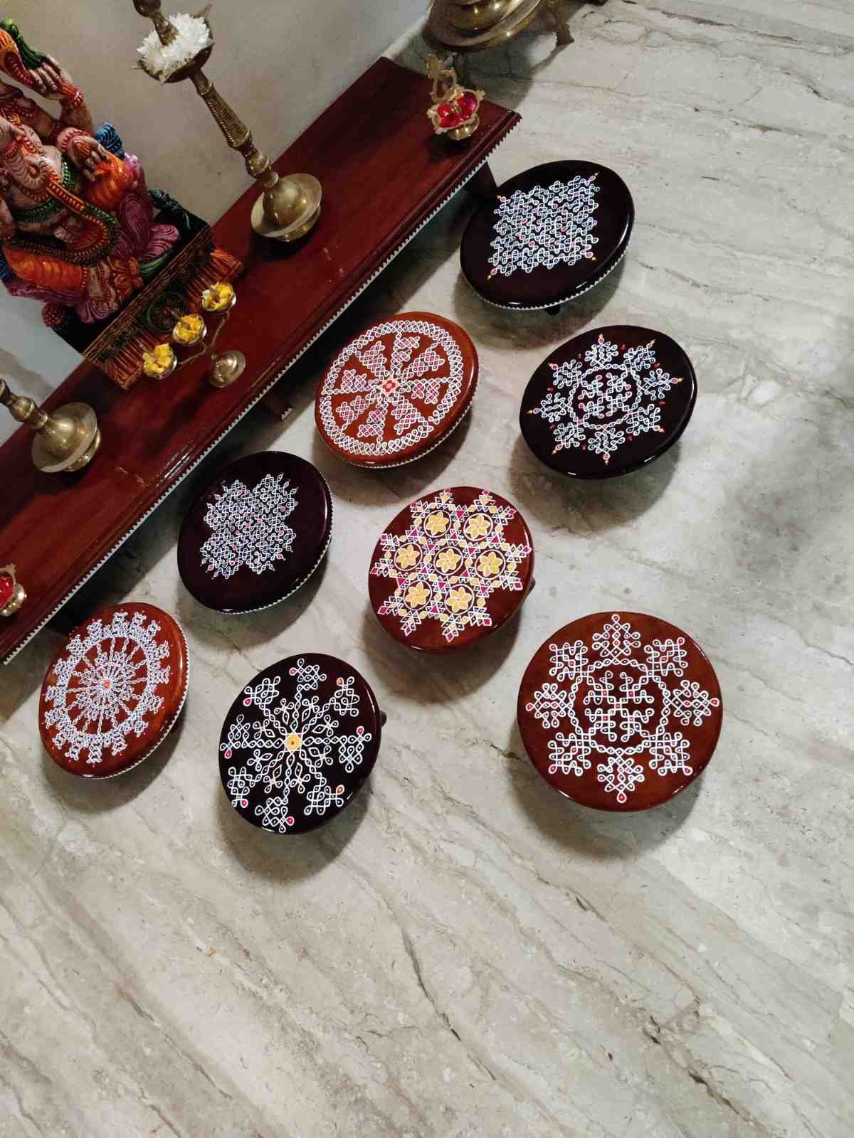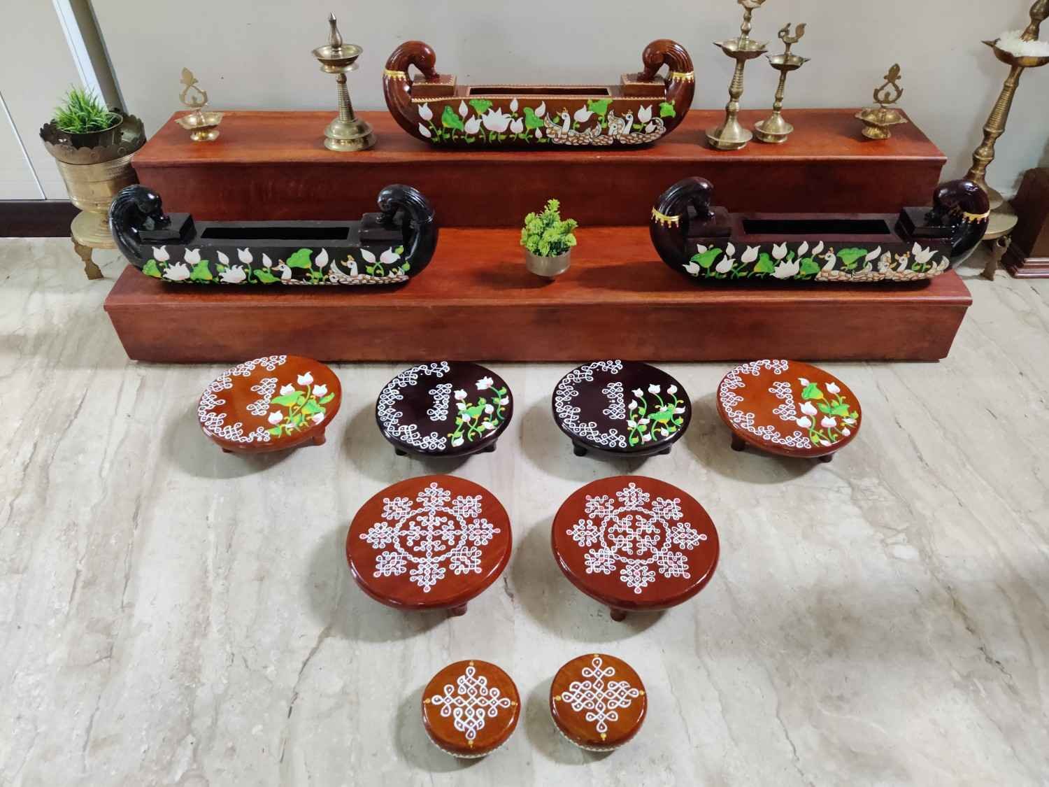 This is a solid round floor level stool.Can be used for placing small idols, diyas, small planters and decor pieces as itself .Can be done in both wood finish and painted ones. Only kolam or generic paintings can be done.