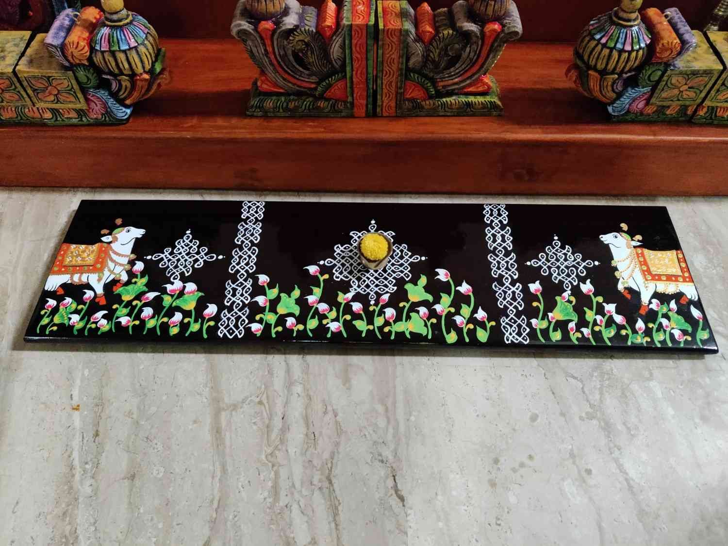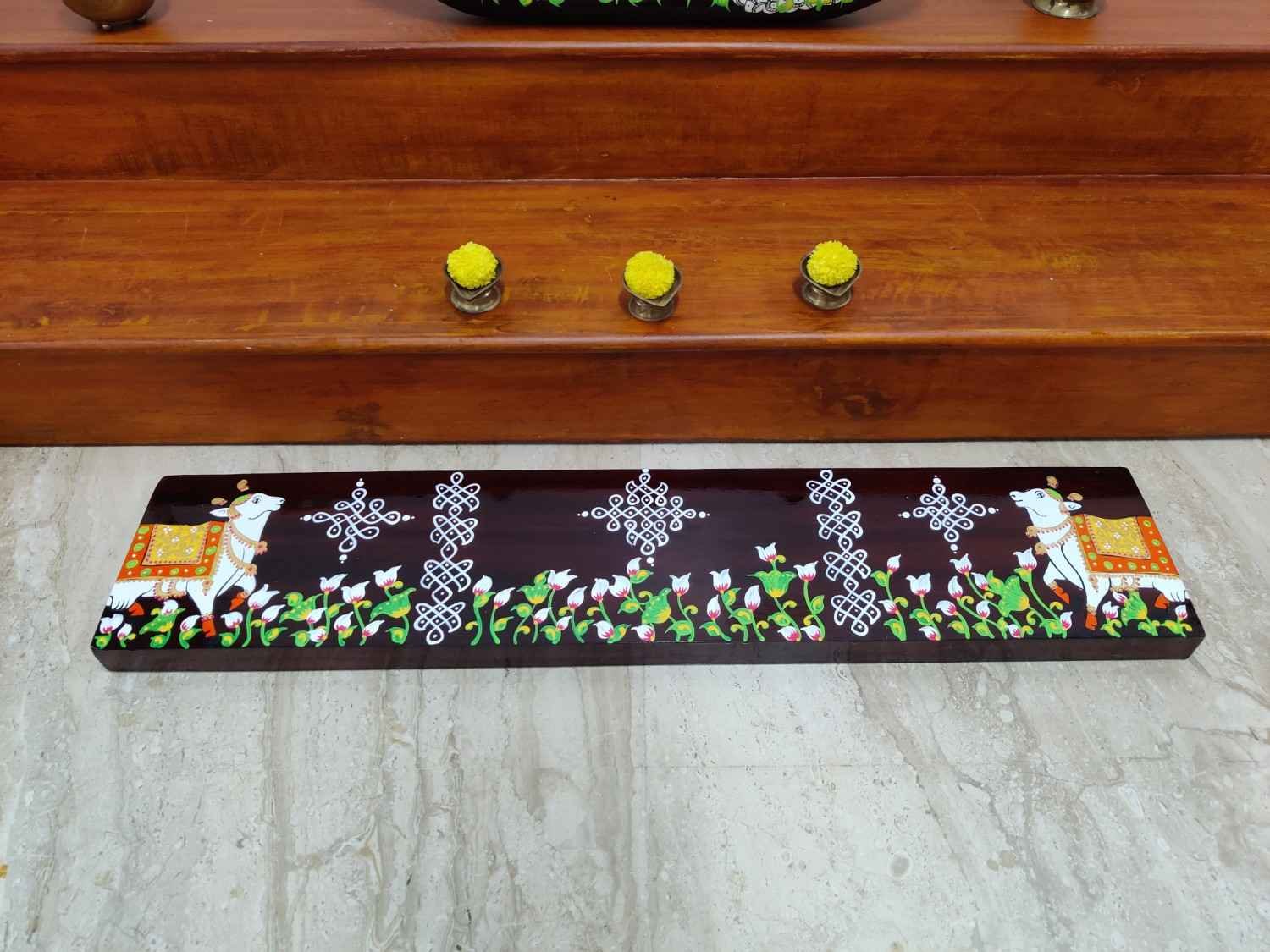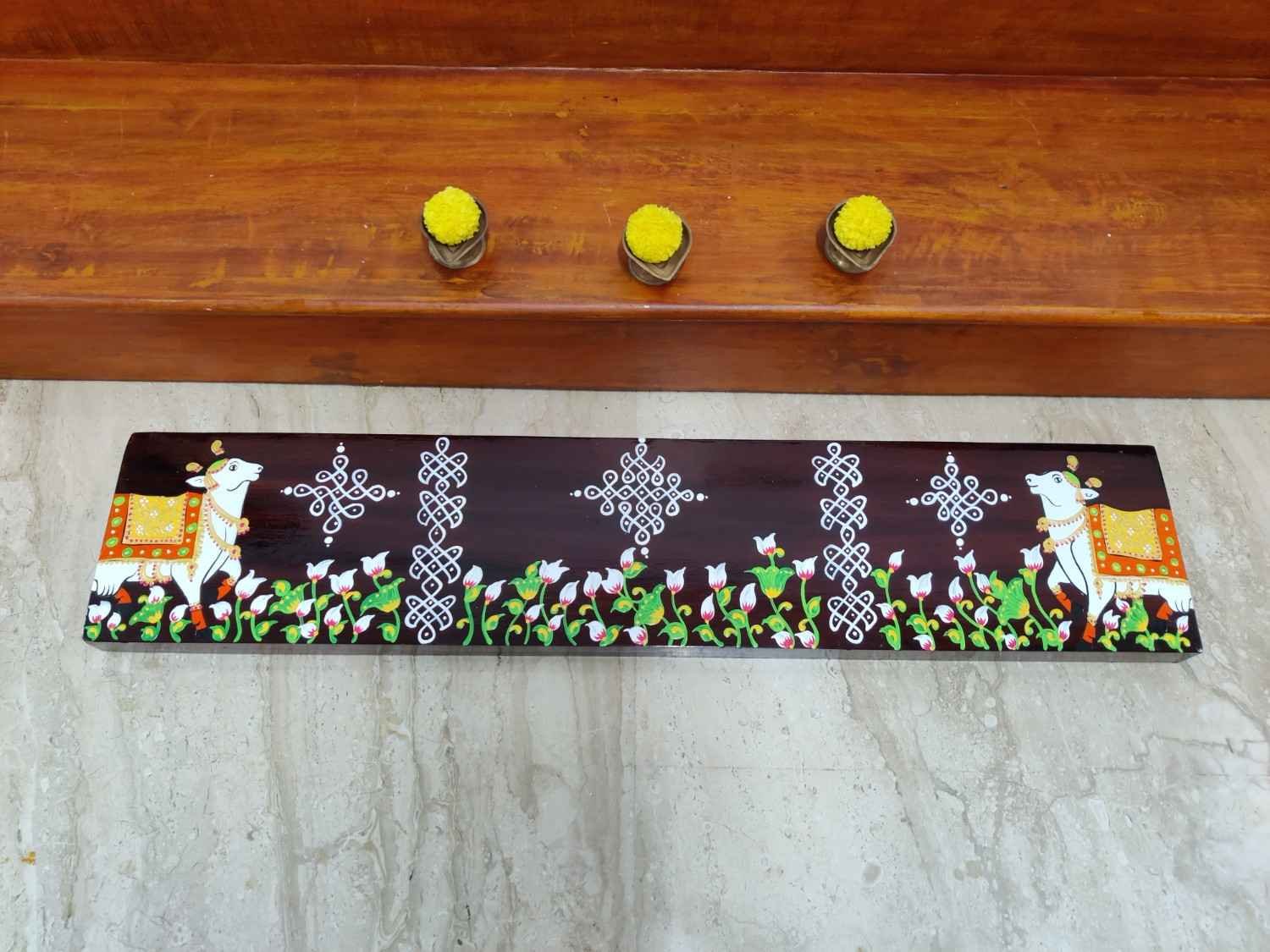 The rectangular floor level stool can be placed on any floors( pooja room shelves) to give a new look to your space. Can be done in wood finish only. Paintings can be customised.