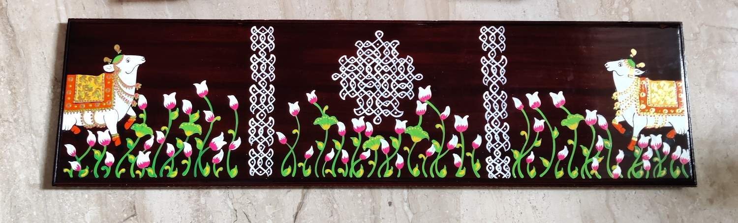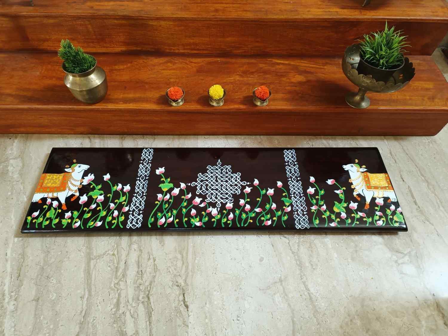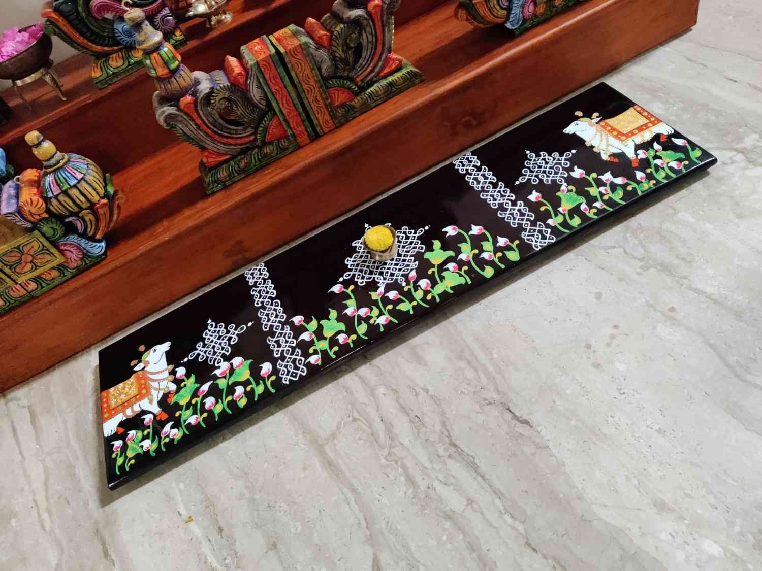 The rectangular floor level stool can be placed on any floors( pooja room shelves) to give a new look to your space. Can be done in wood finish only. Paintings can be customised.