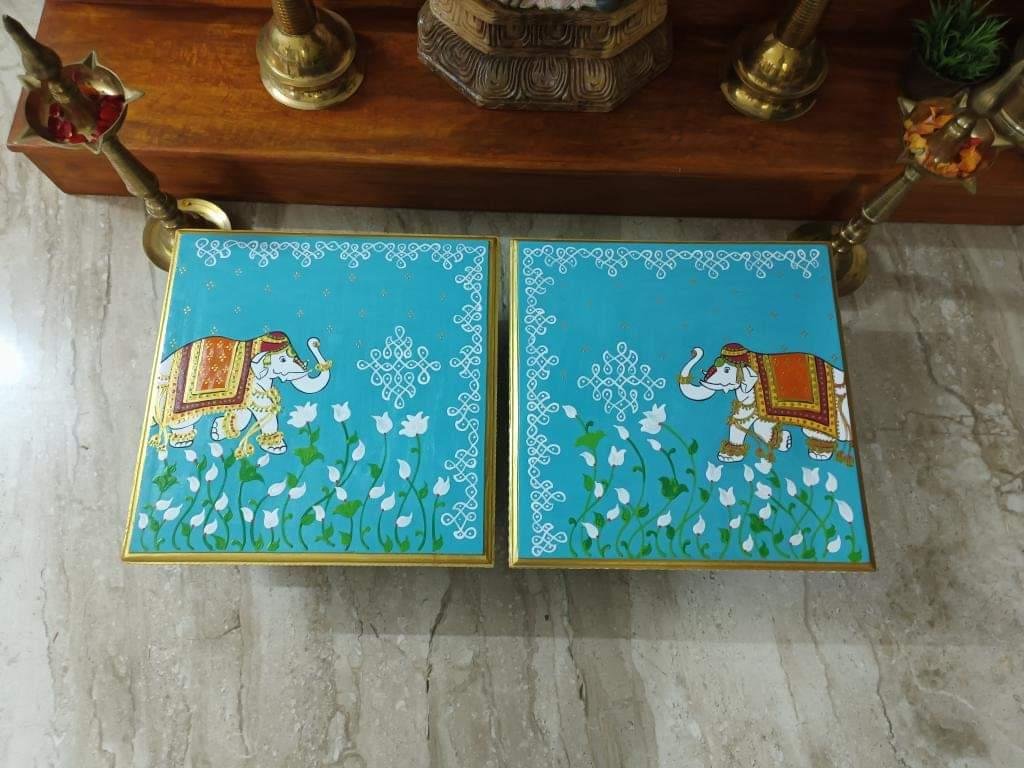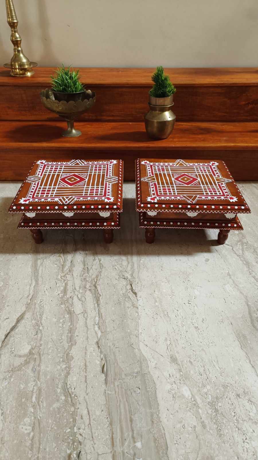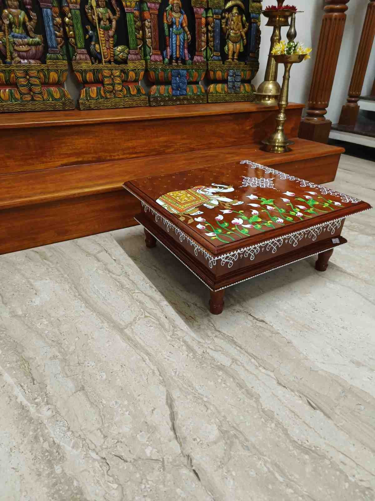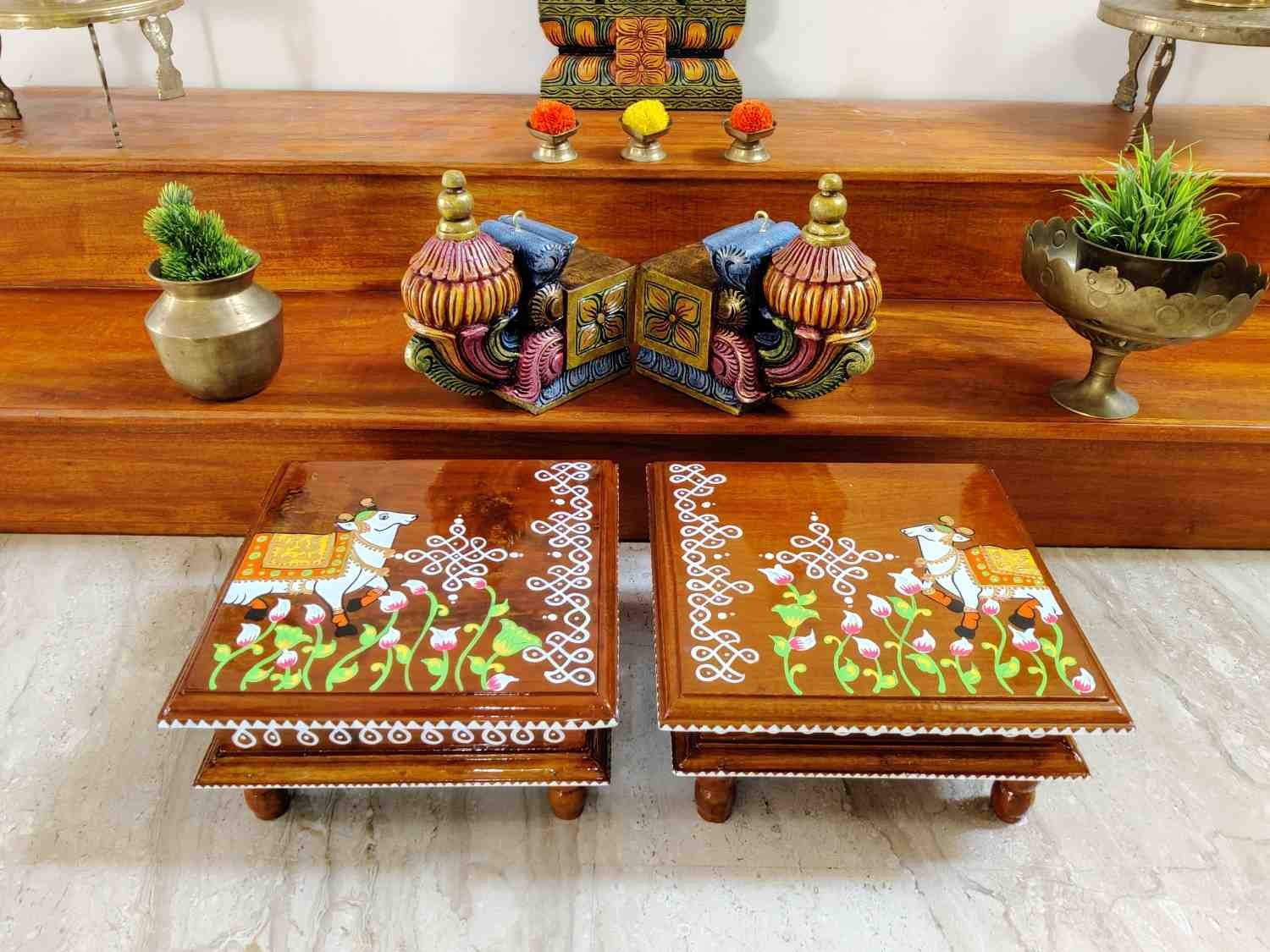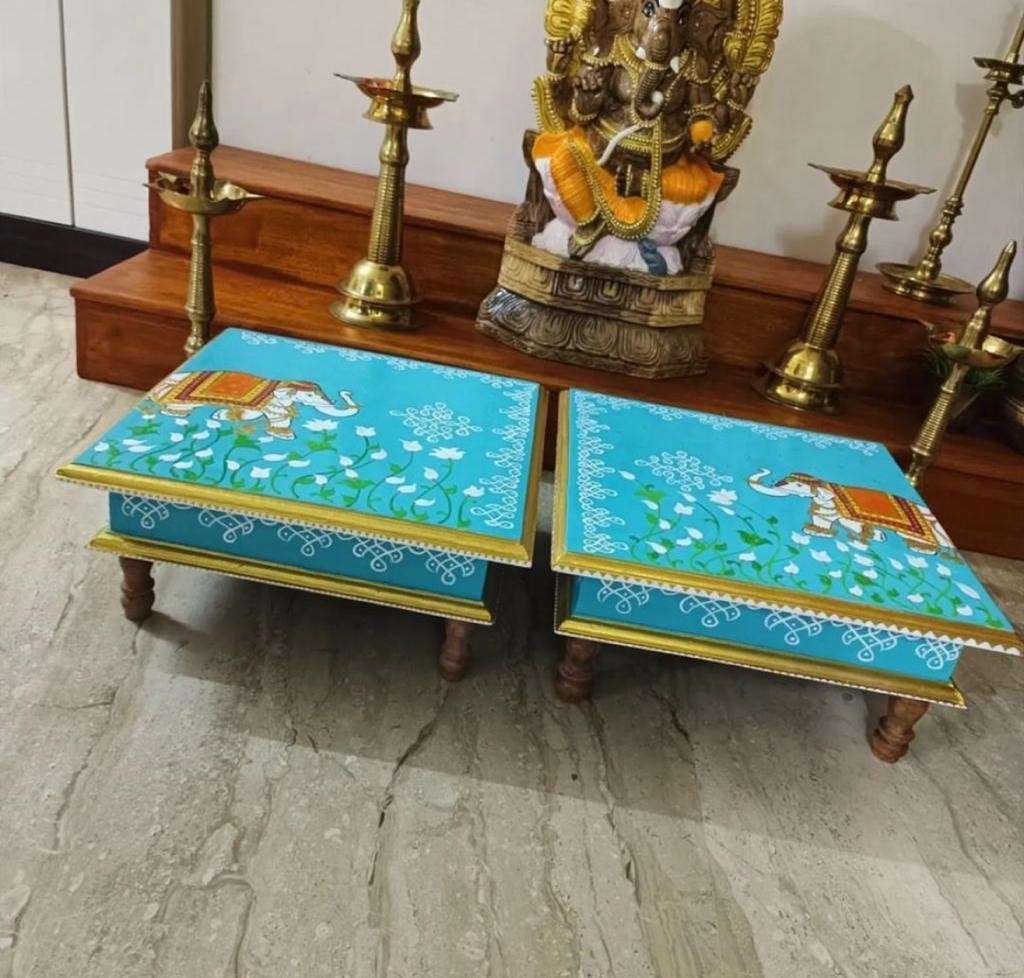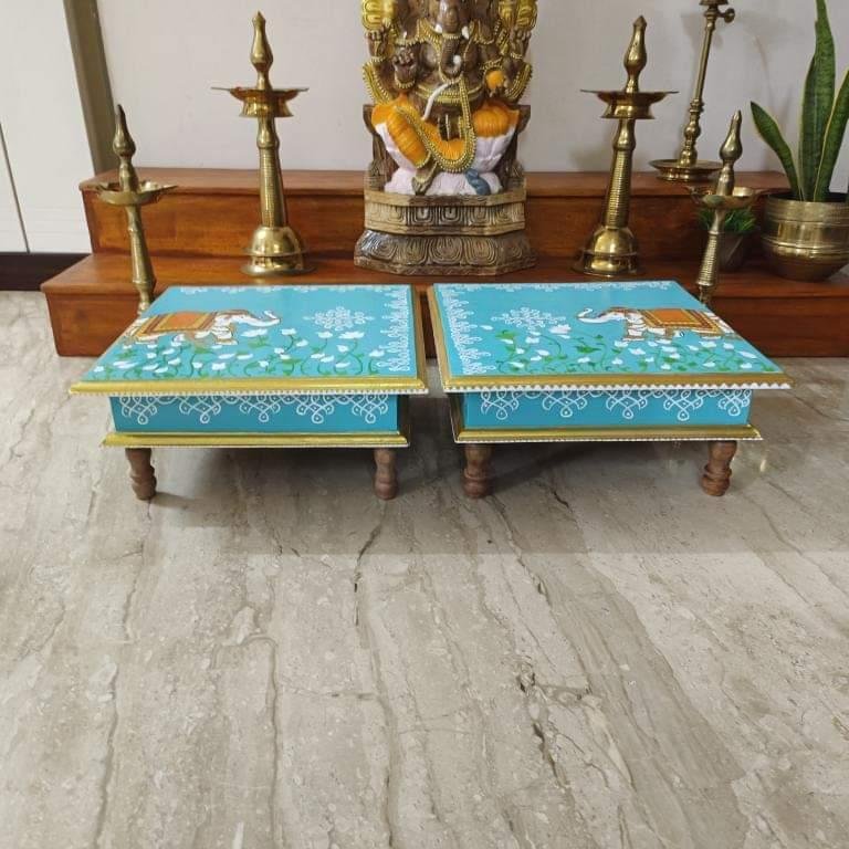 This is a traditional Square Style stools that have an increased height for sitting. This is the best option for those who need little raised stools for sitting. The best option for Display of Gods during Ganesh Chathurthi, Varalakshmi Pooja and Kalasams for Pooja. The bigger Size stools can be used as a side tables for Sofas / Couches. It can also be used as a traditional décor, display of heavy statues and other storage purposes. It can be done in wood finish only/ Painted