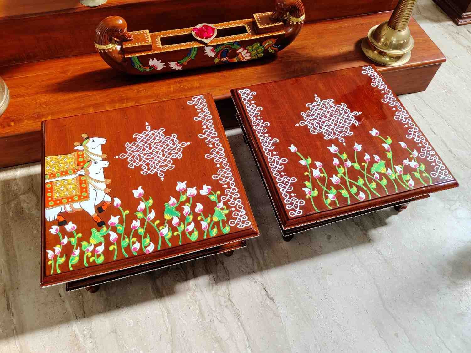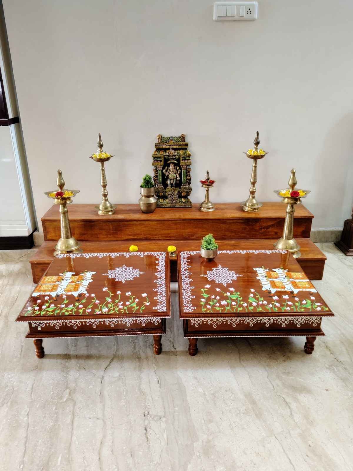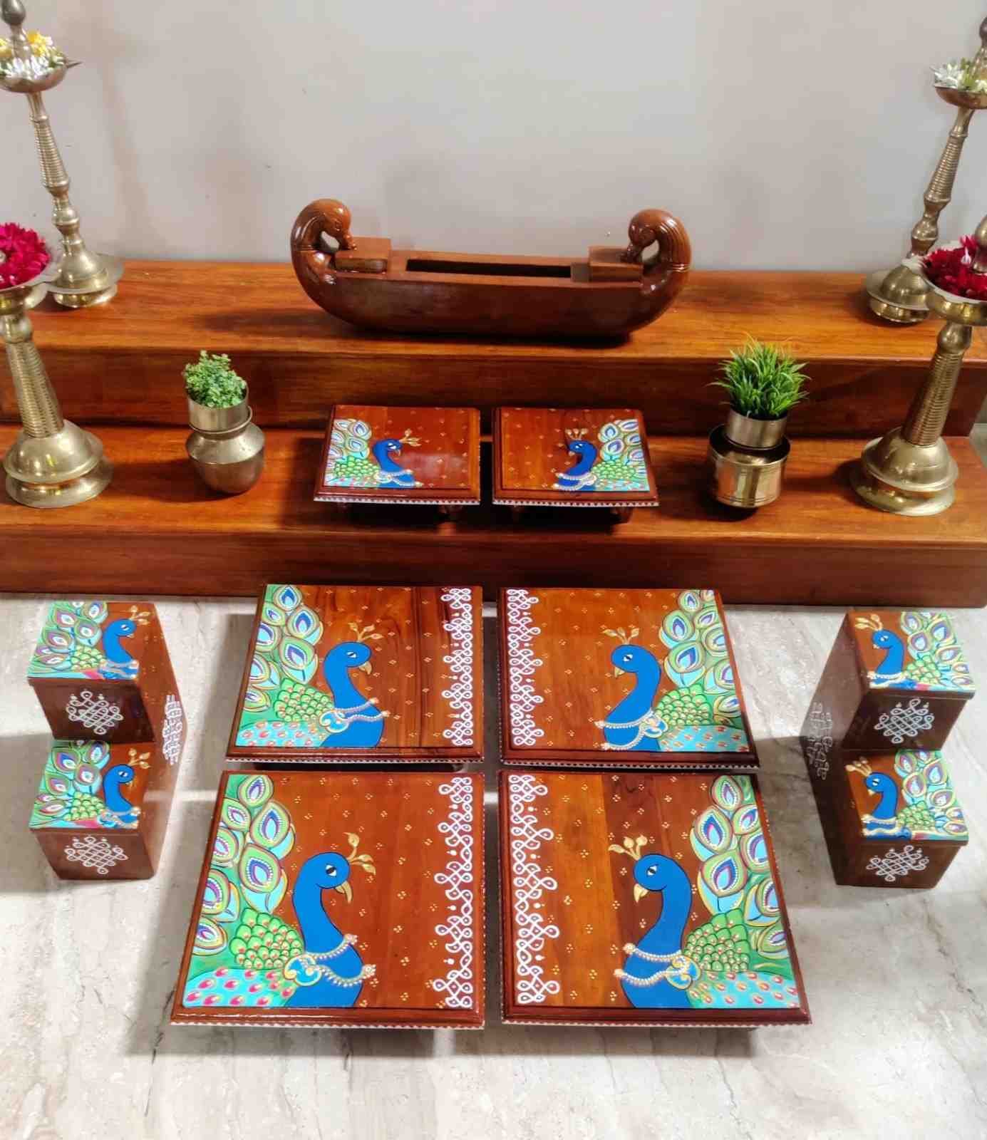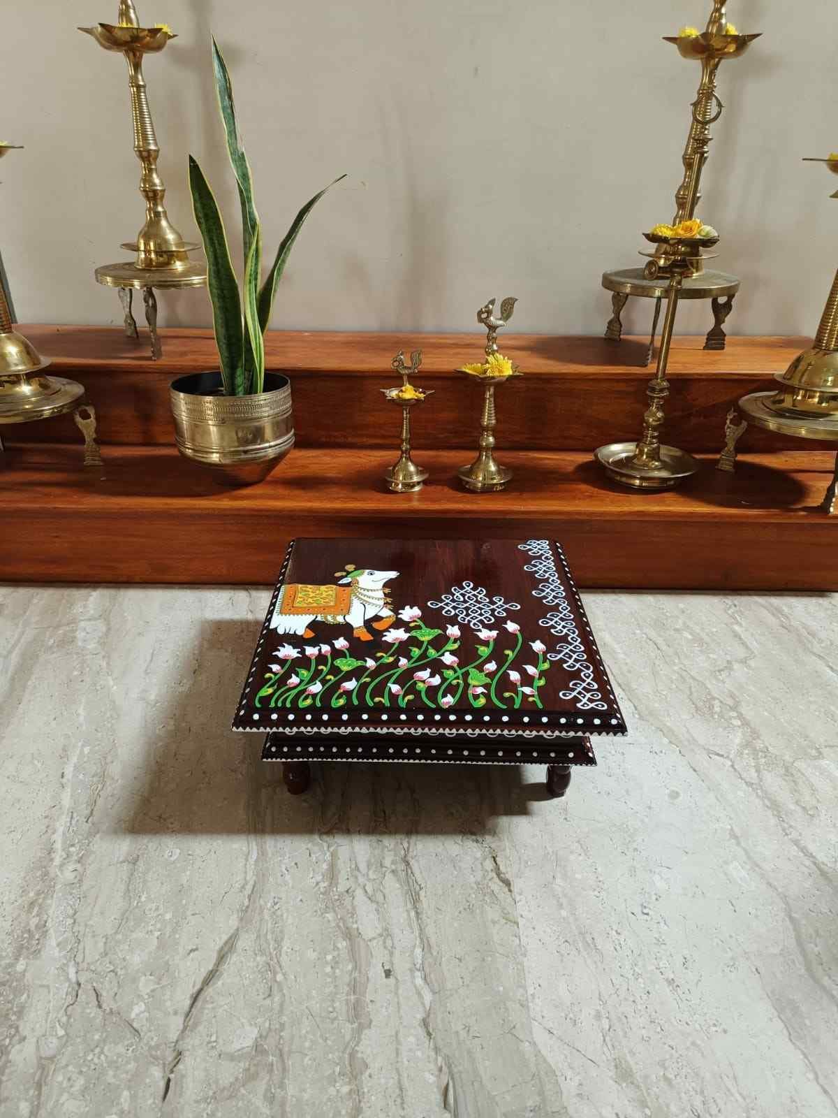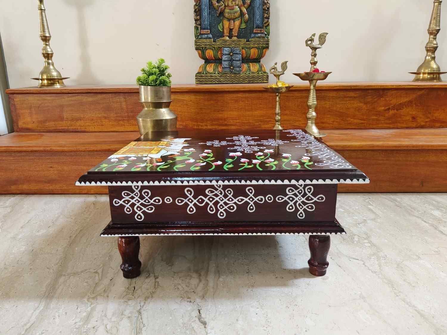 This is a traditional Square Style stools that have an increased height for sitting. This is the best option for those who need little raised stools for sitting. The best option for Display of Gods during Ganesh Chathurthi, Varalakshmi Pooja and Kalasams for Pooja. The bigger Size stools can be used as a side tables for Sofas / Couches. It can also be used as a traditional décor, display of heavy statues and other storage purposes. It can be done in wood finish only/ Painted
