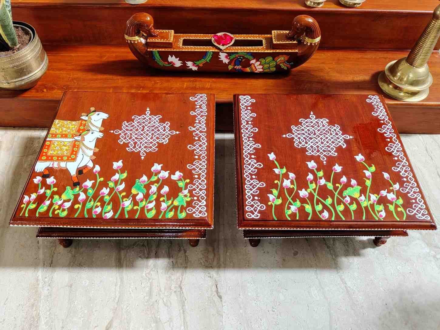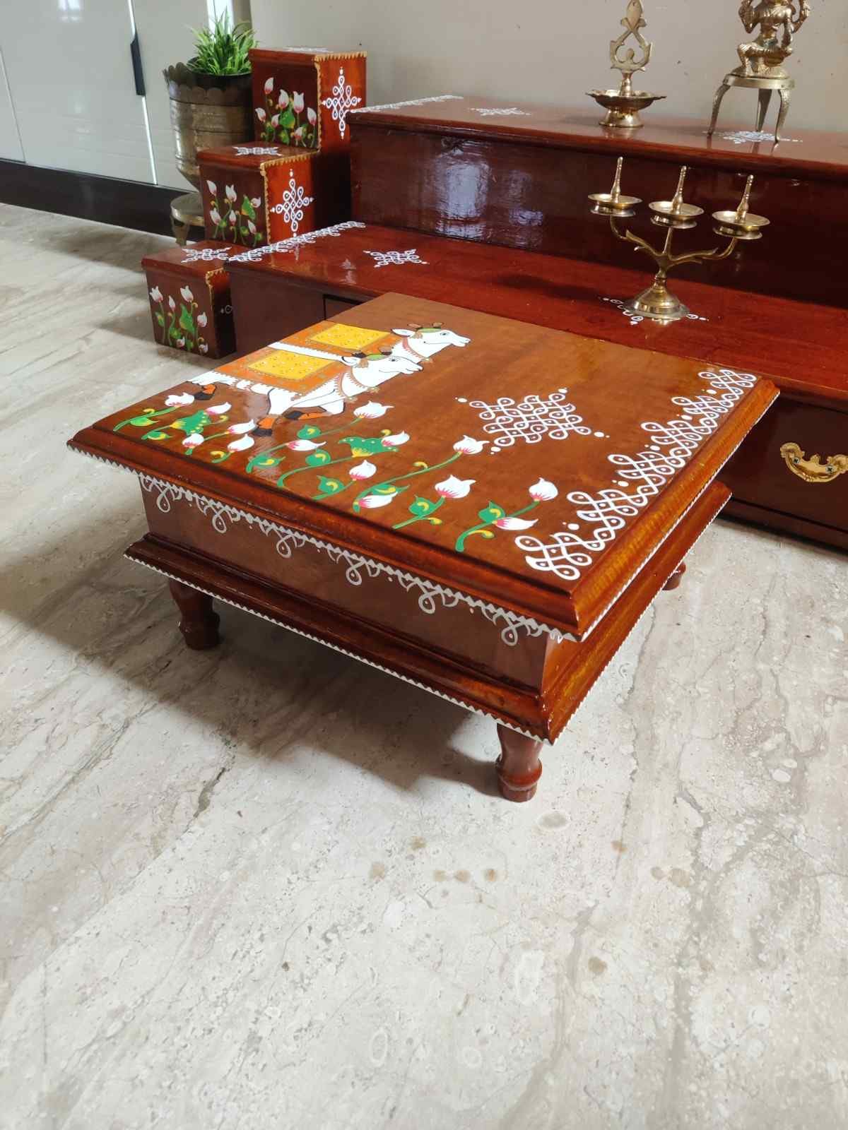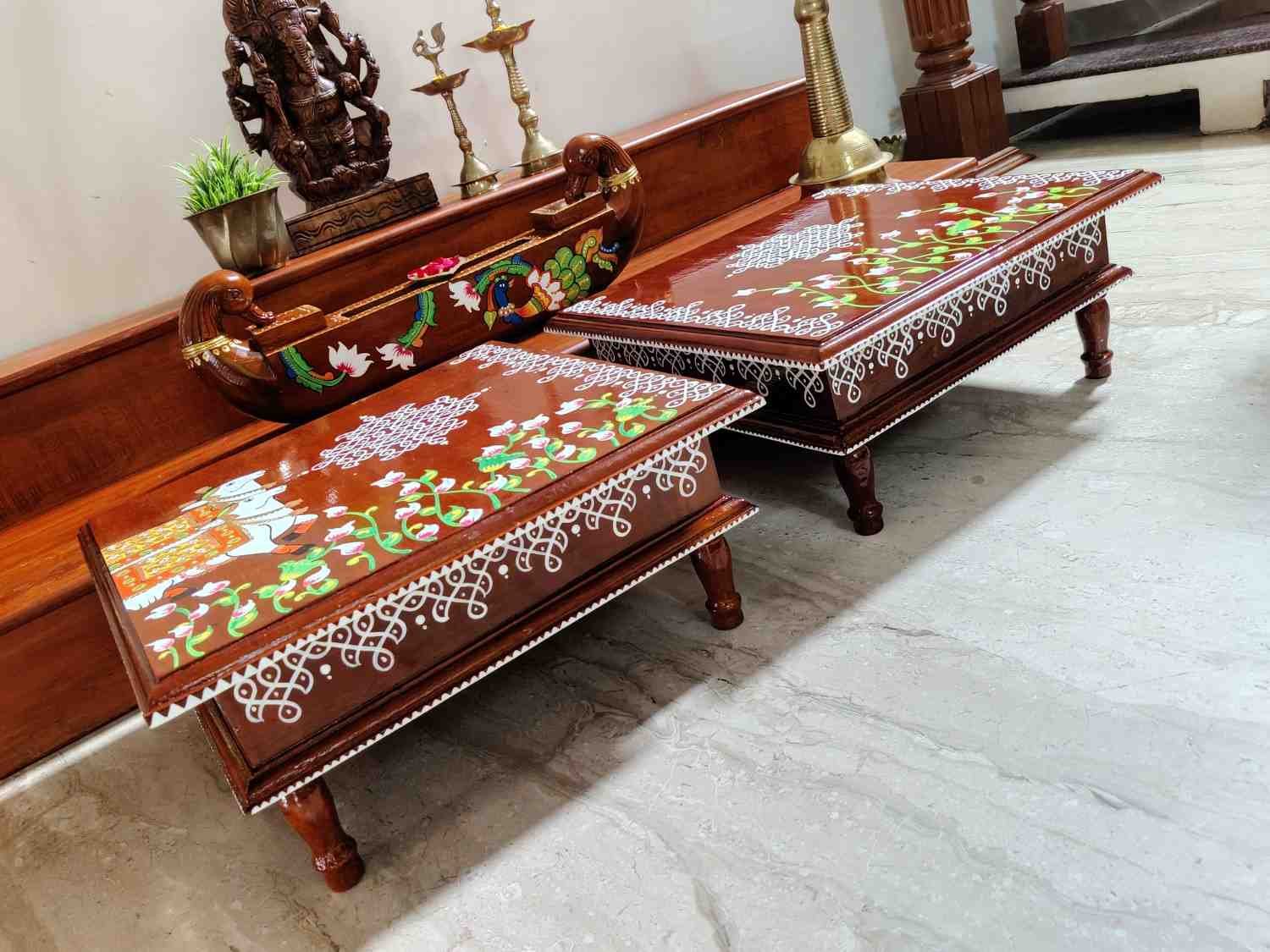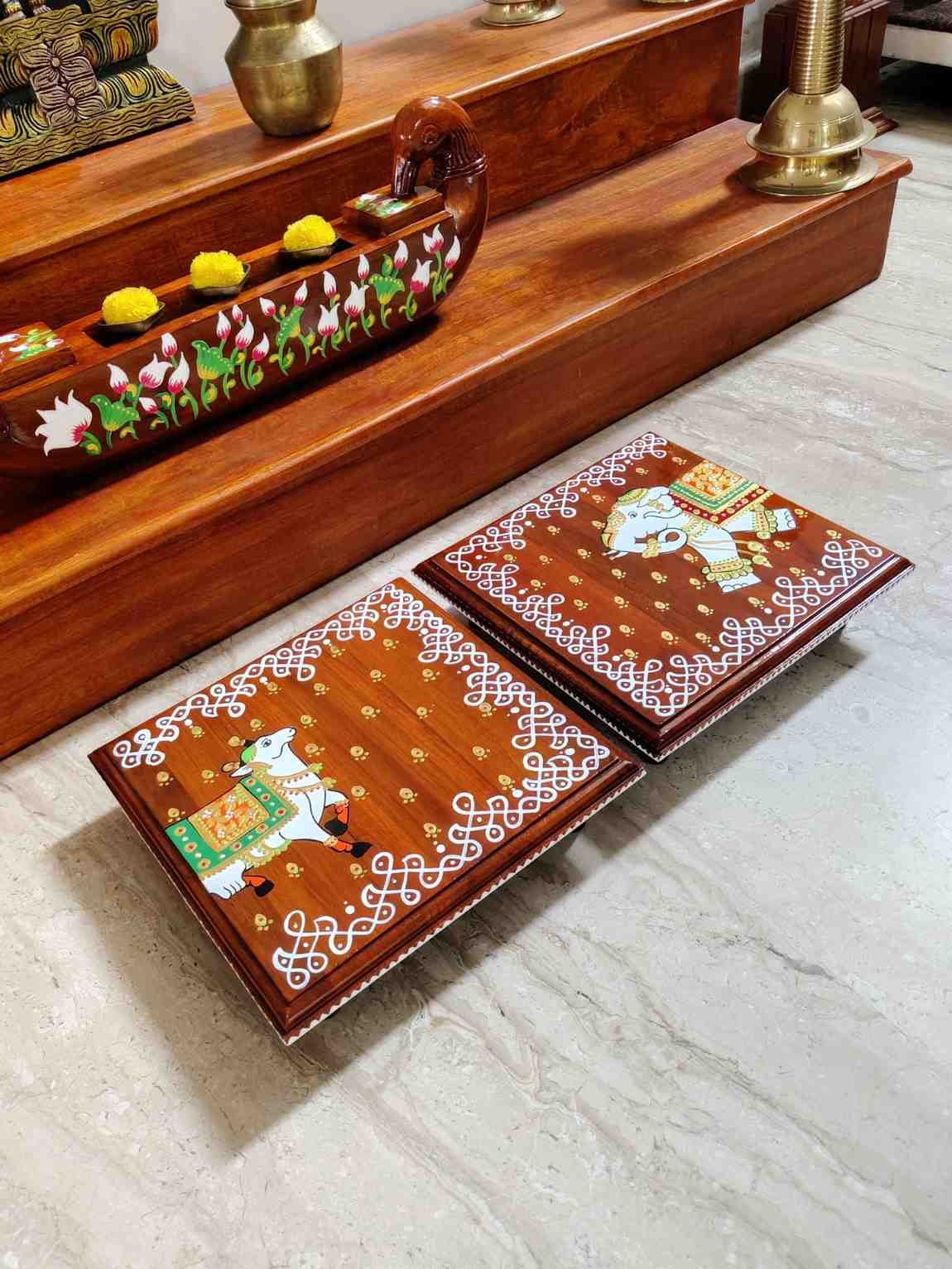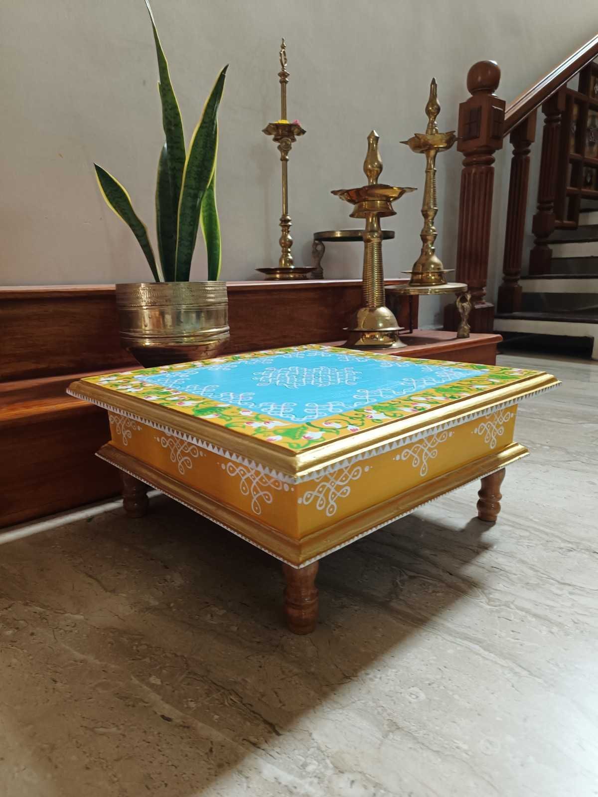 This is a traditional Square Style stools that have an increased height for sitting. This is the best option for those who need little raised stools for sitting. The best option for Display of Gods during Ganesh Chathurthi, Varalakshmi Pooja and Kalasams for Pooja. The bigger Size stools can be used as a side tables for Sofas / Couches. It can also be used as a traditional décor, display of heavy statues and other storage purposes. It can be done in wood finish only/ Painted