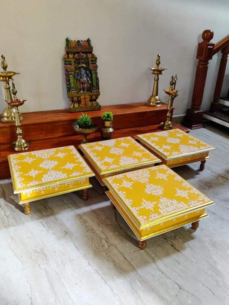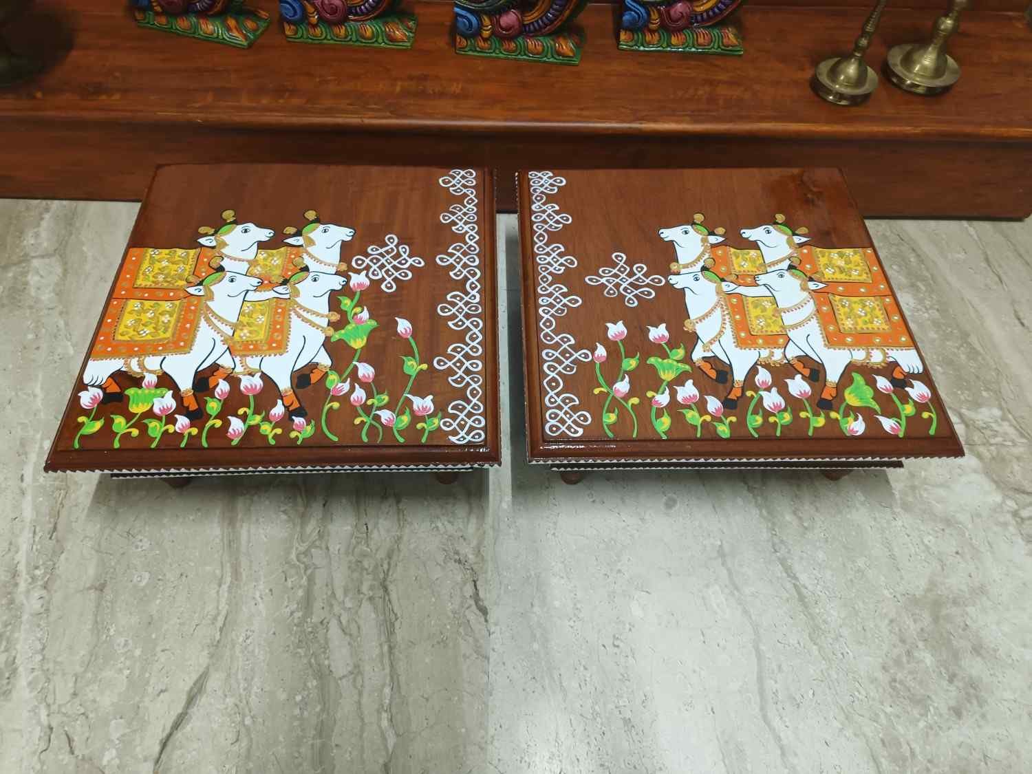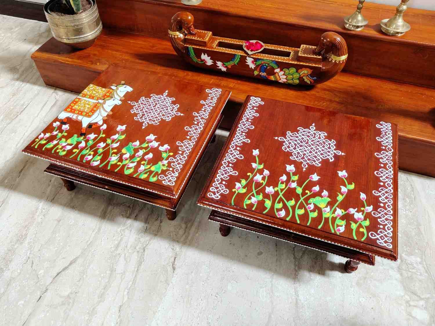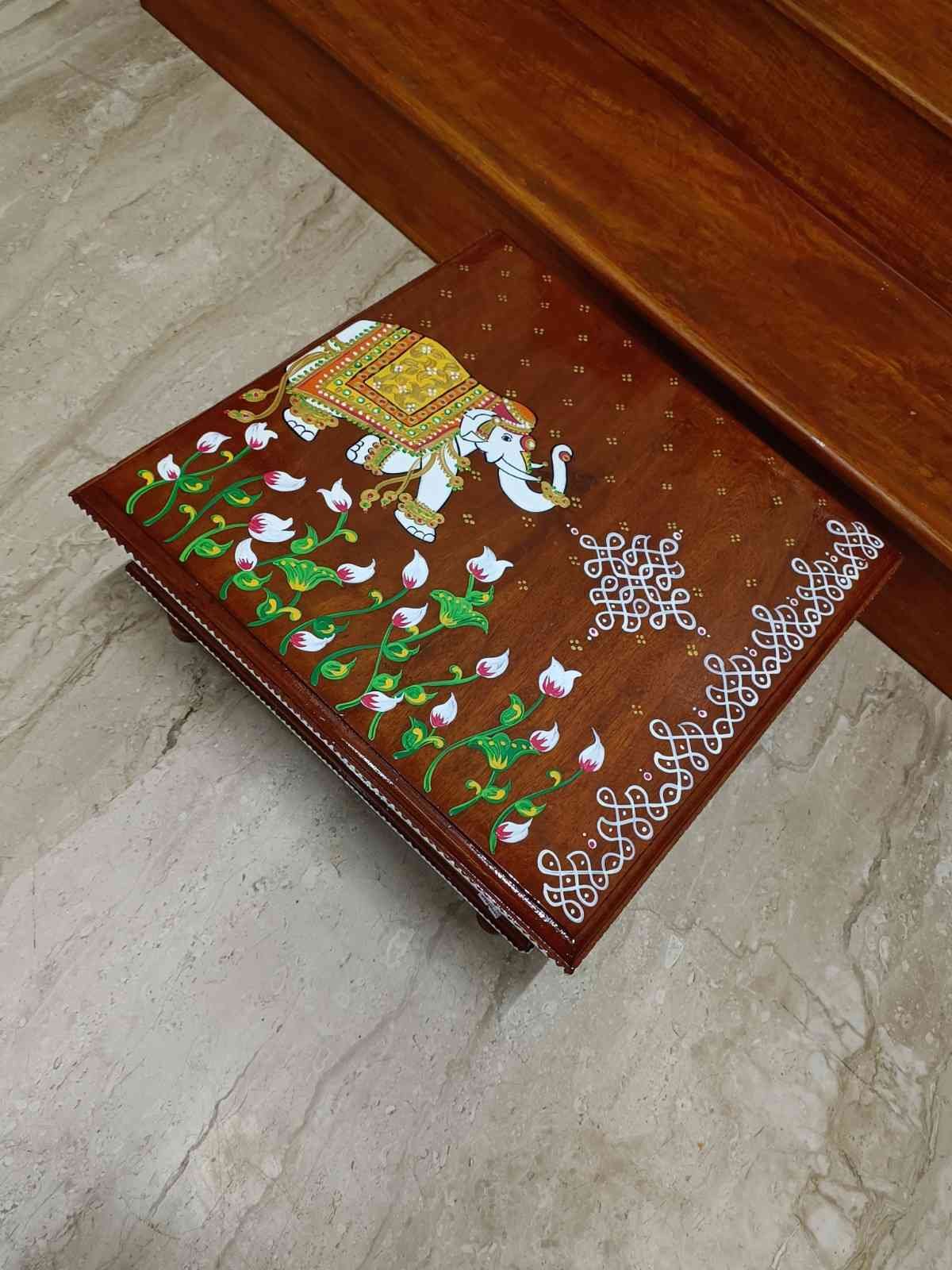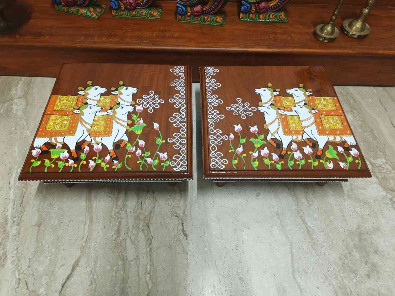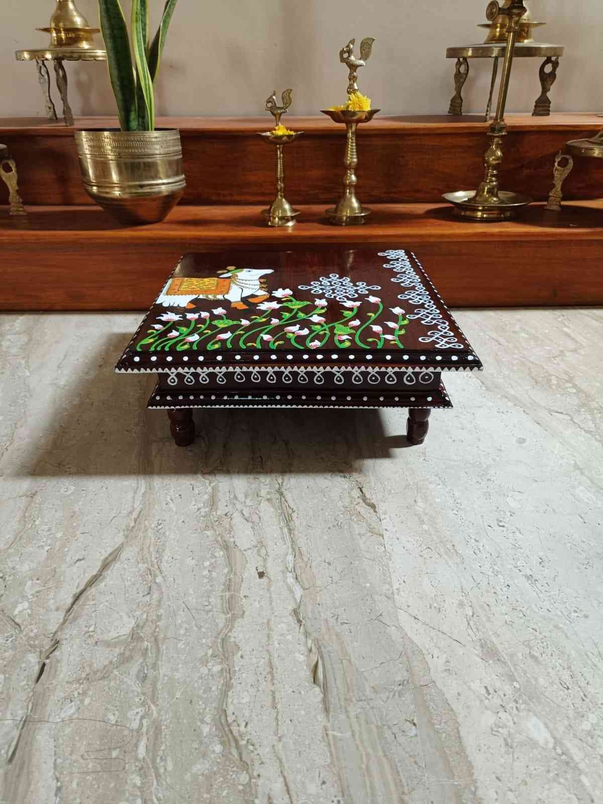 This is a traditional Square Style stools that have an increased height for sitting. This is the best option for those who need little raised stools for sitting. The best option for Display of Gods during Ganesh Chathurthi, Varalakshmi Pooja and Kalasams for Pooja. The bigger Size stools can be used as a side tables for Sofas / Couches. It can also be used as a traditional décor, display of heavy statues and other storage purposes. It can be done in wood finish only/ Painted