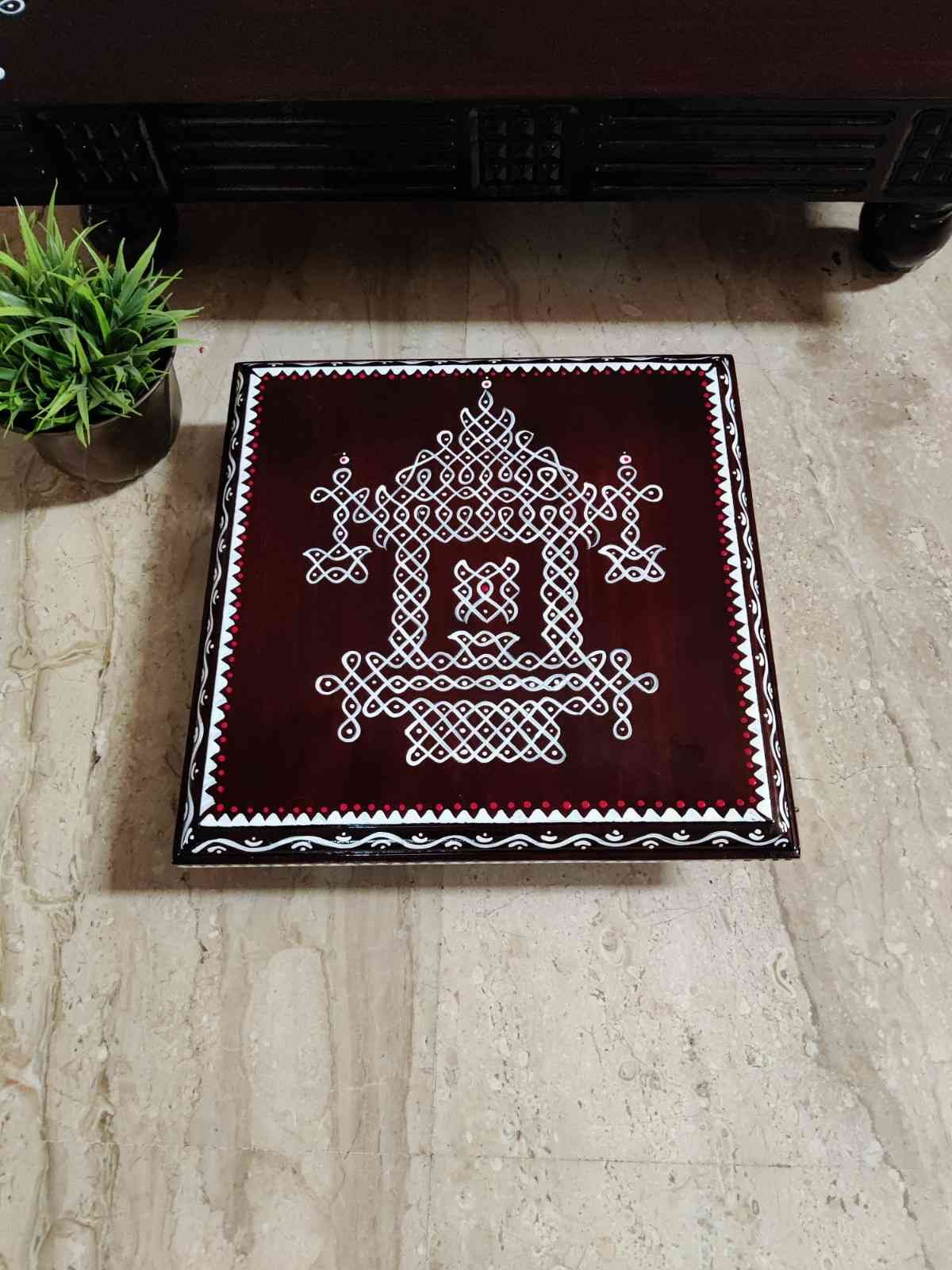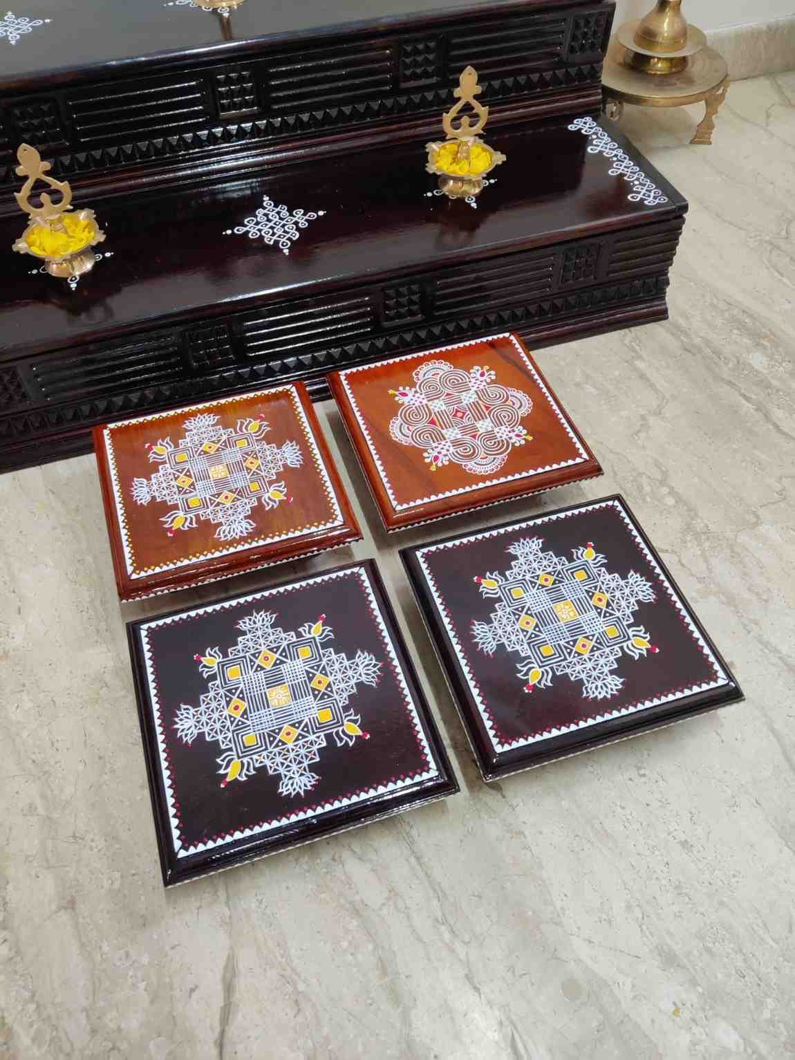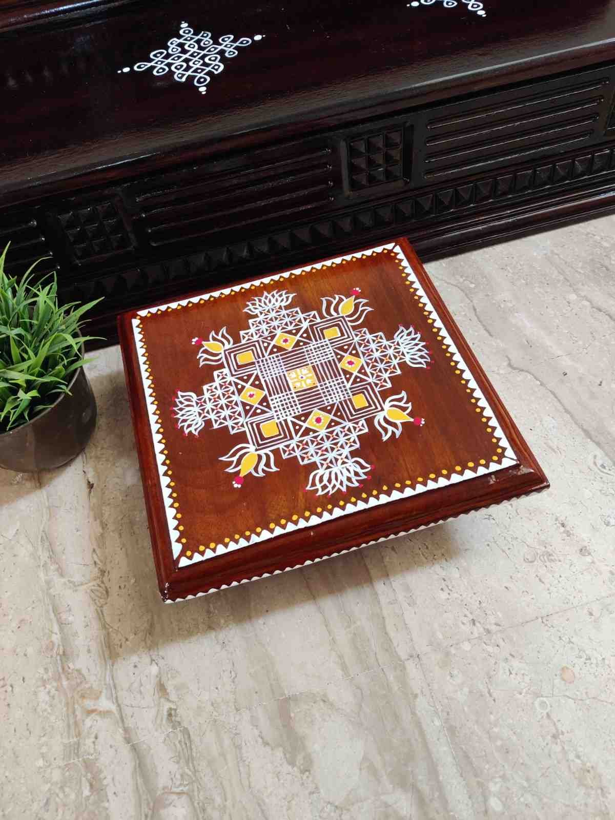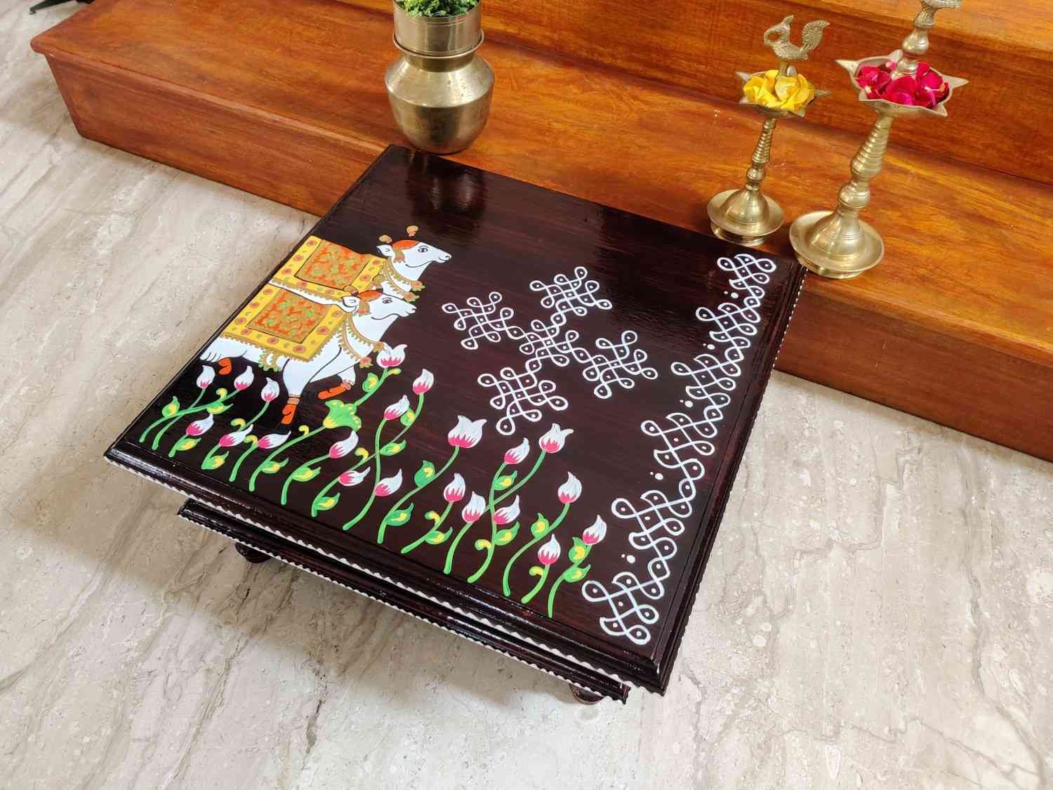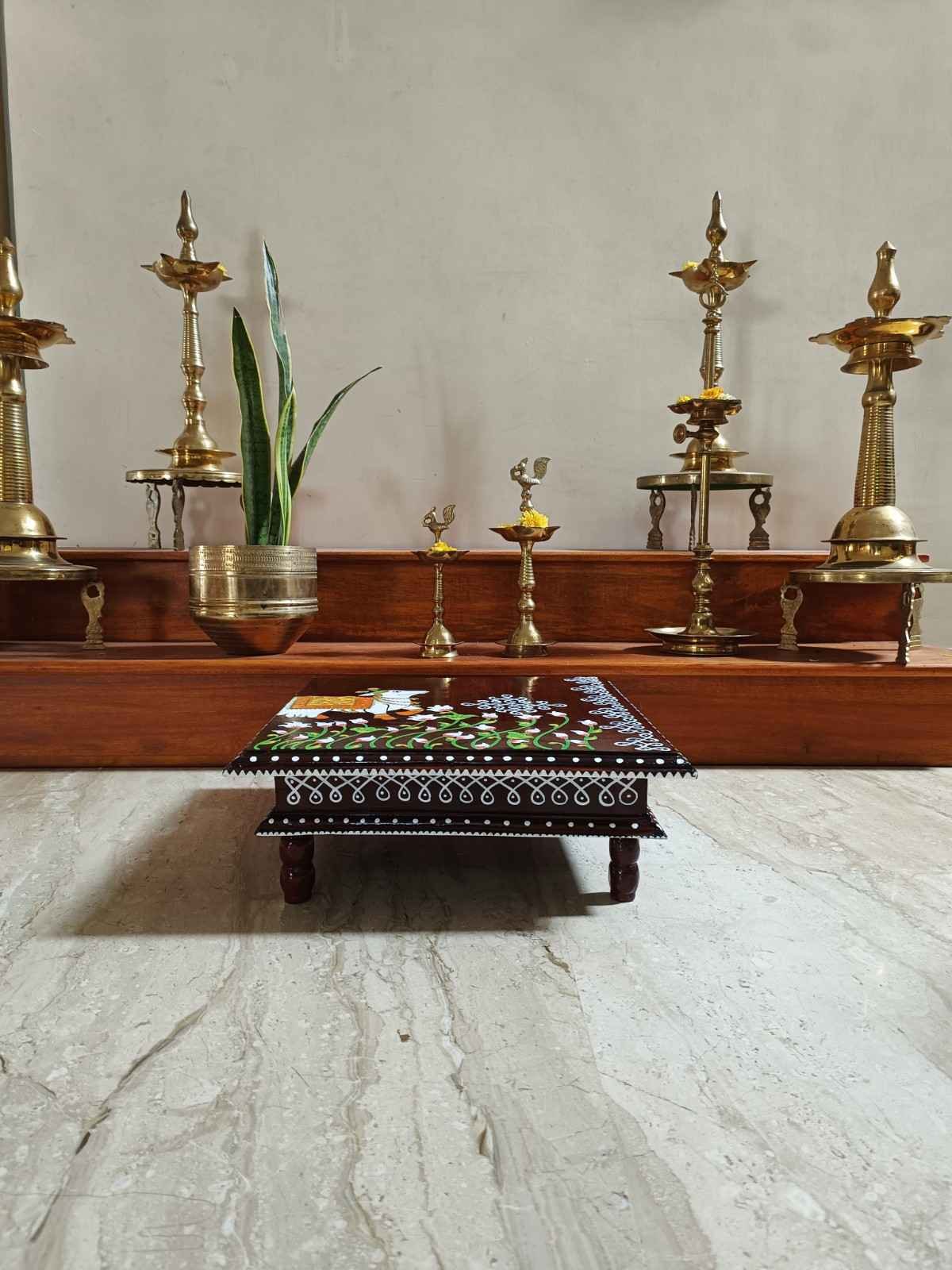 This is a traditional Square Style stools that have an increased height for sitting. This is the best option for those who need little raised stools for sitting. The best option for Display of Gods during Ganesh Chathurthi, Varalakshmi Pooja and Kalasams for Pooja. The bigger Size stools can be used as a side tables for Sofas / Couches. It can also be used as a traditional décor, display of heavy statues and other storage purposes. It can be done in wood finish only/ Painted