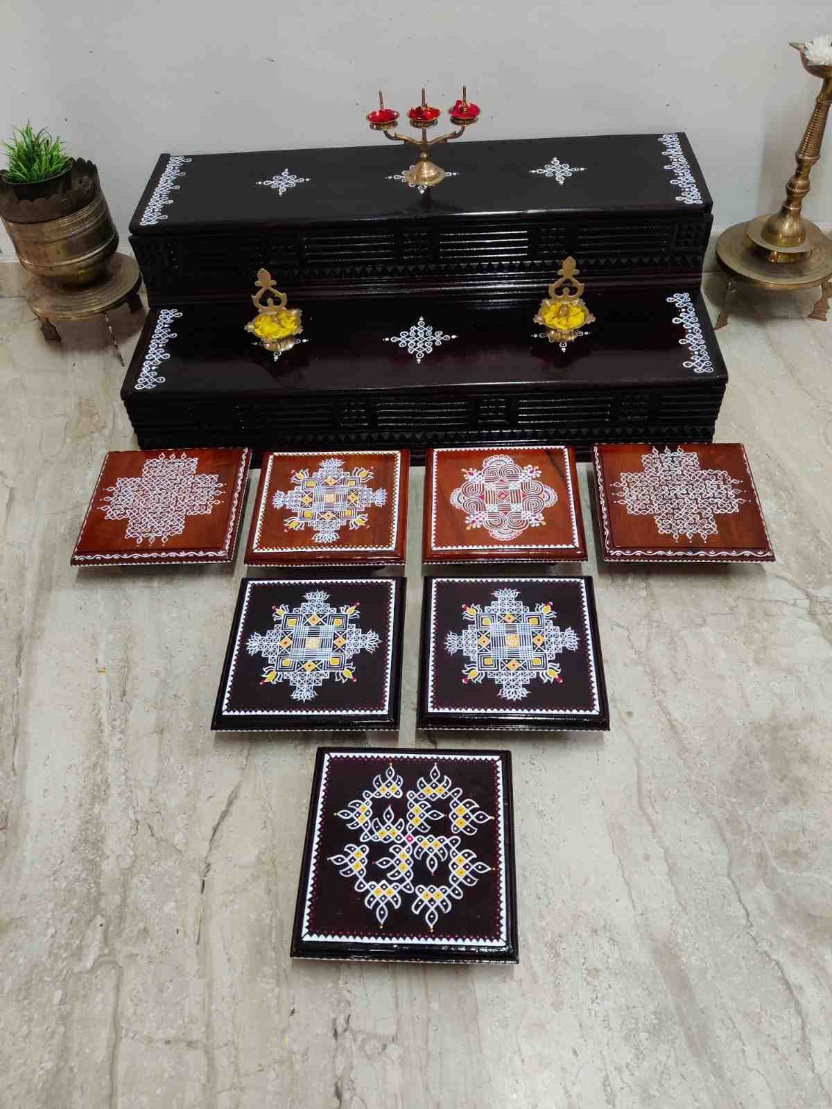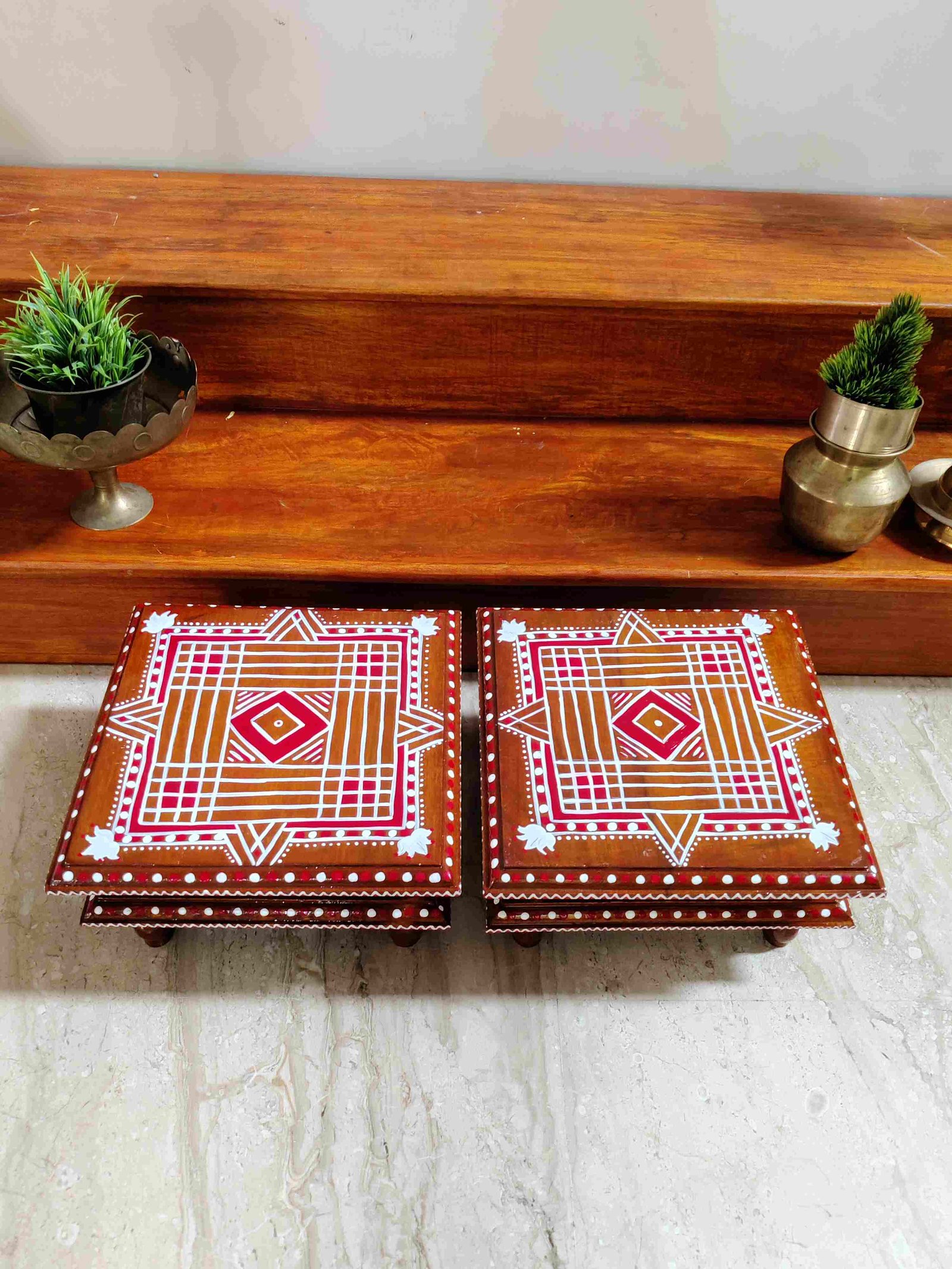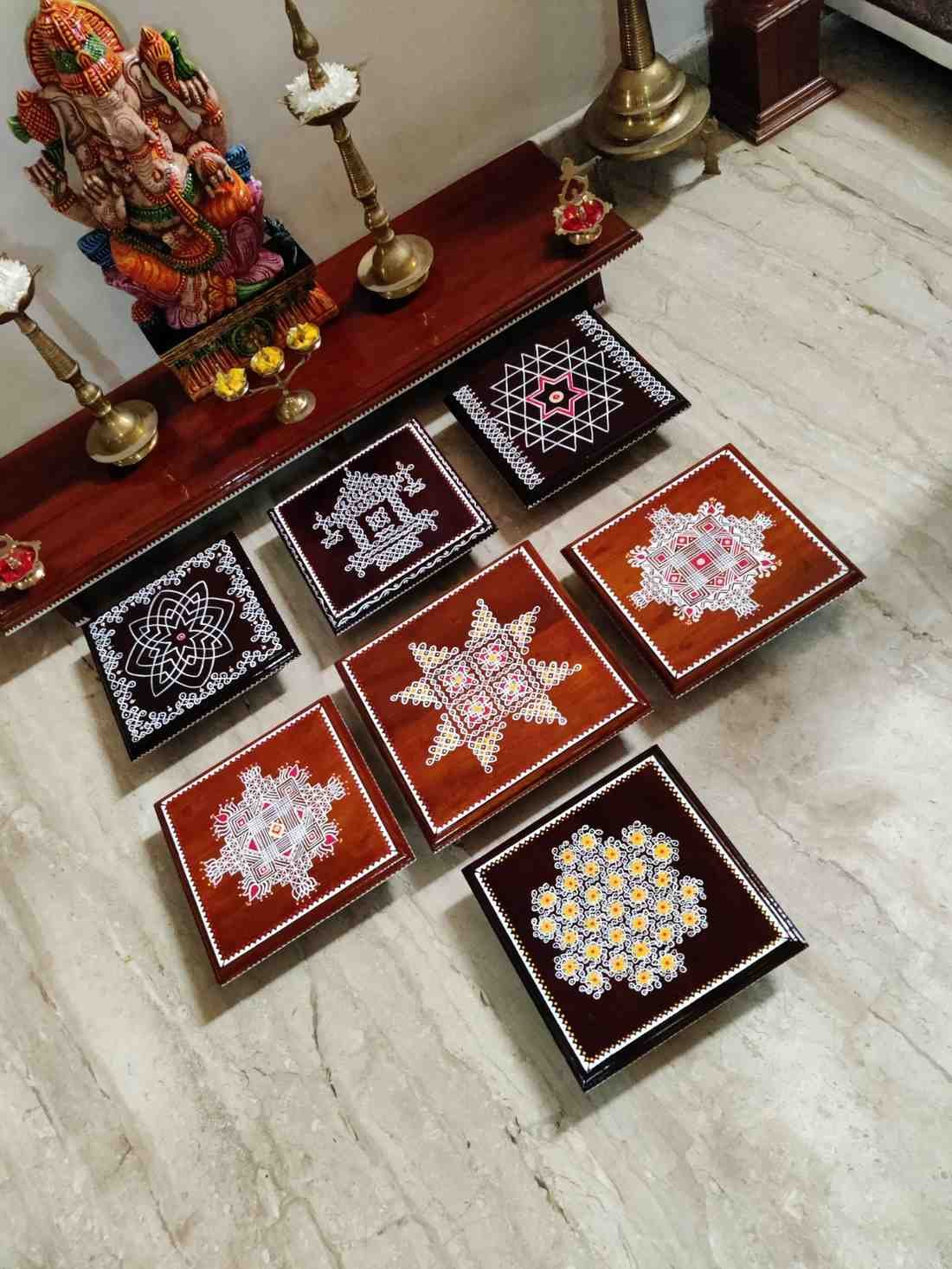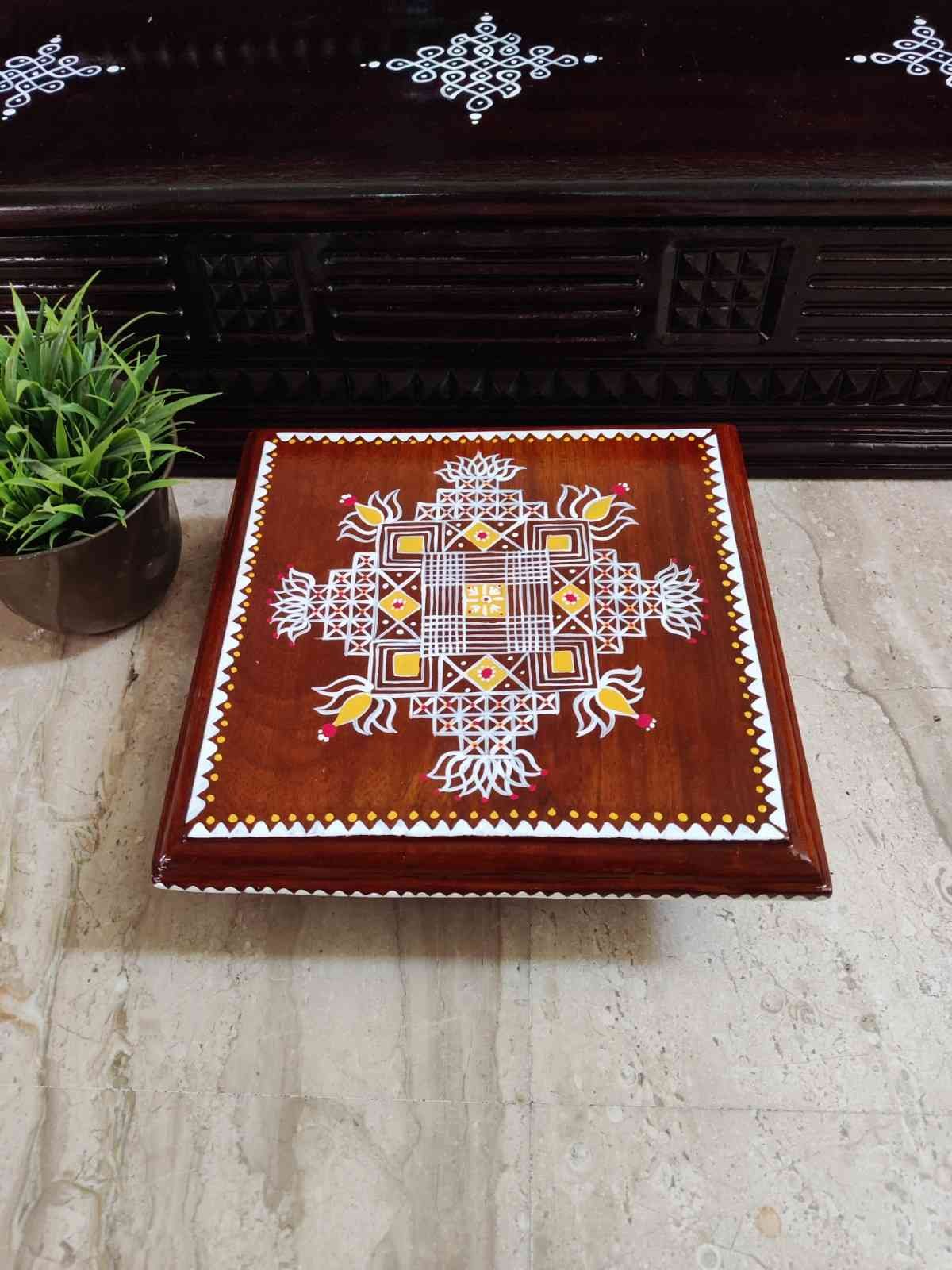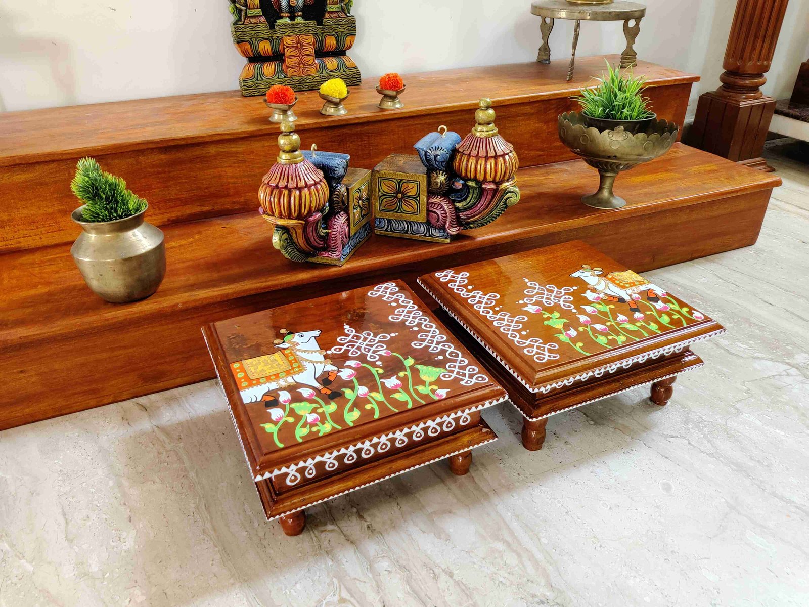 This is a traditional Square Style stools that have an increased height for sitting. This is the best option for those who need little raised stools for sitting. The best option for Display of Gods during Ganesh Chathurthi, Varalakshmi Pooja and Kalasams for Pooja. The bigger Size stools can be used as a side tables for Sofas / Couches. It can also be used as a traditional décor, display of heavy statues and other storage purposes. It can be done in wood finish only/ Painted