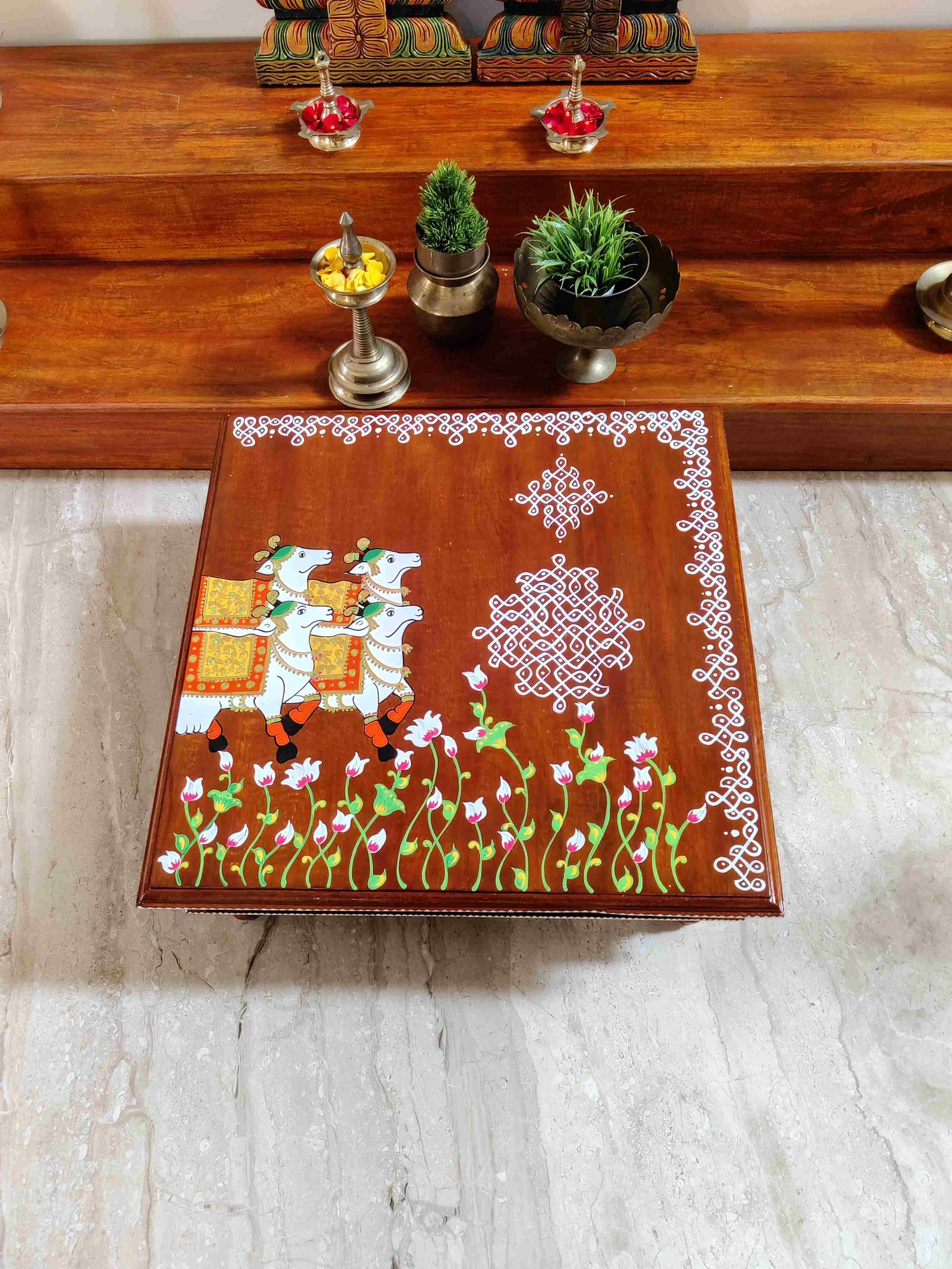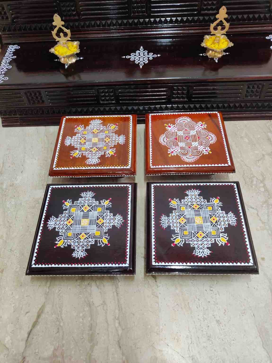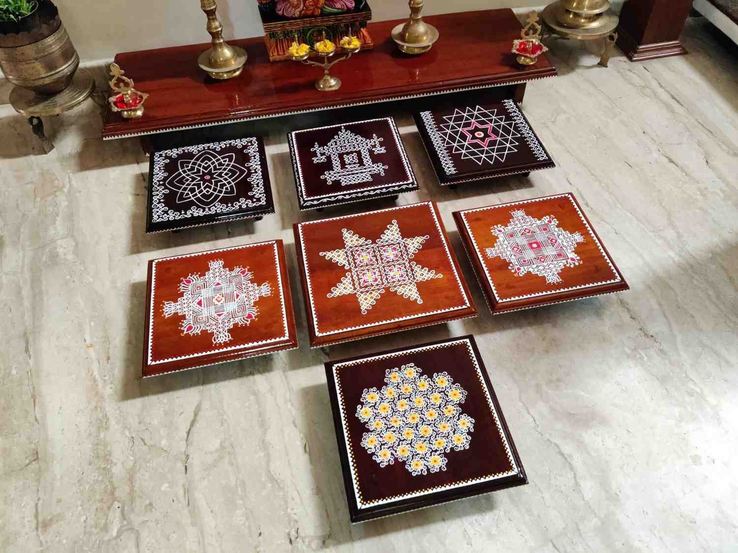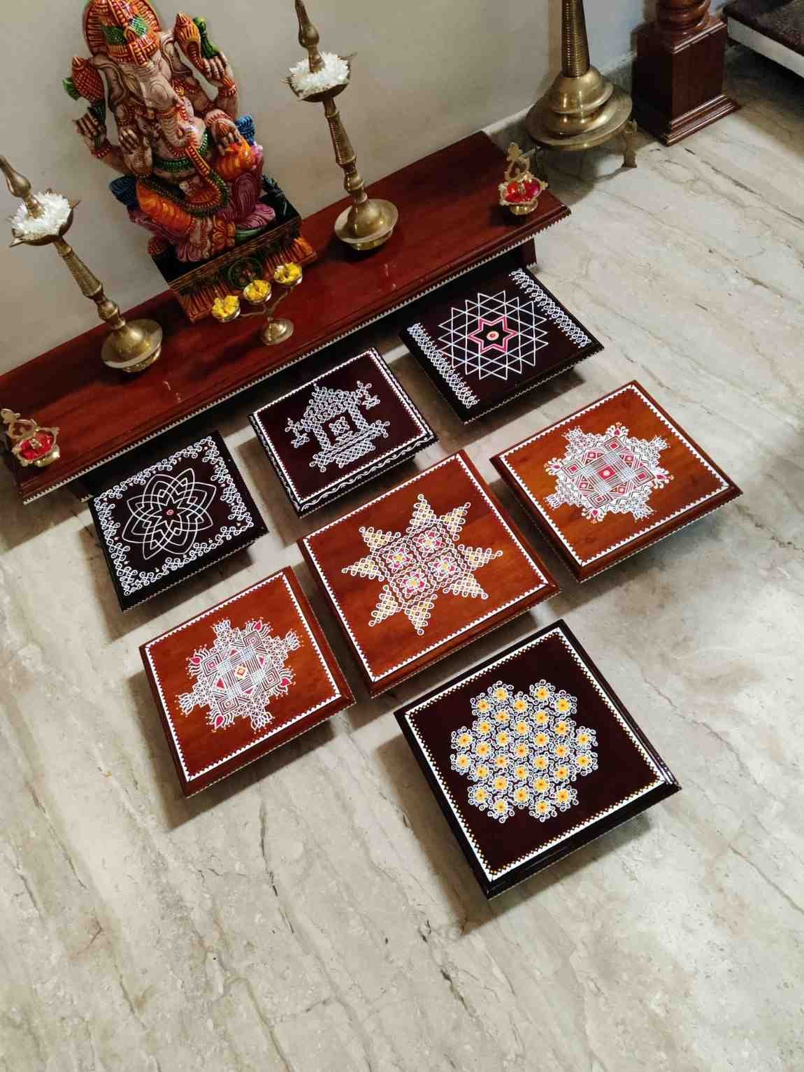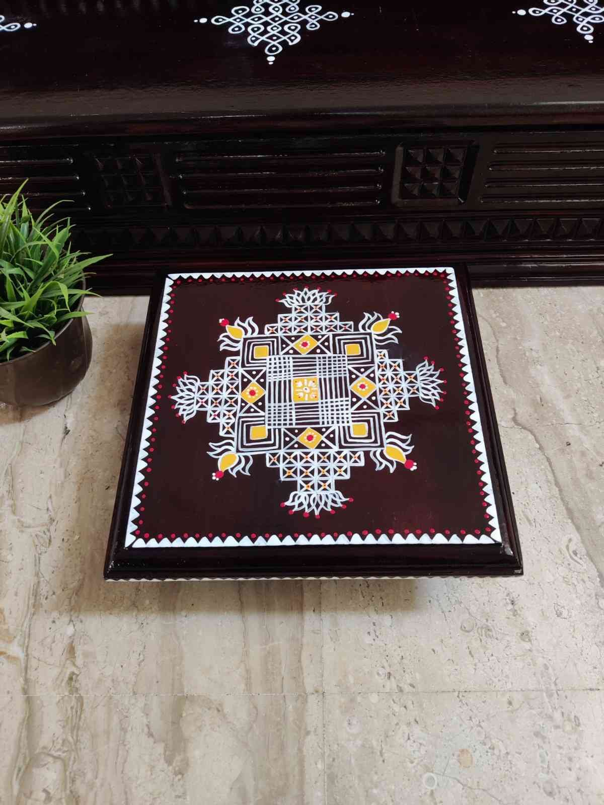This is a traditional Square Style stools that have an increased height for sitting. This is the best option for those who need little raised stools for sitting. The best option for Display of Gods during Ganesh Chathurthi, Varalakshmi Pooja and Kalasams for Pooja. The bigger Size stools can be used as a side tables for Sofas / Couches. It can also be used as a traditional décor, display of heavy statues and other storage purposes. It can be done in wood finish only/ Painted