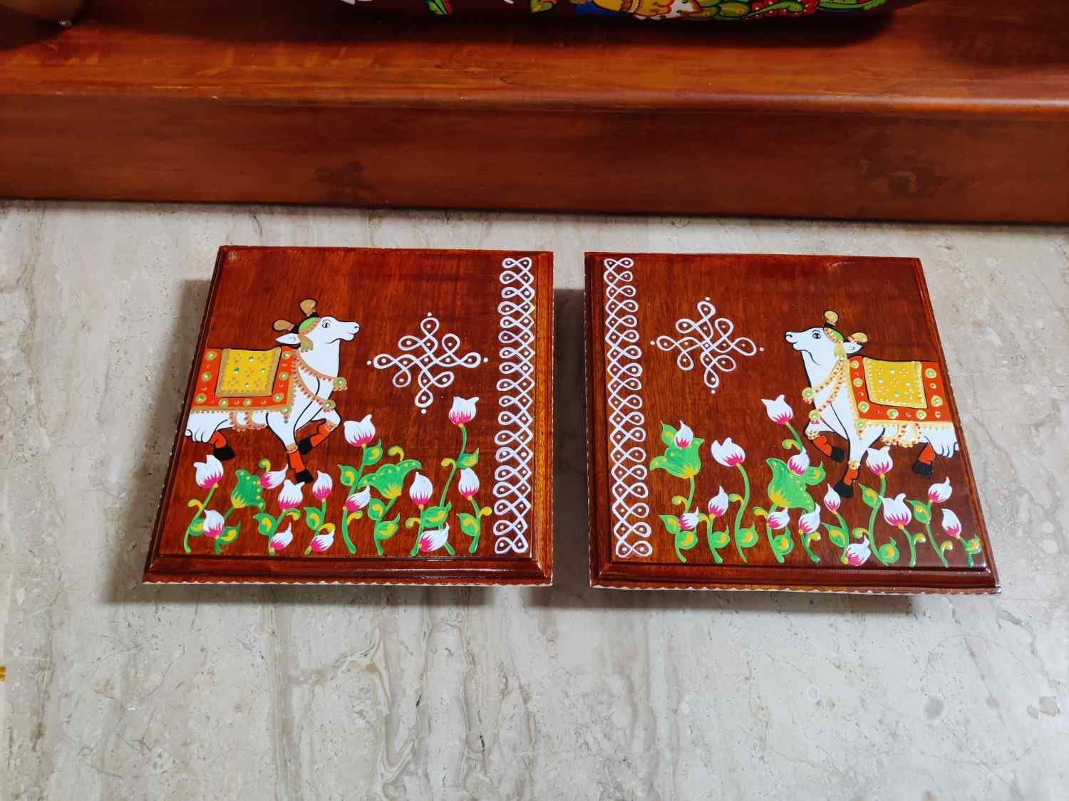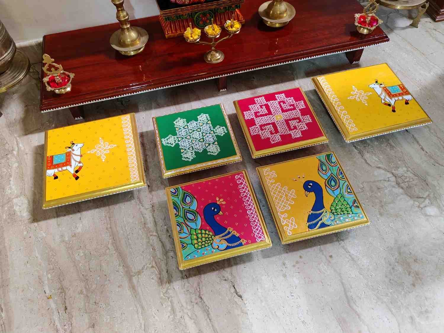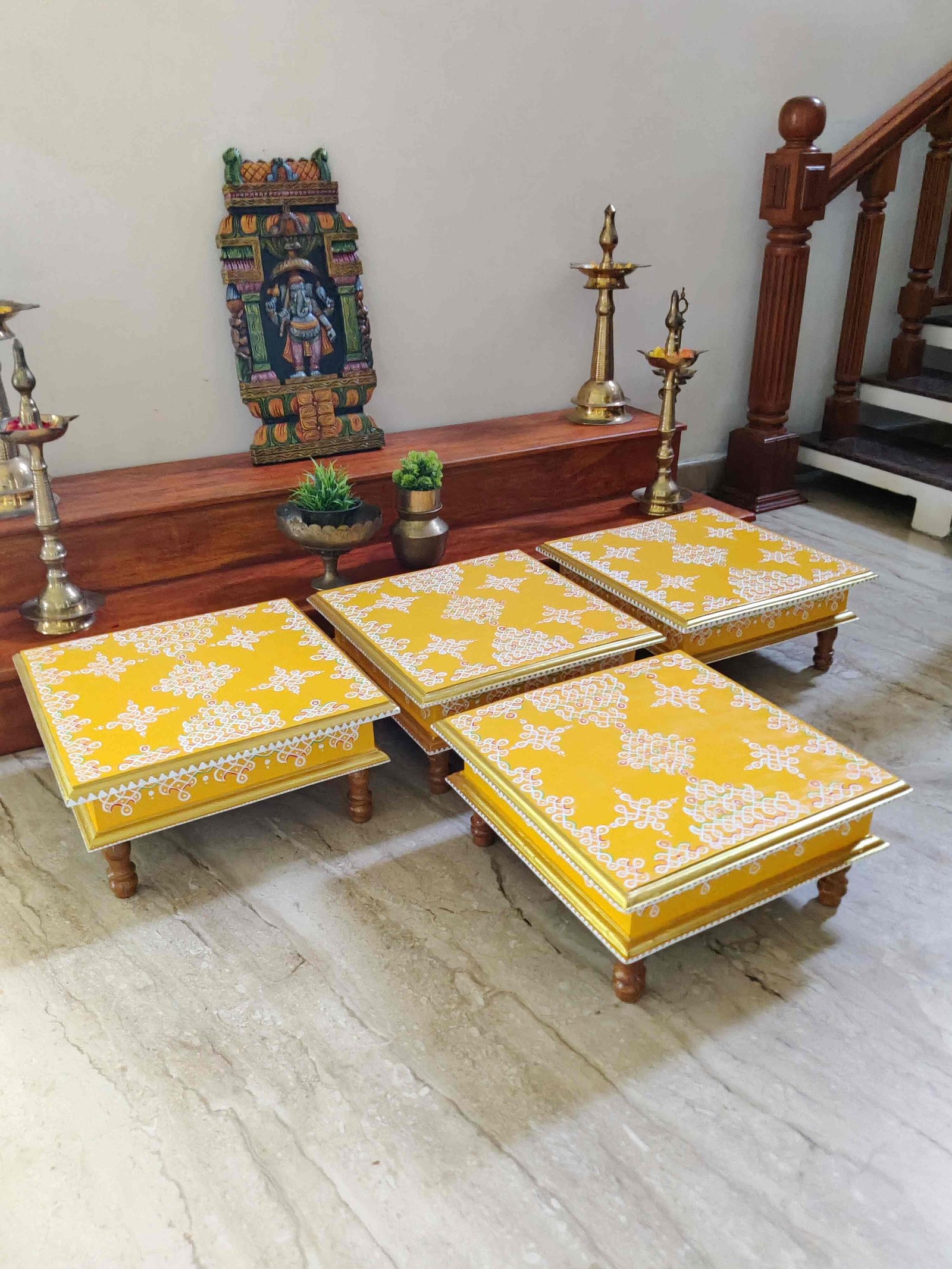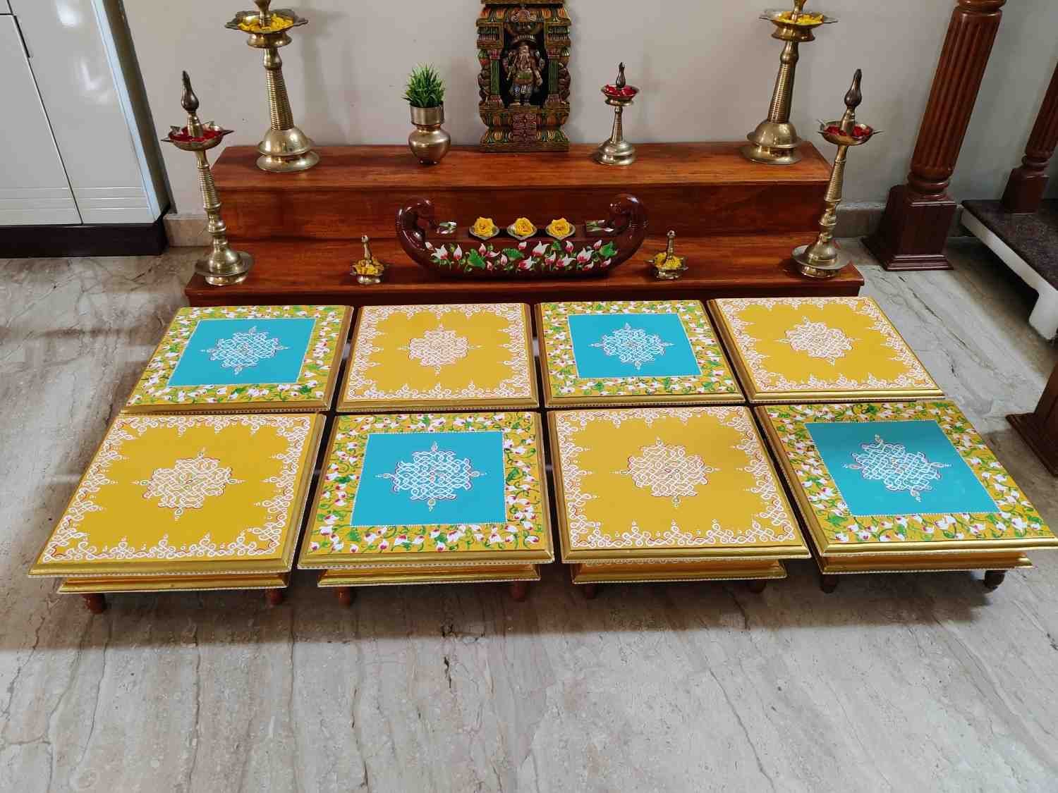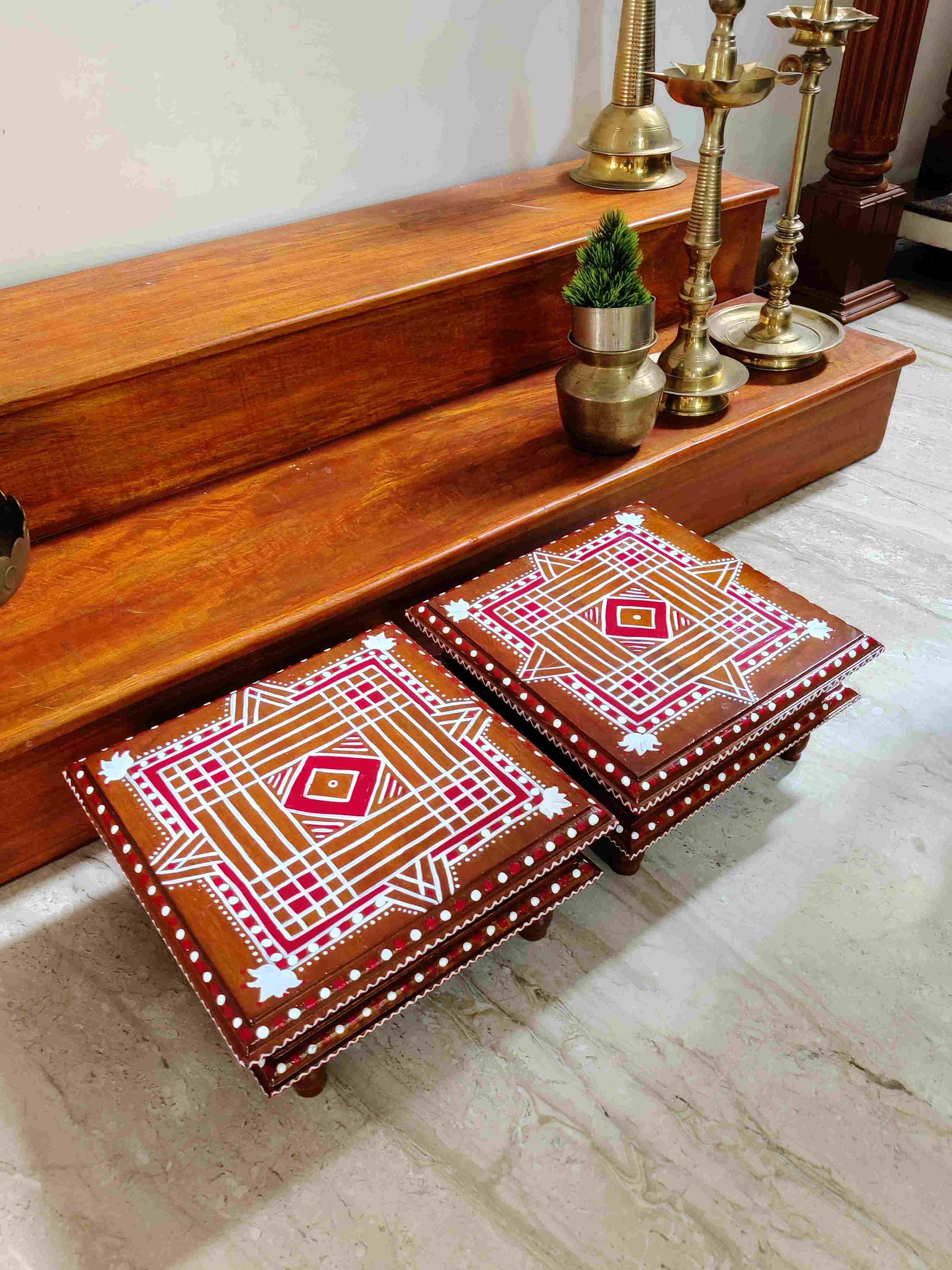 This is a traditional Square Style stools that have an increased height for sitting. This is the best option for those who need little raised stools for sitting. The best option for Display of Gods during Ganesh Chathurthi, Varalakshmi Pooja and Kalasams for Pooja. The bigger Size stools can be used as a side tables for Sofas / Couches. It can also be used as a traditional décor, display of heavy statues and other storage purposes. It can be done in wood finish only/ Painted