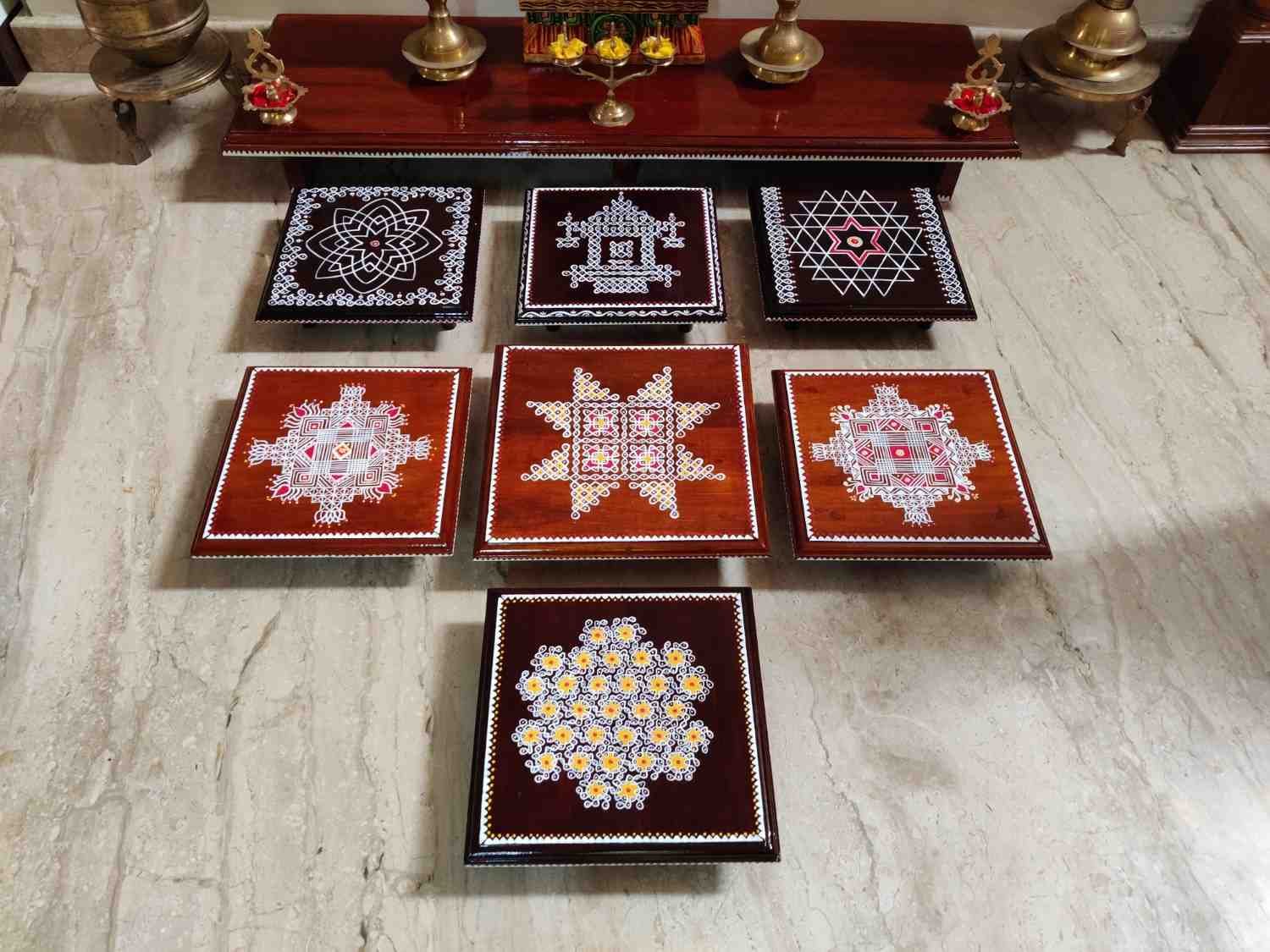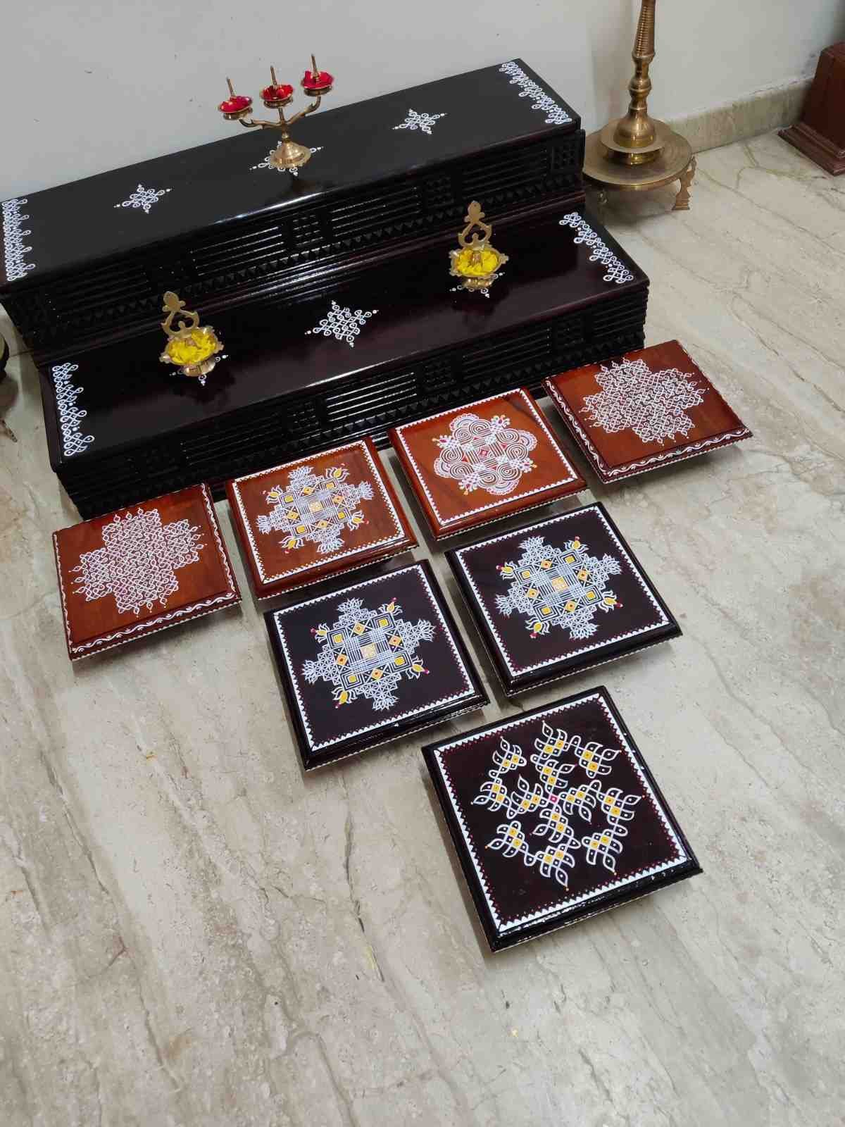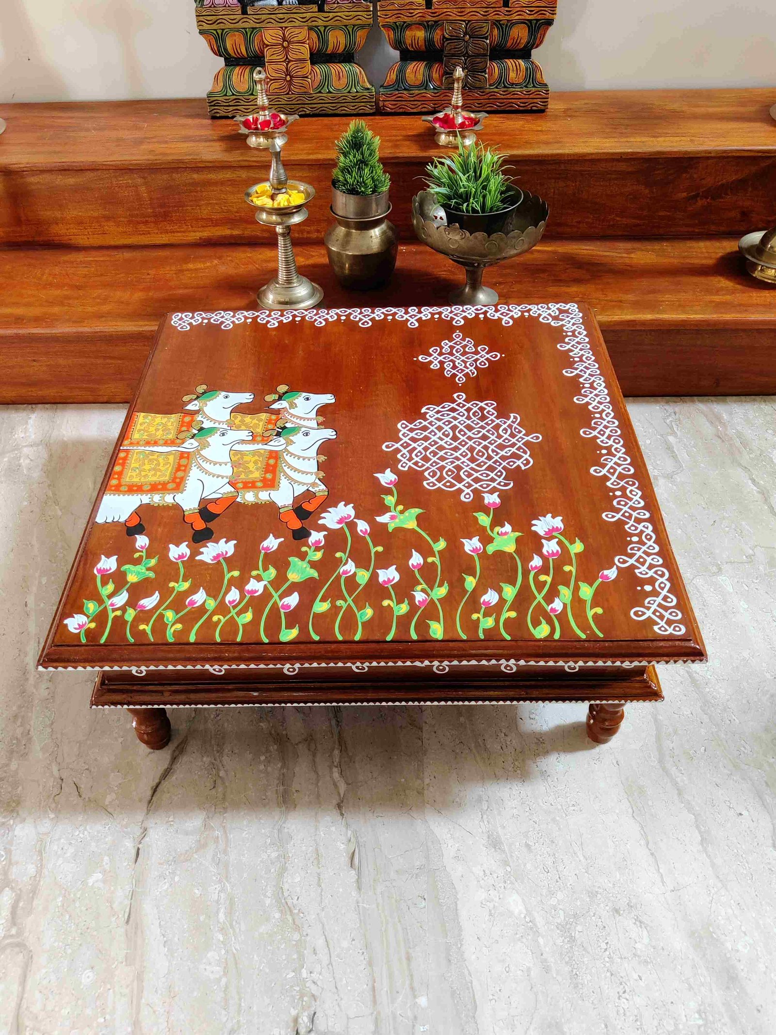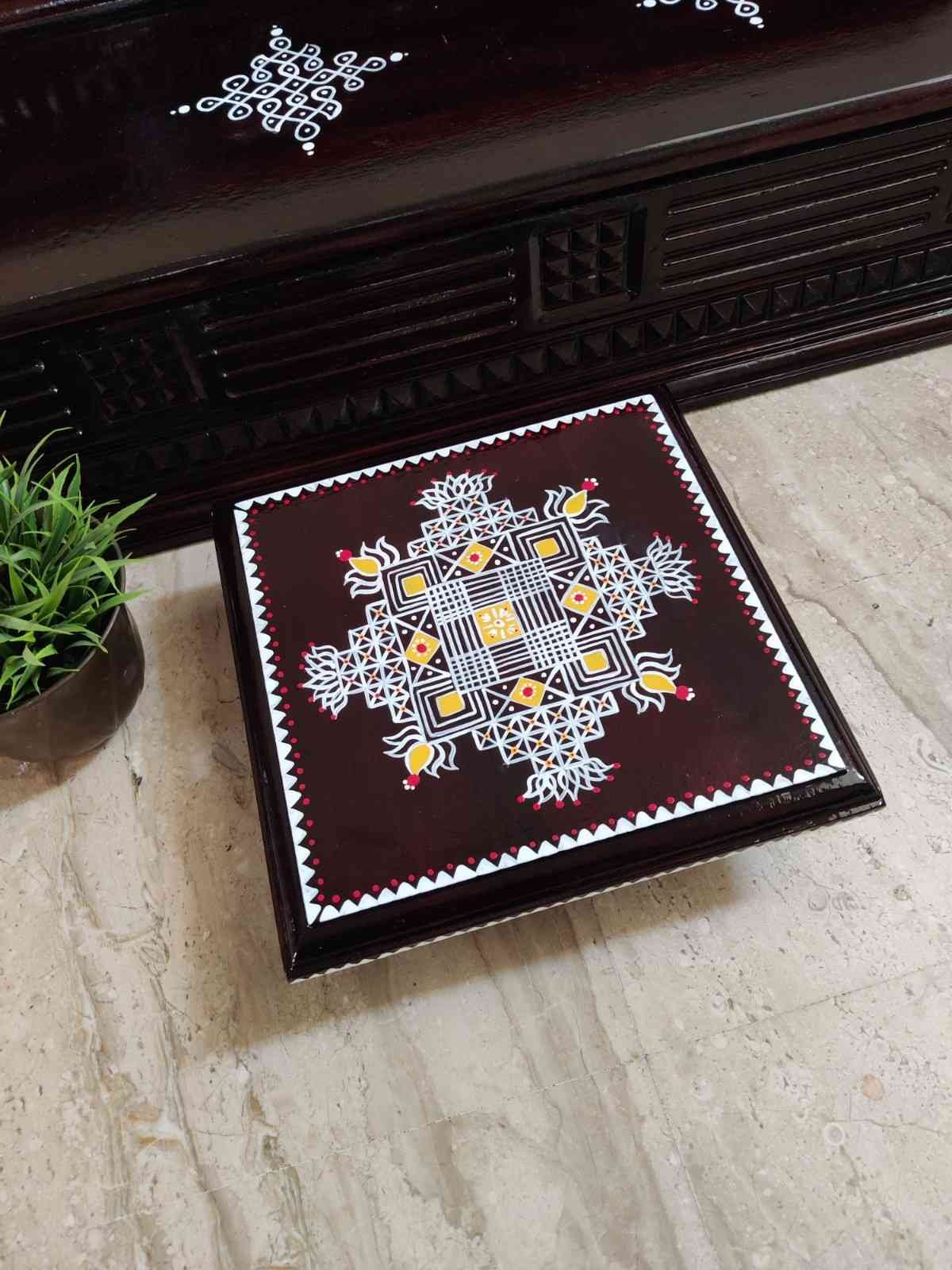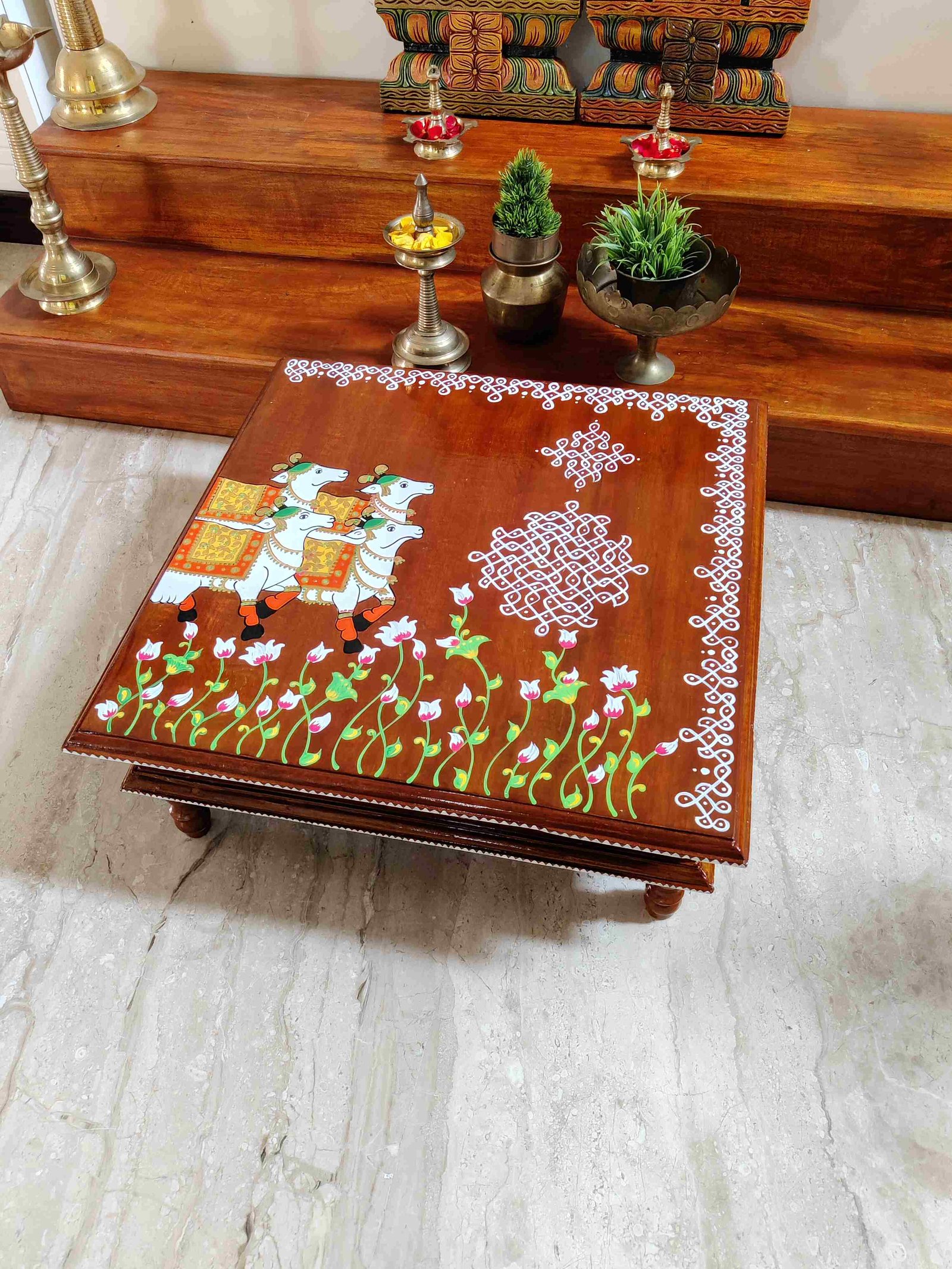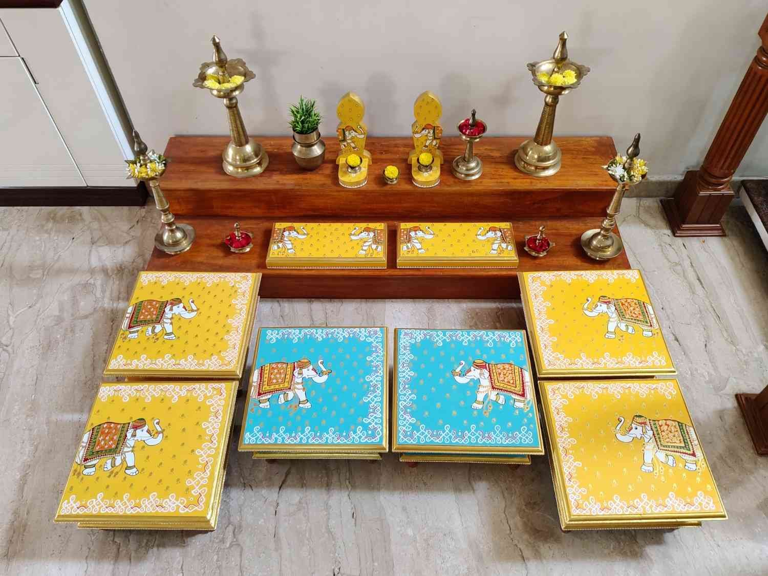 This is a traditional Square Style stools that have an increased height for sitting. This is the best option for those who need little raised stools for sitting. The best option for Display of Gods during Ganesh Chathurthi, Varalakshmi Pooja and Kalasams for Pooja. The bigger Size stools can be used as a side tables for Sofas / Couches. It can also be used as a traditional décor, display of heavy statues and other storage purposes. It can be done in wood finish only/ Painted