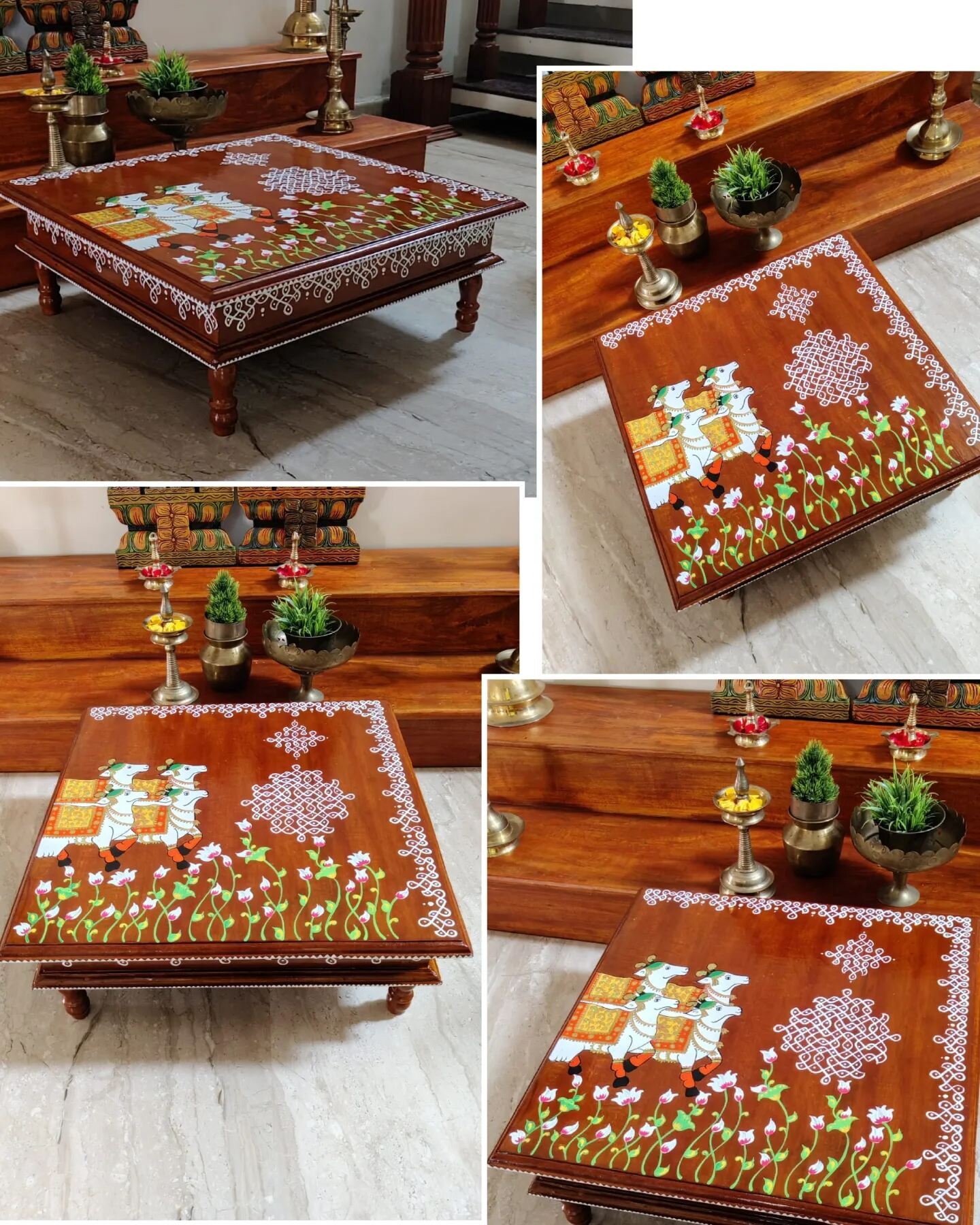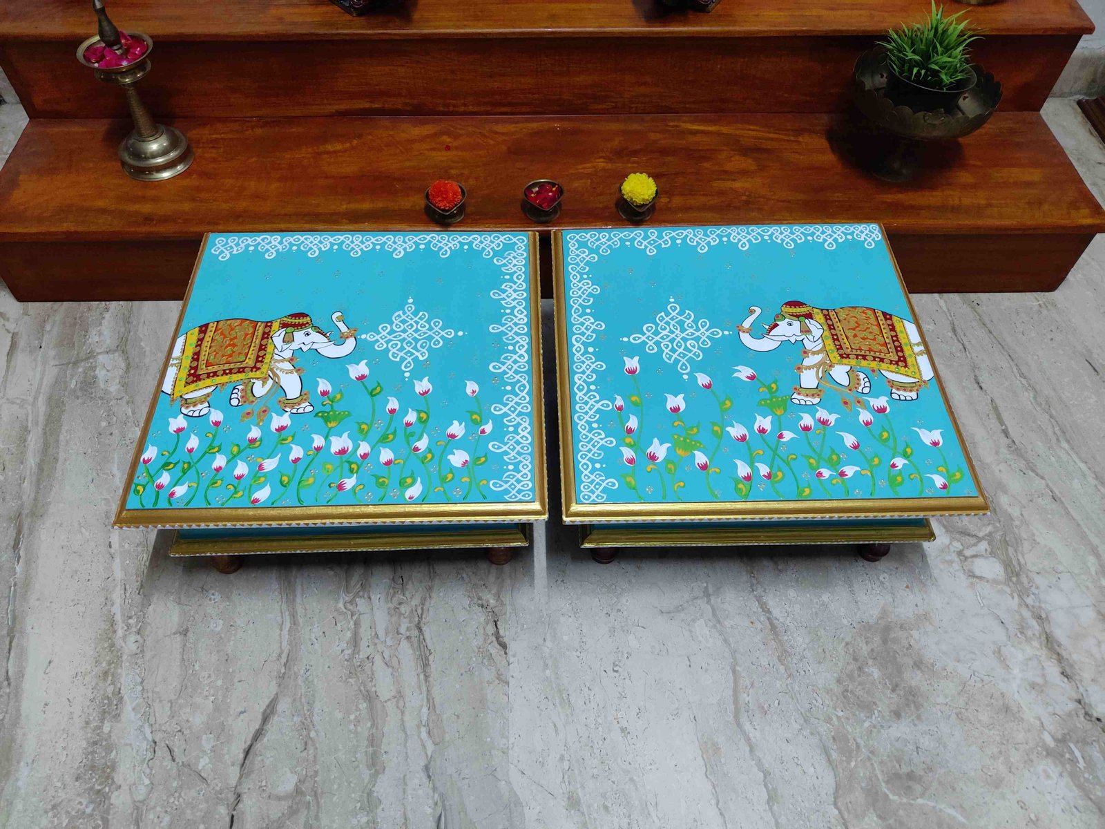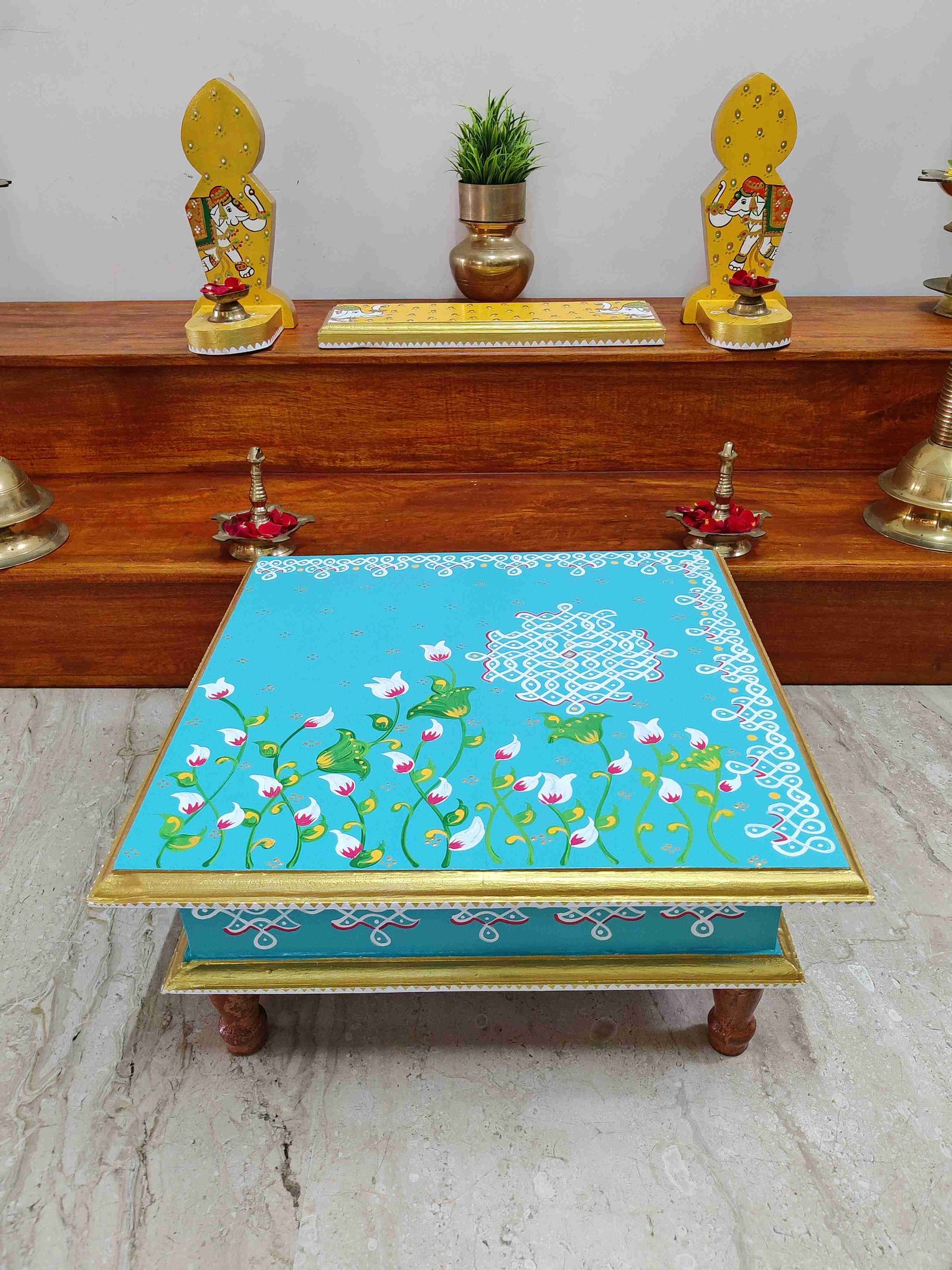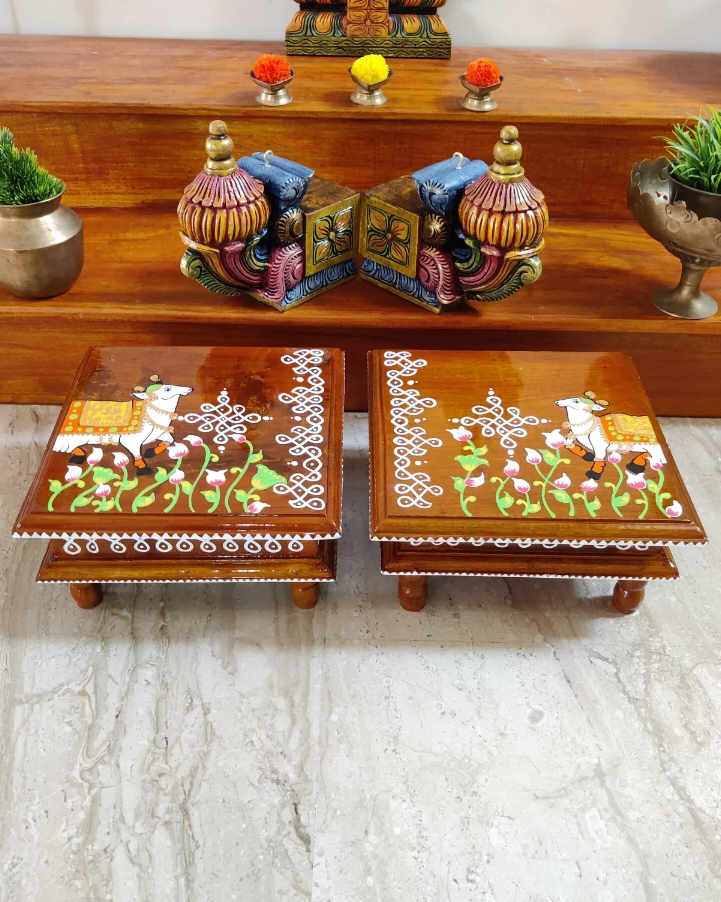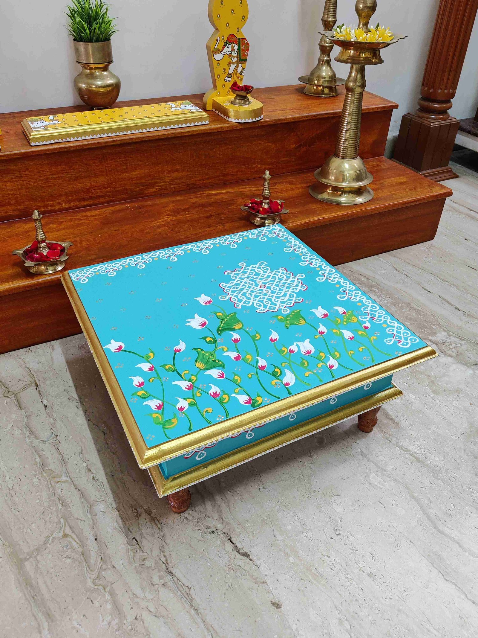 This is a traditional Square Style stools that have an increased height for sitting. This is the best option for those who need little raised stools for sitting. The best option for Display of Gods during Ganesh Chathurthi, Varalakshmi Pooja and Kalasams for Pooja. The bigger Size stools can be used as a side tables for Sofas / Couches. It can also be used as a traditional décor, display of heavy statues and other storage purposes. It can be done in wood finish only/ Painted