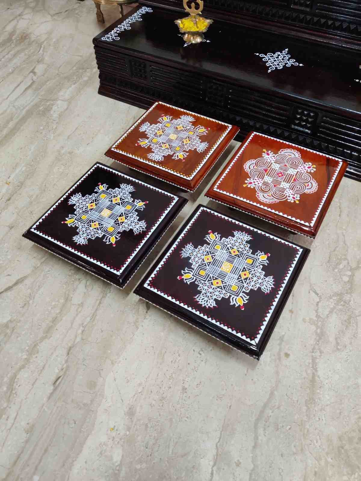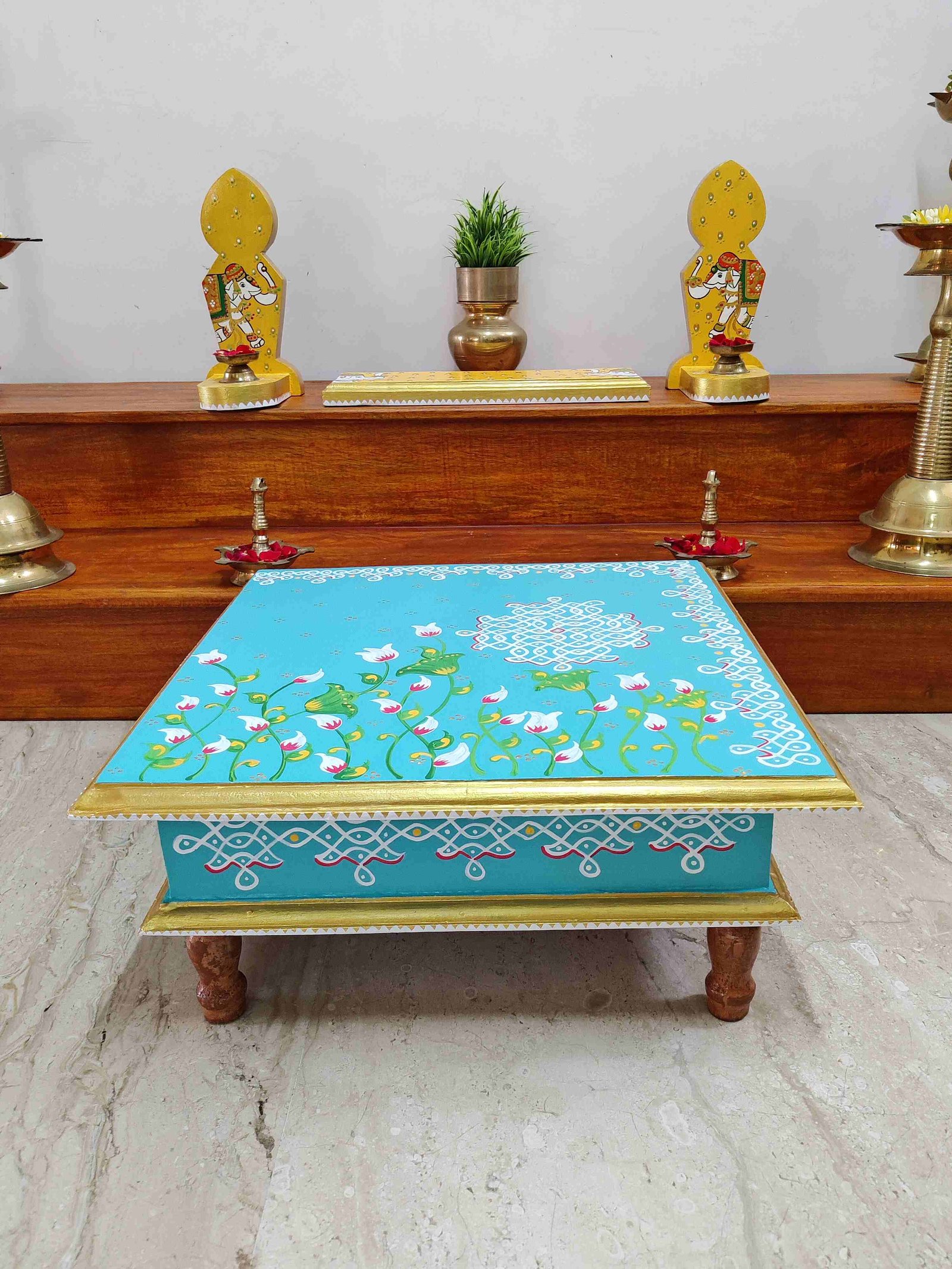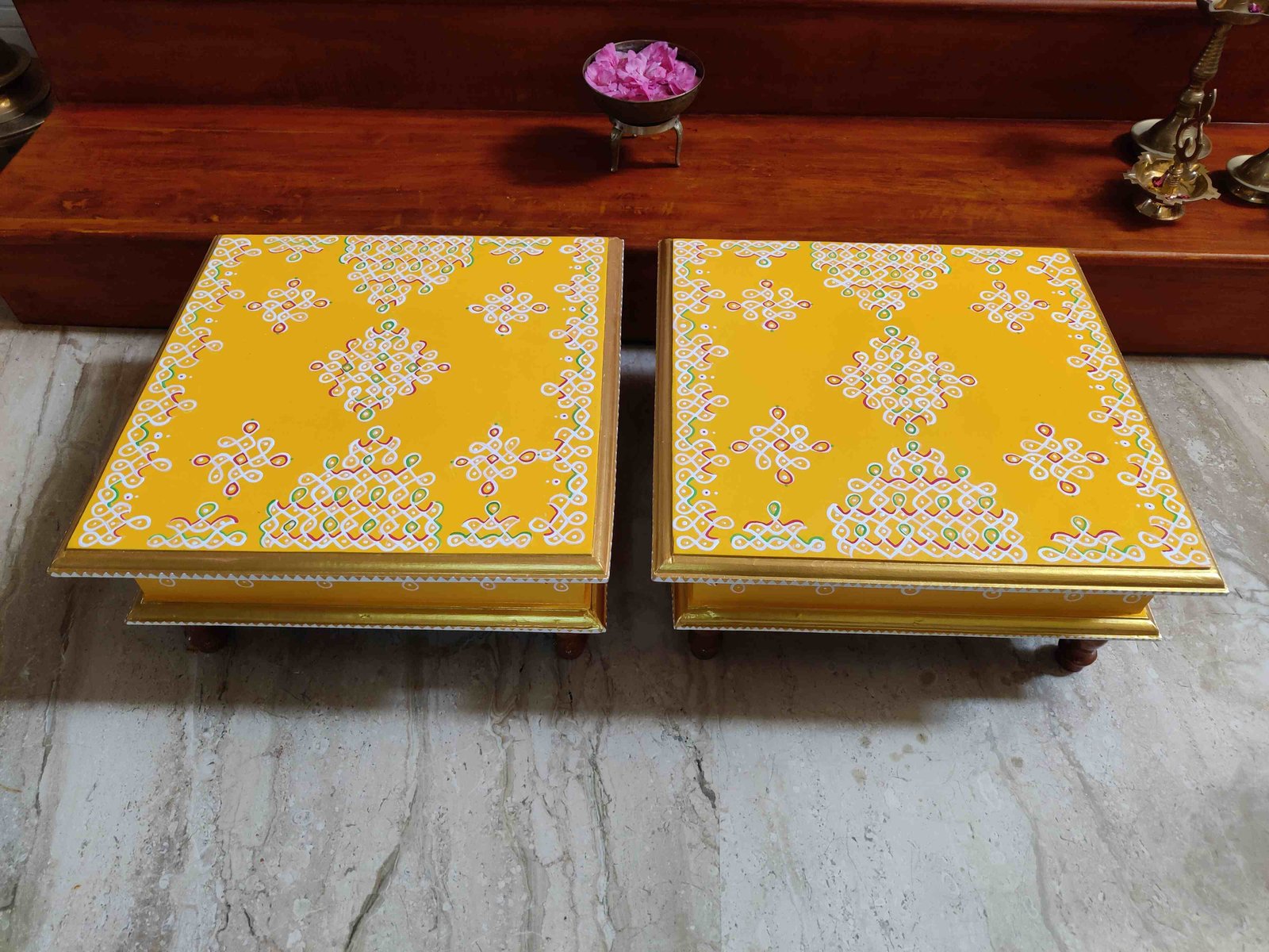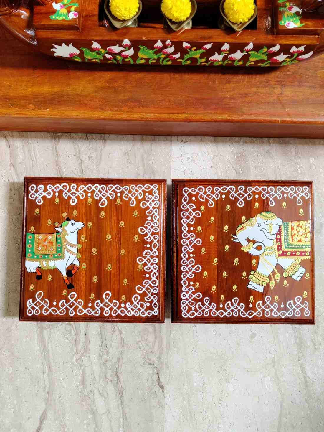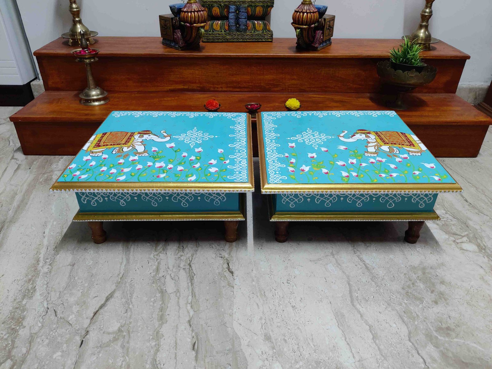 This is a traditional Square Style stools that have an increased height for sitting. This is the best option for those who need little raised stools for sitting. The best option for Display of Gods during Ganesh Chathurthi, Varalakshmi Pooja and Kalasams for Pooja. The bigger Size stools can be used as a side tables for Sofas / Couches. It can also be used as a traditional décor, display of heavy statues and other storage purposes. It can be done in wood finish only/ Painted