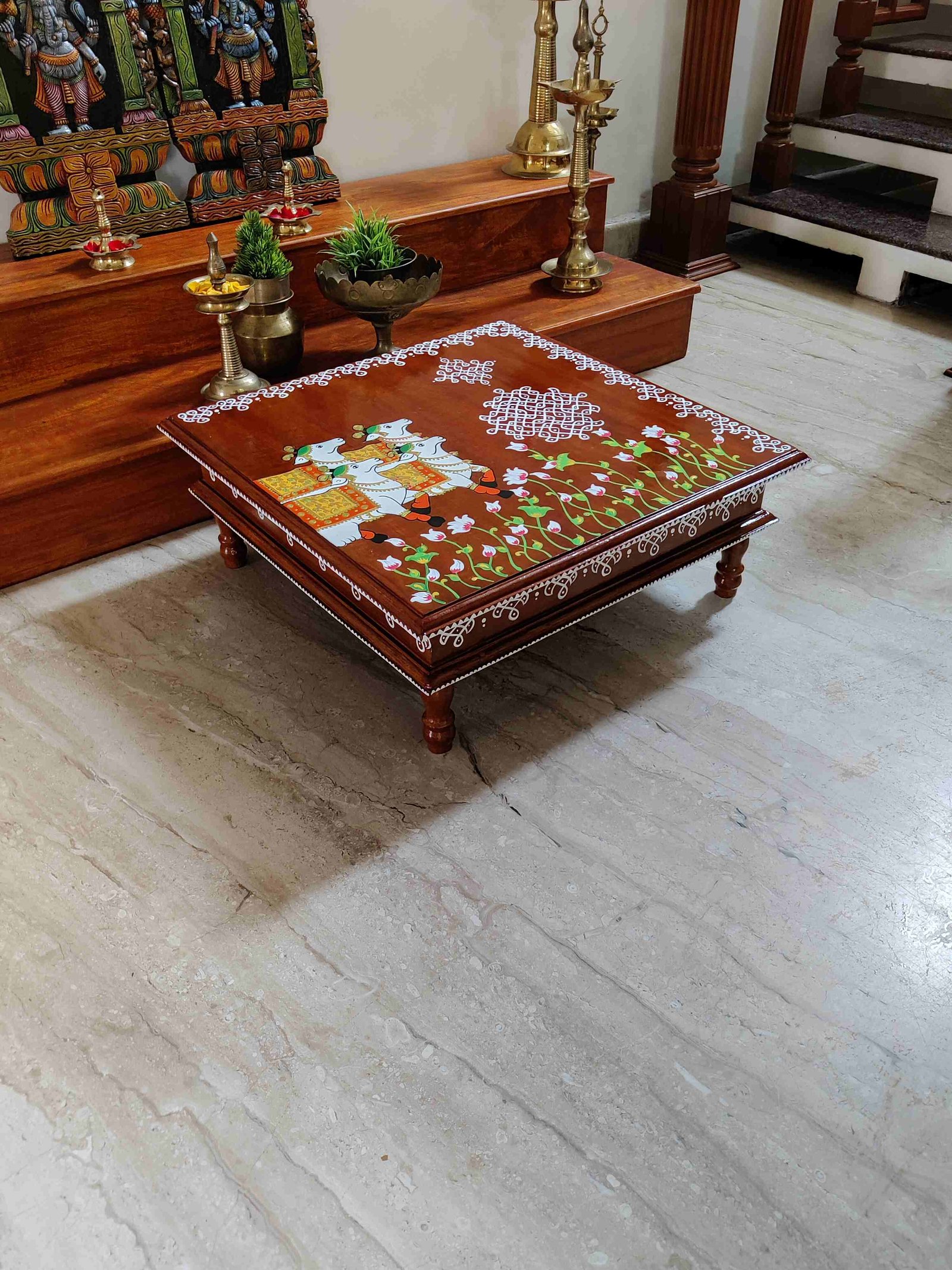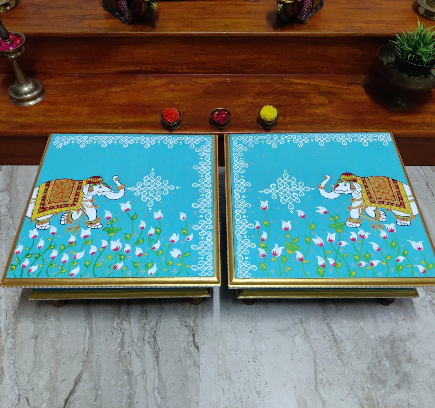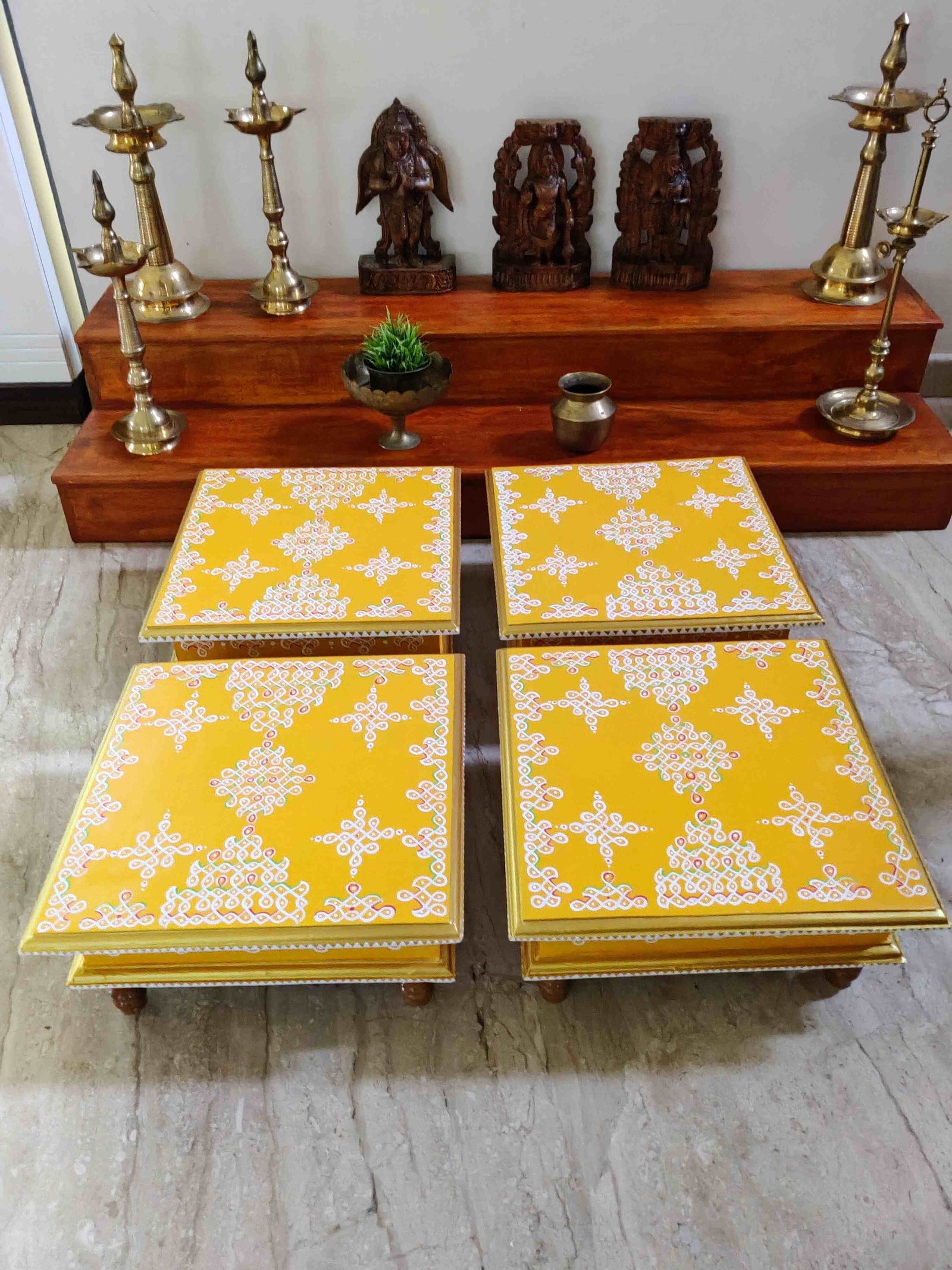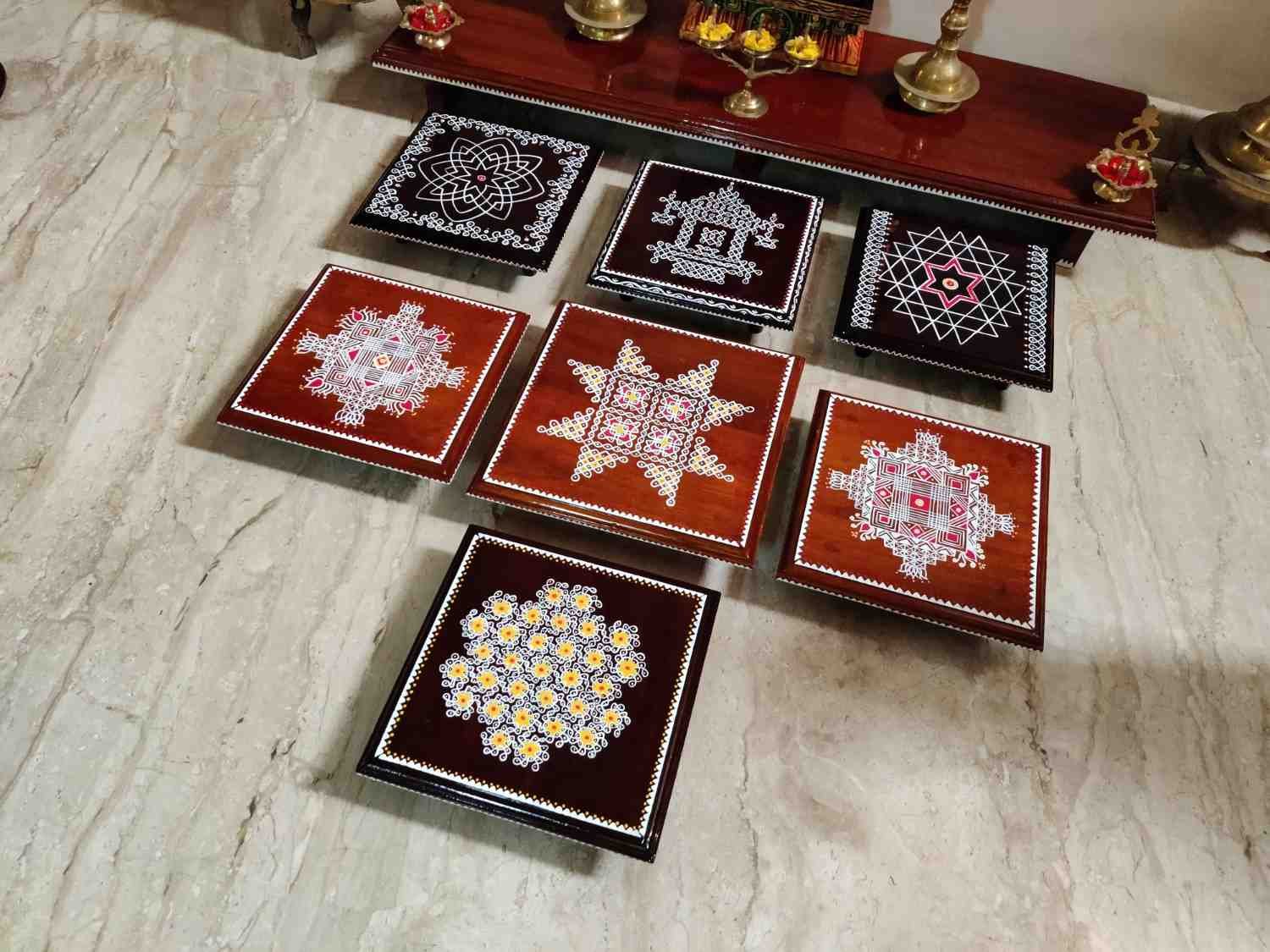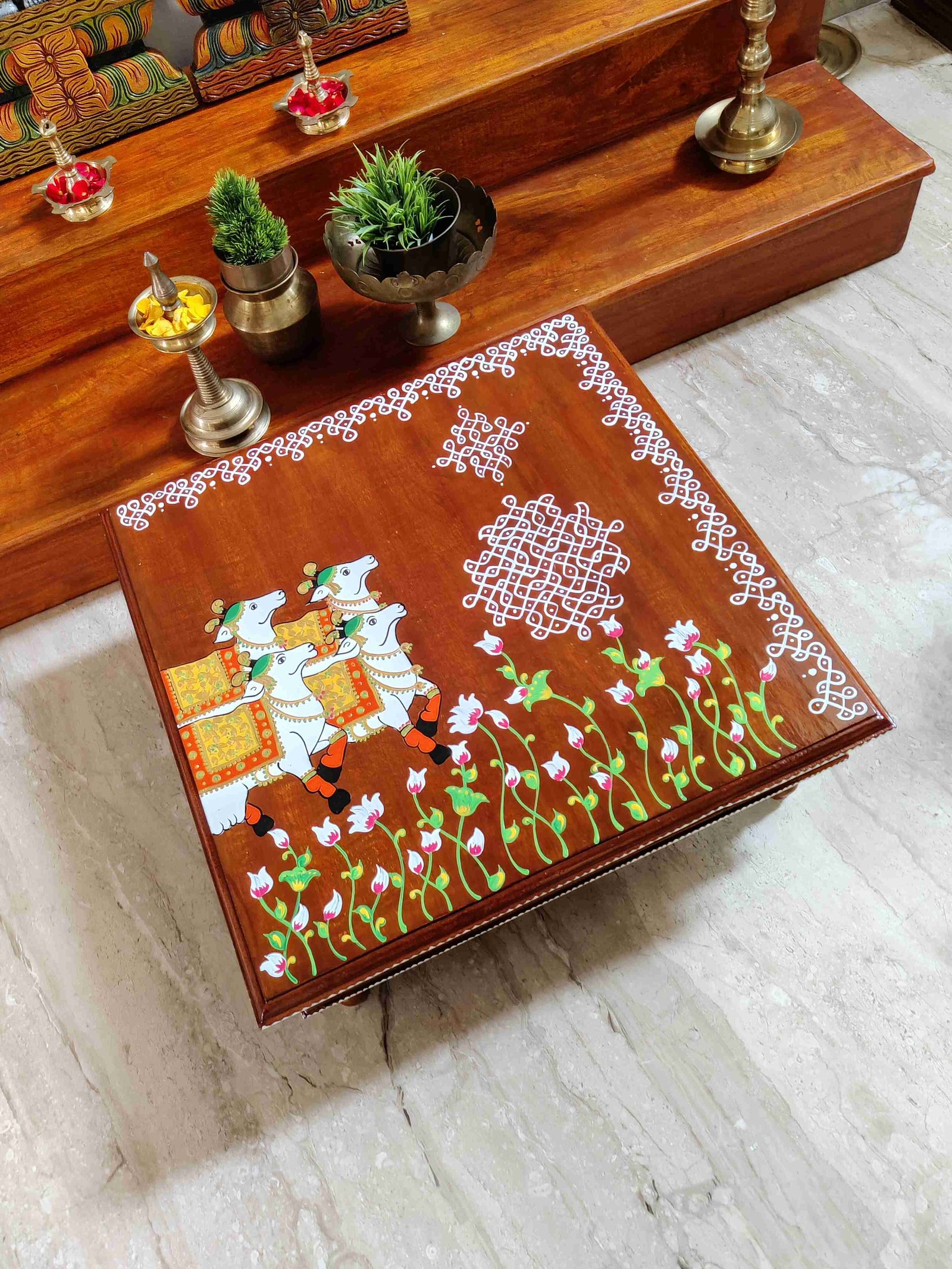 This is a traditional Square Style stools that have an increased height for sitting. This is the best option for those who need little raised stools for sitting. The best option for Display of Gods during Ganesh Chathurthi, Varalakshmi Pooja and Kalasams for Pooja. The bigger Size stools can be used as a side tables for Sofas / Couches. It can also be used as a traditional décor, display of heavy statues and other storage purposes. It can be done in wood finish only/ Painted