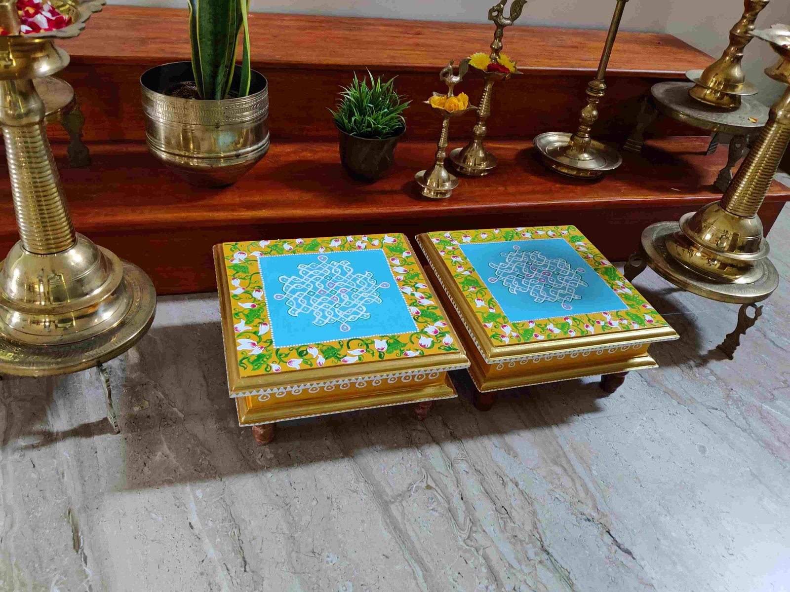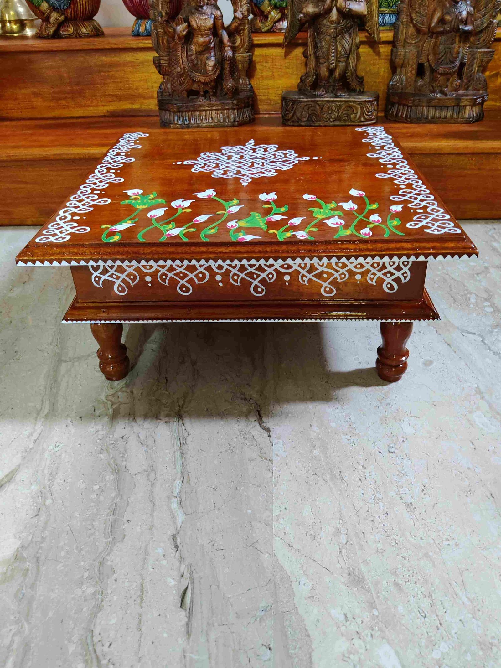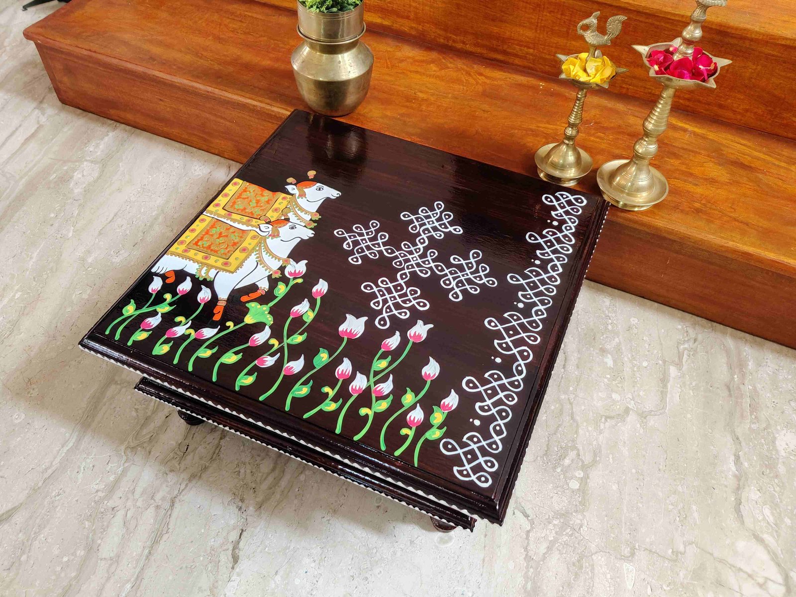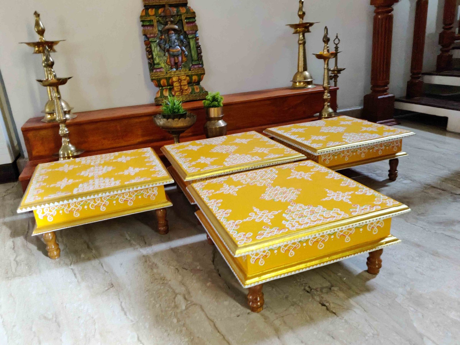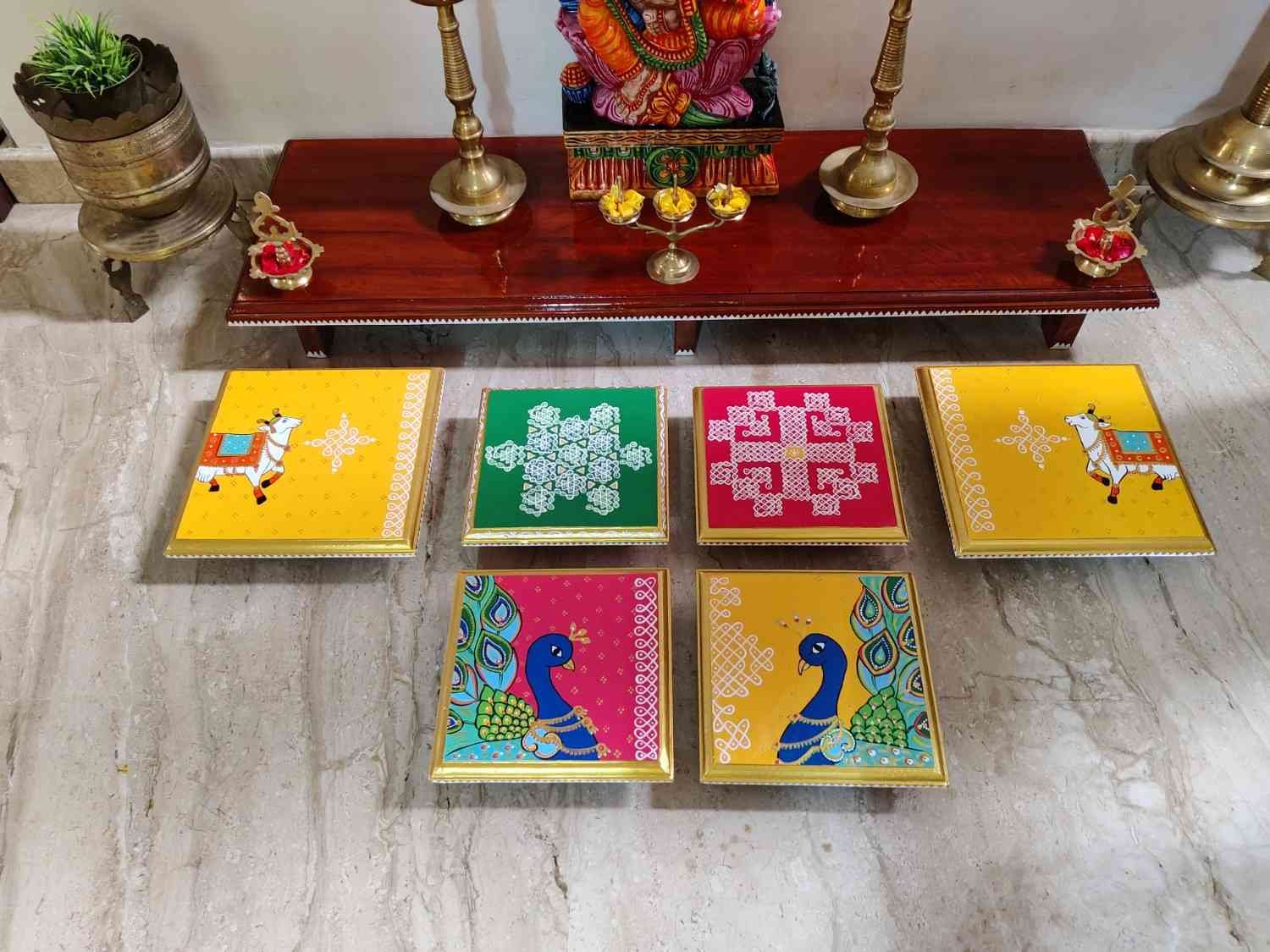 This is a traditional Square Style stools that have an increased height for sitting. This is the best option for those who need little raised stools for sitting. The best option for Display of Gods during Ganesh Chathurthi, Varalakshmi Pooja and Kalasams for Pooja. The bigger Size stools can be used as a side tables for Sofas / Couches. It can also be used as a traditional décor, display of heavy statues and other storage purposes. It can be done in wood finish only/ Painted