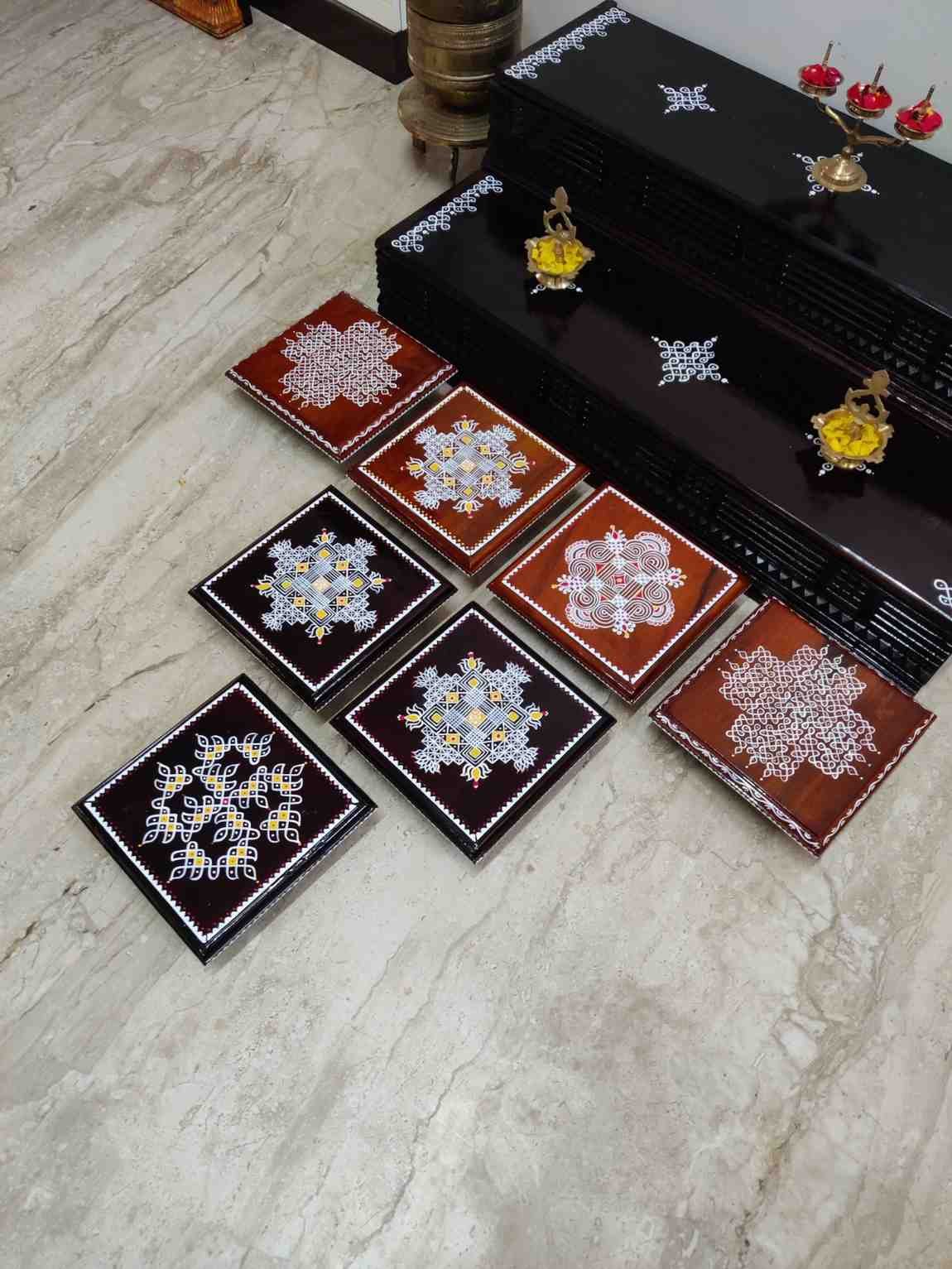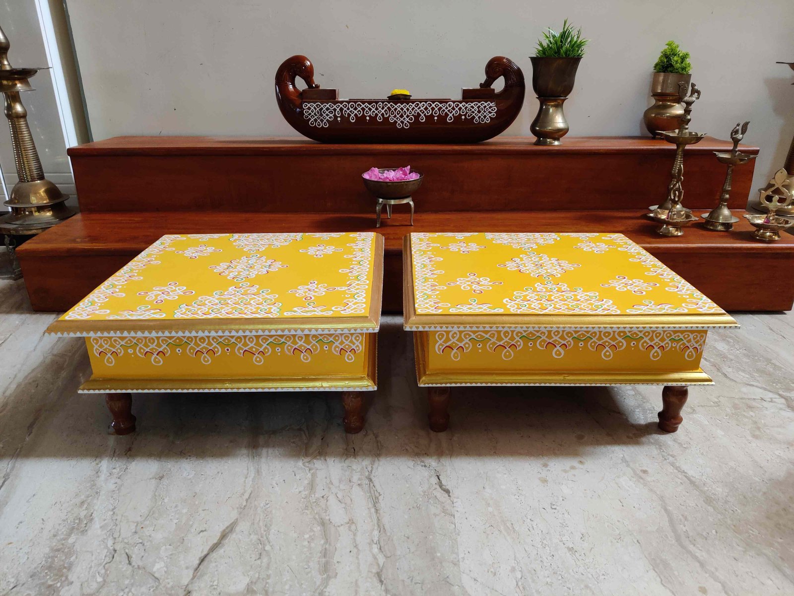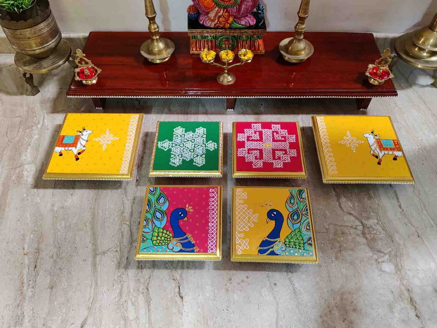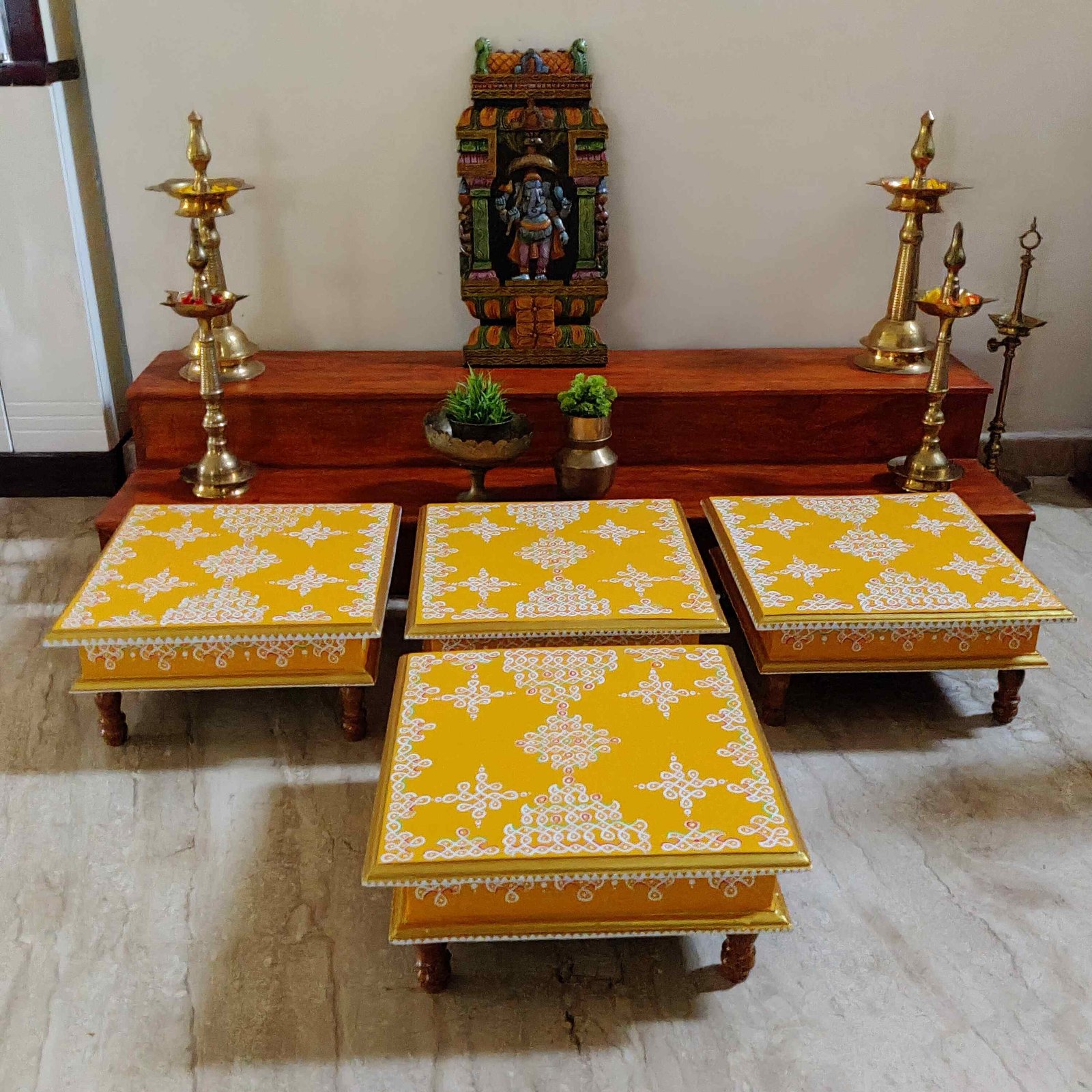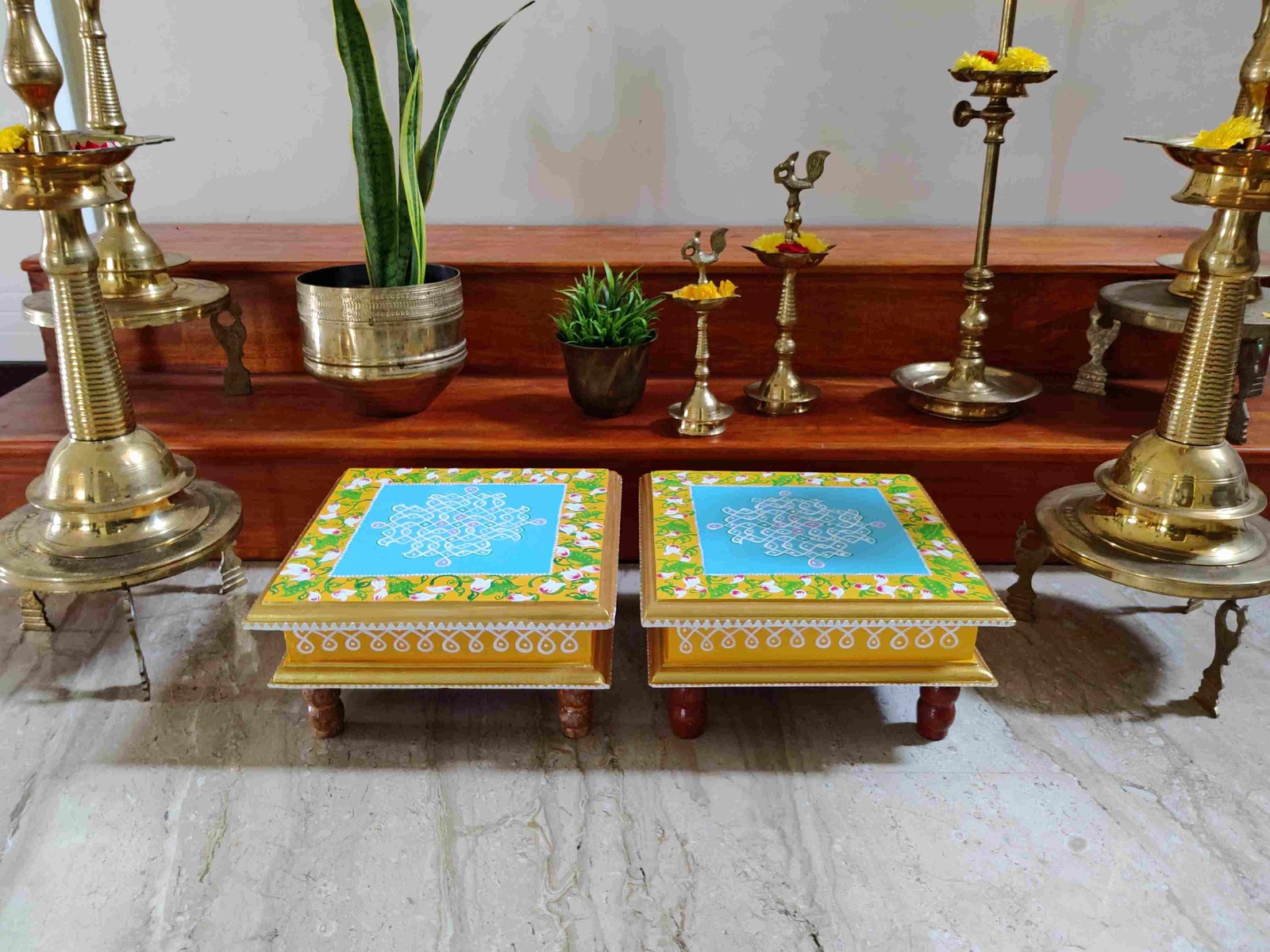 This is a traditional Square Style stools that have an increased height for sitting. This is the best option for those who need little raised stools for sitting. The best option for Display of Gods during Ganesh Chathurthi, Varalakshmi Pooja and Kalasams for Pooja. The bigger Size stools can be used as a side tables for Sofas / Couches. It can also be used as a traditional décor, display of heavy statues and other storage purposes. It can be done in wood finish only/ Painted