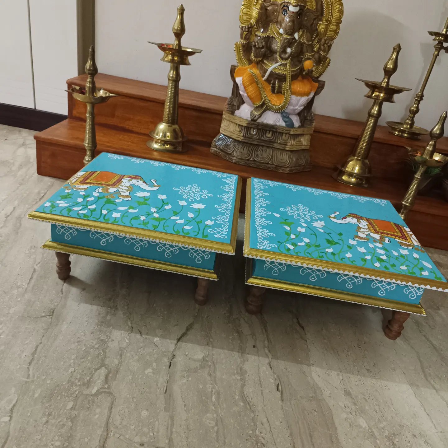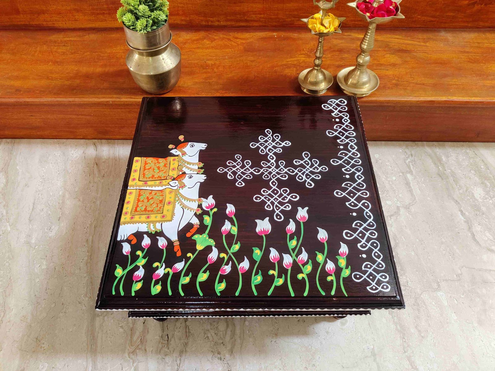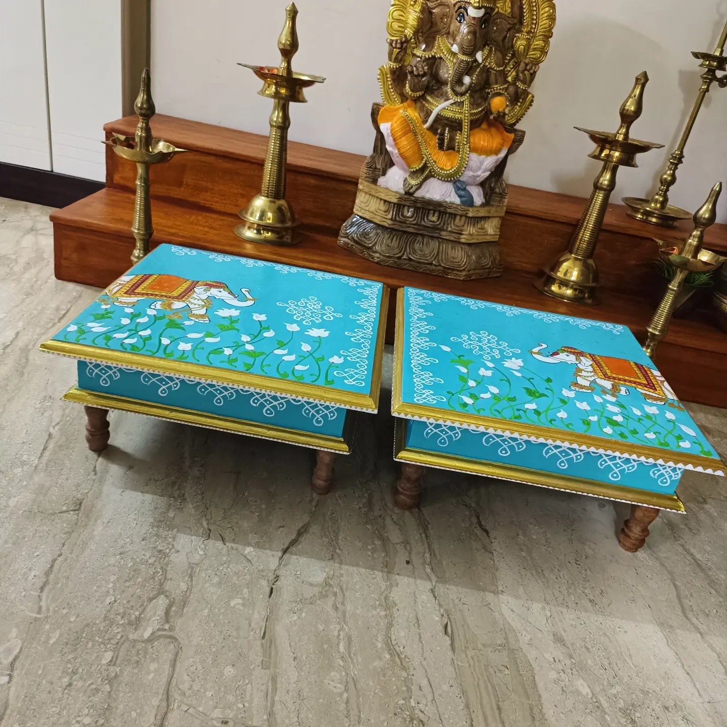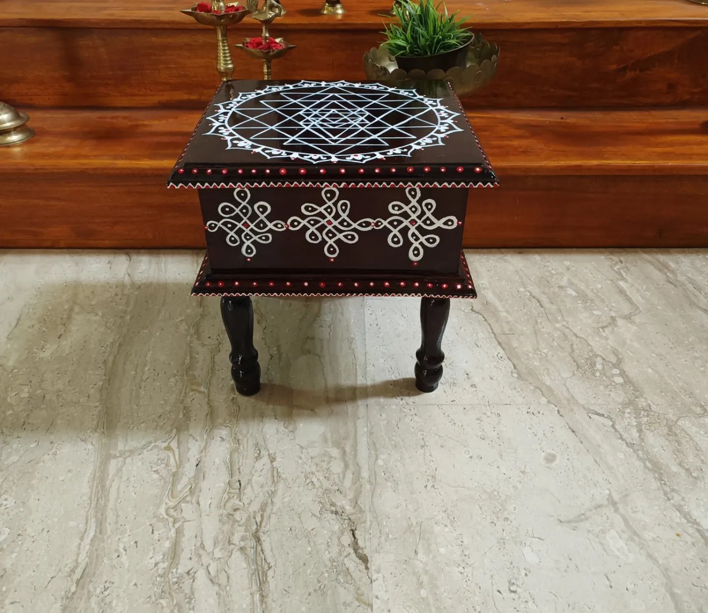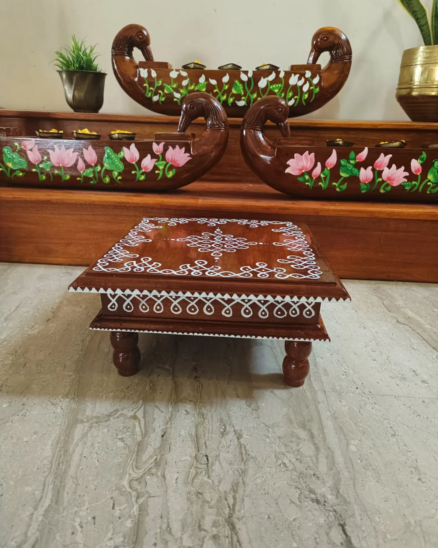 This is a traditional Square Style stools that have an increased height for sitting. This is the best option for those who need little raised stools for sitting. The best option for Display of Gods during Ganesh Chathurthi, Varalakshmi Pooja and Kalasams for Pooja. The bigger Size stools can be used as a side tables for Sofas / Couches. It can also be used as a traditional décor, display of heavy statues and other storage purposes. It can be done in wood finish only/ Painted