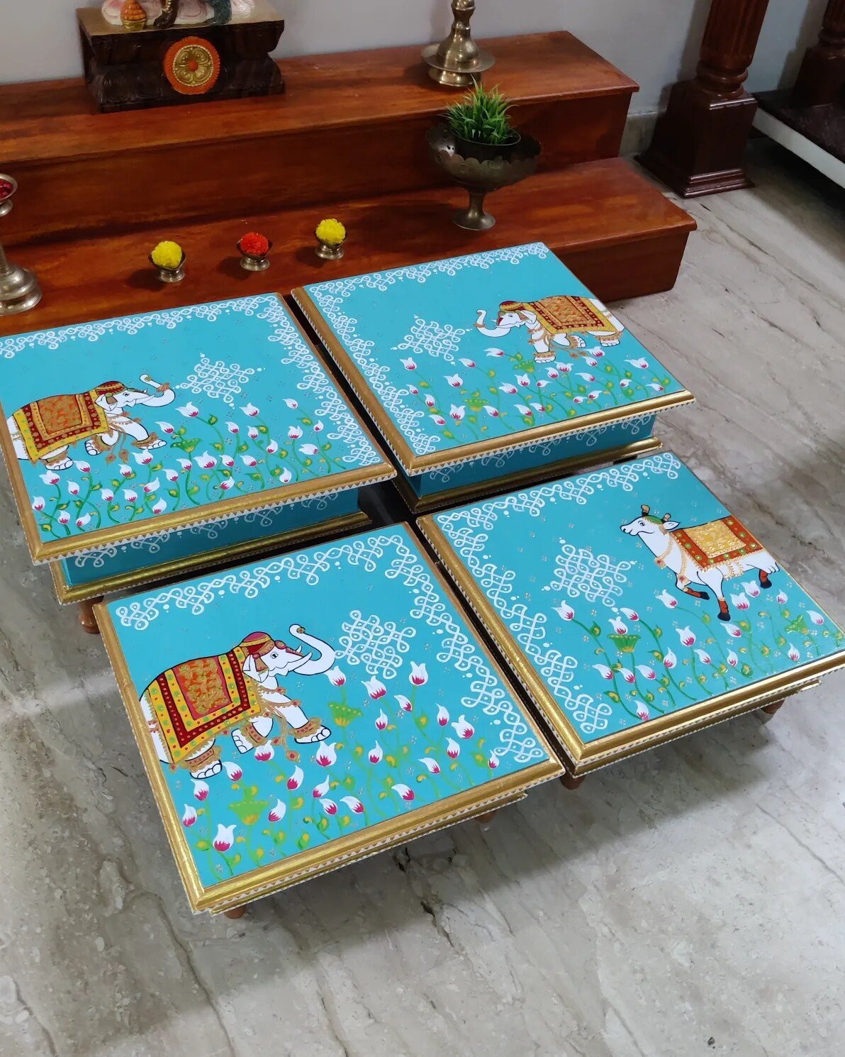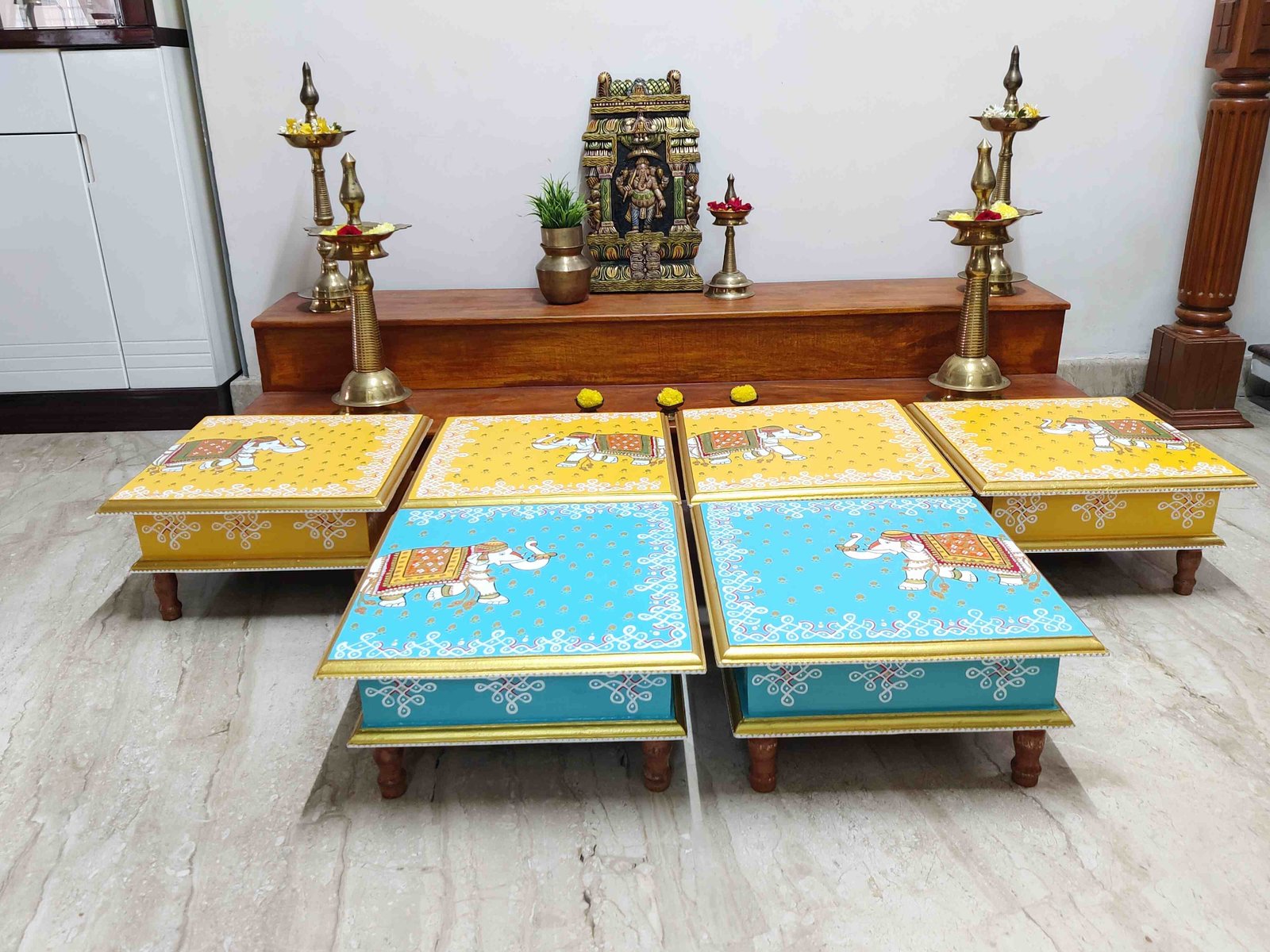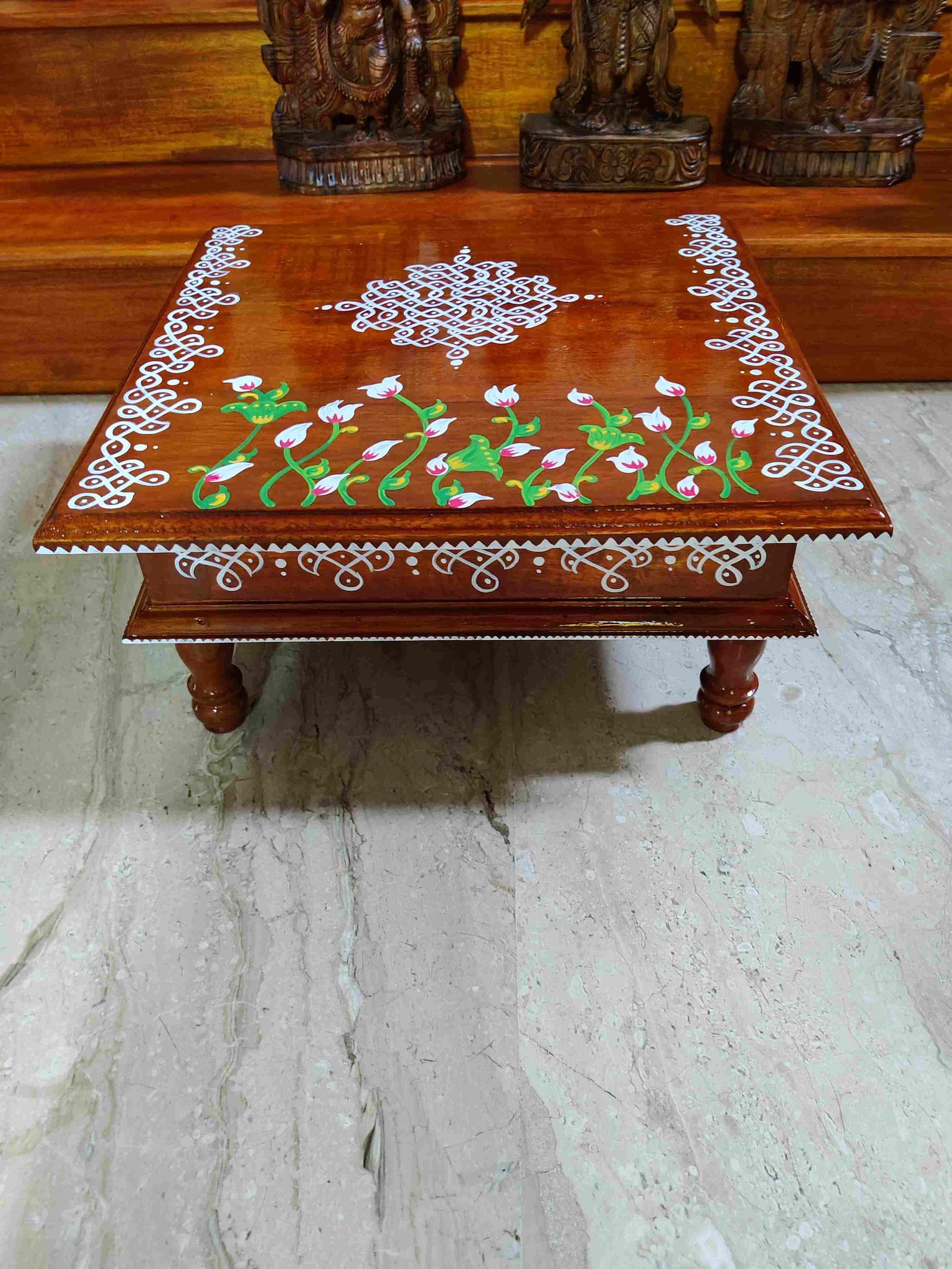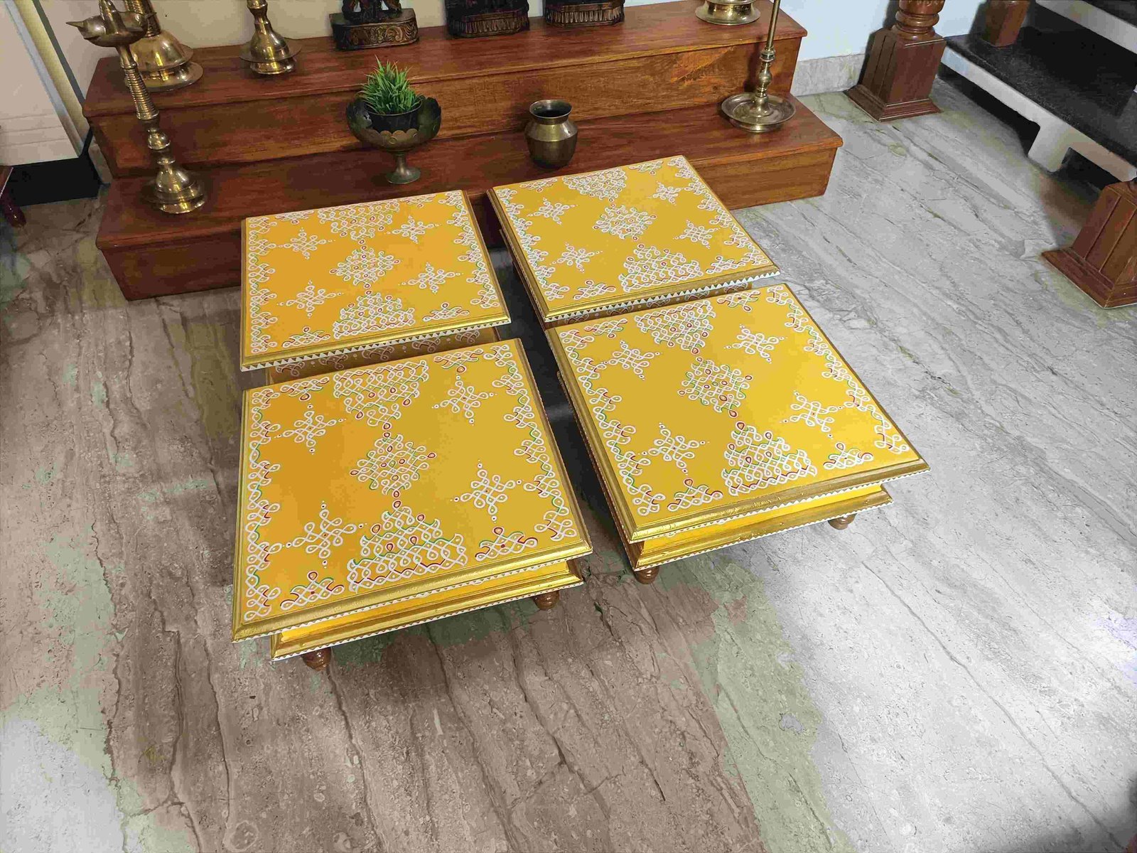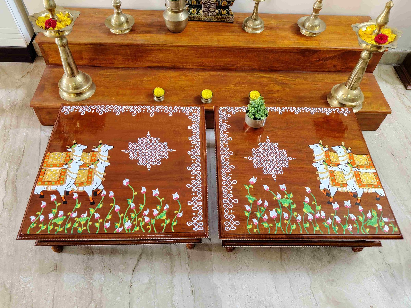 This is a traditional Square Style stools that have an increased height for sitting. This is the best option for those who need little raised stools for sitting. The best option for Display of Gods during Ganesh Chathurthi, Varalakshmi Pooja and Kalasams for Pooja. The bigger Size stools can be used as a side tables for Sofas / Couches. It can also be used as a traditional décor, display of heavy statues and other storage purposes. It can be done in wood finish only/ Painted