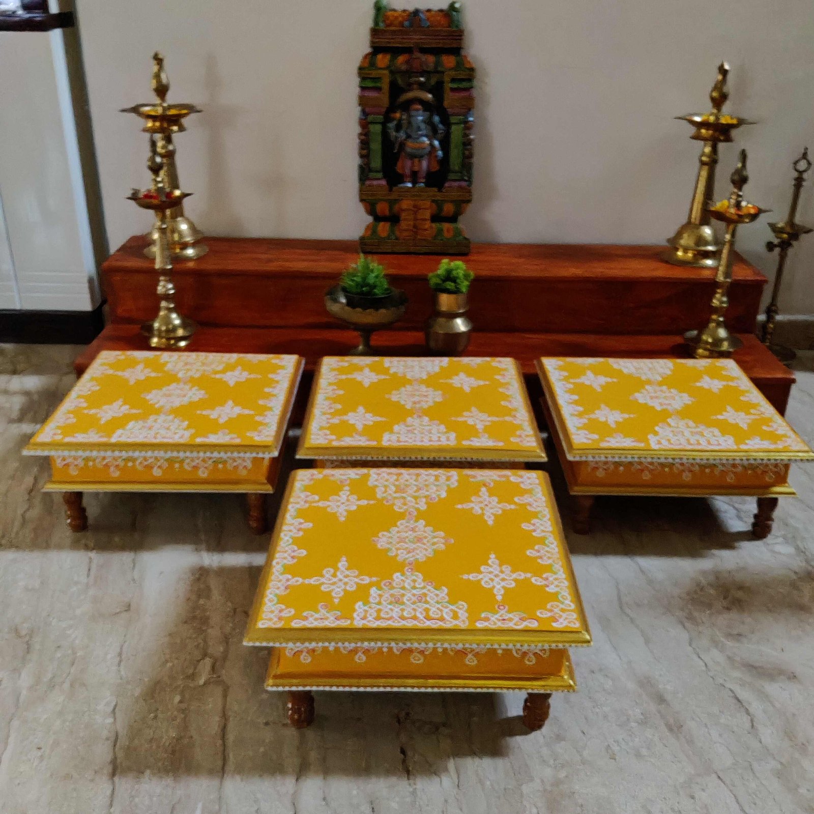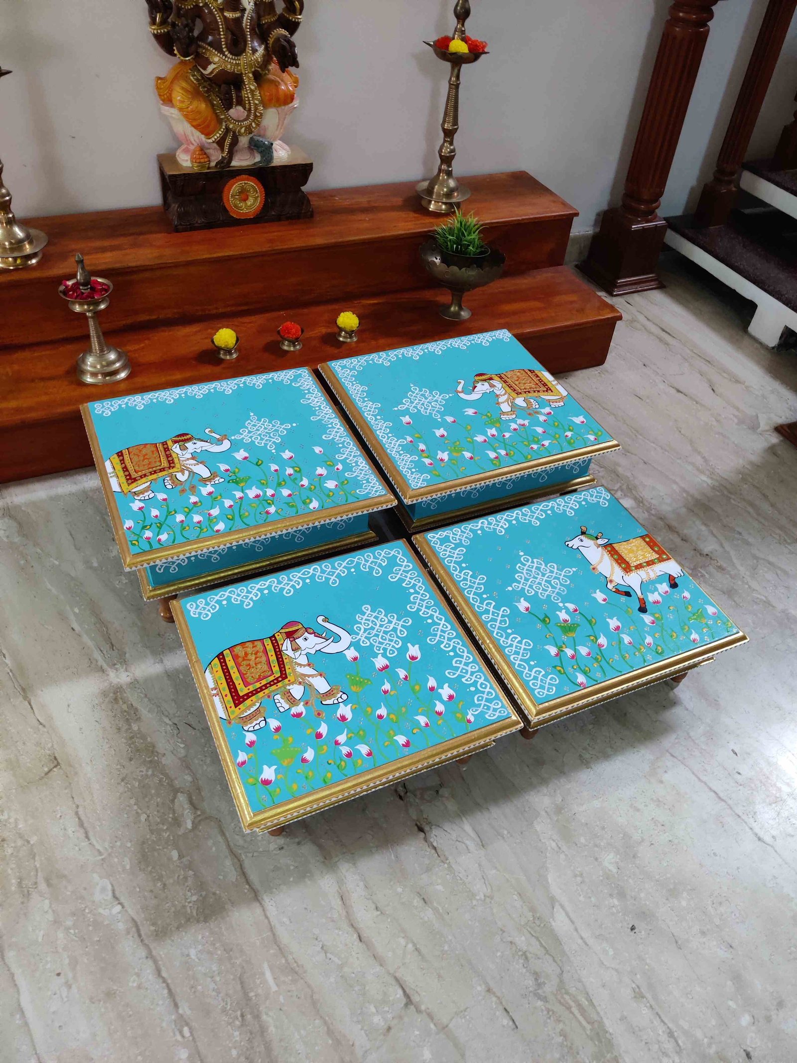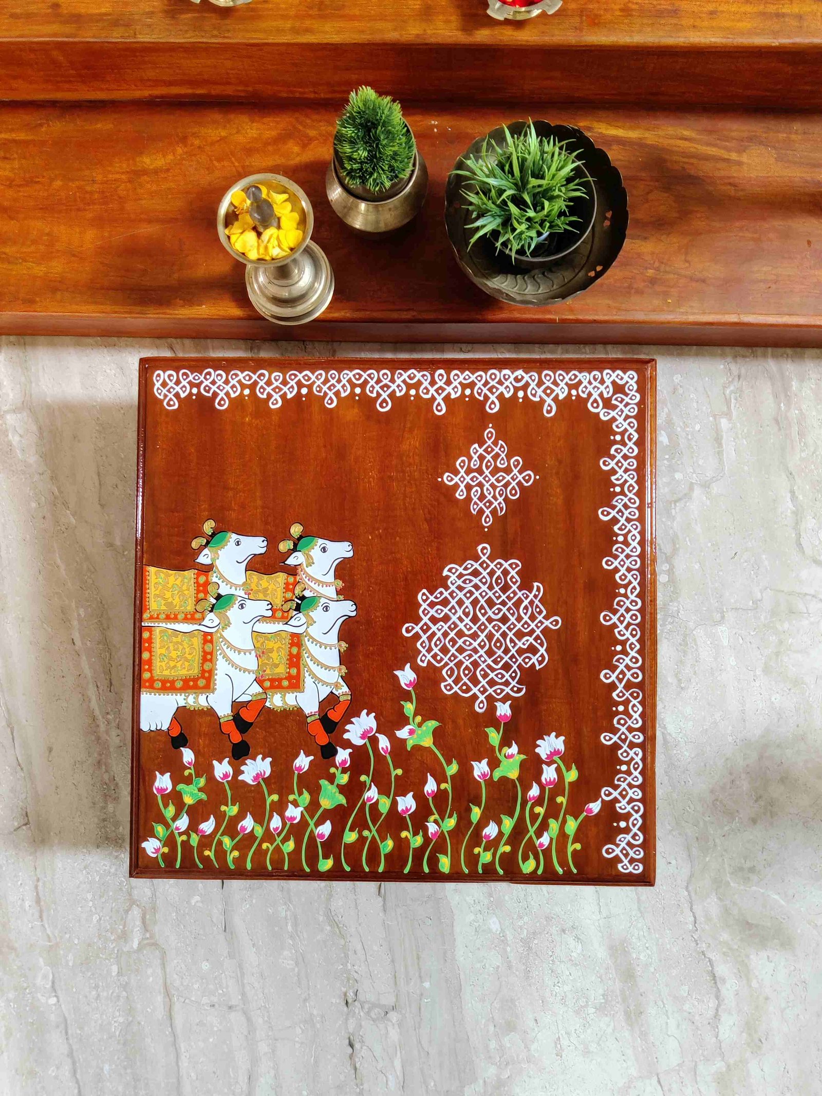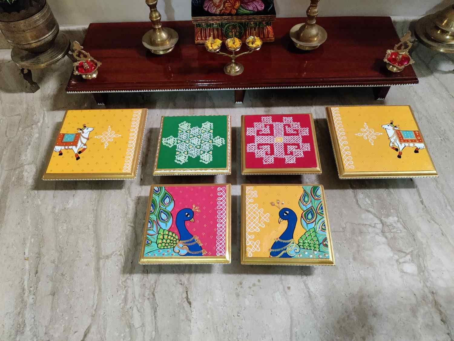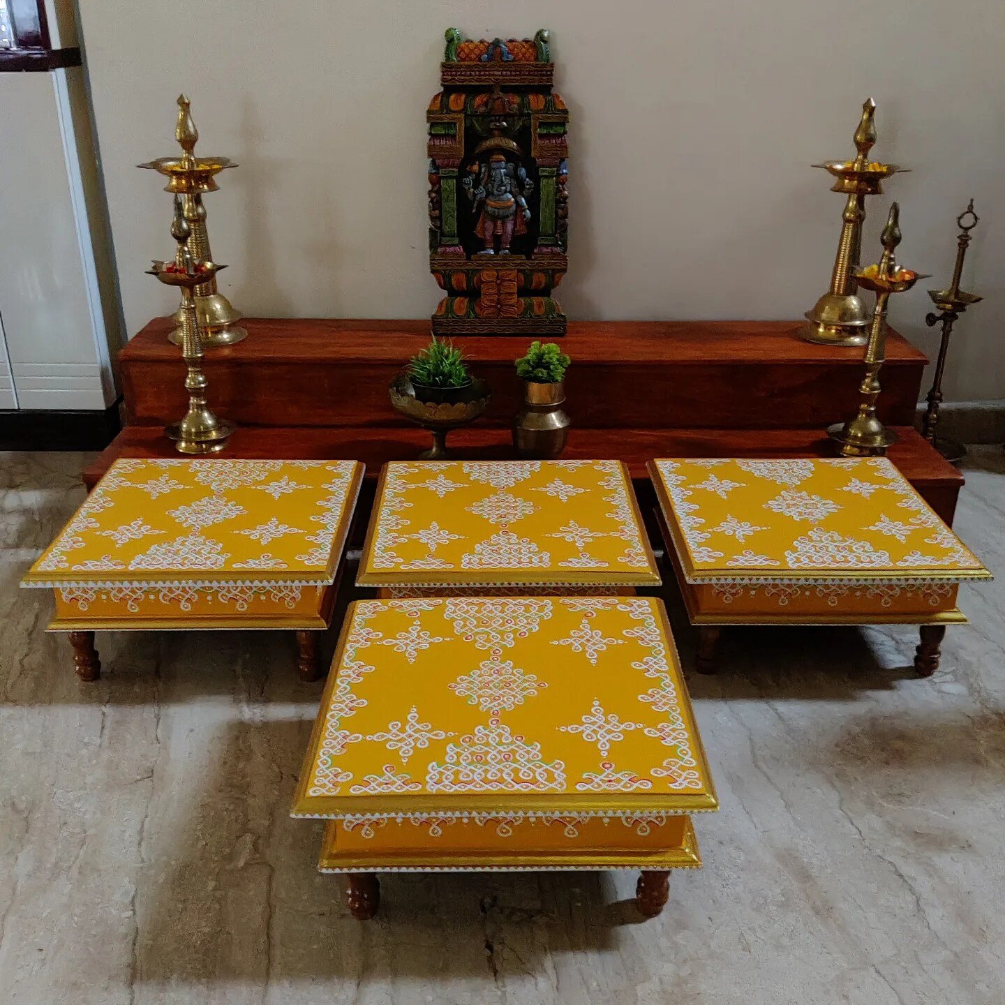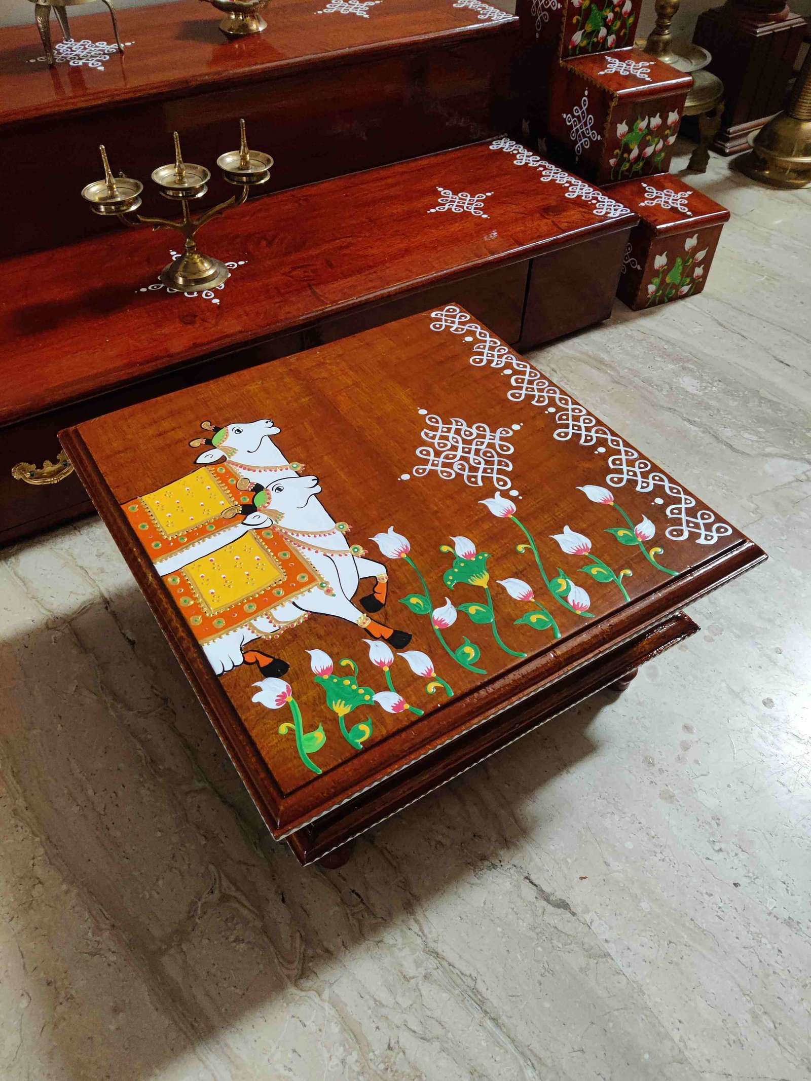 This is a traditional Square Style stools that have an increased height for sitting. This is the best option for those who need little raised stools for sitting. The best option for Display of Gods during Ganesh Chathurthi, Varalakshmi Pooja and Kalasams for Pooja. The bigger Size stools can be used as a side tables for Sofas / Couches. It can also be used as a traditional décor, display of heavy statues and other storage purposes. It can be done in wood finish only/ Painted