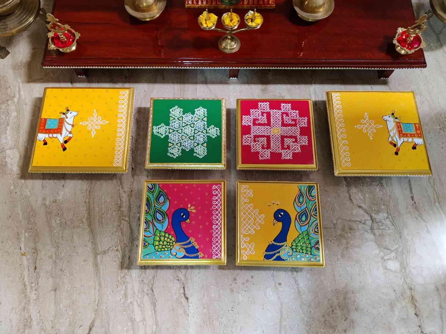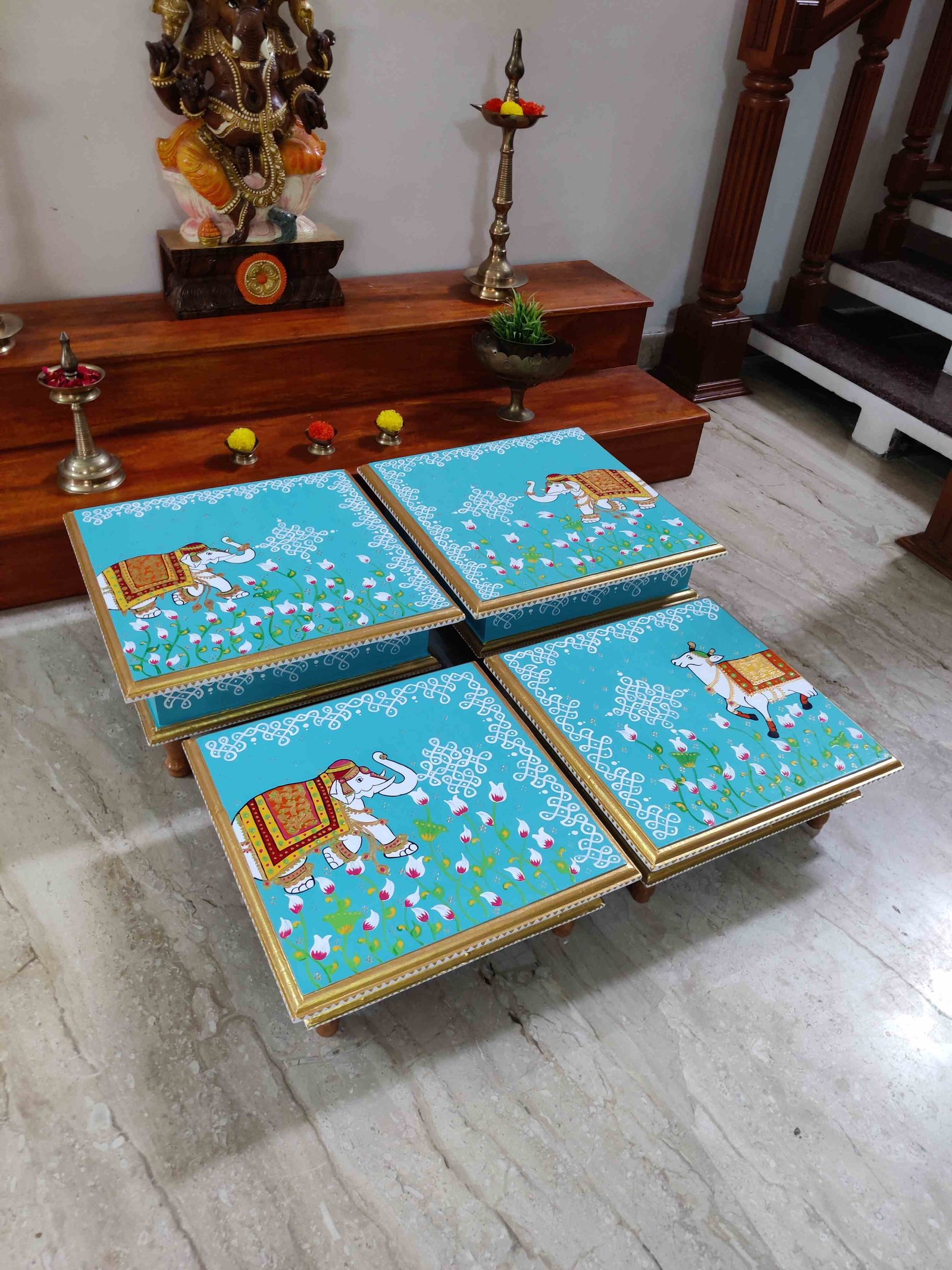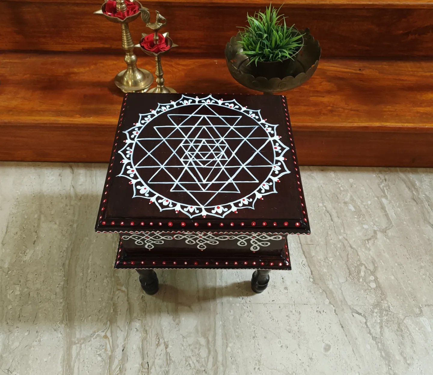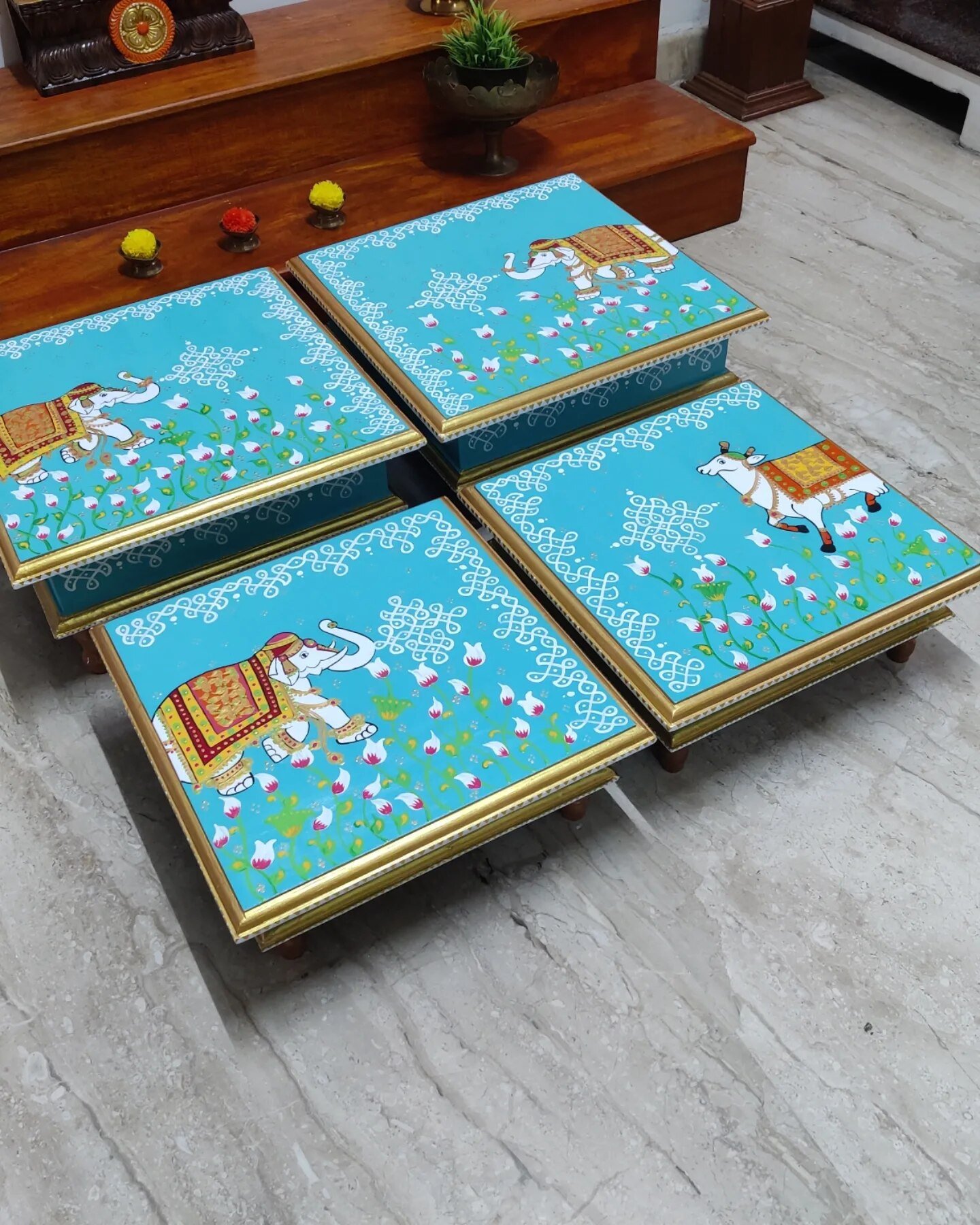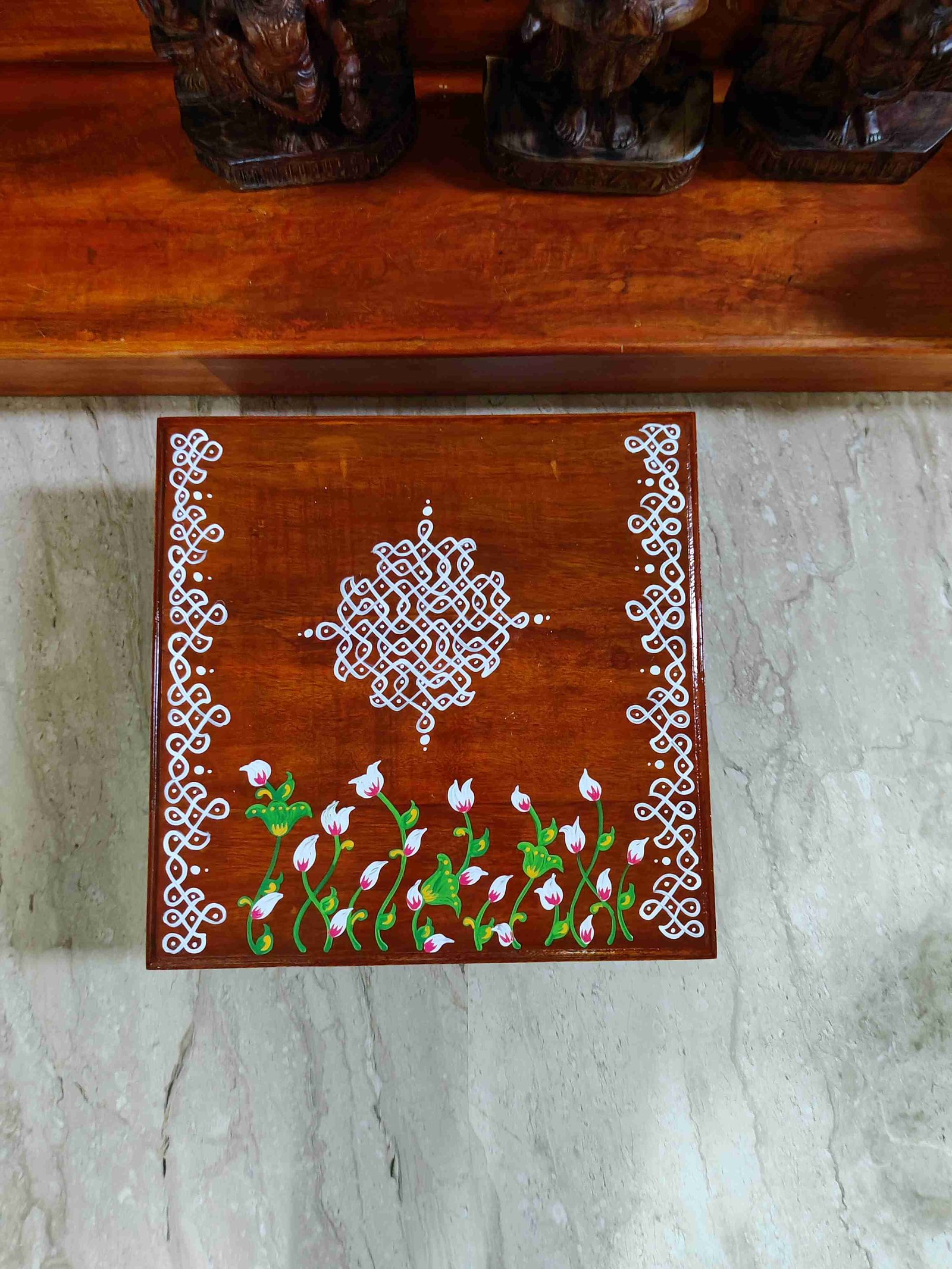 This is a traditional Square Style stools that have an increased height for sitting. This is the best option for those who need little raised stools for sitting. The best option for Display of Gods during Ganesh Chathurthi, Varalakshmi Pooja and Kalasams for Pooja. The bigger Size stools can be used as a side tables for Sofas / Couches. It can also be used as a traditional décor, display of heavy statues and other storage purposes. It can be done in wood finish only/ Painted