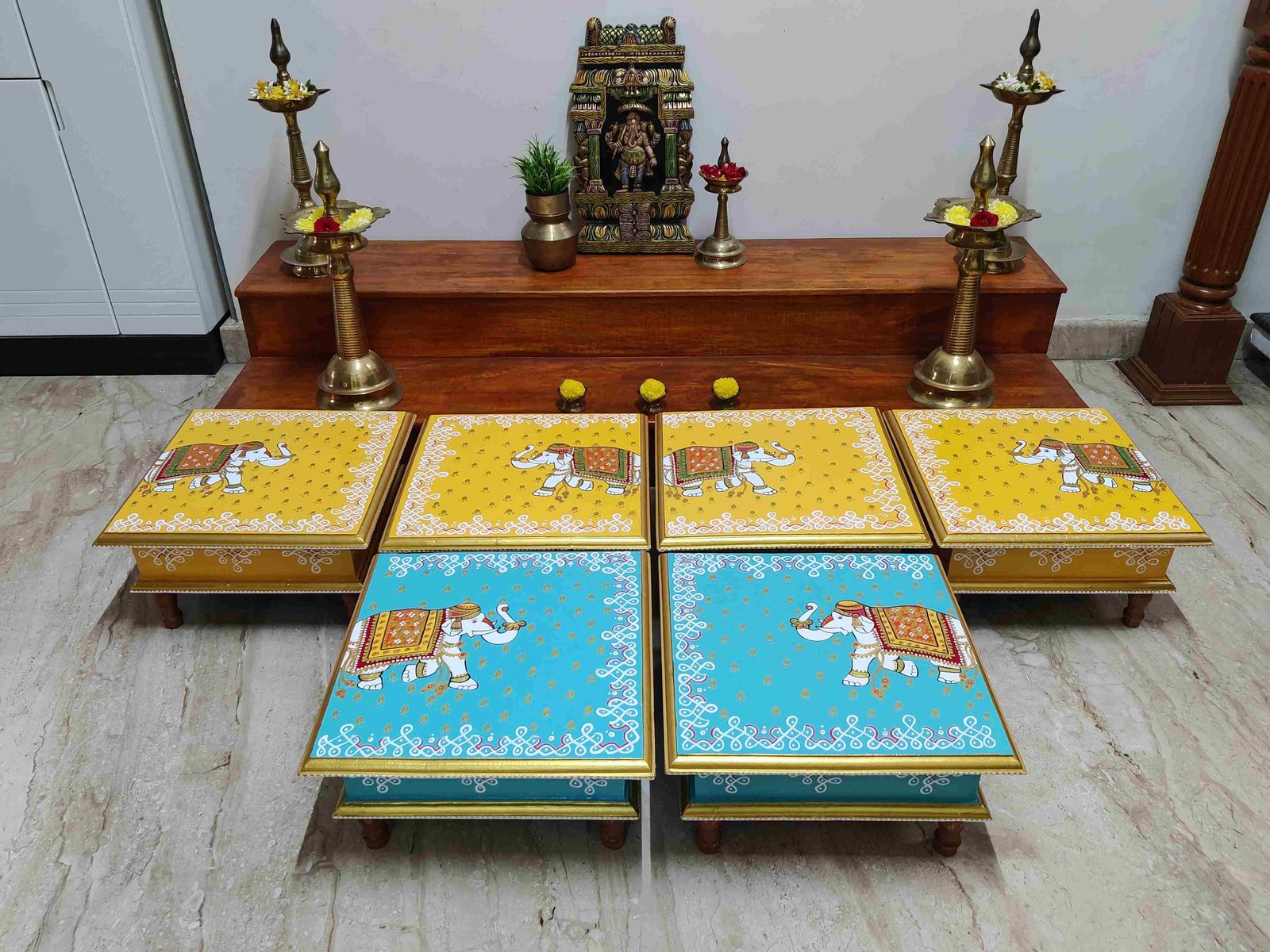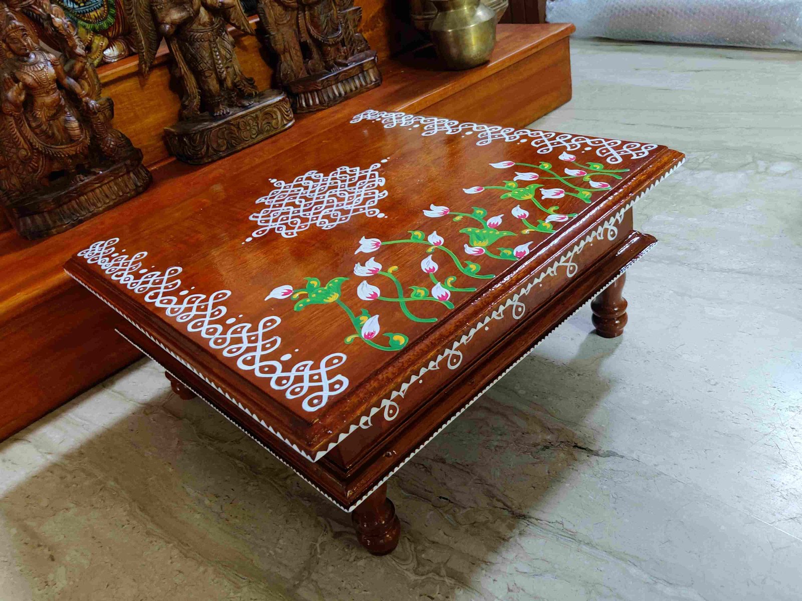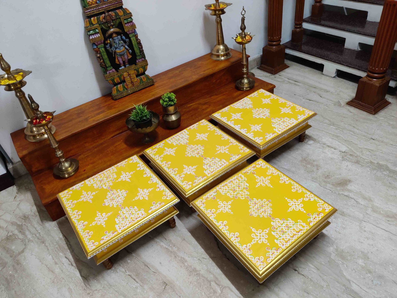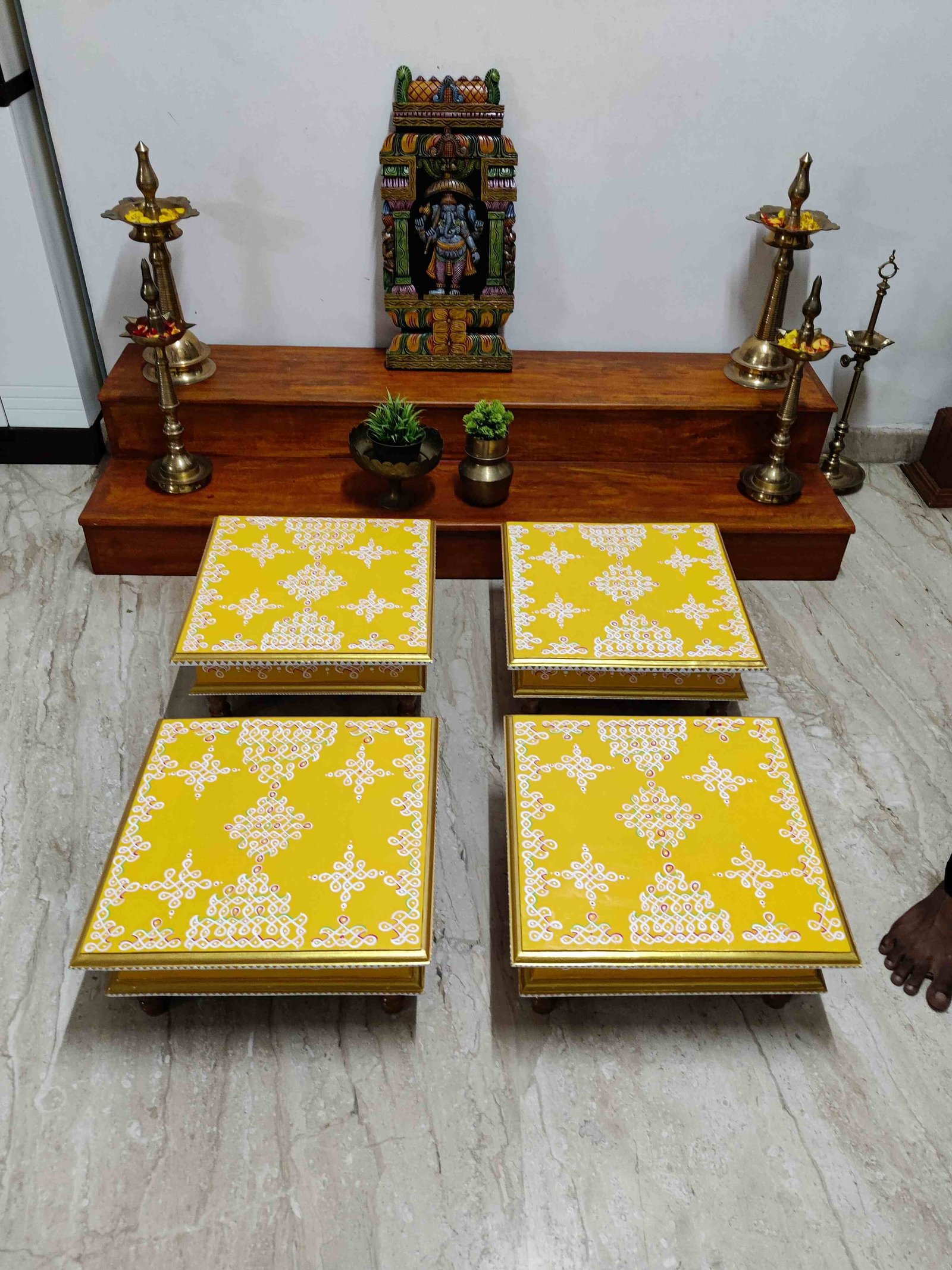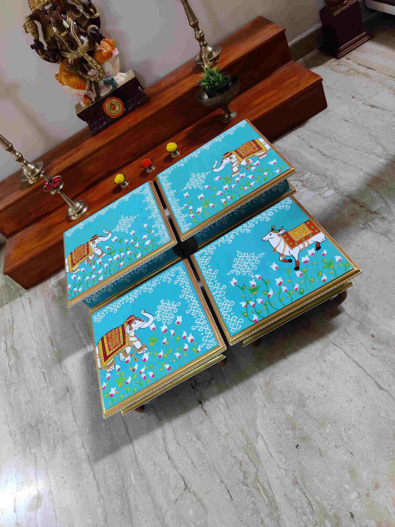 This is a traditional Square Style stools that have an increased height for sitting. This is the best option for those who need little raised stools for sitting. The best option for Display of Gods during Ganesh Chathurthi, Varalakshmi Pooja and Kalasams for Pooja. The bigger Size stools can be used as a side tables for Sofas / Couches. It can also be used as a traditional décor, display of heavy statues and other storage purposes. It can be done in wood finish only/ Painted