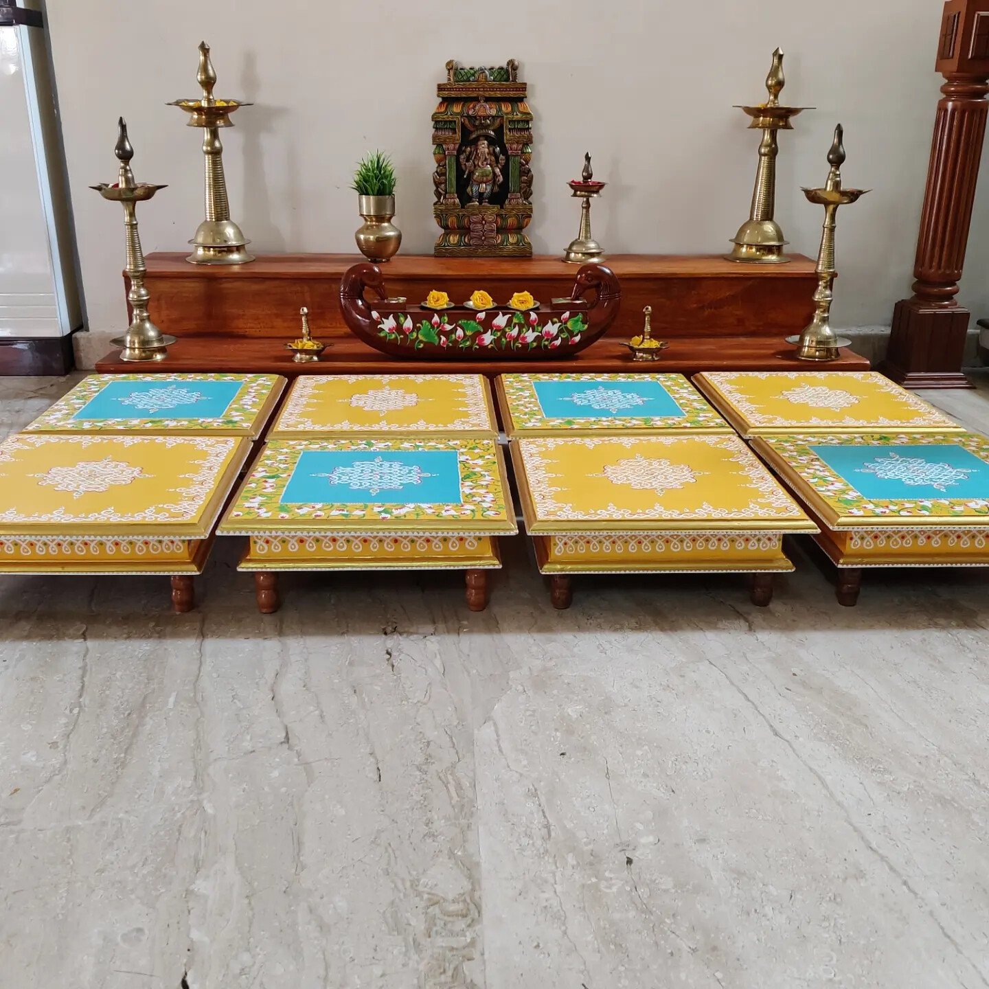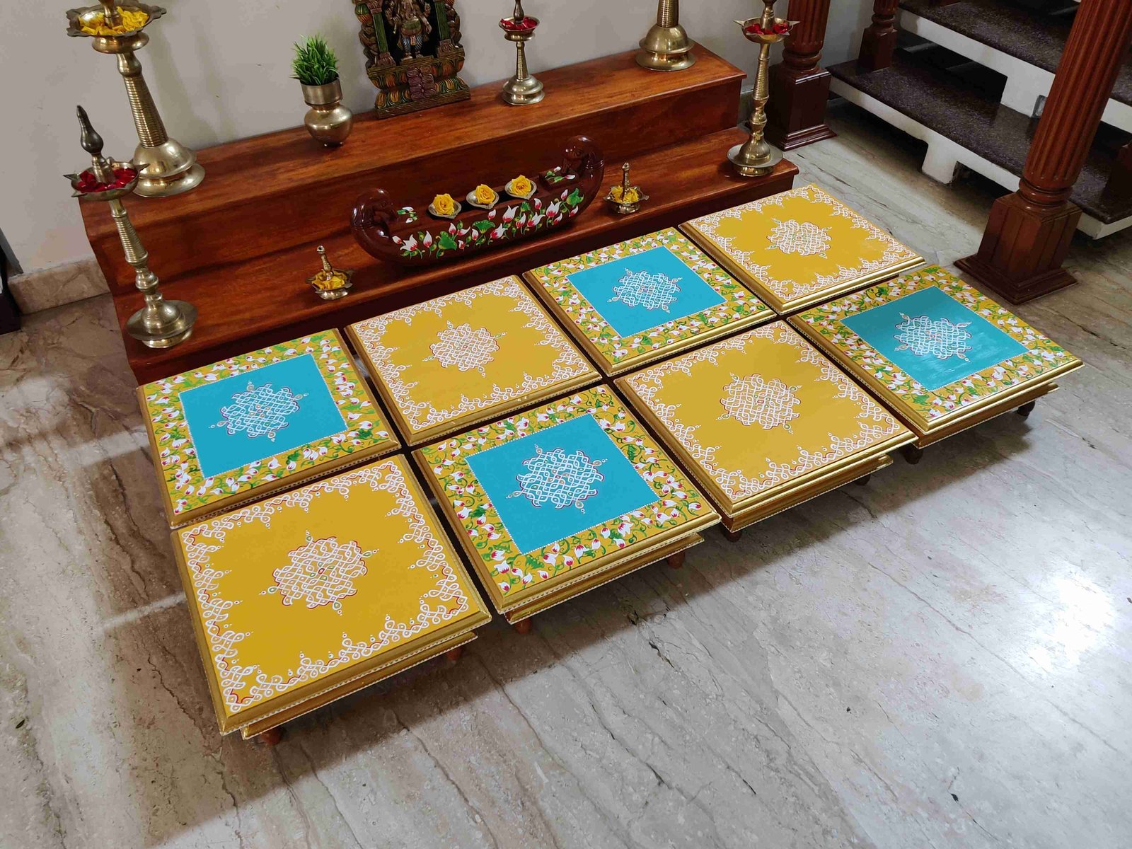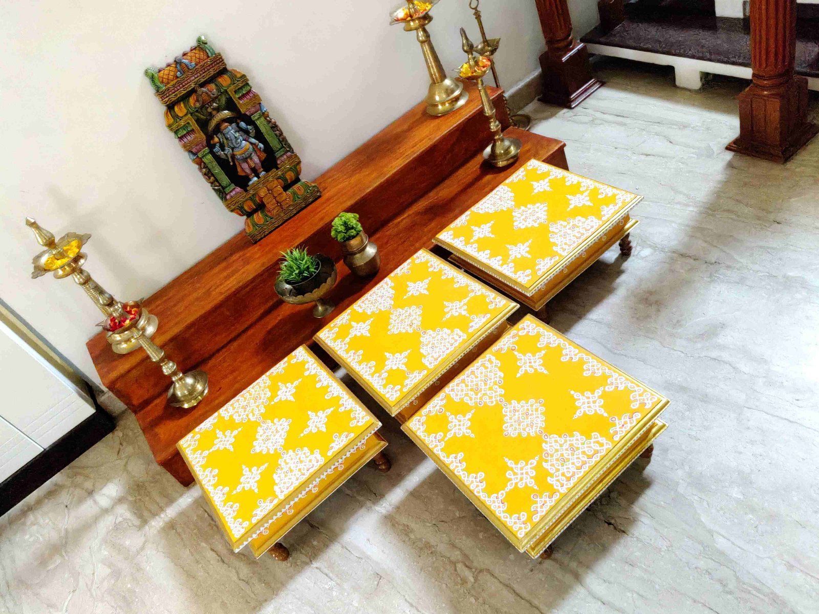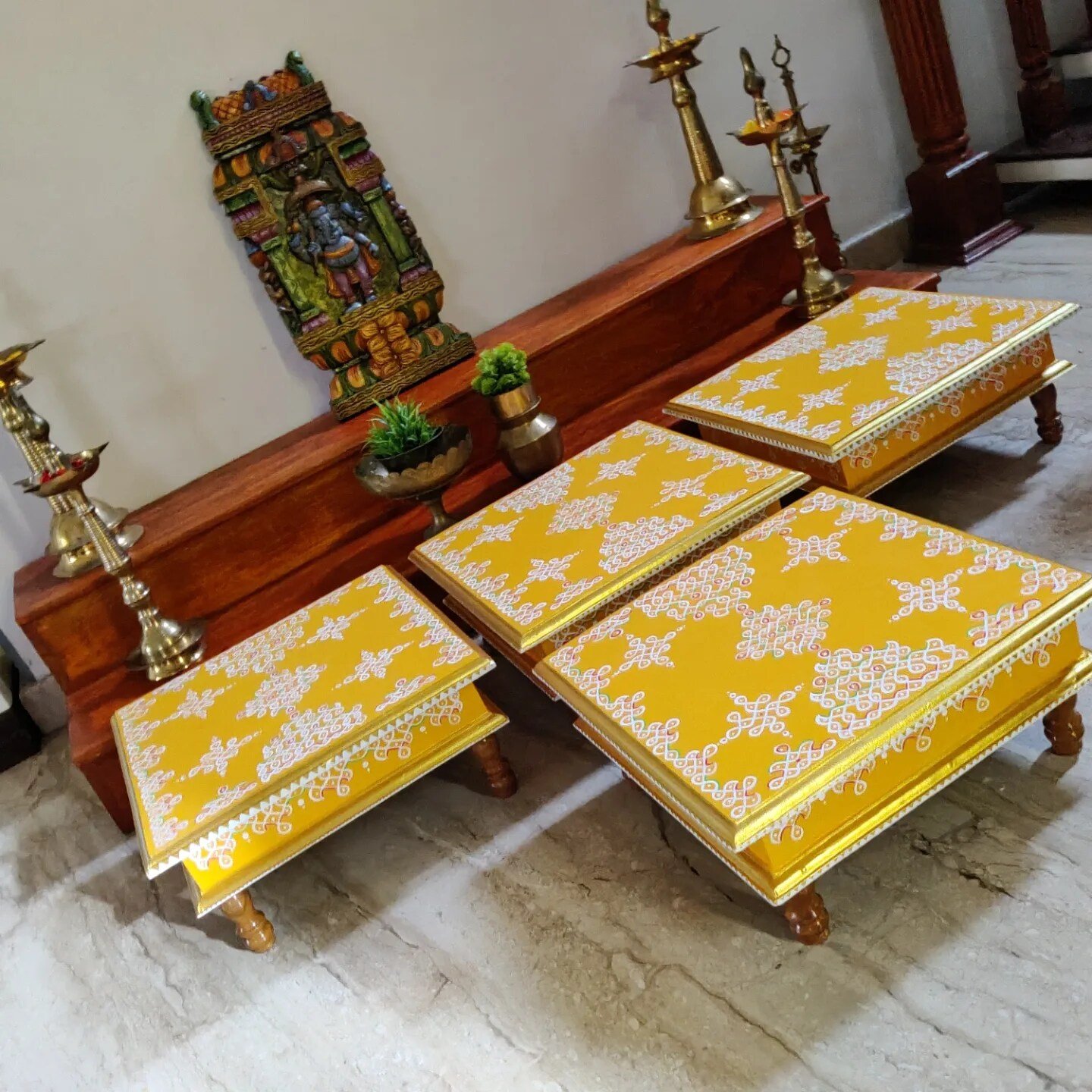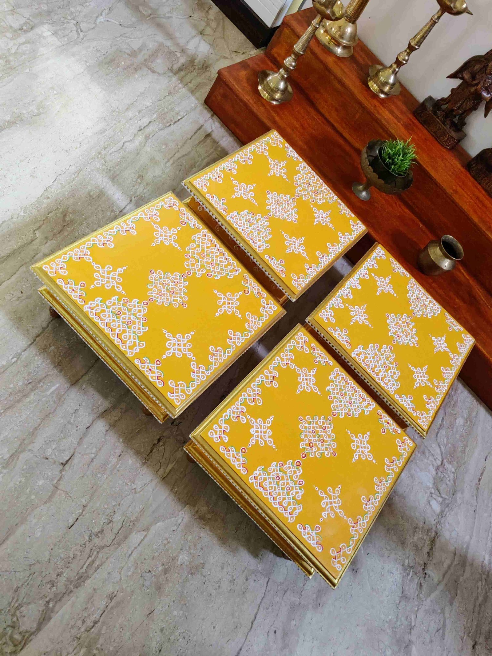 This is a traditional Square Style stools that have an increased height for sitting. This is the best option for those who need little raised stools for sitting. The best option for Display of Gods during Ganesh Chathurthi, Varalakshmi Pooja and Kalasams for Pooja. The bigger Size stools can be used as a side tables for Sofas / Couches. It can also be used as a traditional décor, display of heavy statues and other storage purposes. It can be done in wood finish only/ Painted